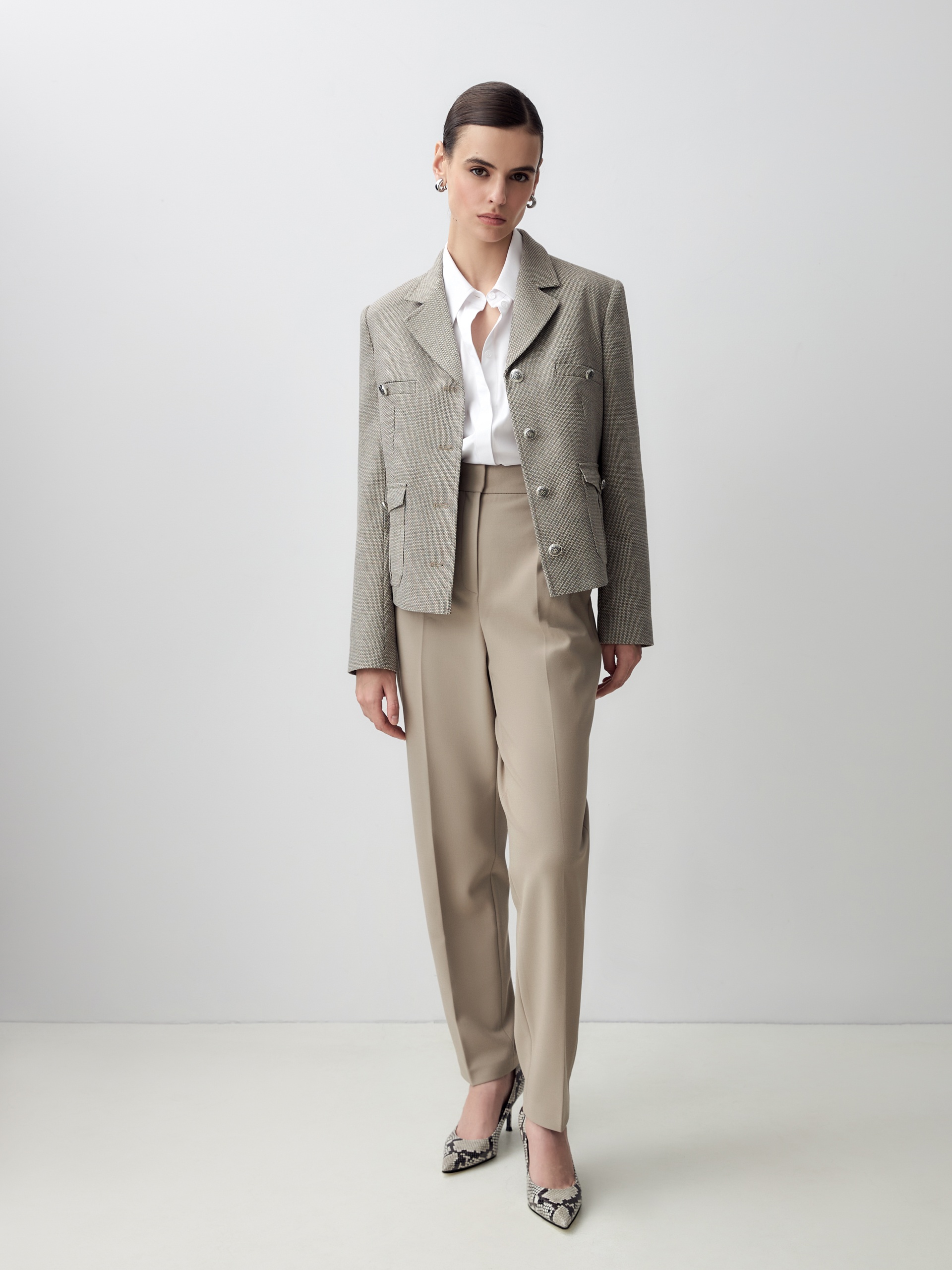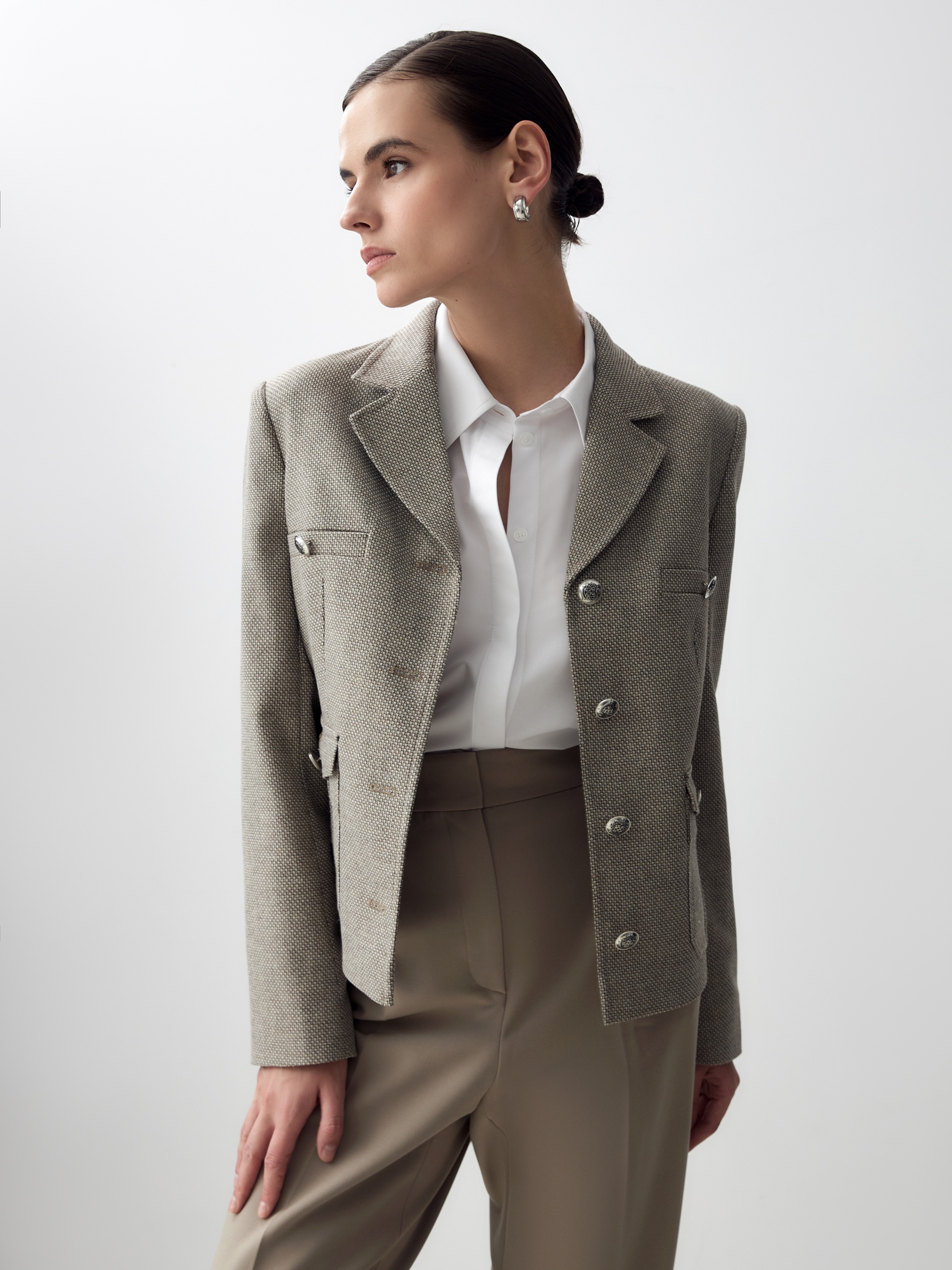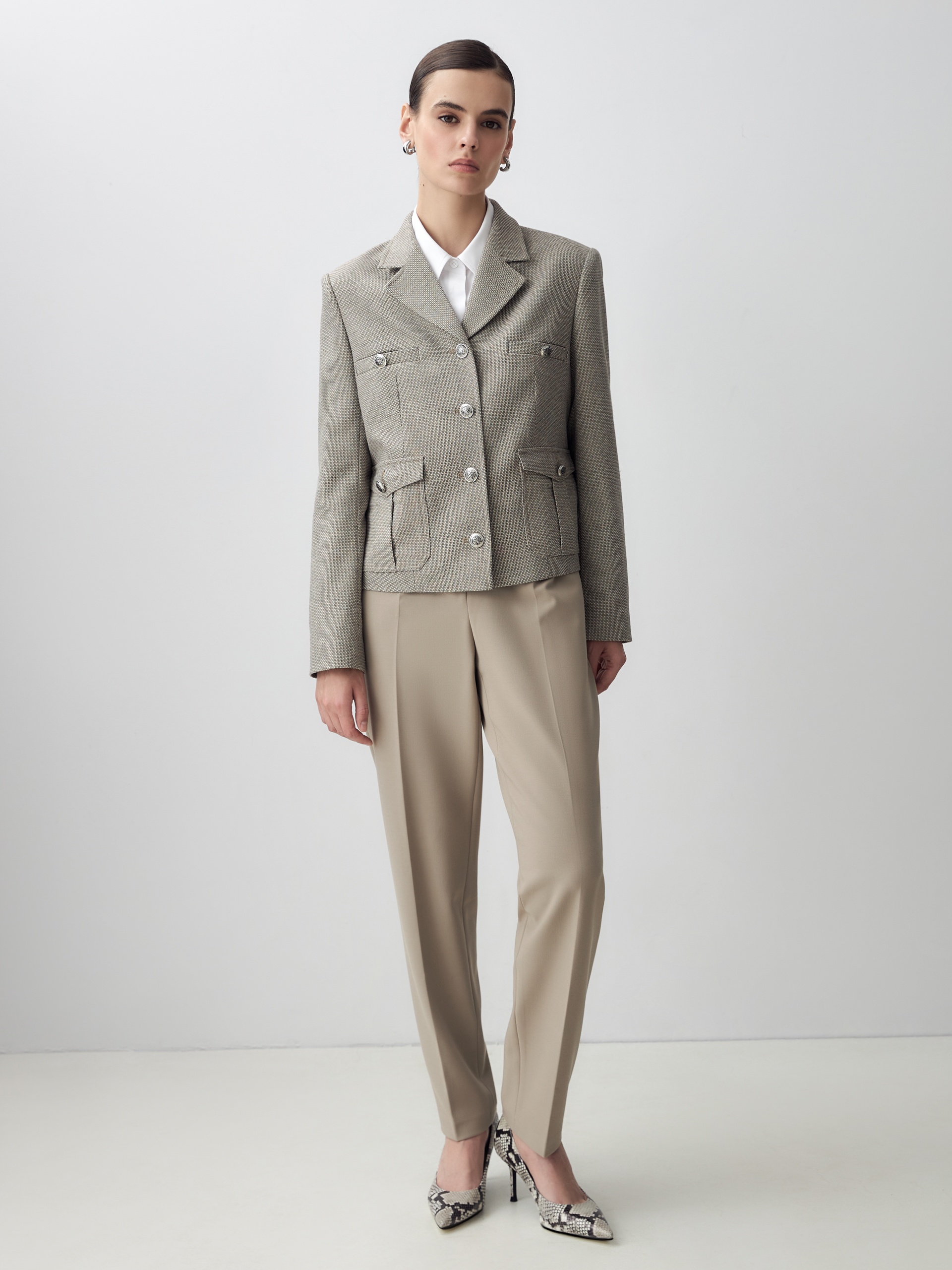 Прямой однобортный жакет из фактурной ткани. Жакет с английским воротником на трех пуговицах, прорезными карманами на груди, накладные карманы с клапанами. По переду жакета идут рельефы.