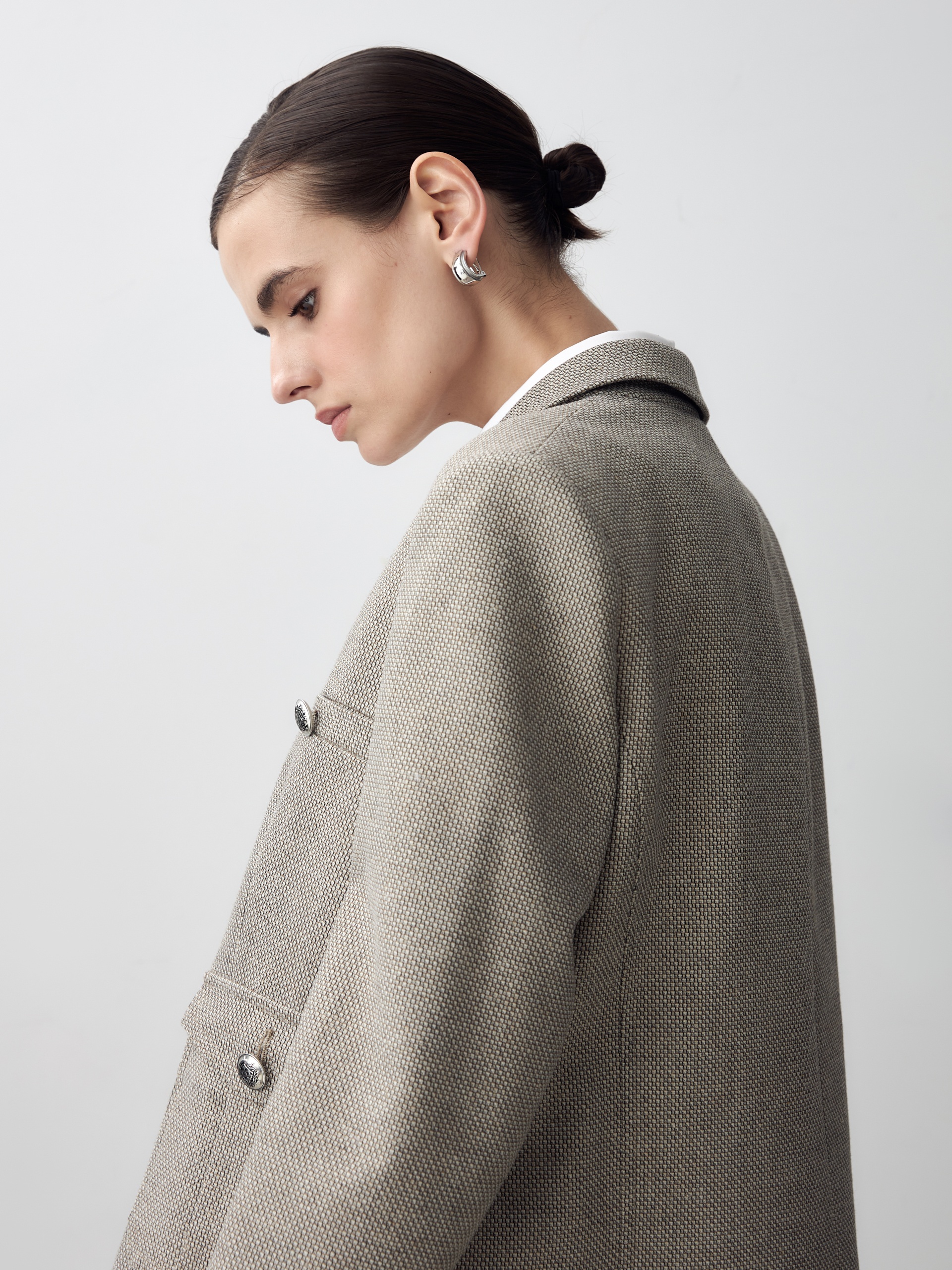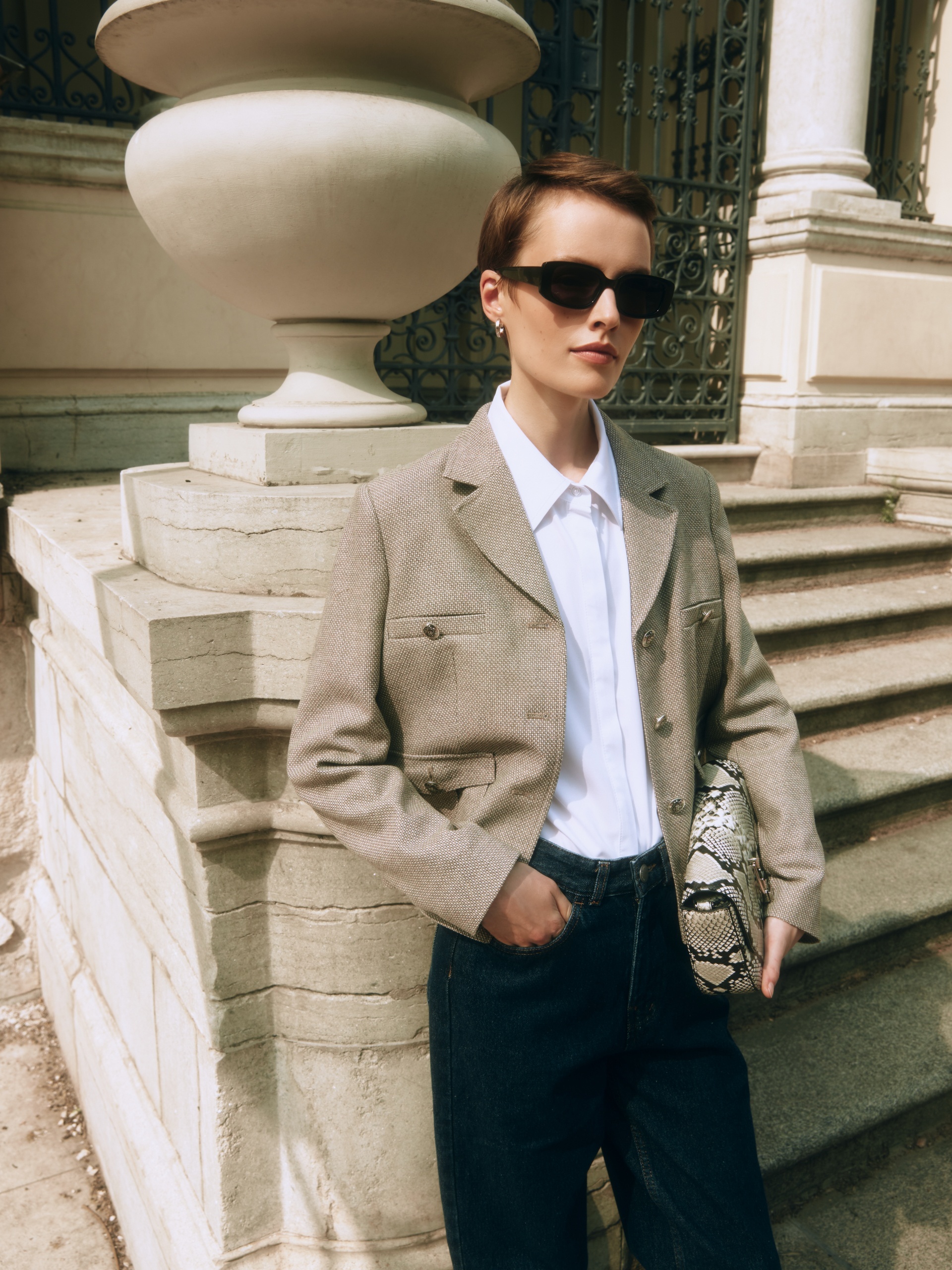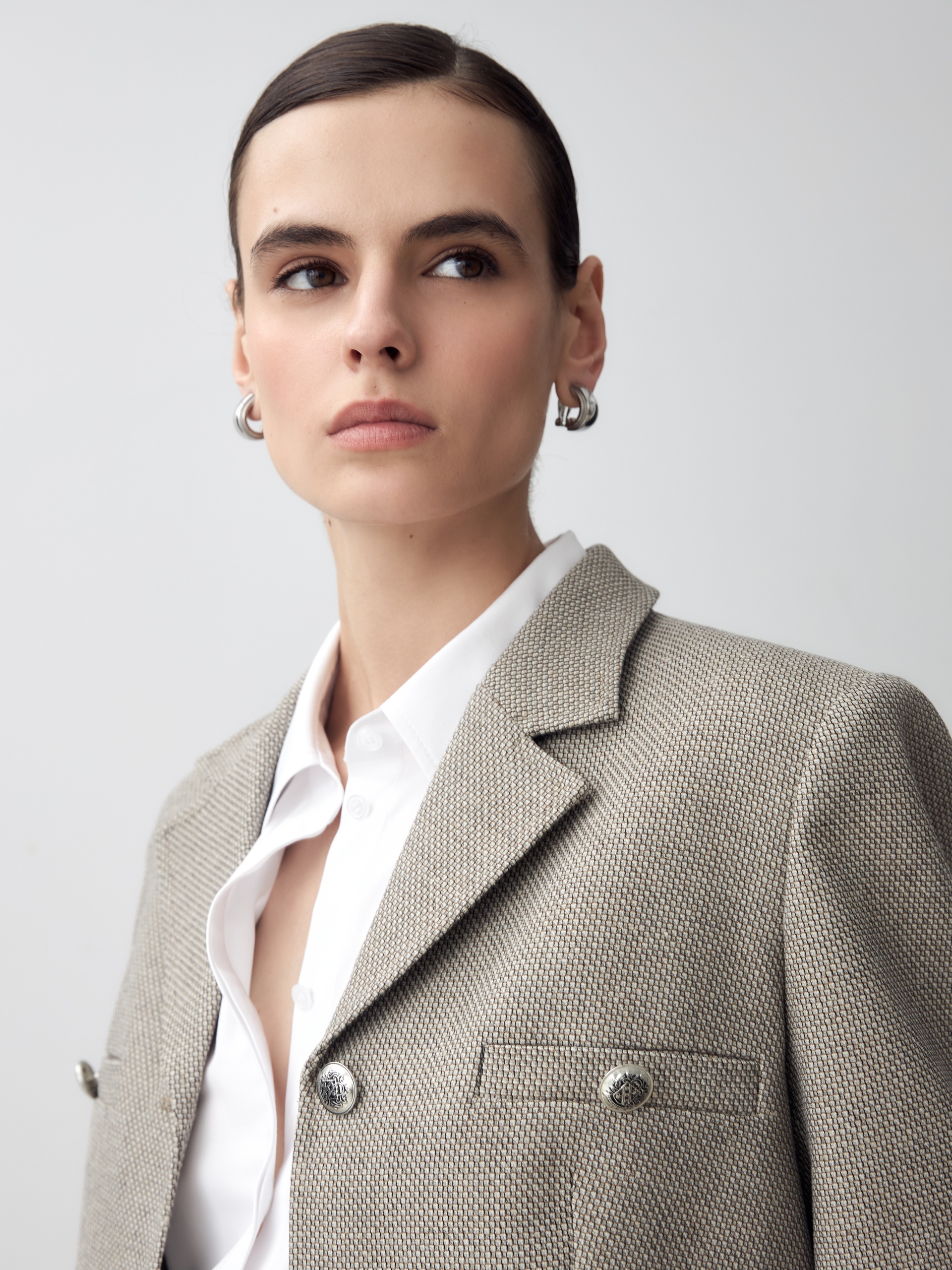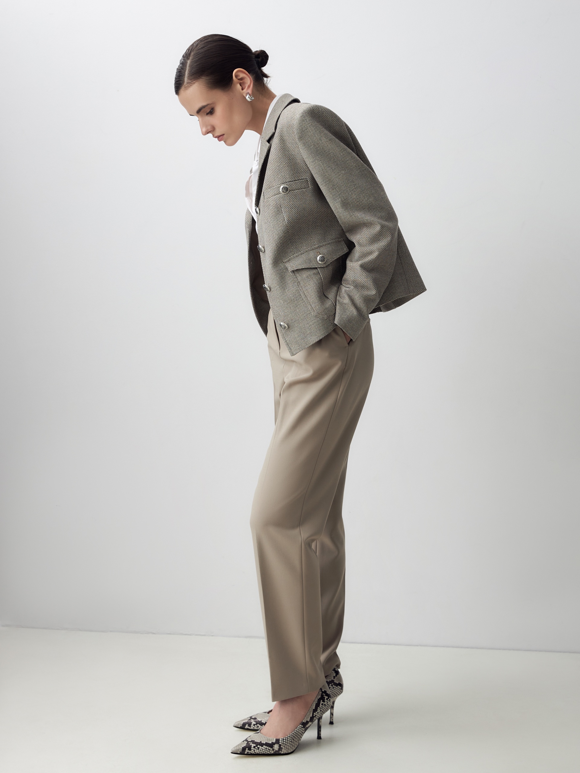 Прямой однобортный жакет из фактурной ткани. Жакет с английским воротником на трех пуговицах, прорезными карманами на груди, накладные карманы с клапанами. По переду жакета идут рельефы.