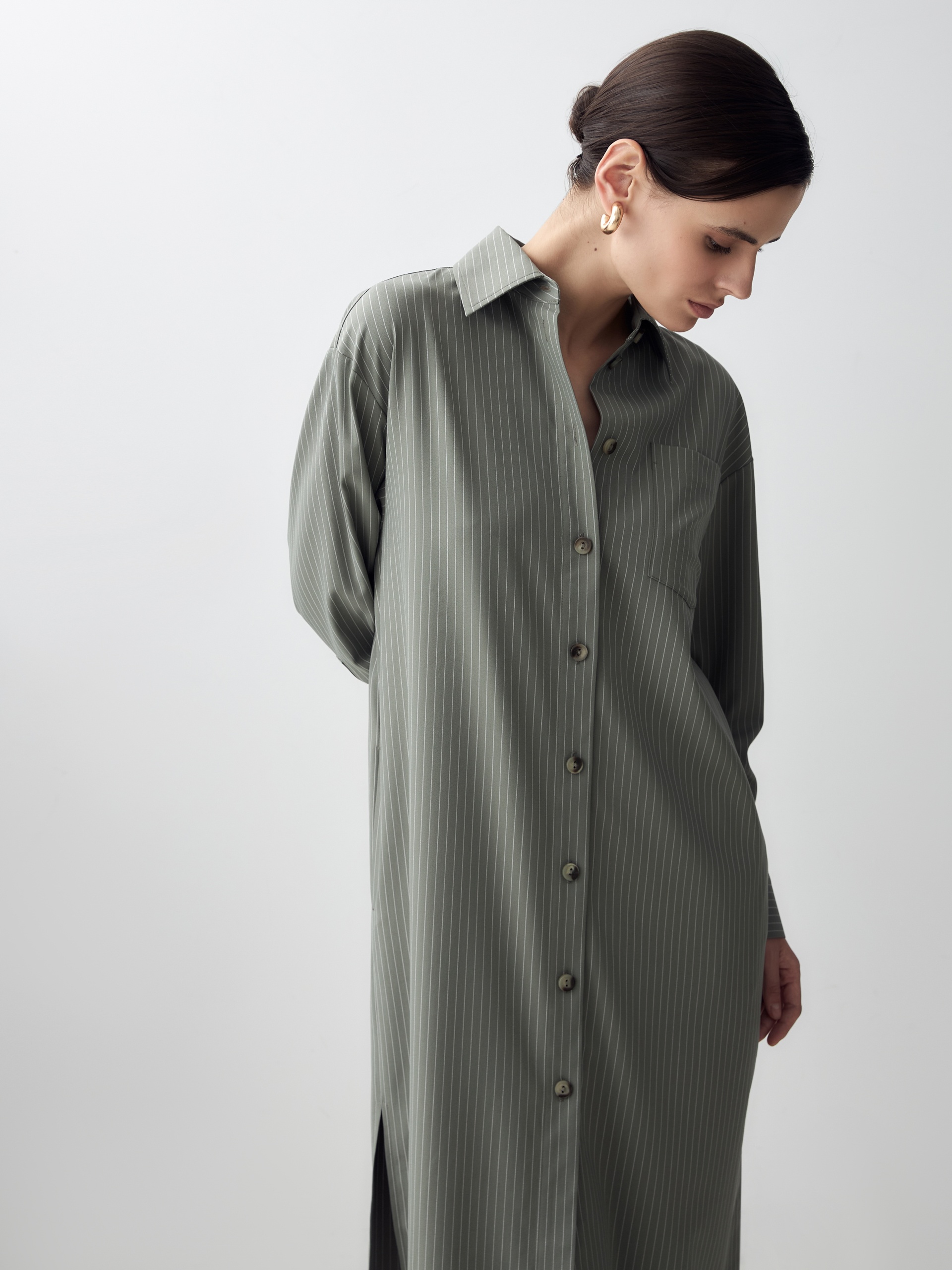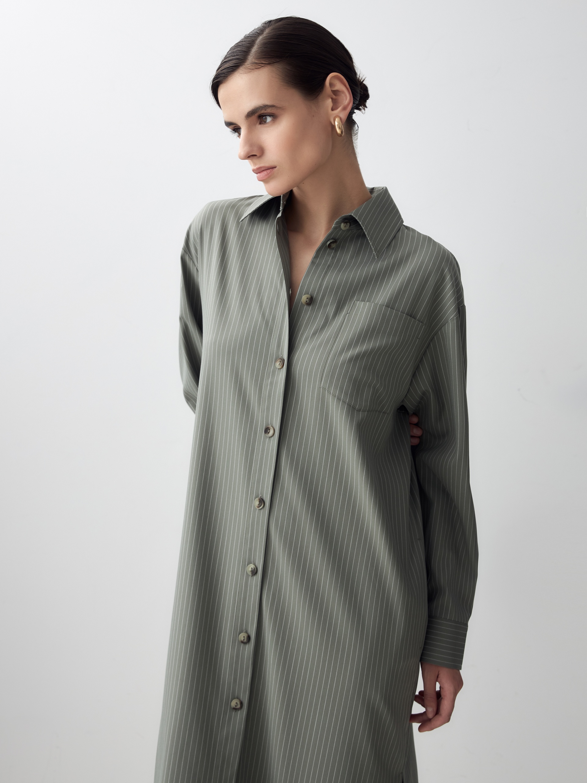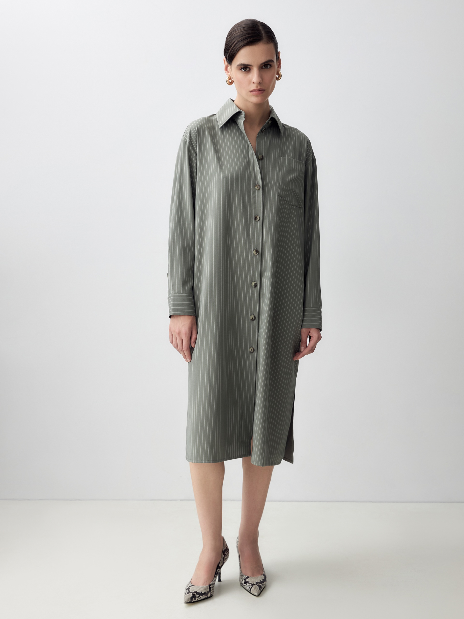 Платье-рубашка прямого силуэта из вискозной ткани с тонкой вертикальной полоской молочного цвета. Спущенное плечо придаст мягкости образу. Классический отложной воротник и застежка на пуговицах. На груди накладной карман. В боковых швах карманы и разрезы.