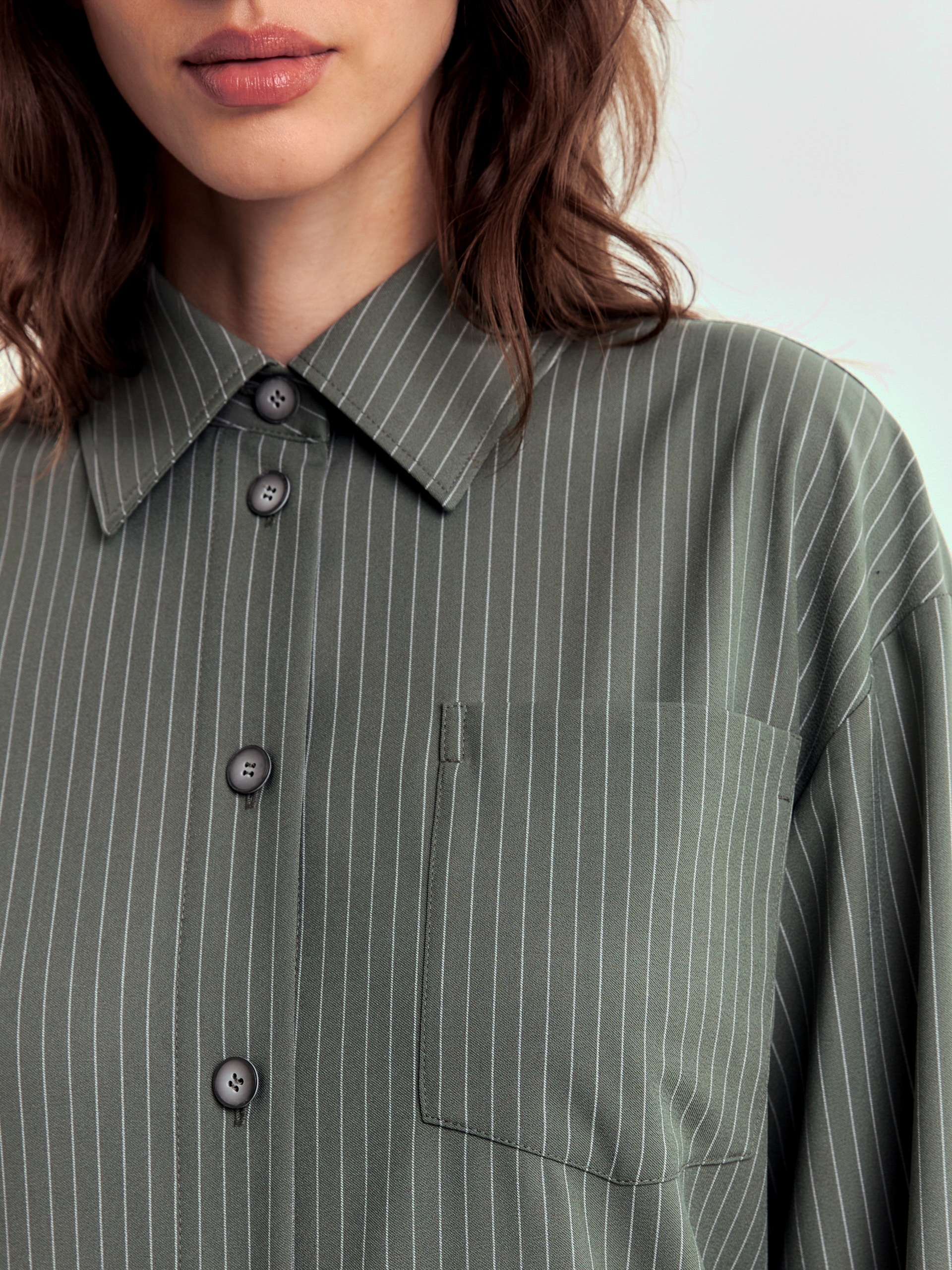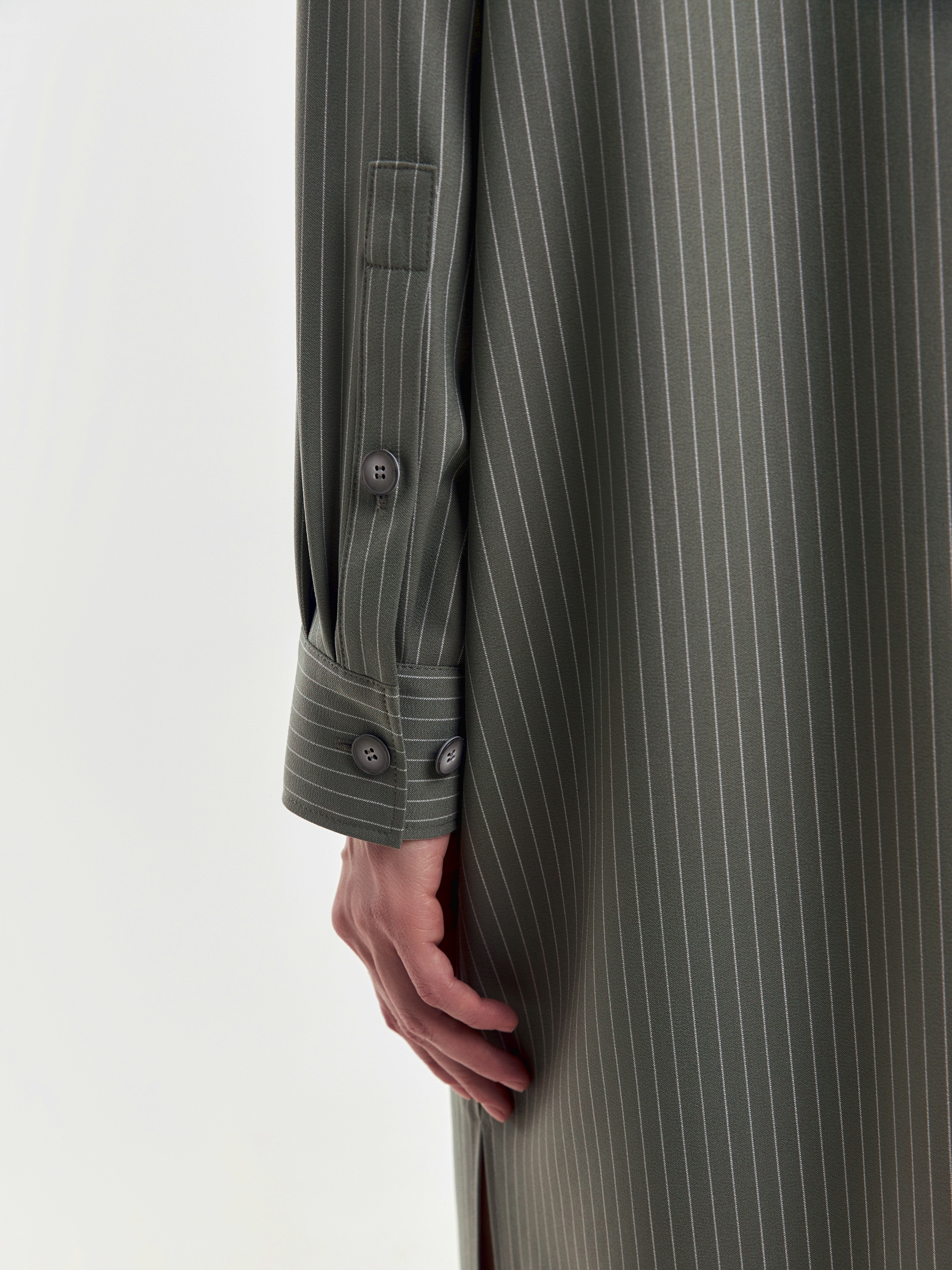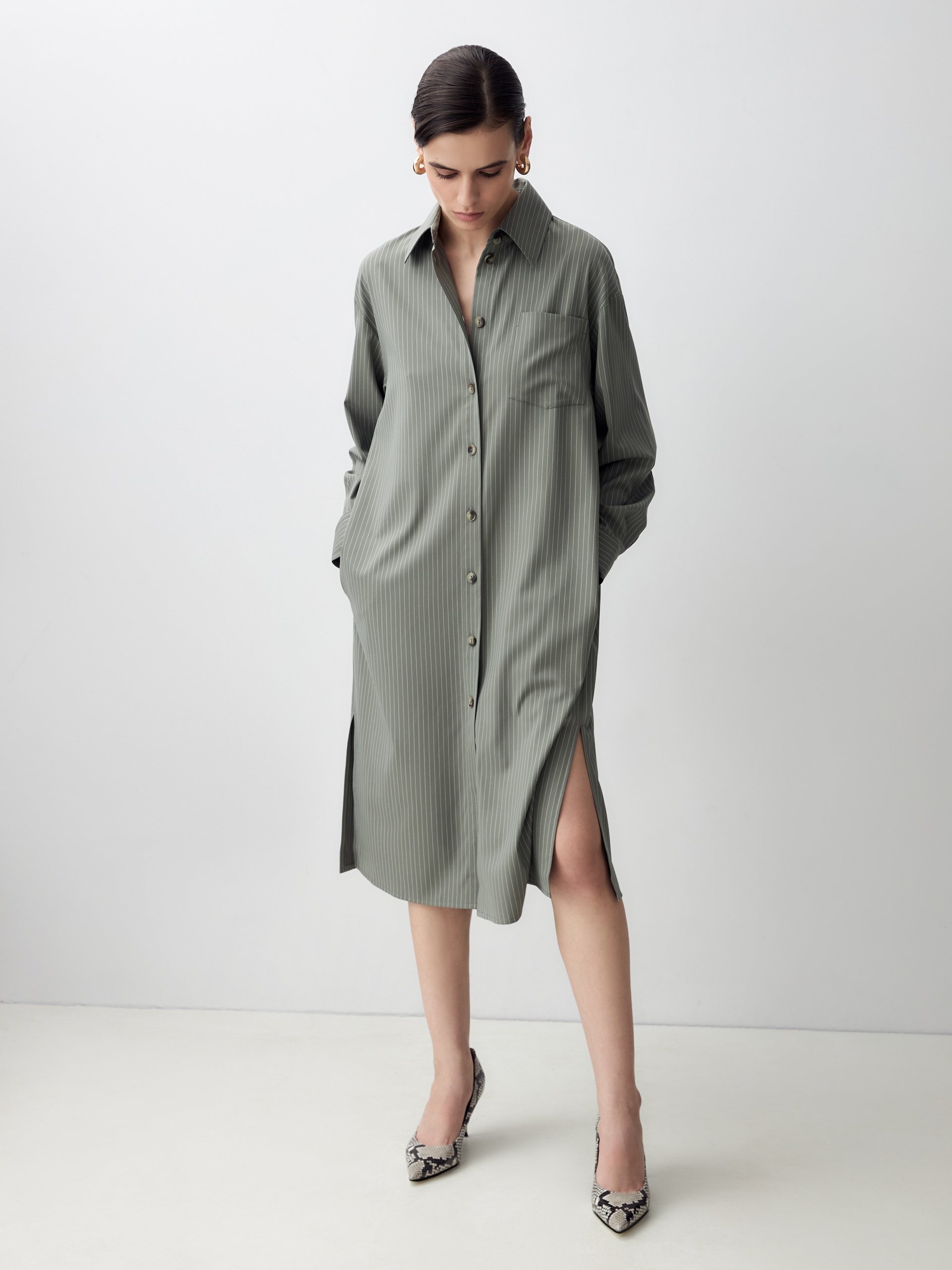 Платье-рубашка прямого силуэта из вискозной ткани с тонкой вертикальной полоской молочного цвета. Спущенное плечо придаст мягкости образу. Классический отложной воротник и застежка на пуговицах. На груди накладной карман. В боковых швах карманы и разрезы.