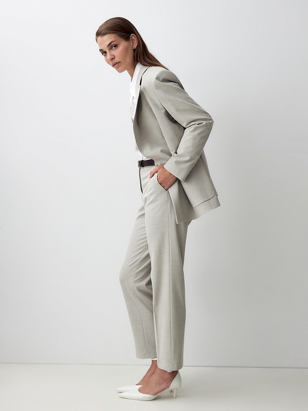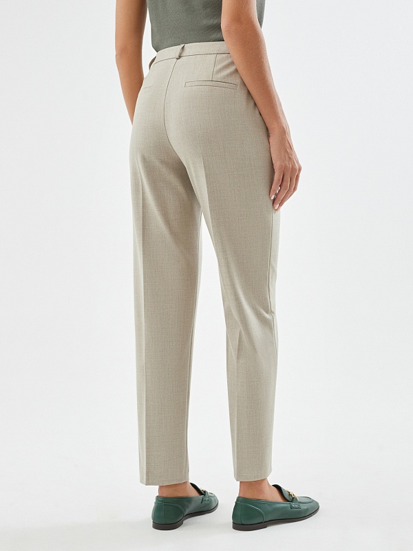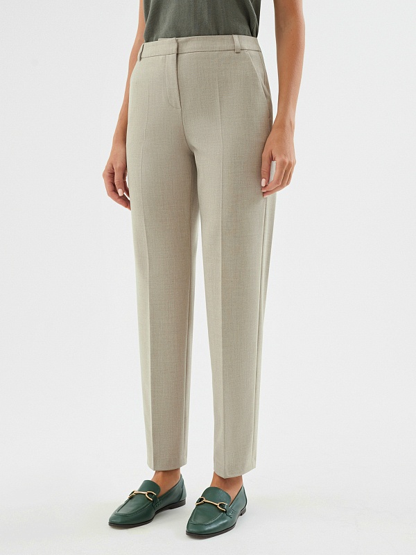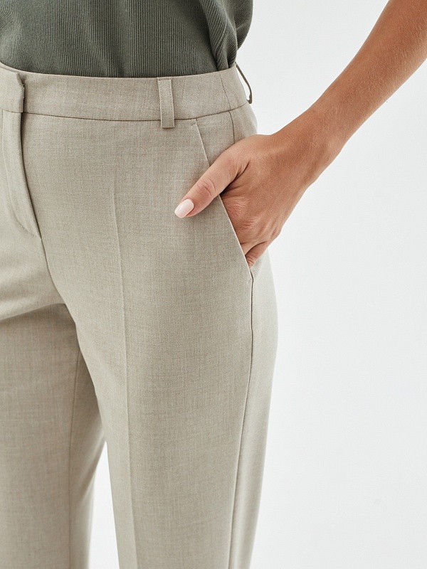 Классические брюки со стрелками зауженного к низу силуэта на притачном поясе со шлевками из костюмной ткани в цвете "песок". Спереди рабочие боковые карманы и застежка на молнию и крючок. Брюки прекрасно сочетаются с жакетом из этой же ткани.