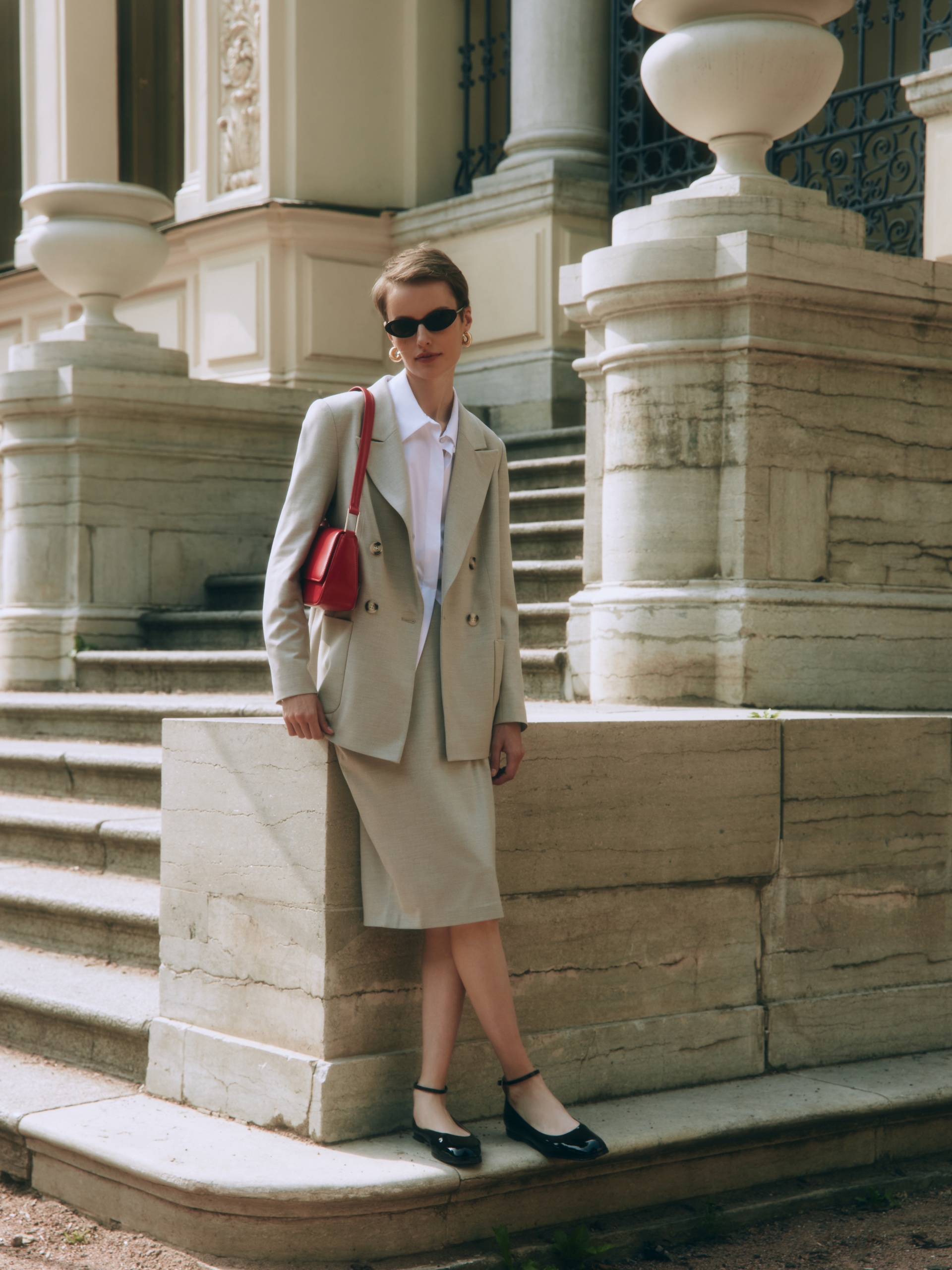 Юбка на притачном поясе полуприлегающего силуэта из костюмной ткани в цвете "песок", очень элегантной длины, прикрывающей колено. Застежка сзади на потайную молнию.