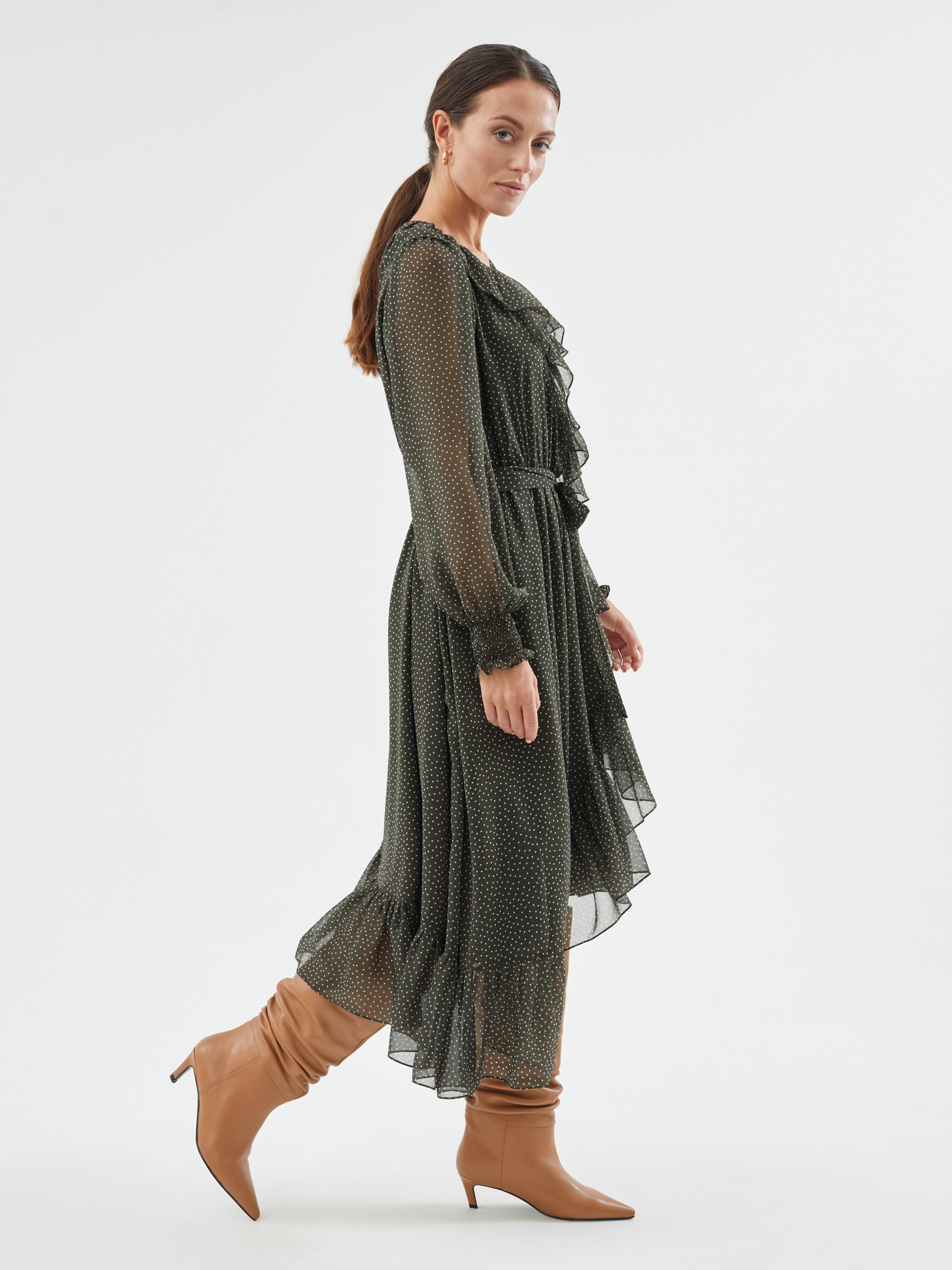 Романтичное легкое платье на запах в принт "polka dot". Платье с V-образным вырезом с обработкой запаха воланом. Рукава со сборкой по окату и манжетам из резинок-жилок. На талии резинка для лучшей посадки по талии. В комплект входит пояс из основной ткани. Платье на подкладке.
