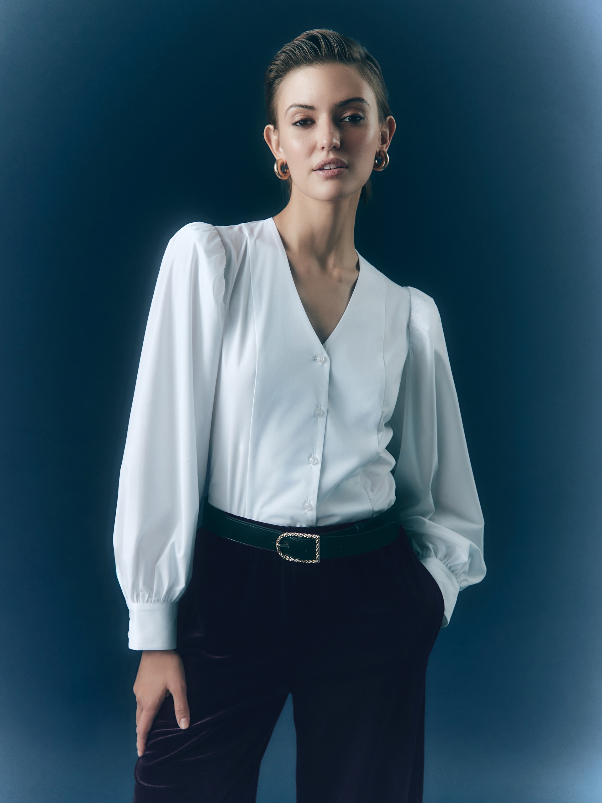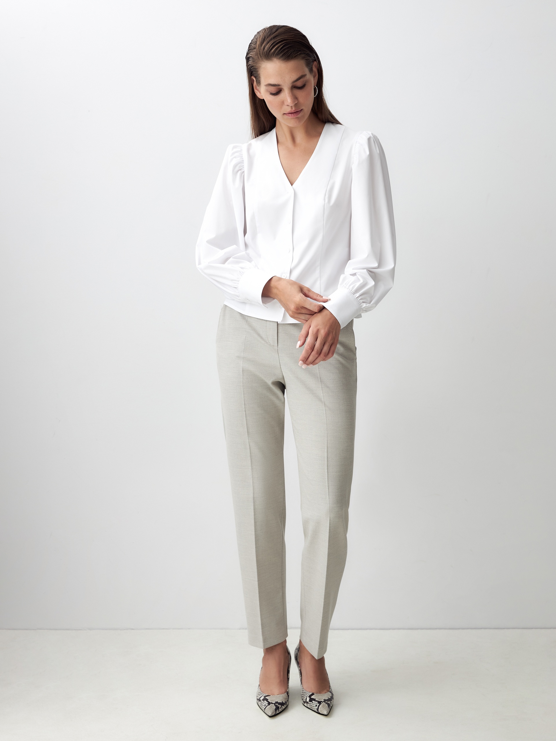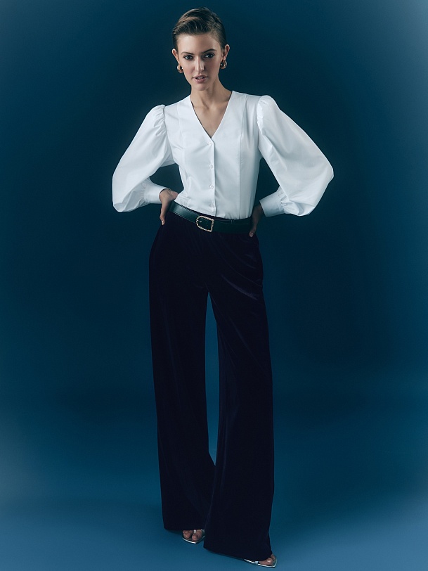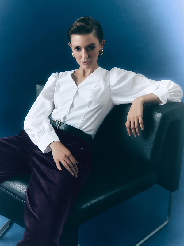 Женственная блуза из хлопковой ткани приталенного силуэта с V-образным вырезом, спущенным плечом и объемными рукавами на манжете. Застежка спереди на пуговицы.