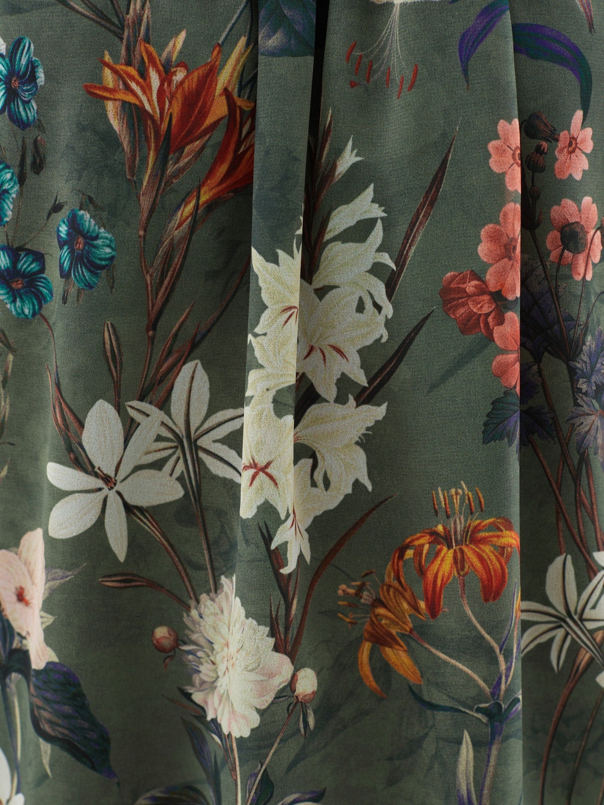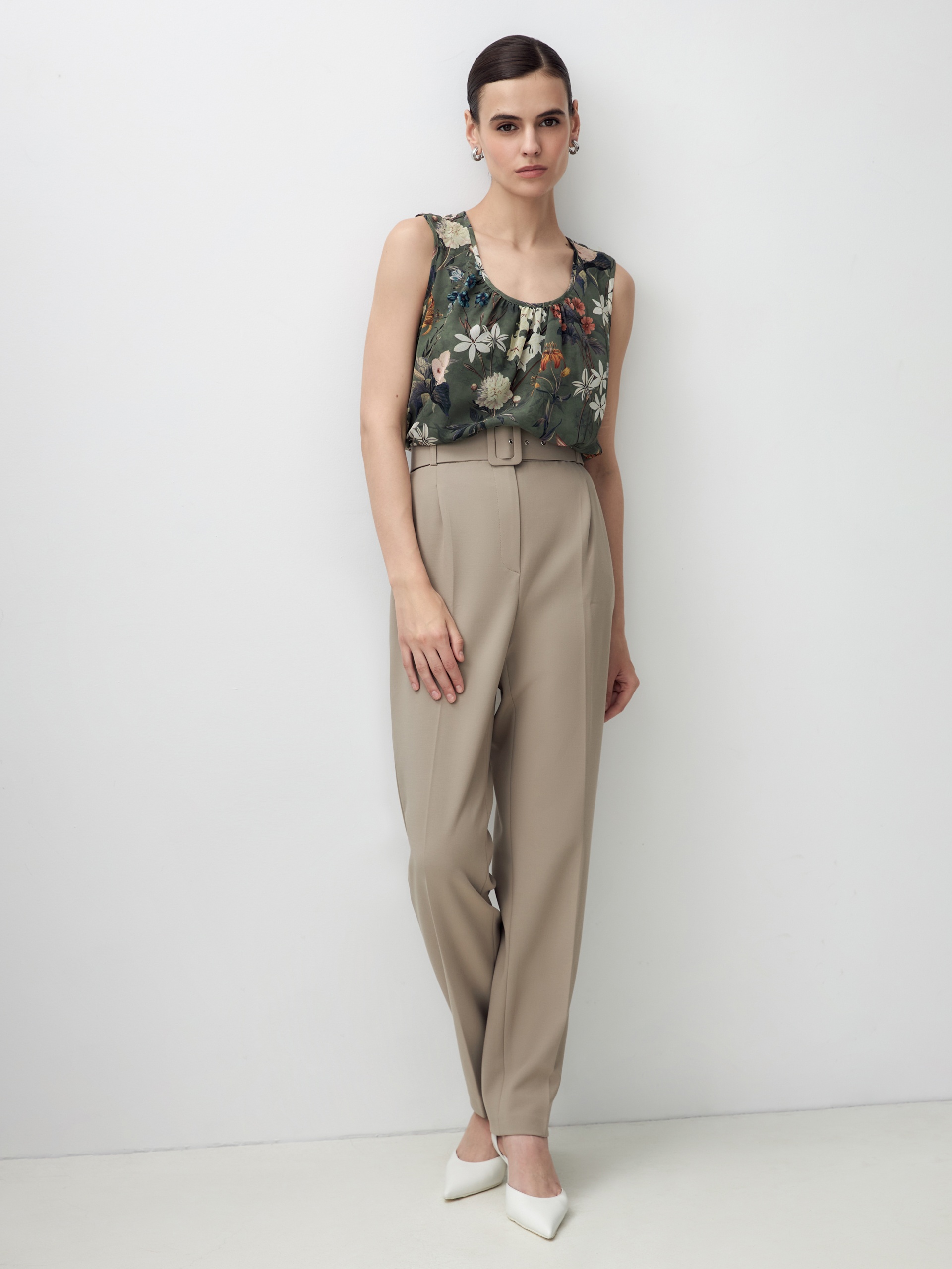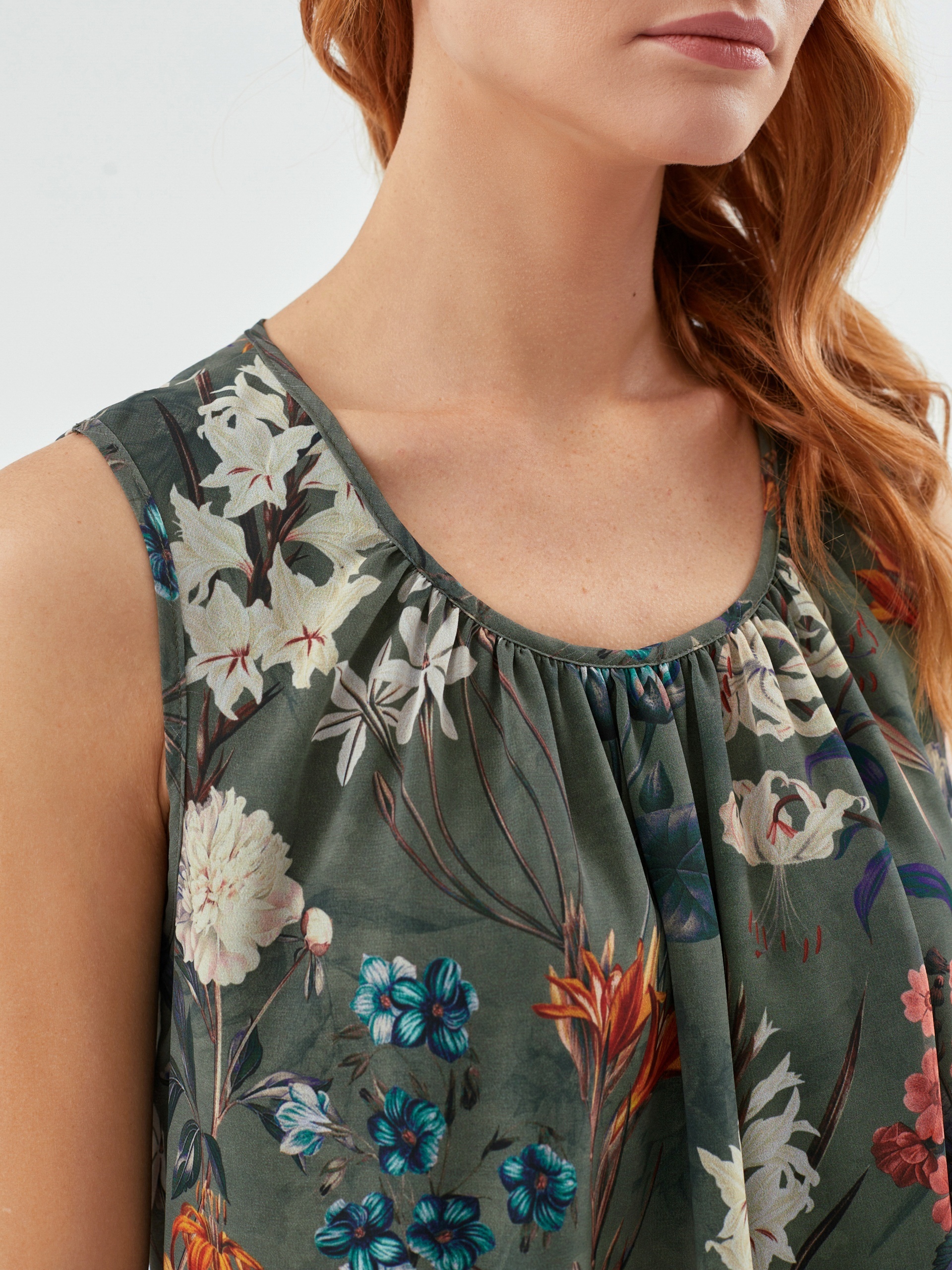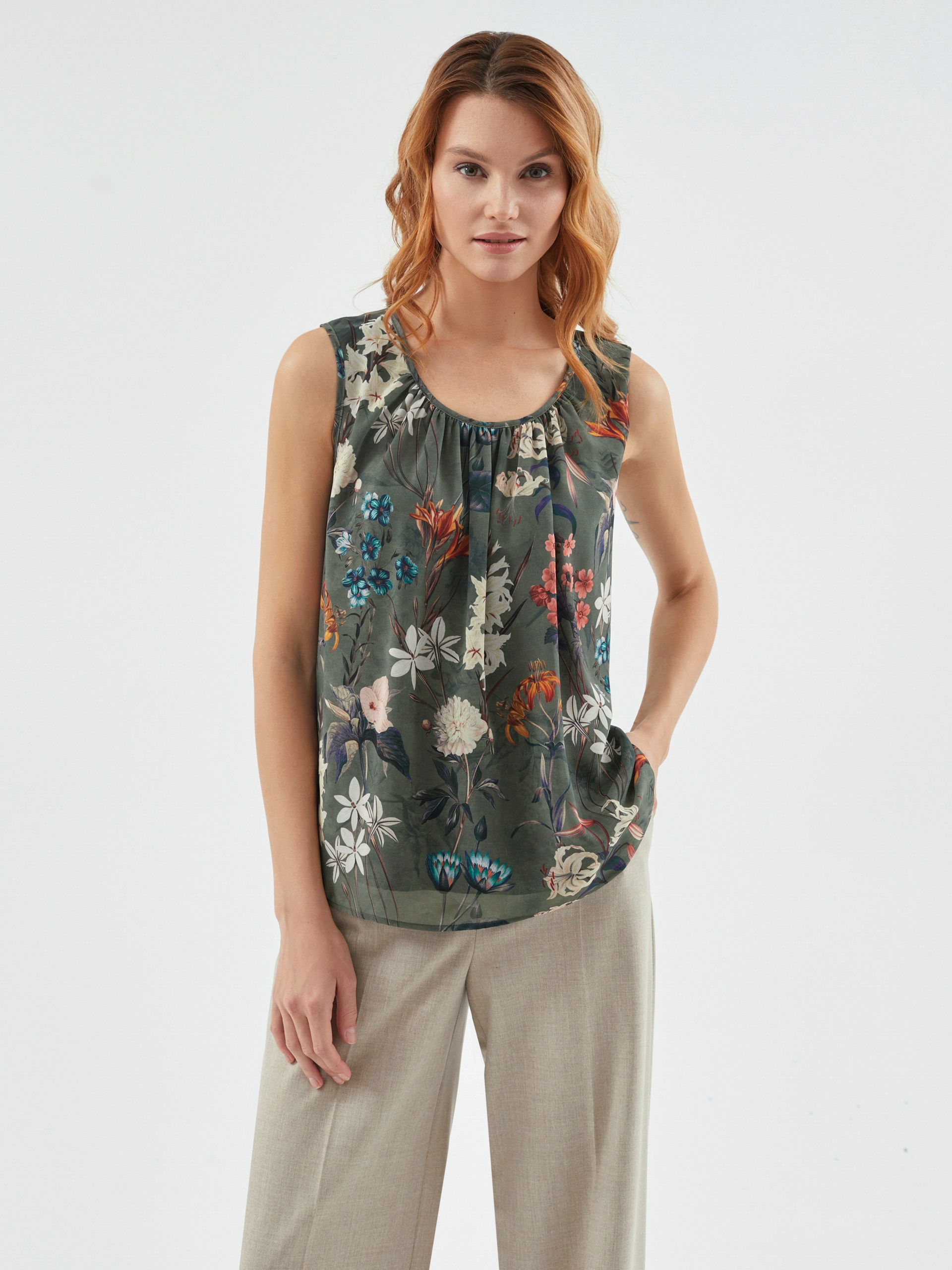 Прямая женственная блуза в крупный цветочный принт. Без рукавов. По вырезу горловины расположены складки. Такая блуза станет хорошим первым слоем под жакет или кардиган.