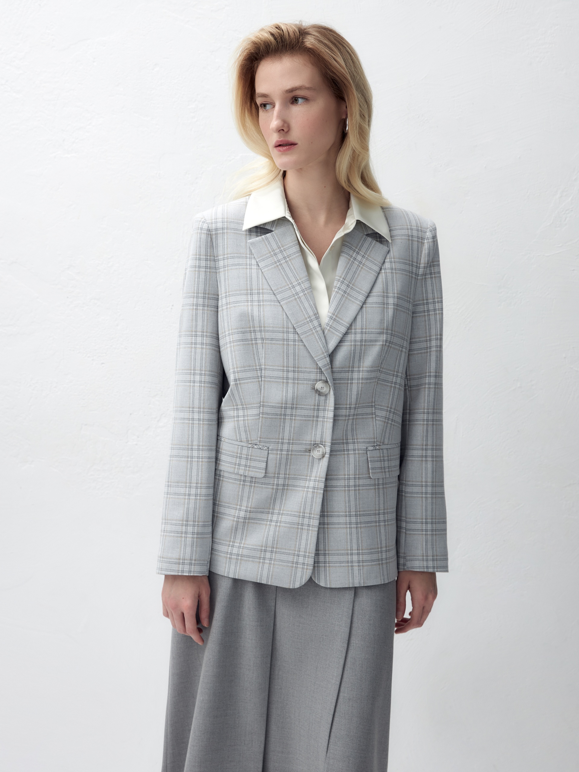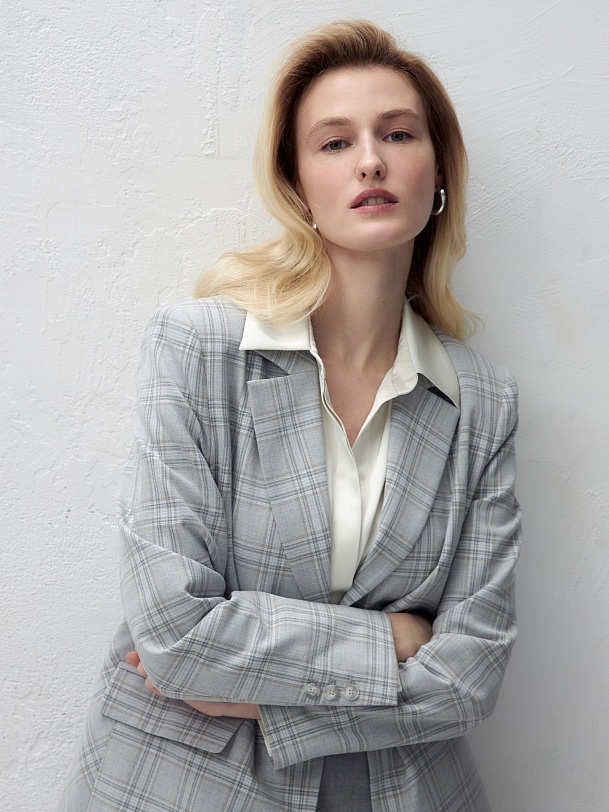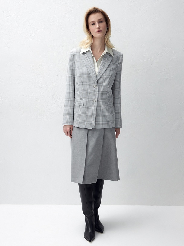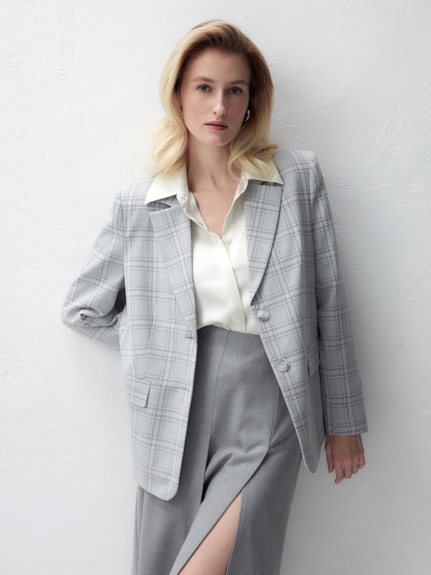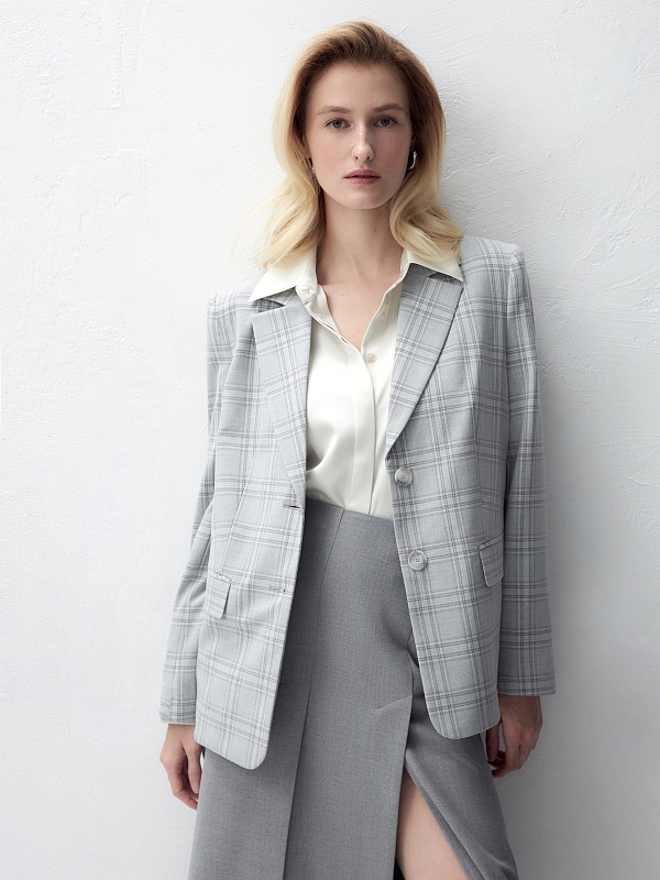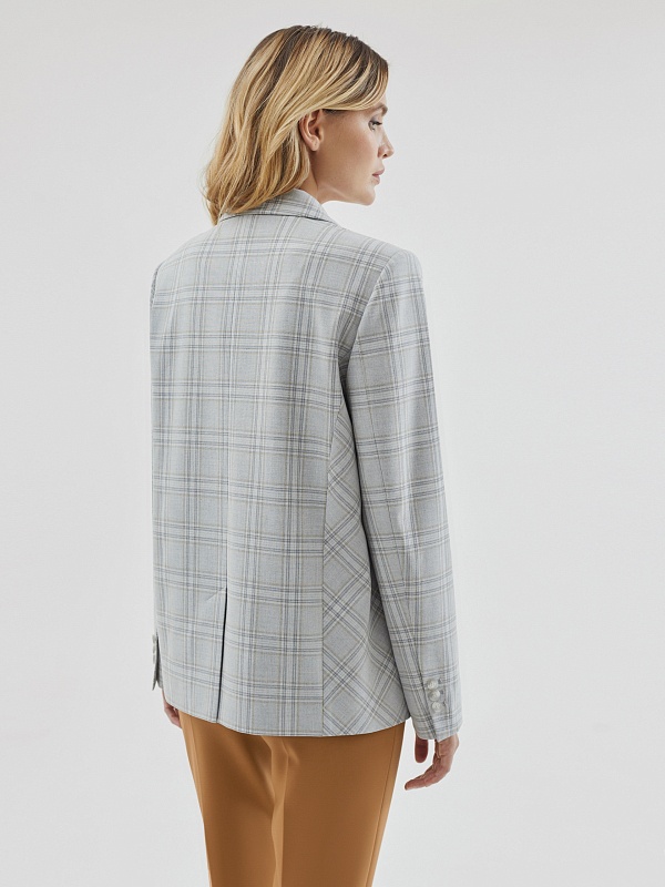 Удлиненный прямой однобортный жакет с двумя пуговицами из костюмной ткани в серо-охристую клетку. Английский воротник. Жакет с прорезными карманами и накладными клапанами. Жакет полностью на подкладке. Данную модель можно комбинировать с серыми низами, а также с жилетом и брюками цвета охры.