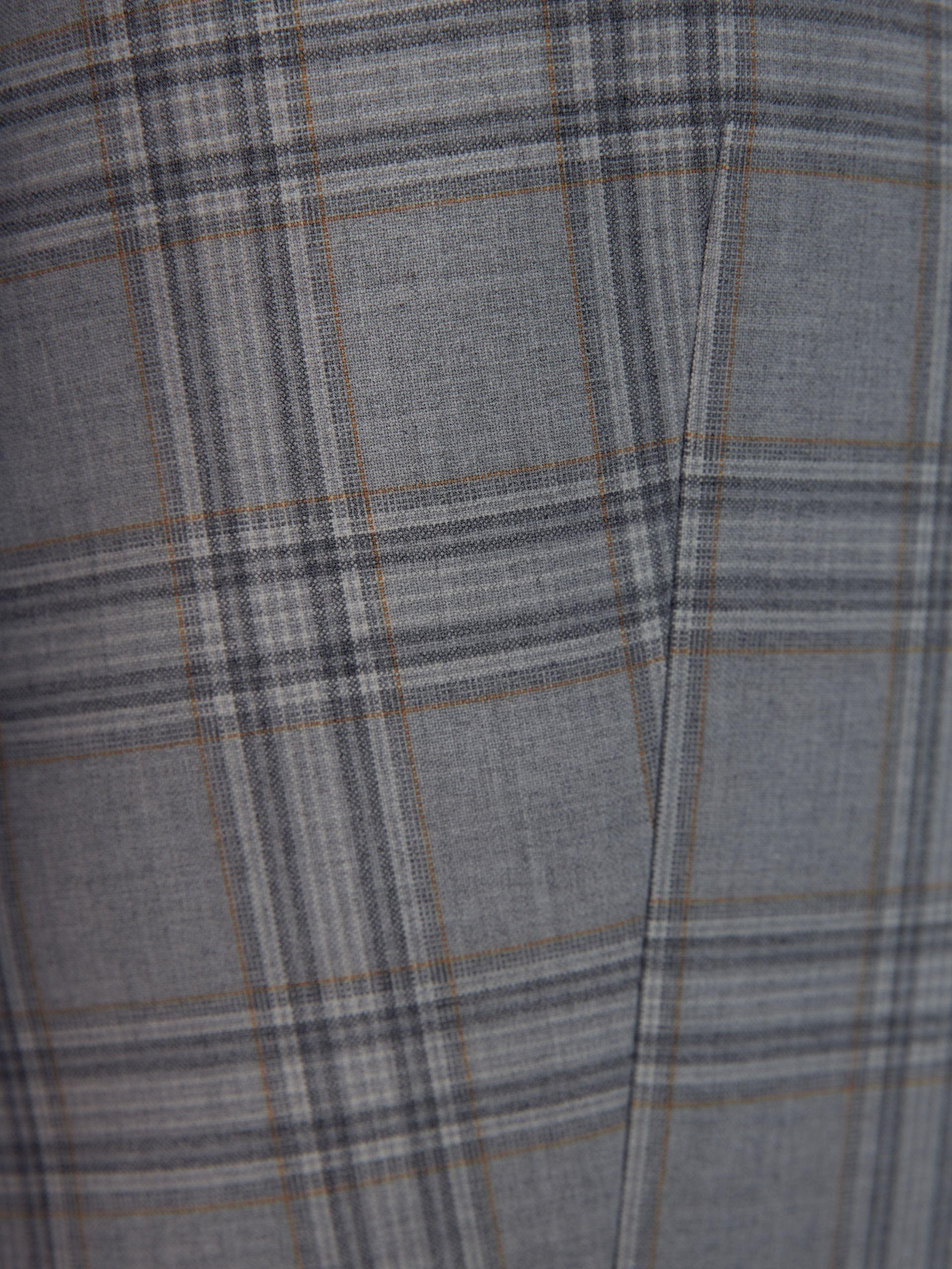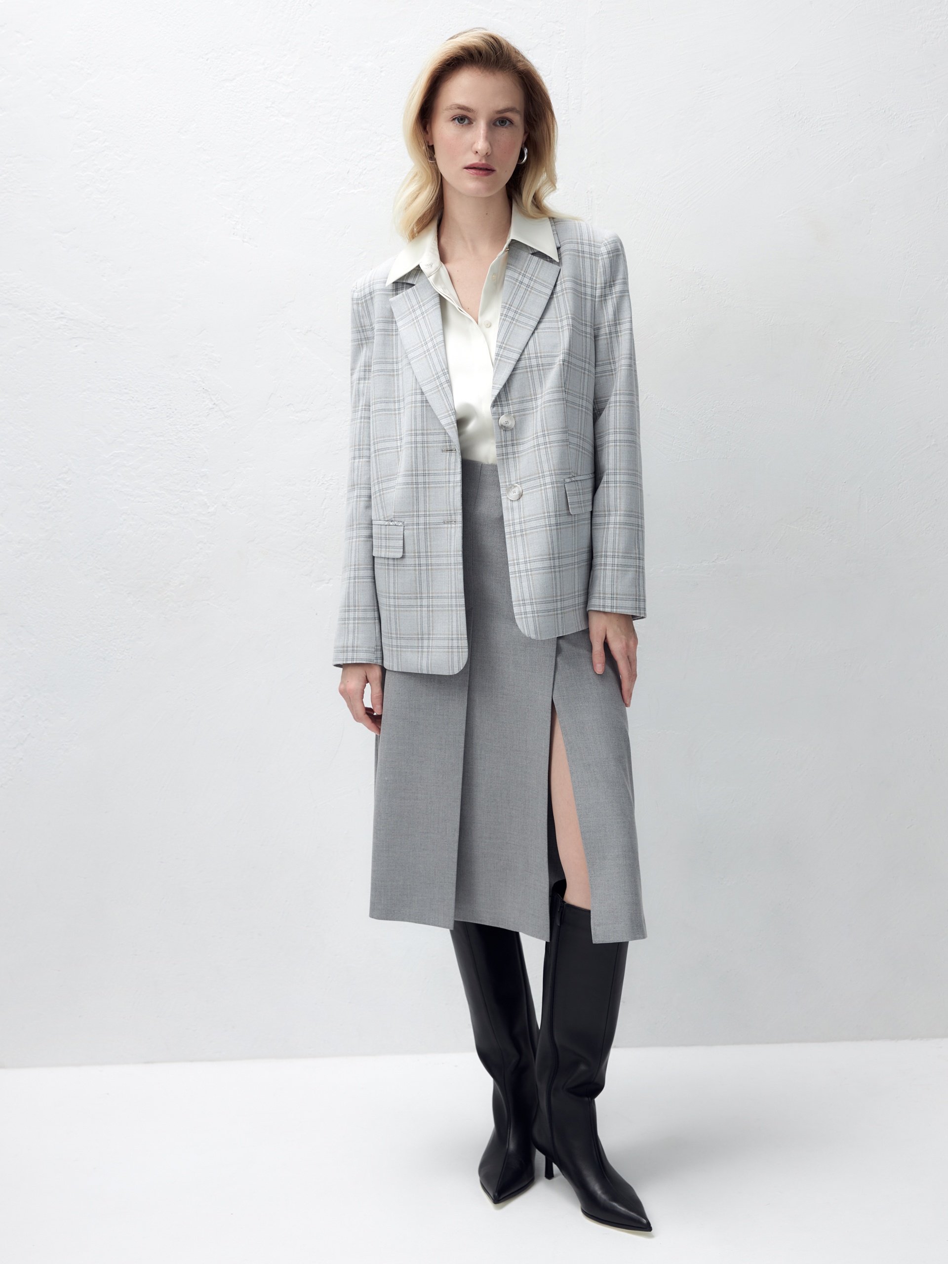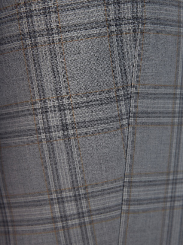 Удлиненный прямой однобортный жакет с двумя пуговицами из костюмной ткани в серо-охристую клетку. Английский воротник. Жакет с прорезными карманами и накладными клапанами. Жакет полностью на подкладке. Данную модель можно комбинировать с серыми низами, а также с жилетом и брюками цвета охры.