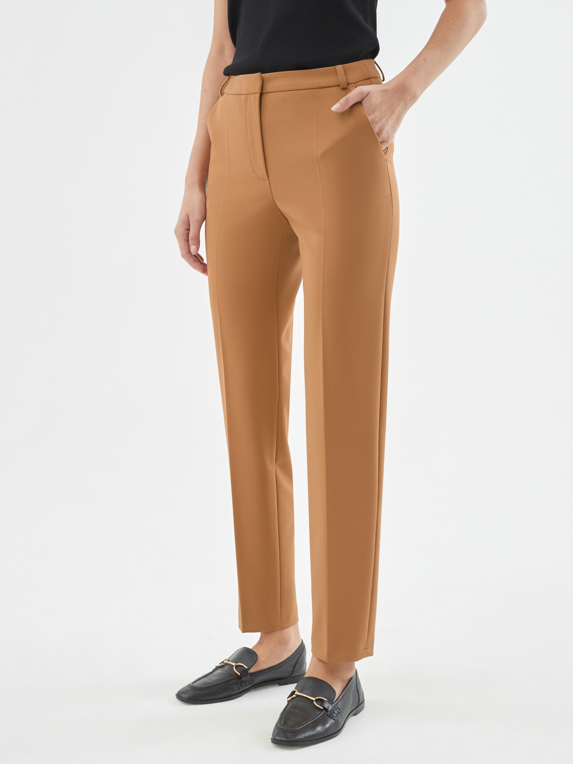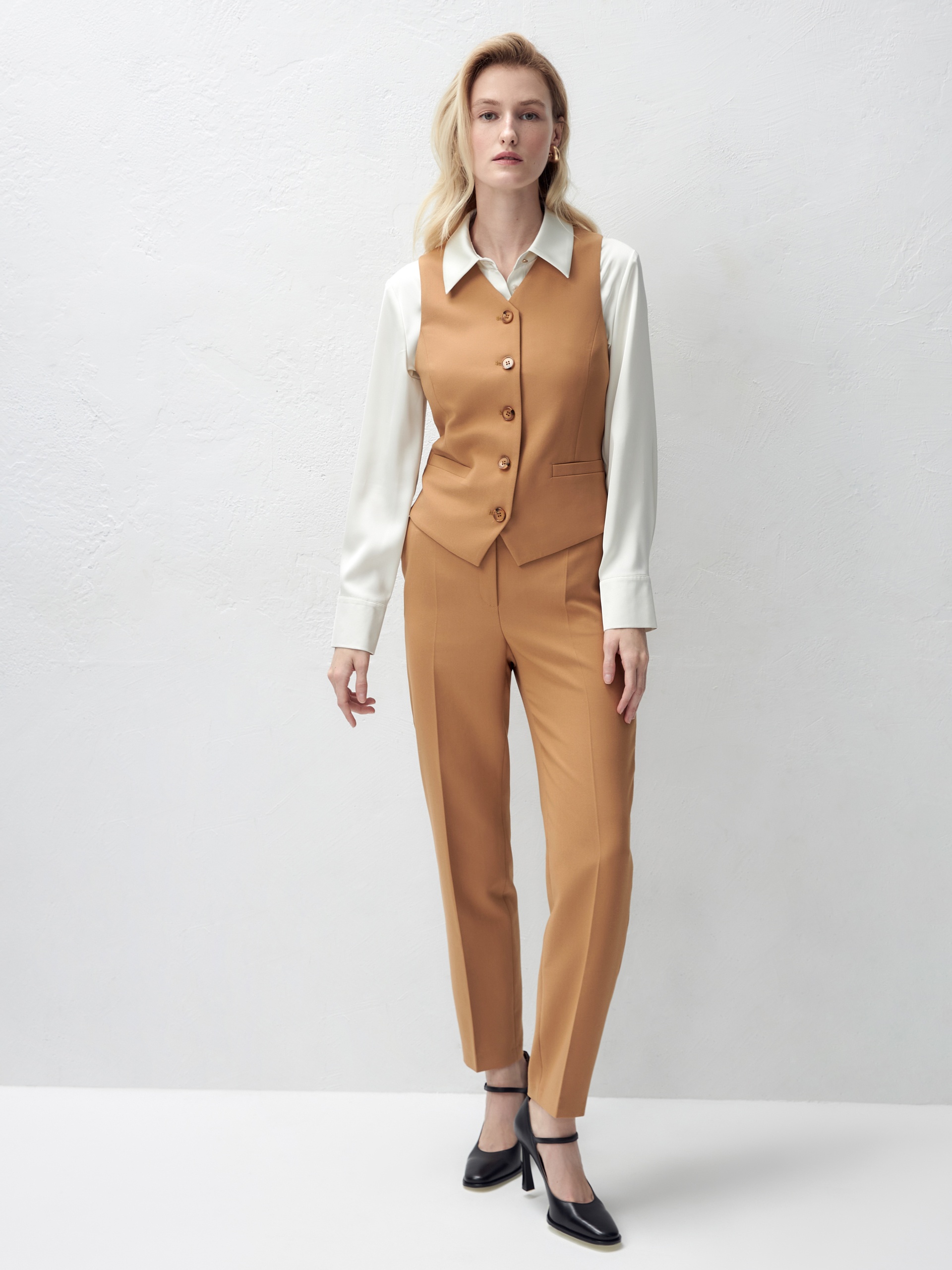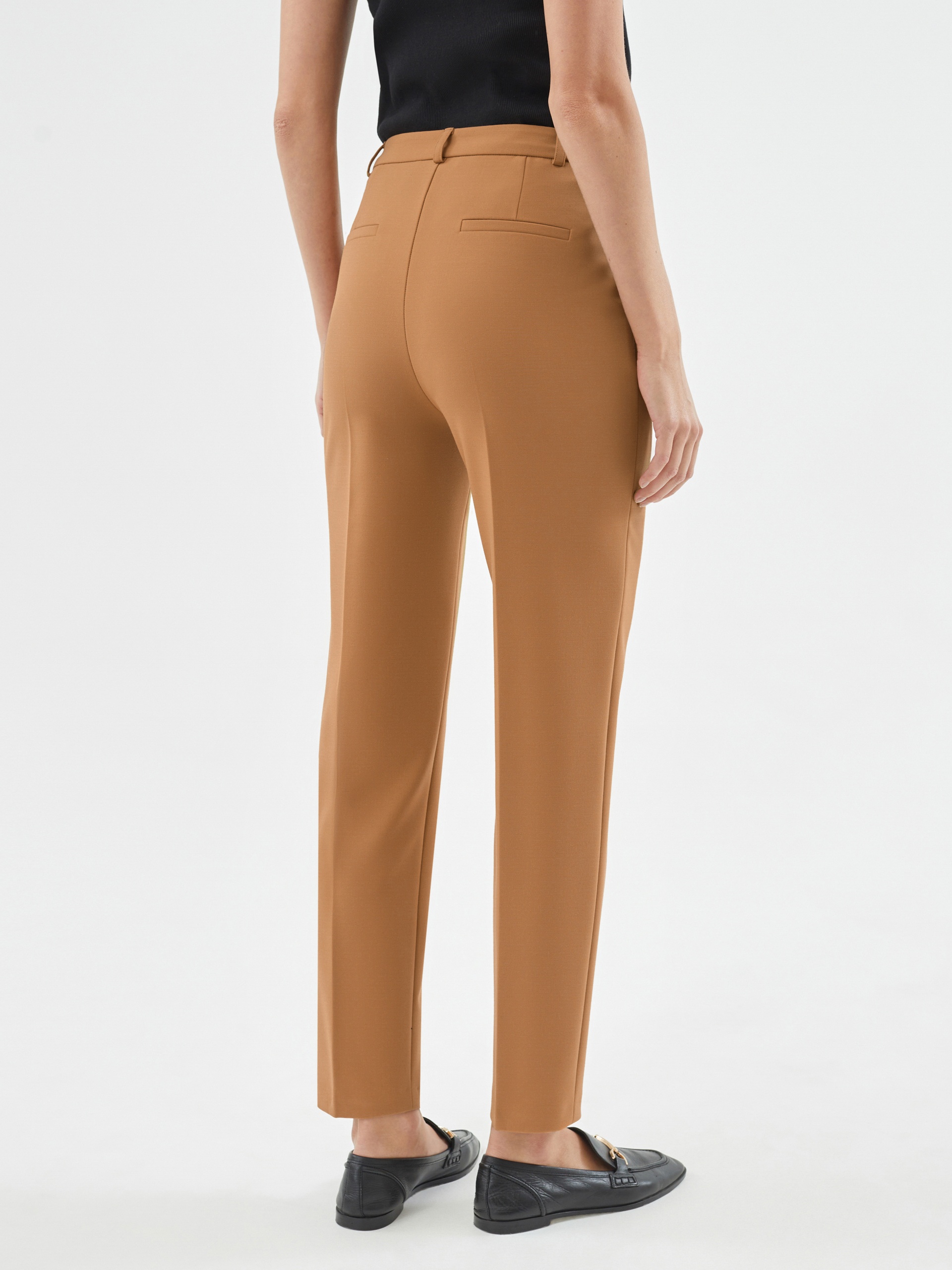Брюки со стрелками из костюмной ткани зауженного к низу силуэта на притачном поясе со шлевками. Спереди рабочие боковые карманы и застежка на молнию и крючок. Эта модель идеально сочетается с жилетом из этой же ткани.