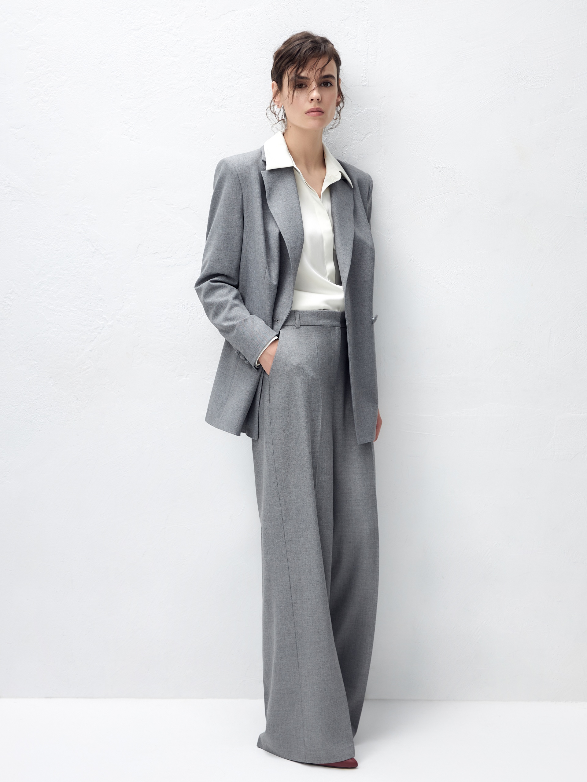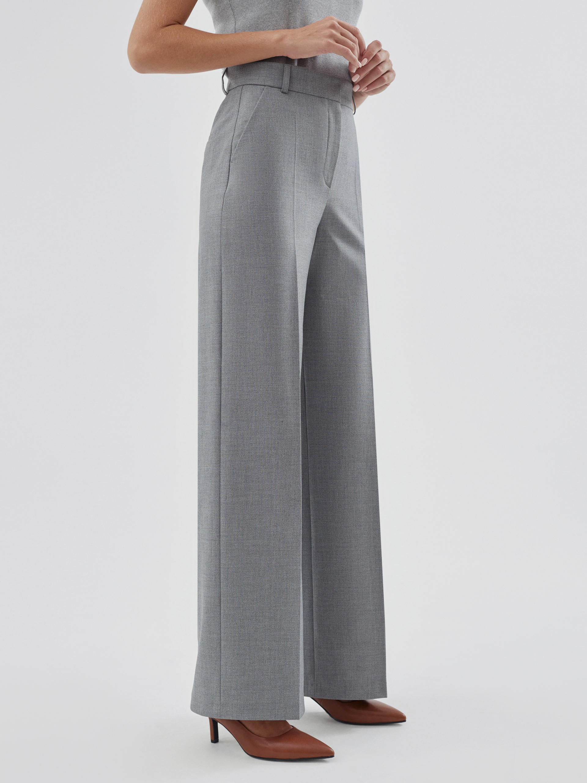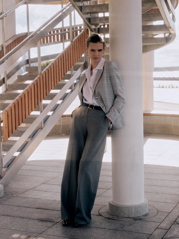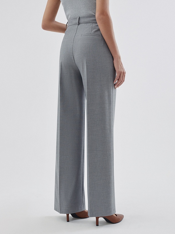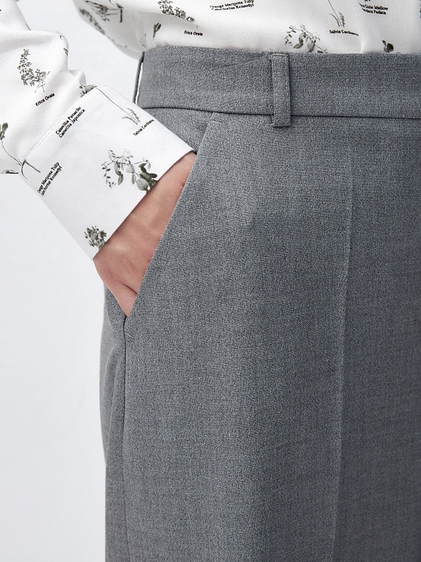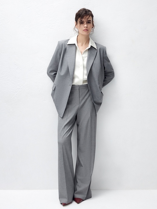 Прямые брюки свободного силуэта из костюмной ткани с добавлением вискозы в сером цвете. Имеют два функциональных кармана по бокам и два прорезных кармана сзади. Брюки идеально сочетаются с жакетом из одного цветового блока.