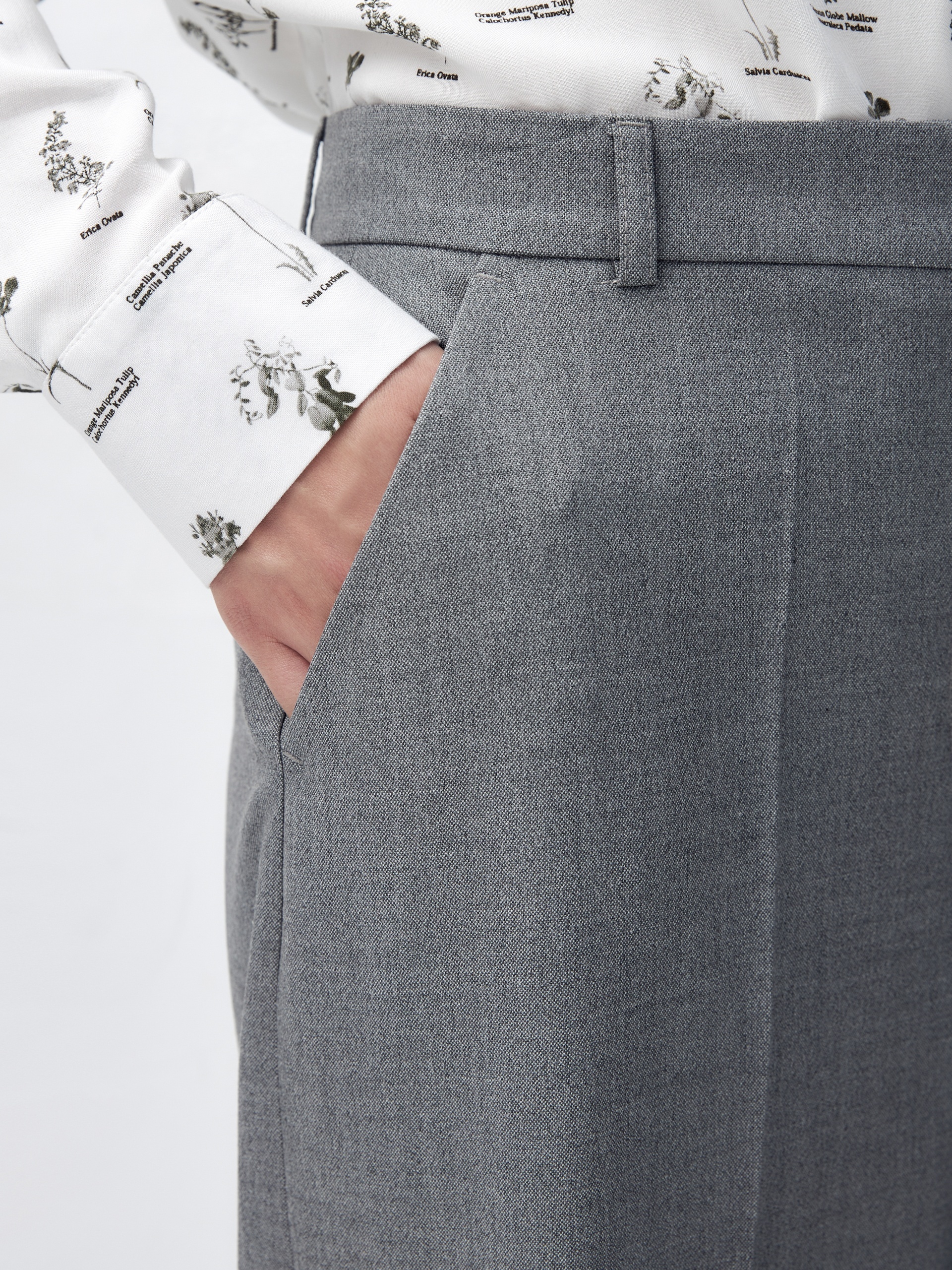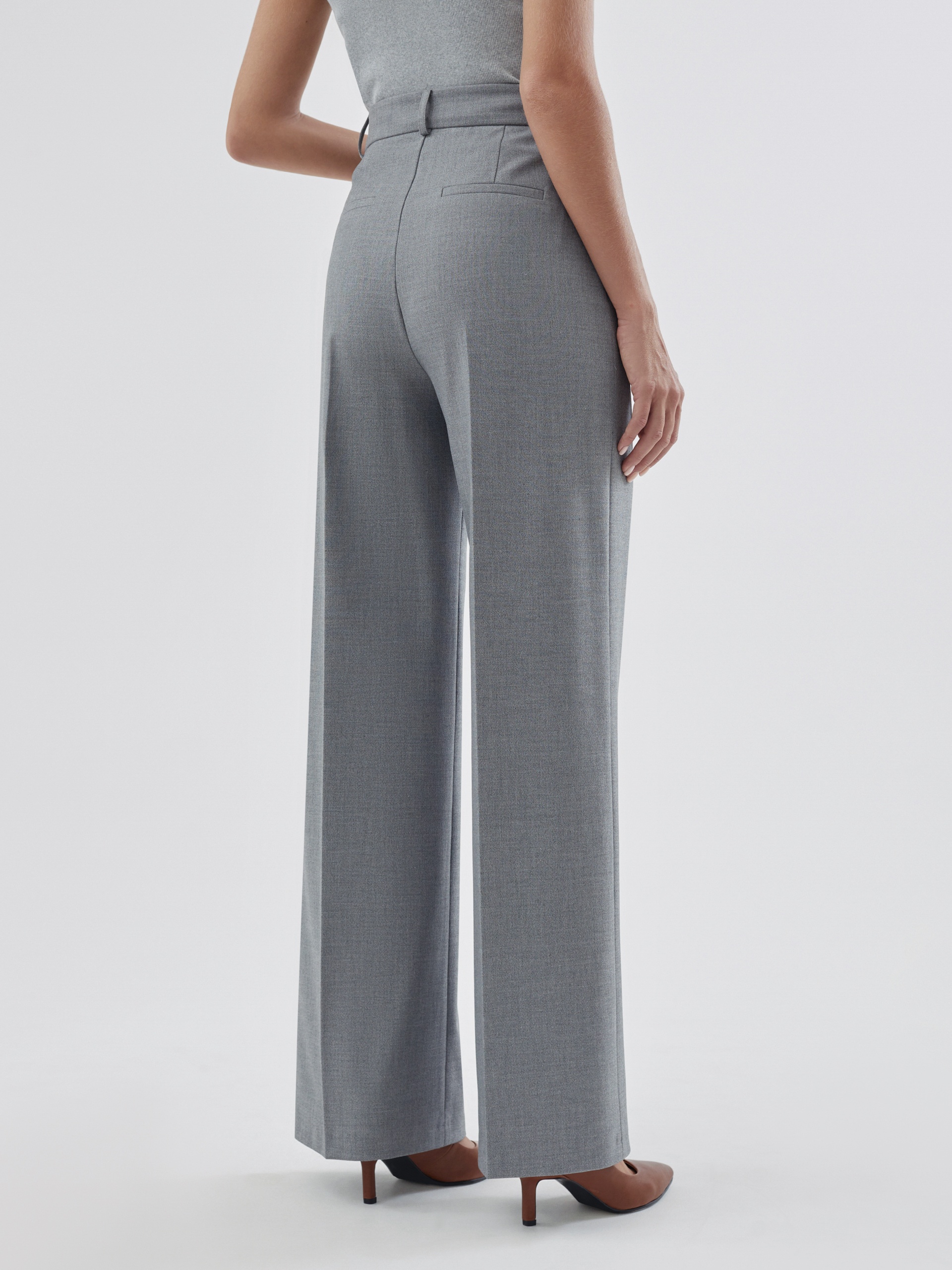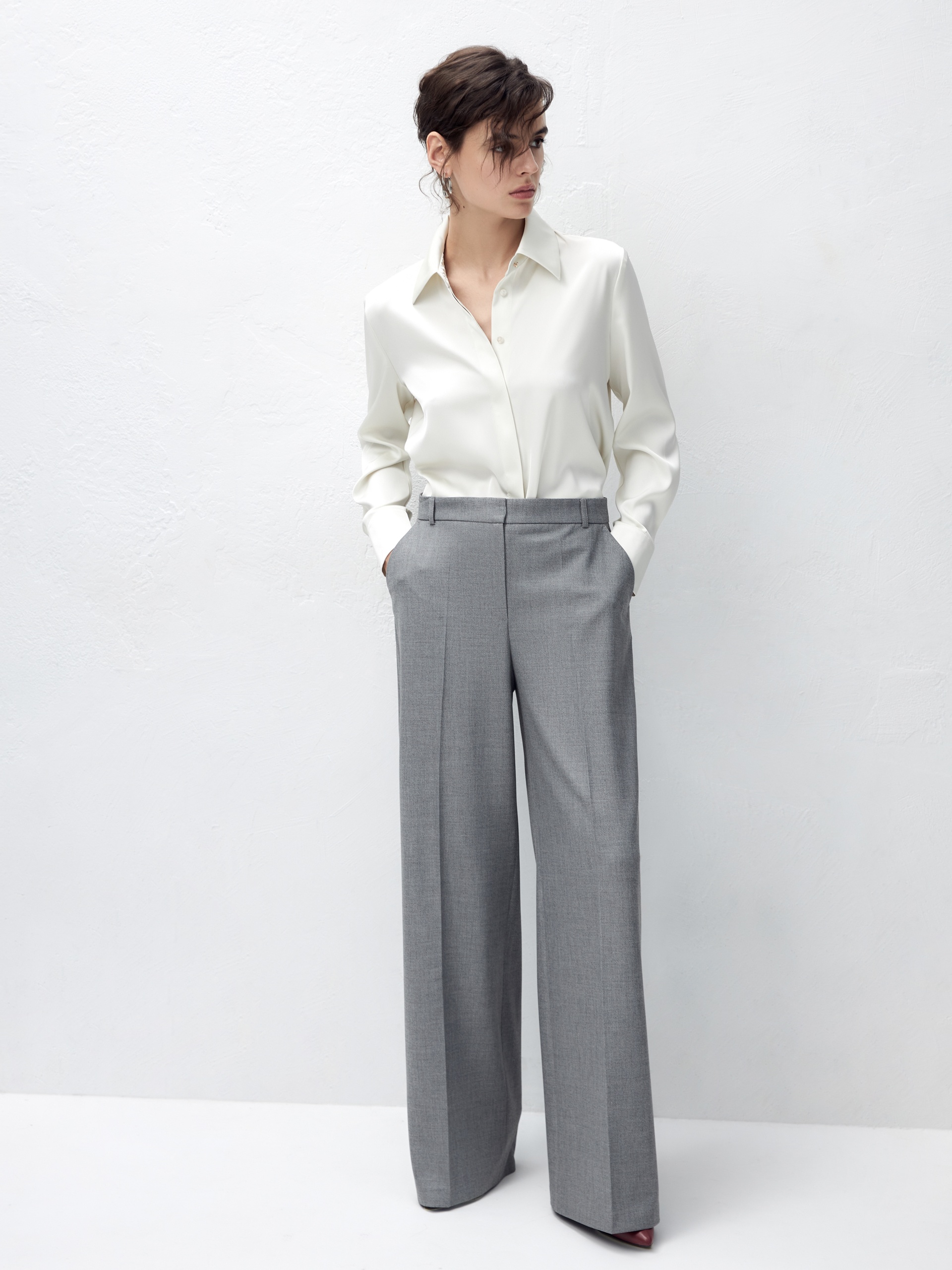 Прямые брюки свободного силуэта из костюмной ткани с добавлением вискозы в сером цвете. Имеют два функциональных кармана по бокам и два прорезных кармана сзади. Брюки идеально сочетаются с жакетом из одного цветового блока.