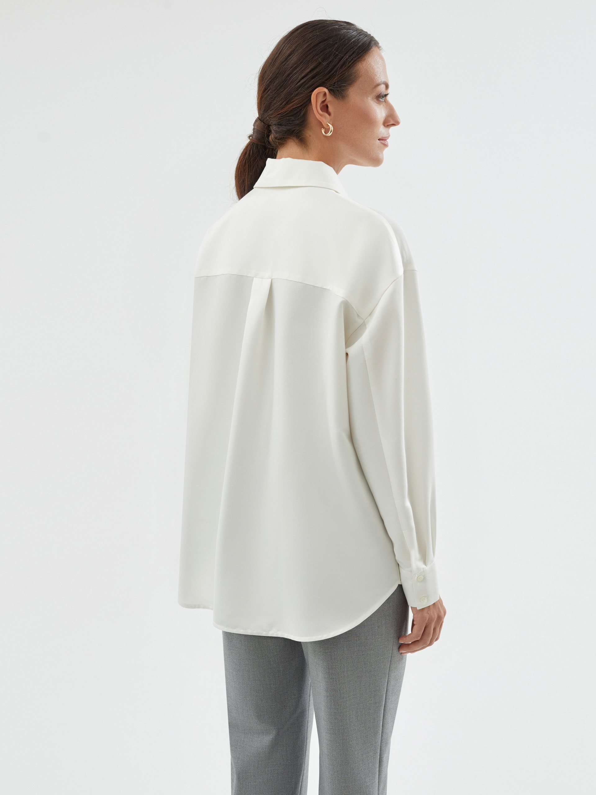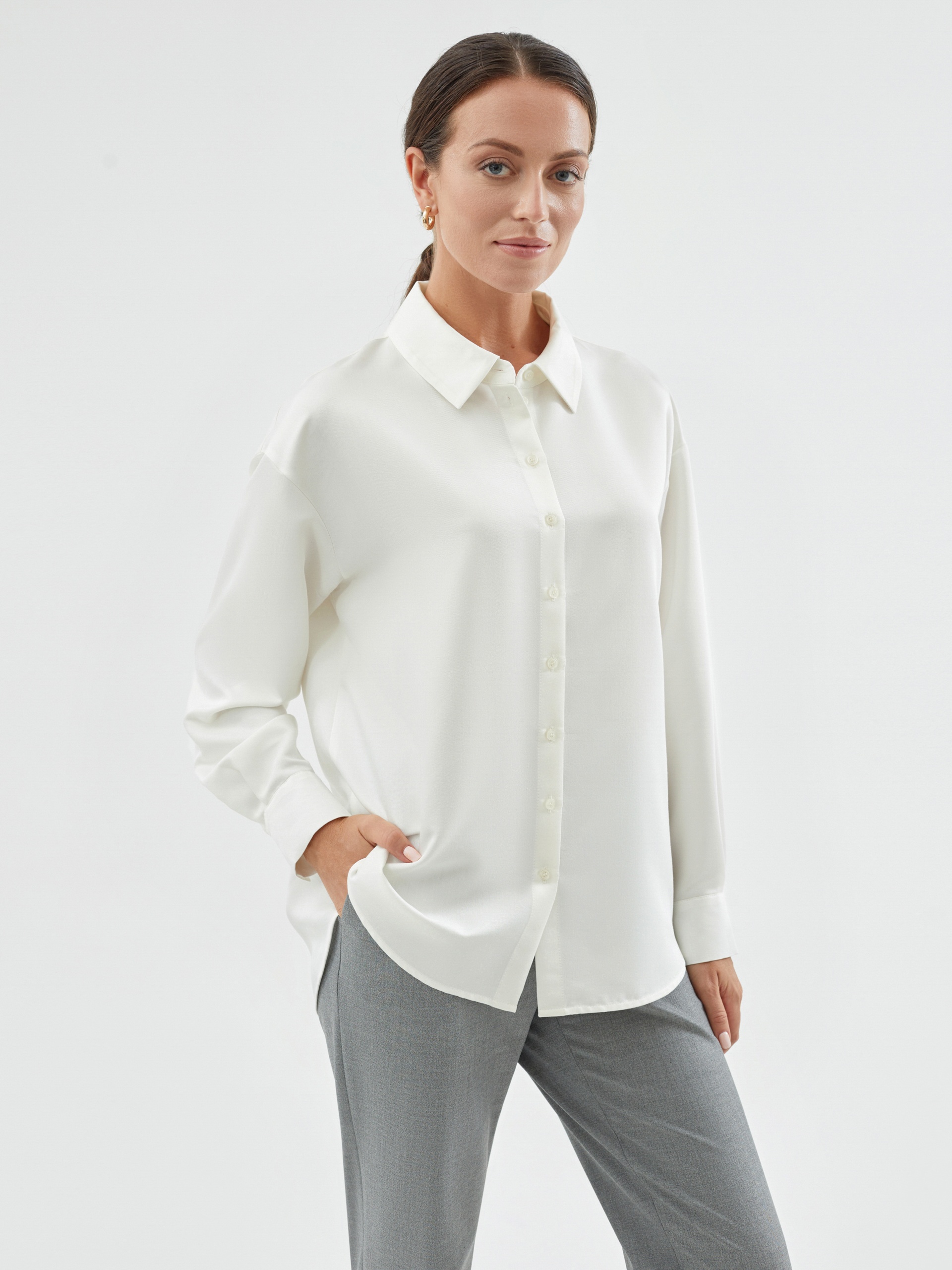 Свободная блуза из вискозной ткани в молочном цвете. Блуза со спущенным плечом и манжетами. На спинке кокетка с бантовой складкой. Низ блузы округлый, спинка длиннее полочки. Блуза классического силуэта идеально впишется в любой гардероб.