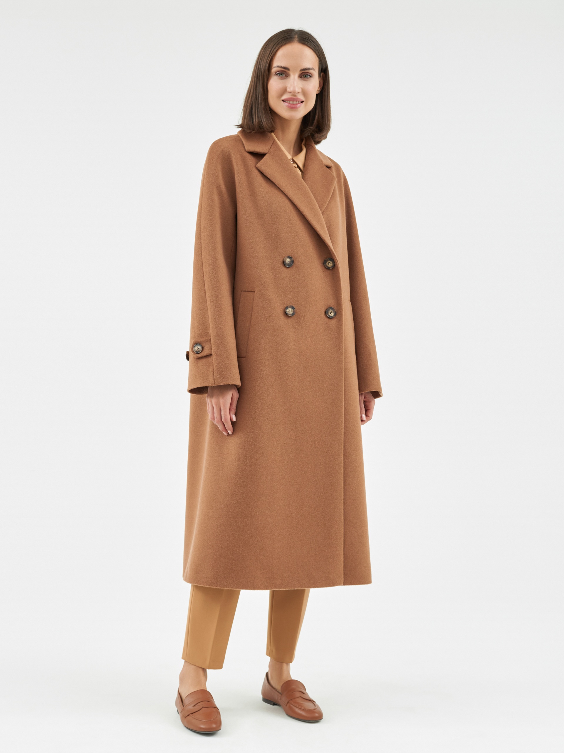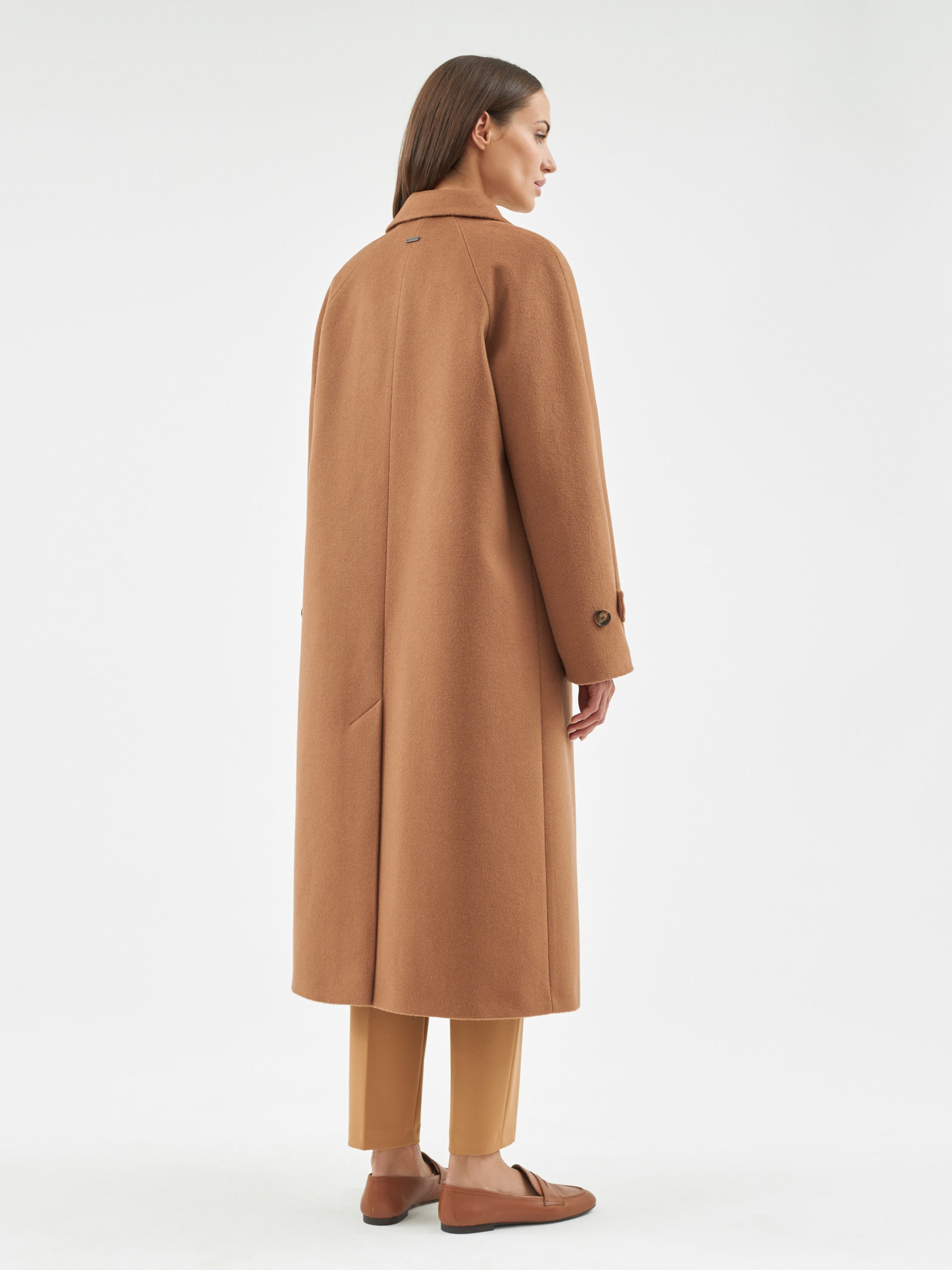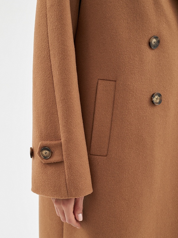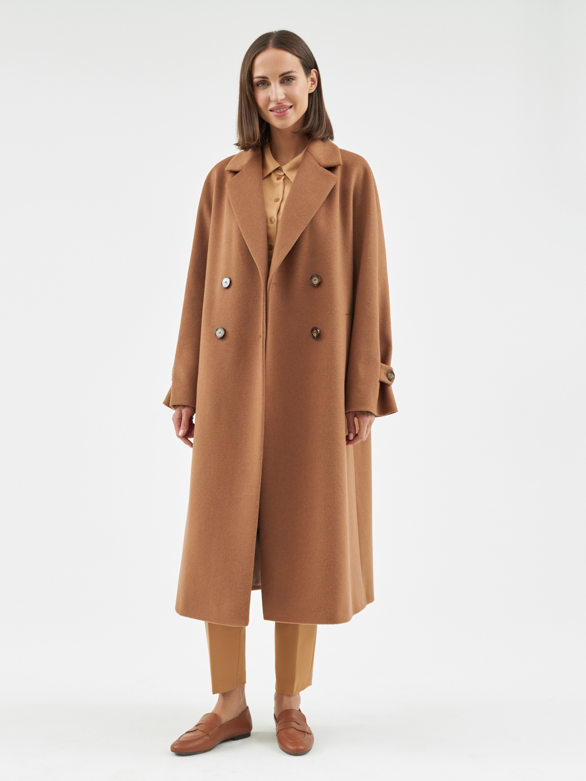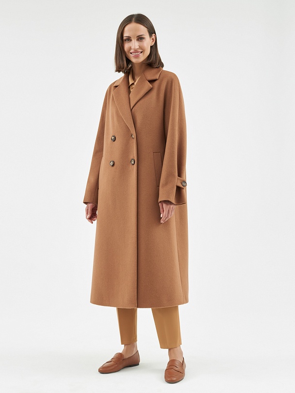 Объемное пальто прямого силуэта из шерстяной ткани в роскошном бежевом оттенке. Классический английский воротник приобретает новую современную форму и стремится к застежке пальто, что зрительно вытягивает силуэт. Пальто имеет мягкую линию рукава-кимоно, по низу которого рсположена встречная складка с фиксацией на пату для регулировки объема рукава. Длина пальто ниже колена, в среднем шве спинки располагается высокая шлица. Спинка имеет дополнительное утепление. Застегивается изделие на ряд крупных темных стильных пуговиц. Для наилучшей защиты от непогоды пальто выполнено с использованием высокотехнологичной мембраны RaftPro и современного легкого утеплителя. Произведено в Санкт-Петербурге.