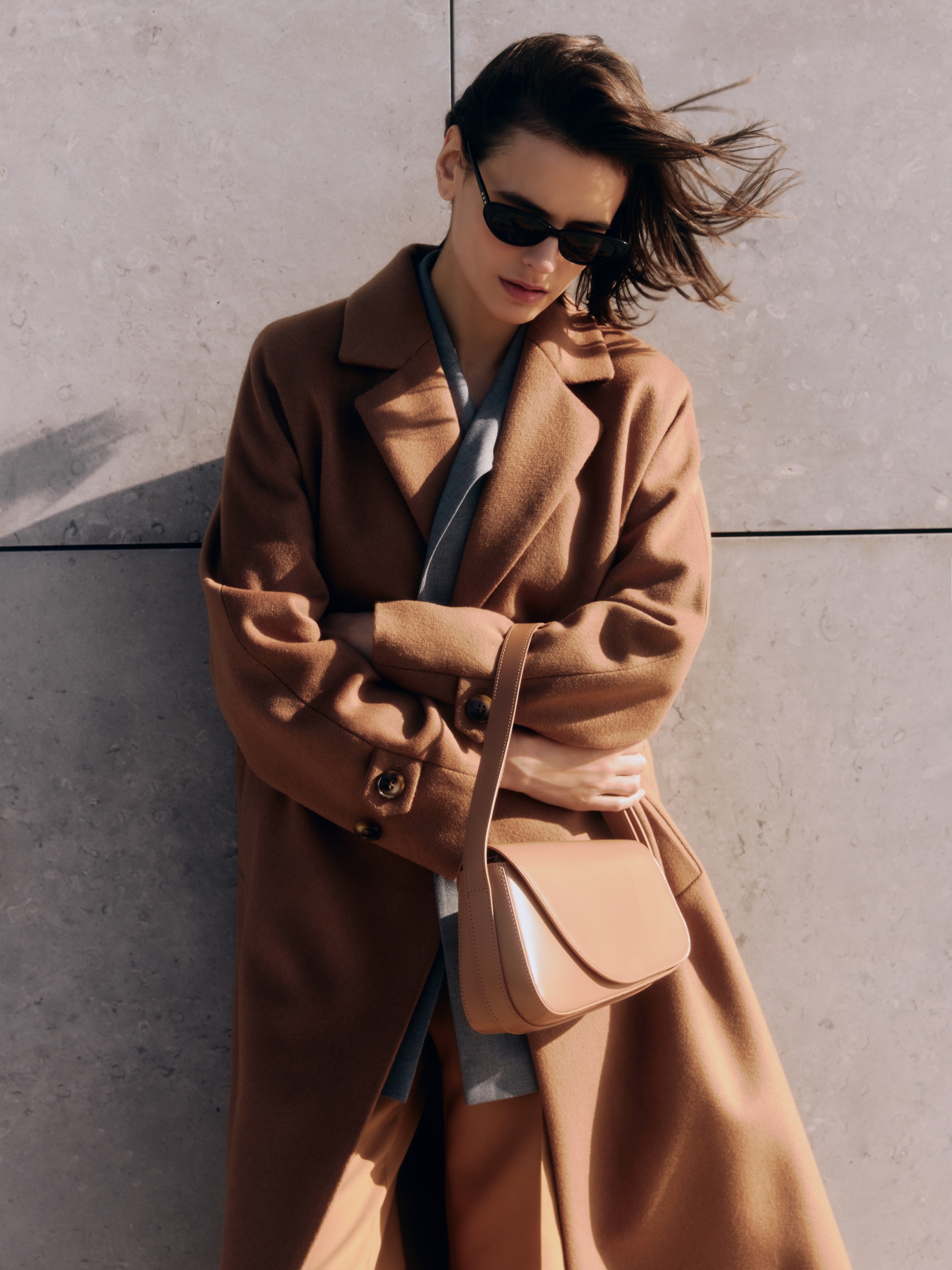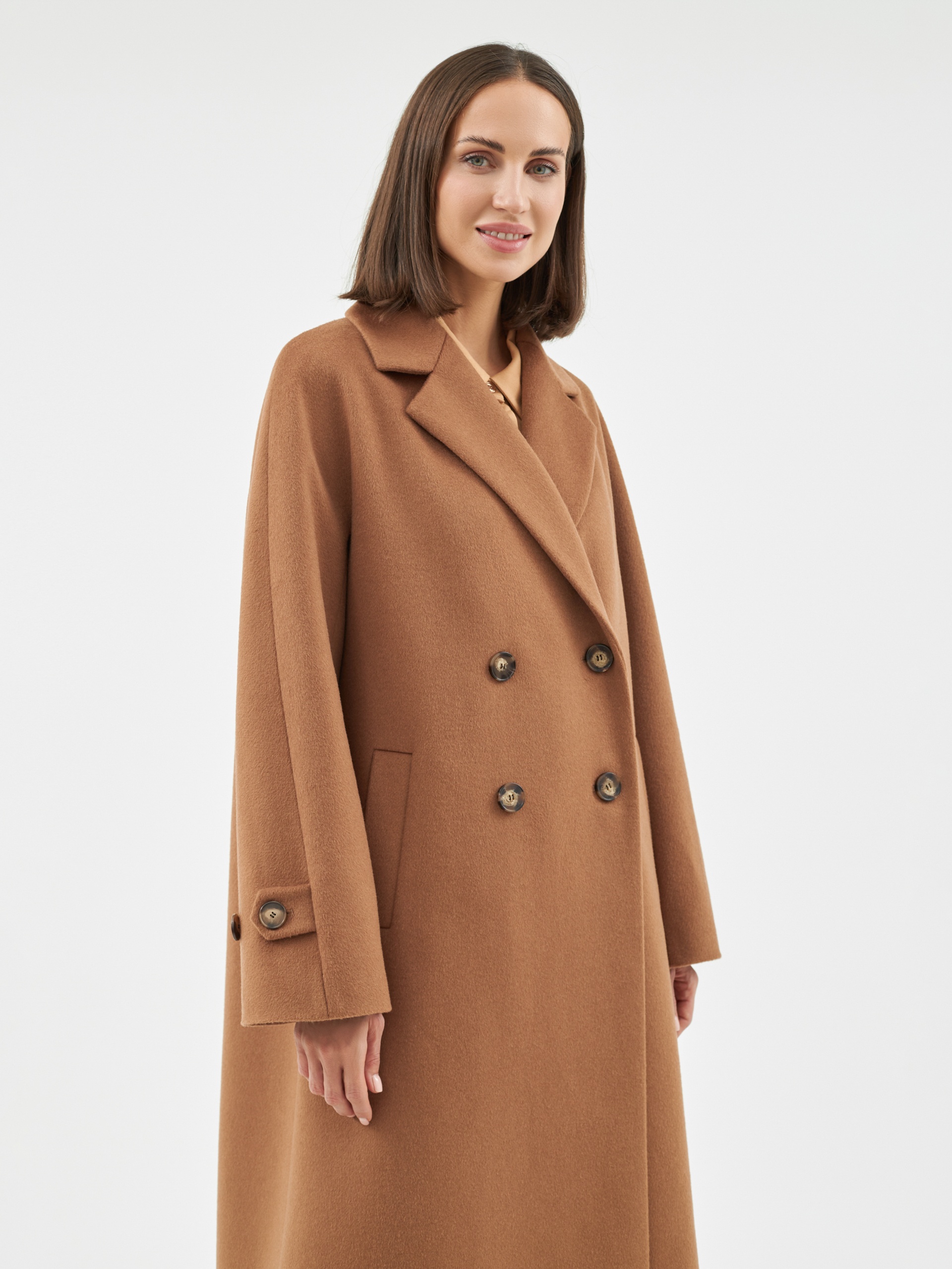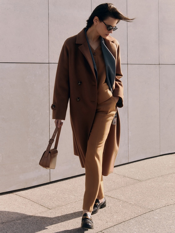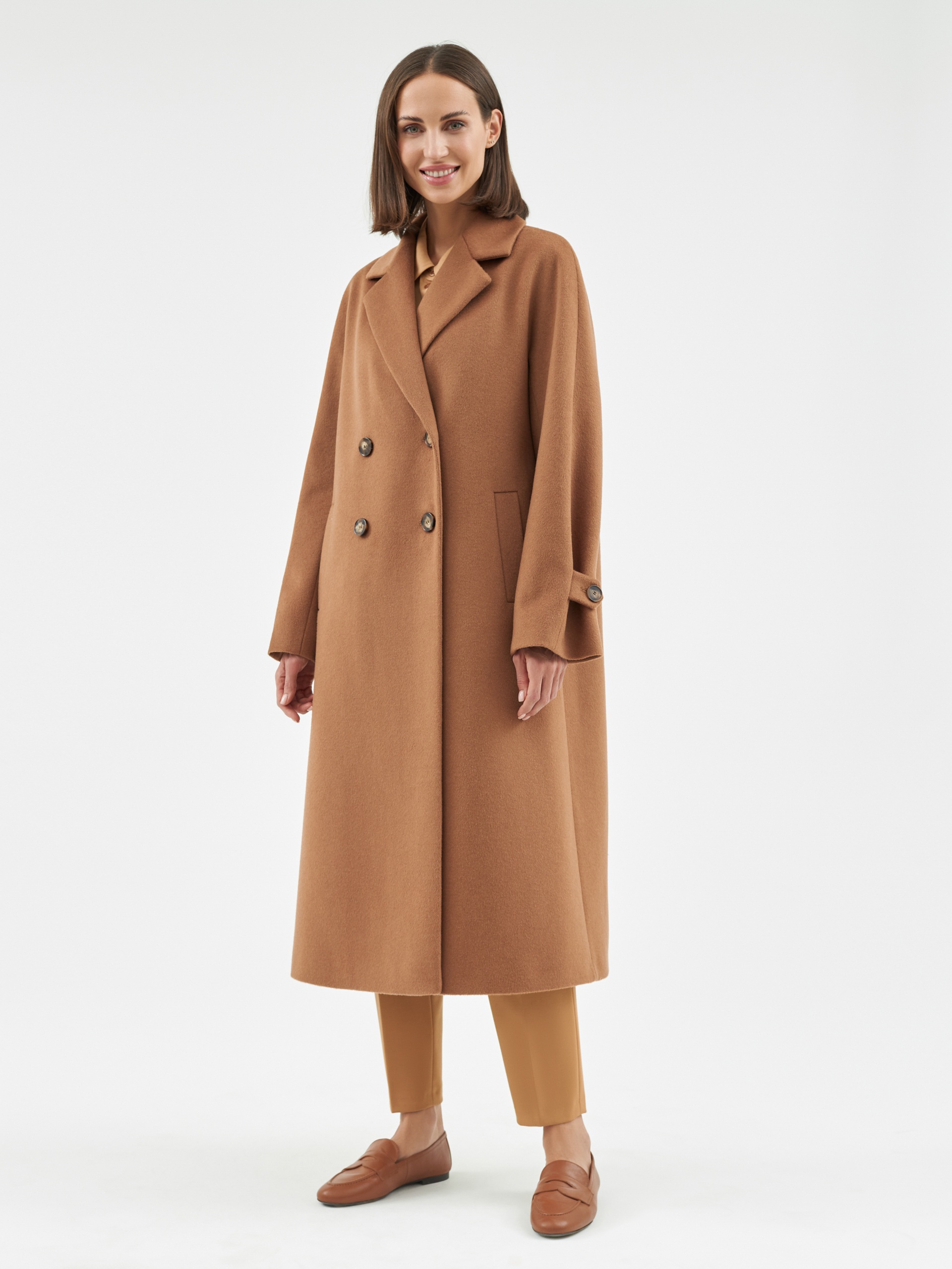 Объемное пальто прямого силуэта из шерстяной ткани в роскошном бежевом оттенке. Классический английский воротник приобретает новую современную форму и стремится к застежке пальто, что зрительно вытягивает силуэт. Пальто имеет мягкую линию рукава-кимоно, по низу которого рсположена встречная складка с фиксацией на пату для регулировки объема рукава. Длина пальто ниже колена, в среднем шве спинки располагается высокая шлица. Спинка имеет дополнительное утепление. Застегивается изделие на ряд крупных темных стильных пуговиц. Для наилучшей защиты от непогоды пальто выполнено с использованием высокотехнологичной мембраны RaftPro и современного легкого утеплителя. Произведено в Санкт-Петербурге.