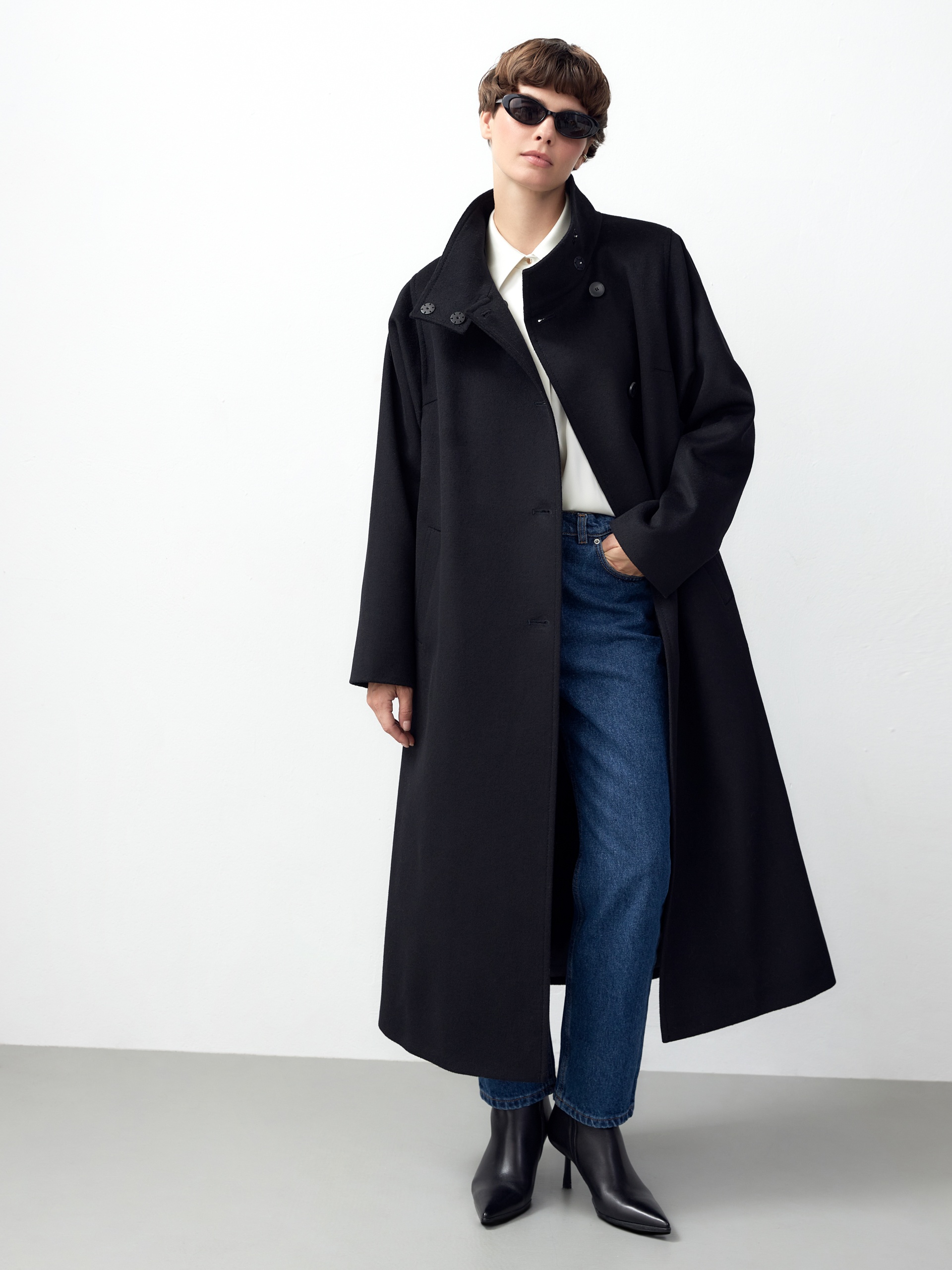 Двубортное пальто трапециевидного силуэта из пальтовой ткани с высоким содержанием шерсти в благородном черном цвете, который возвращается в моду в этом сезоне. Пальто имеет высокий воротник-стойку с застежкой на кнопки, который при необходимости можно отвернуть, и он создаст роскошную форму воротника-апаш. Рукав имеет уникальную форму "отрезное кимоно", за счет чего линия плеча зрительно заужена, а рукав при этом широкий и комфортный. Застежка пальто ассиметричная, на ряд крупных черных пуговиц. По бокам располагается два функциональных глубоких кармана. В комплекте к пальто прилагается съемный модный узкий пояс, который подчеркнет талию и привлечет внимание к деталям. Длина пальто ниже колена, спинка имеет дополнитедьное утепление, что делает пальто невероятно теплым. Для наилучшей защиты от ветра и холода пальто произведено с использованием высокотехнологичной мембраны RaftPro и ультралегкого современного утеплителя. Произведено в Санкт-Петербурге.