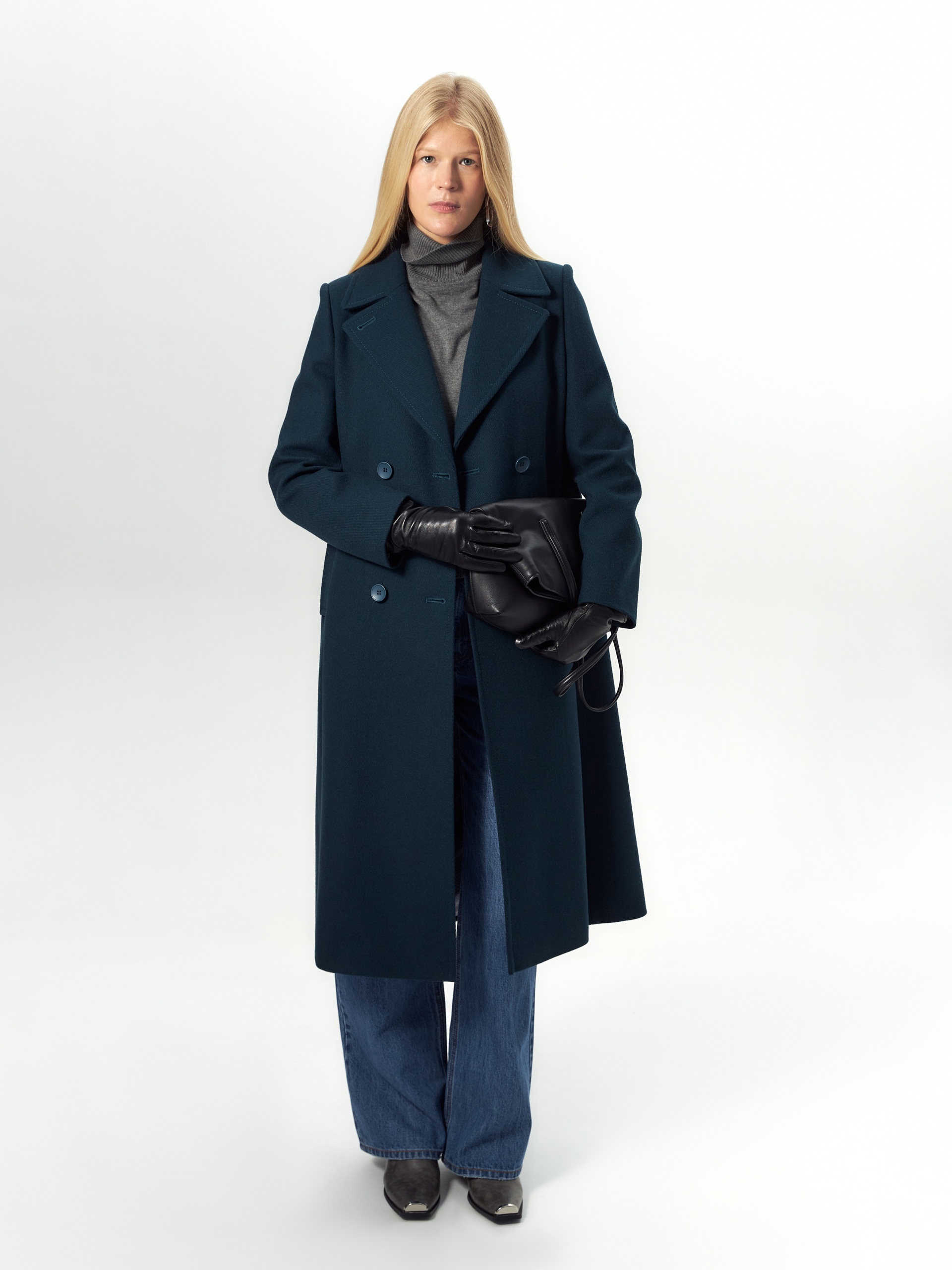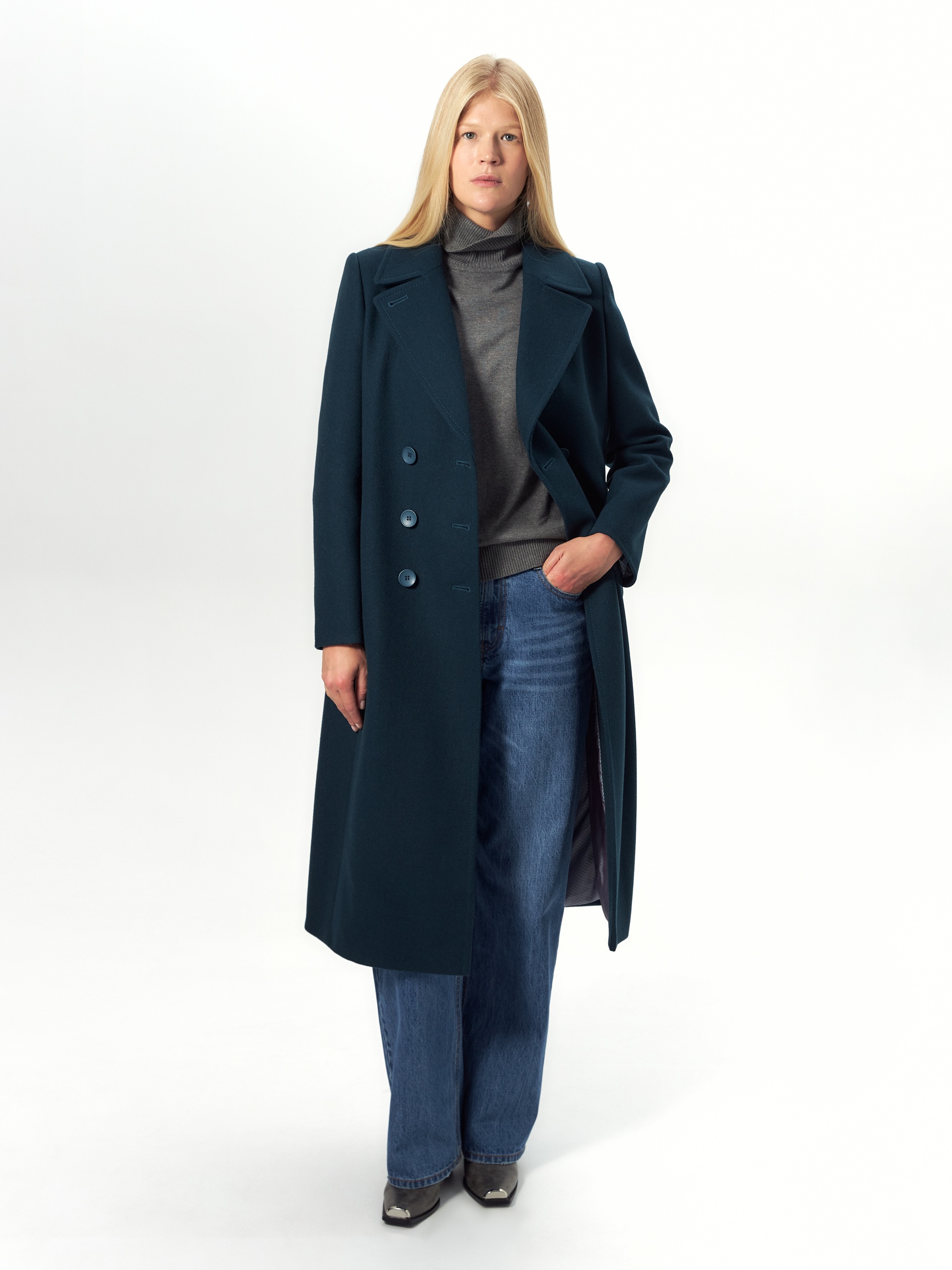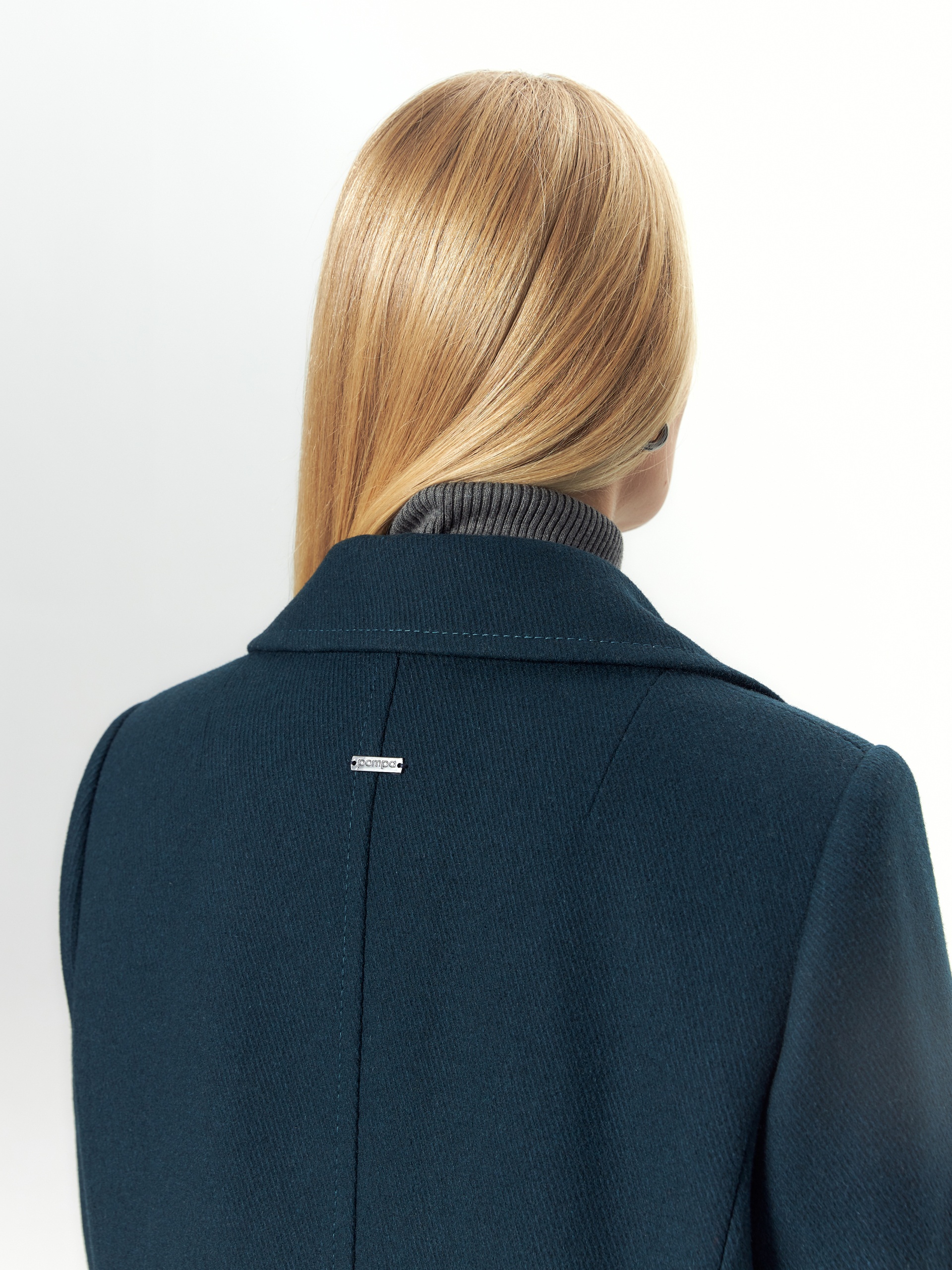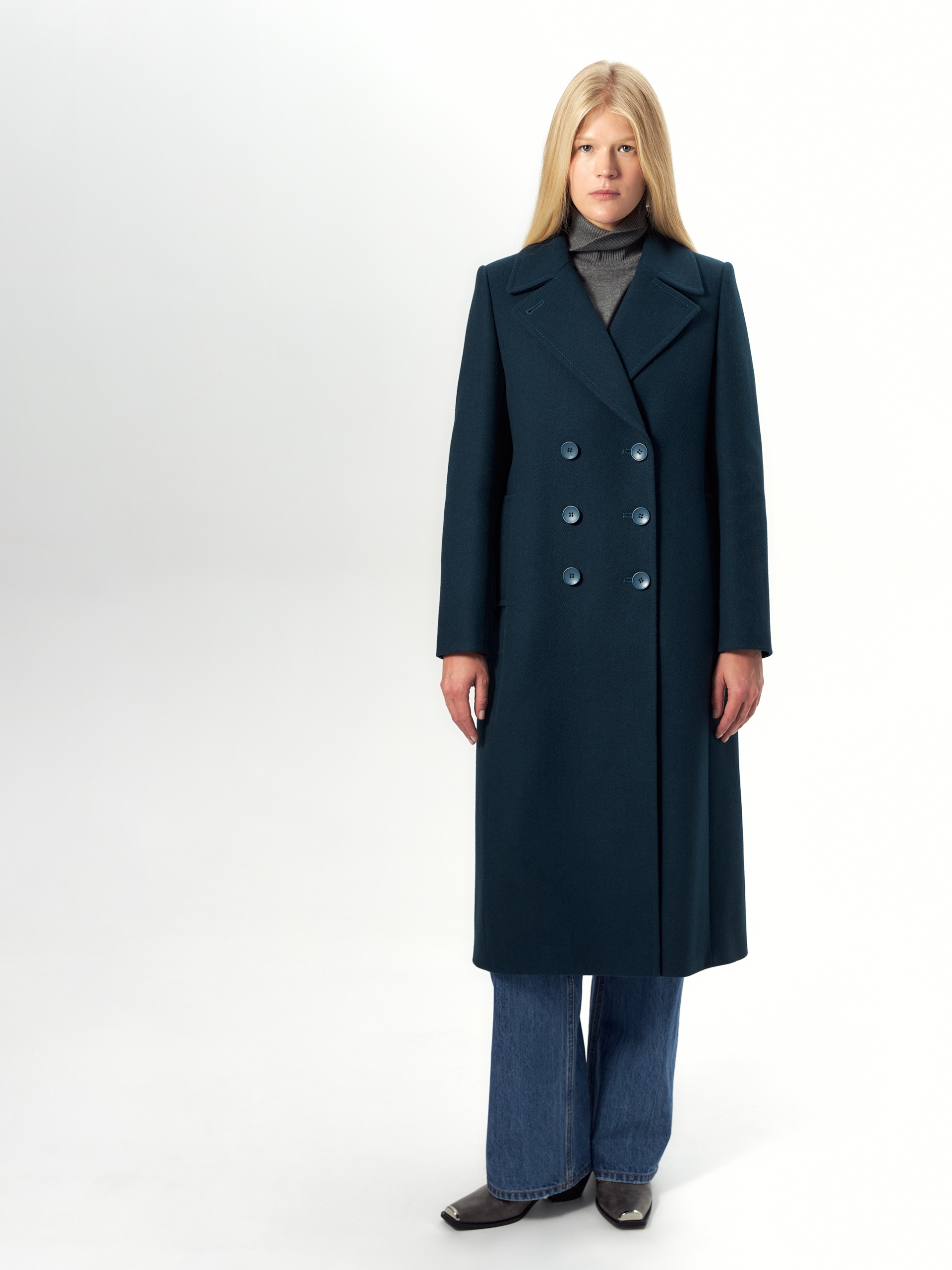 Двубортное пальто из шерстяной ткани яркого изумрудного цвета с эффектом диагональ. Пальто имеет новую неповторимую форму. Лёгкое прилегание силуэта достигается благодаря рельефным швам. В рельефах располагаются два глубоких кармана с листочками. Пальто имеет максимальную длину, что зрительно вытягивает силуэт. Дополняет стилистику пальто уникальная конструкция английского воротника с возможностью полностью поднять его. Застёжка на три ряда крупных пуговиц в тон ткани. Изделие декорировано отделочными строчками. Спинка пальто имеет дополнительное утепление. А для дополнительной защиты от непогоды пальто выполнено с использованием высокотехнологичной мембраны RaftPro, надежно защищающей от ветра, холода и перепада температур. Произведено в Санкт-Петербурге.