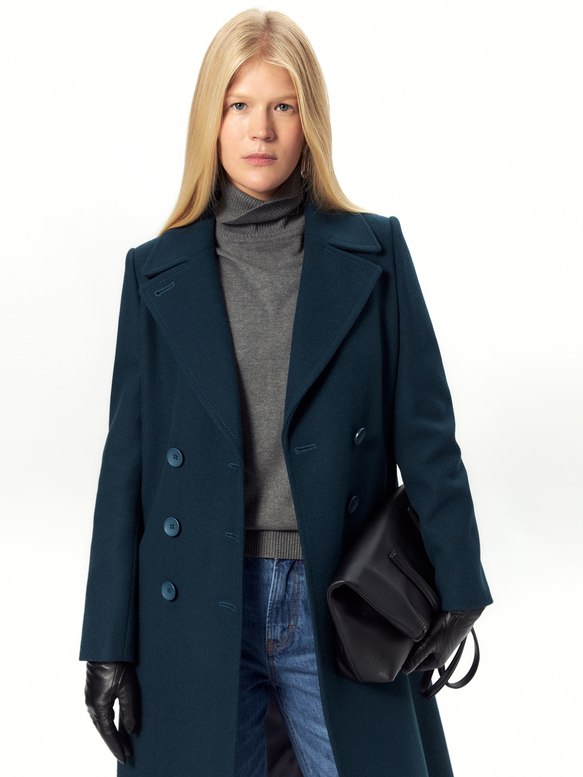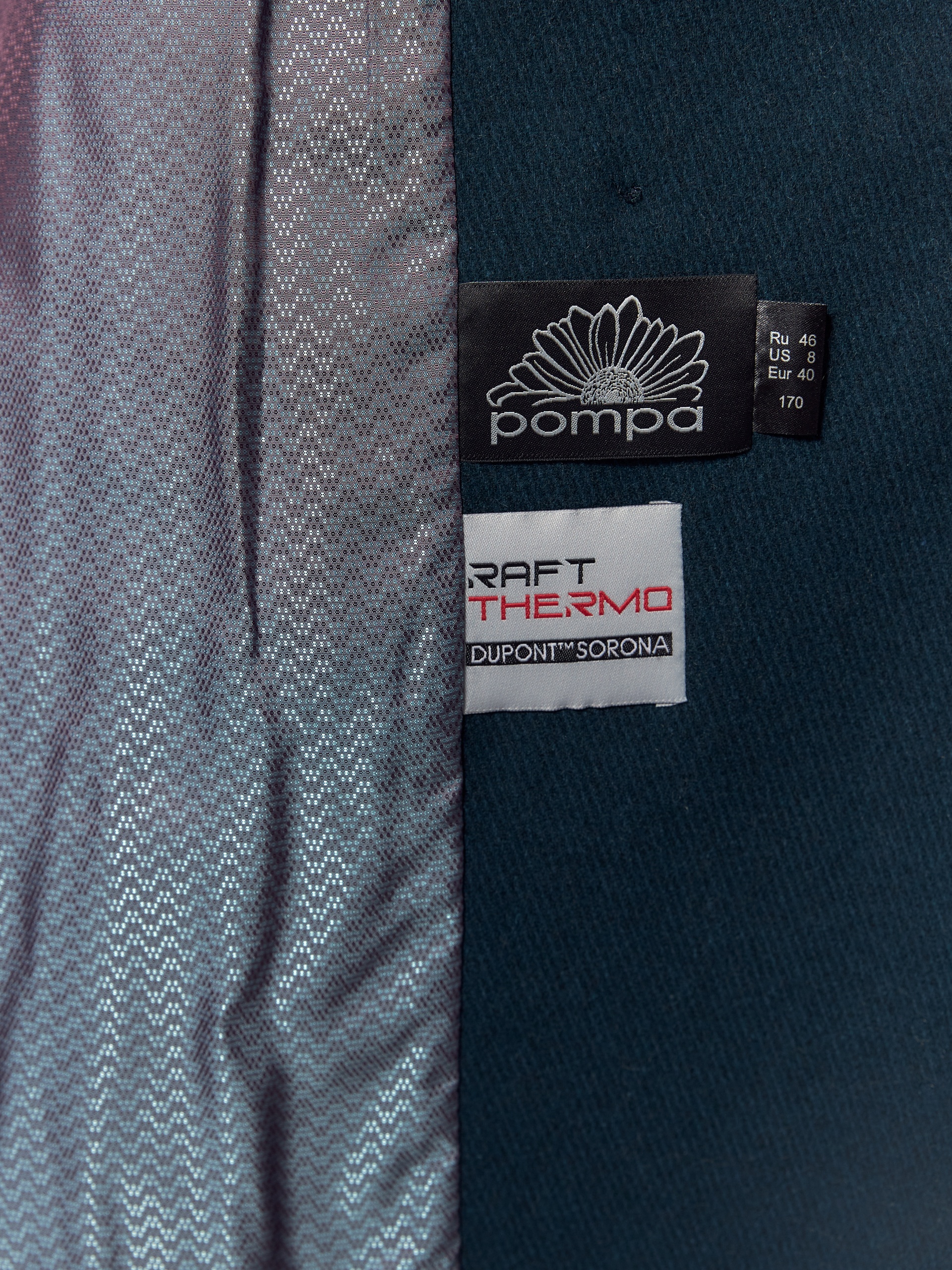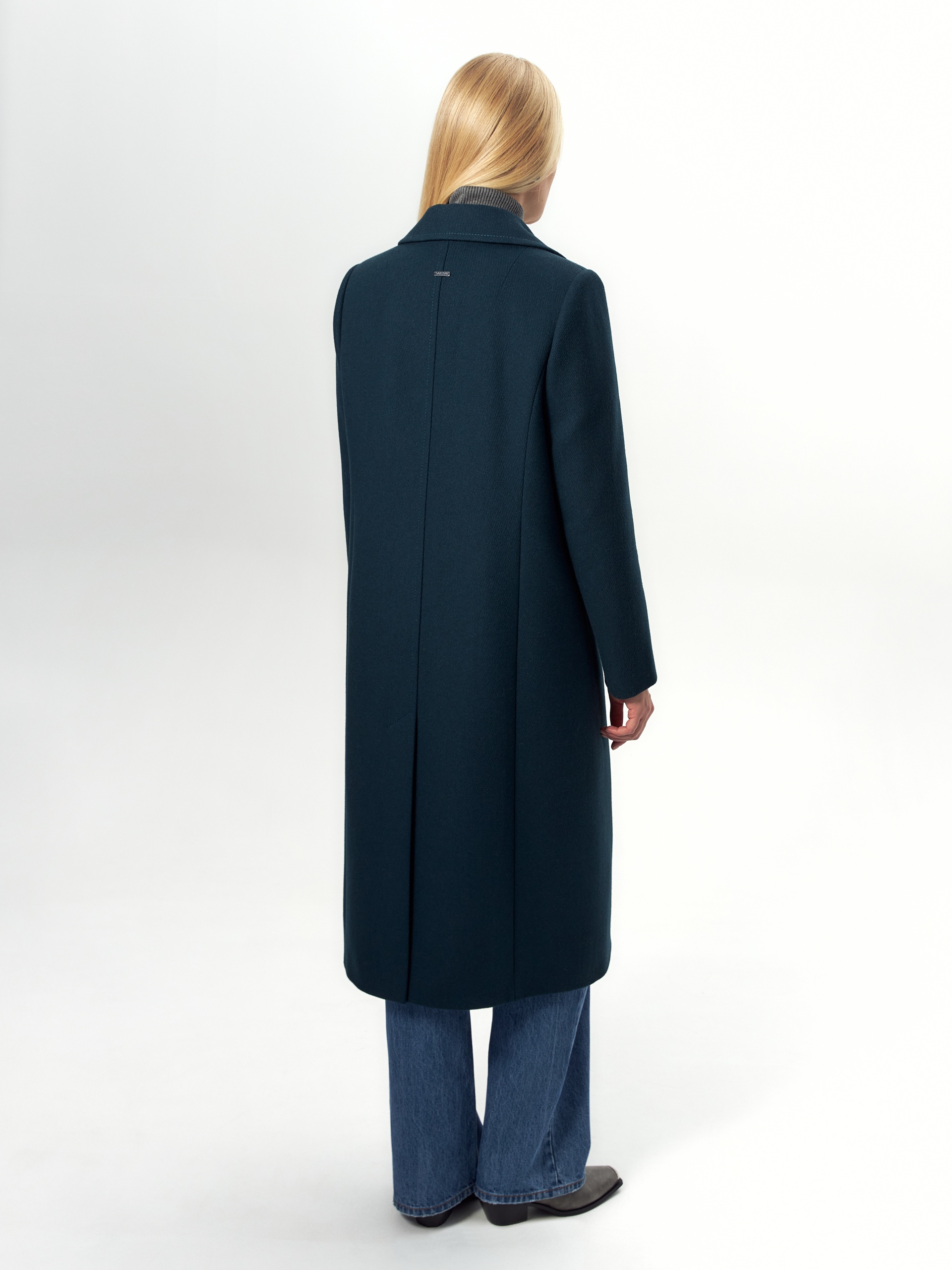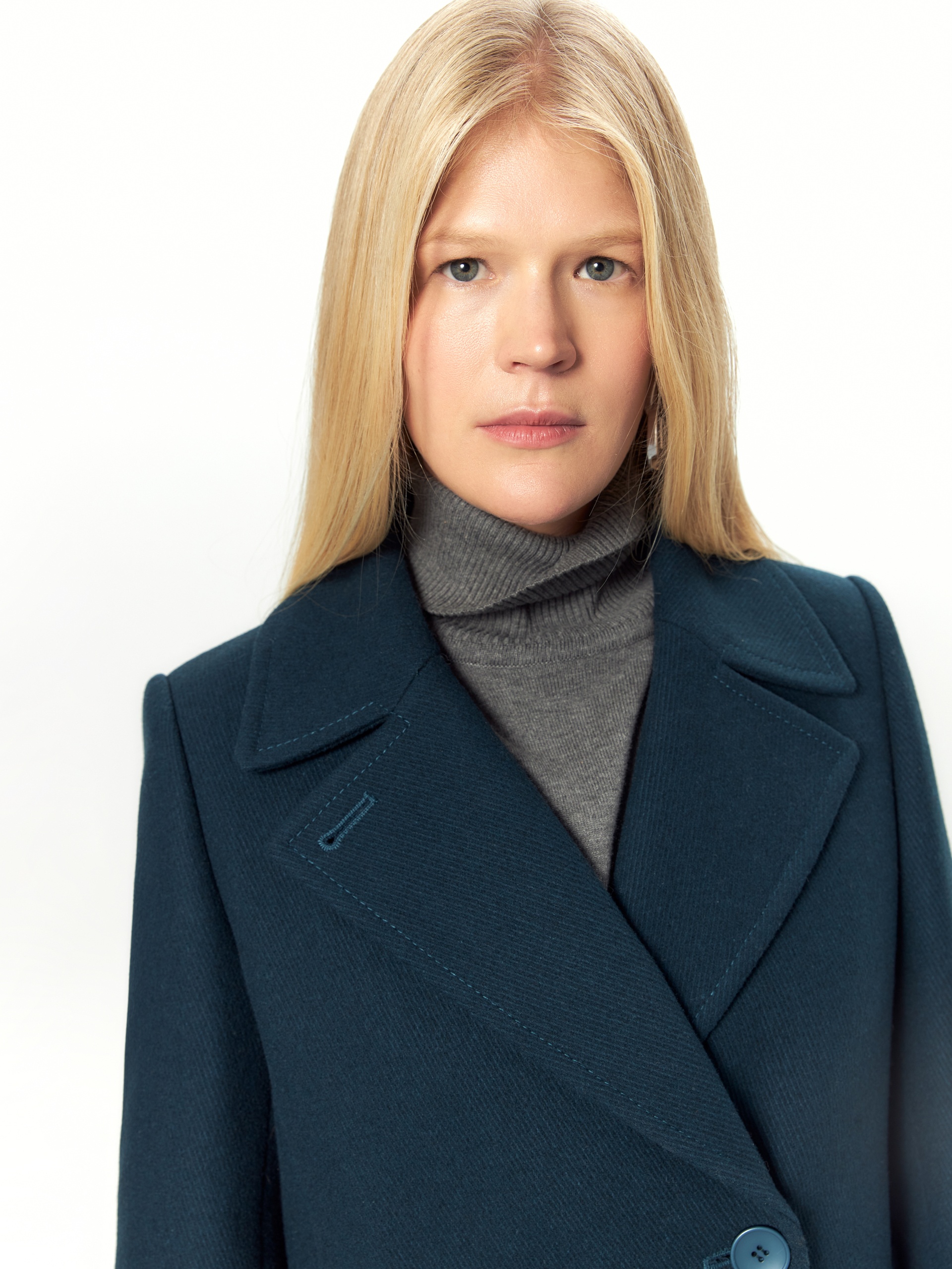 Двубортное пальто из шерстяной ткани яркого изумрудного цвета с эффектом диагональ. Пальто имеет новую неповторимую форму. Лёгкое прилегание силуэта достигается благодаря рельефным швам. В рельефах располагаются два глубоких кармана с листочками. Пальто имеет максимальную длину, что зрительно вытягивает силуэт. Дополняет стилистику пальто уникальная конструкция английского воротника с возможностью полностью поднять его. Застёжка на три ряда крупных пуговиц в тон ткани. Изделие декорировано отделочными строчками. Спинка пальто имеет дополнительное утепление. А для дополнительной защиты от непогоды пальто выполнено с использованием высокотехнологичной мембраны RaftPro, надежно защищающей от ветра, холода и перепада температур. Произведено в Санкт-Петербурге.