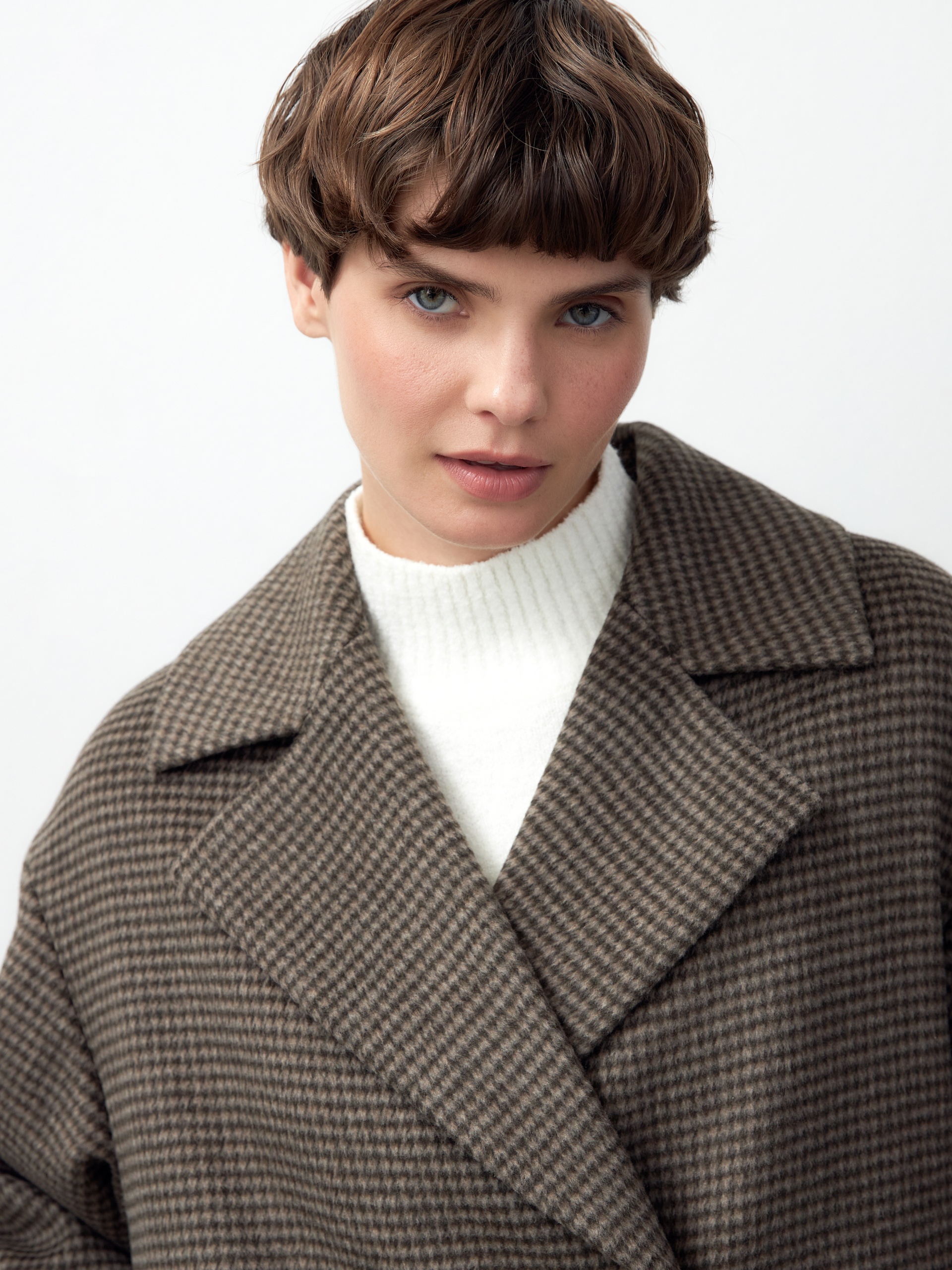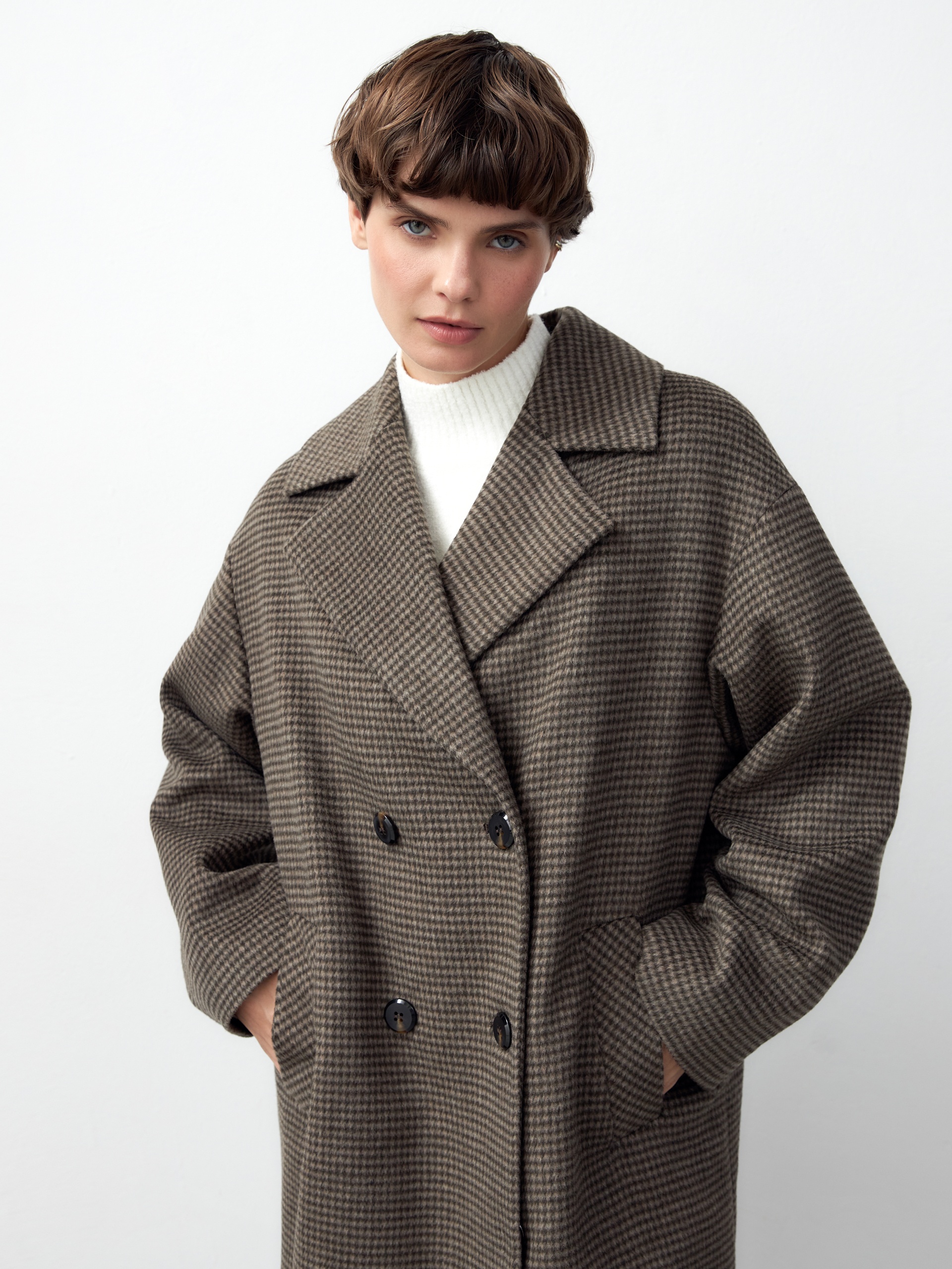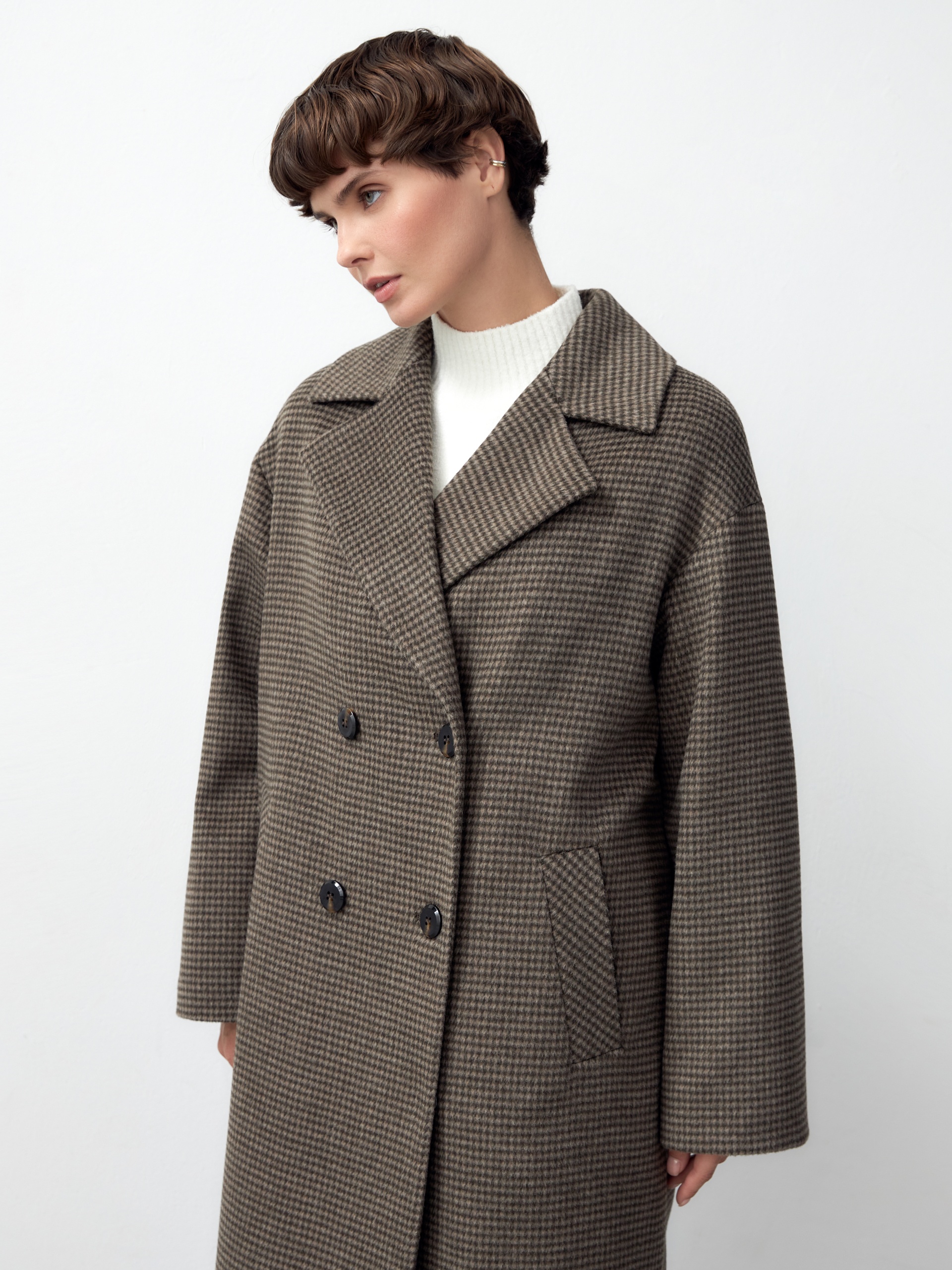 Объемное пальто силуэта "удлиненный кокон" из мягкой шерстяной ворсовой ткани в древесном оттенке с принтом пье-де-пуль. Пальто имеет универсальную длину ниже колена, классический английский воротник и надежную застежку на два ряда стильных матовых пуговиц. Рукав пальто рубашечный, что выглядит очень мягко и женственно, а также позволяет надевать нижним слоем даже объемные вещи, не стесняя движений. По бокам изделия расположены вместительные карманы с листочками. Благодаря мягкой шерстяной ткани пальто не только очень комфортное и уютное, но и невероятно теплое. А для наилучшей защиты от непогоды пальто произведено с использованием высокотехнологичной мембраны RaftPro и современного легкого утеплителя. Произведено в Санкт-Петербурге.