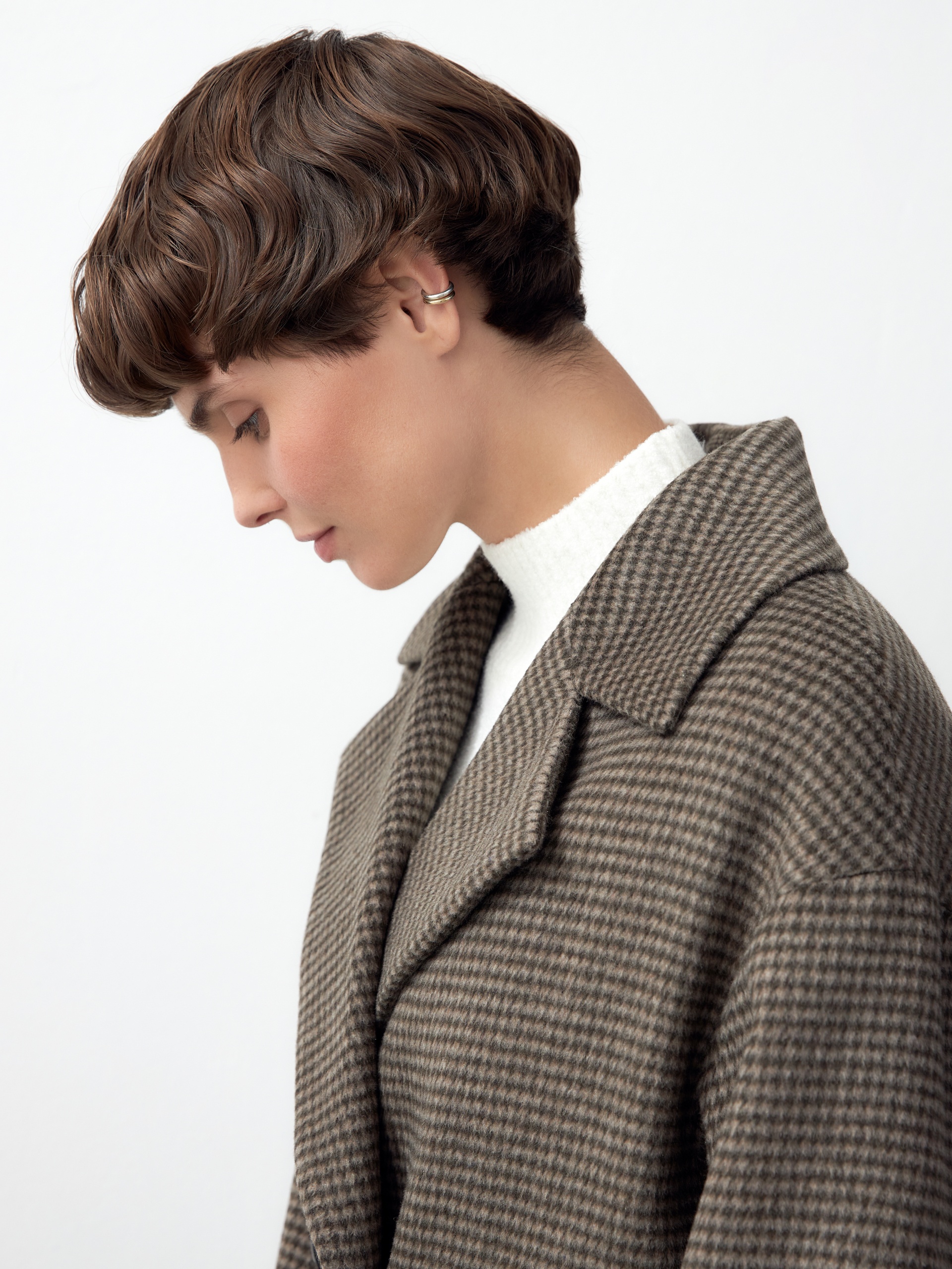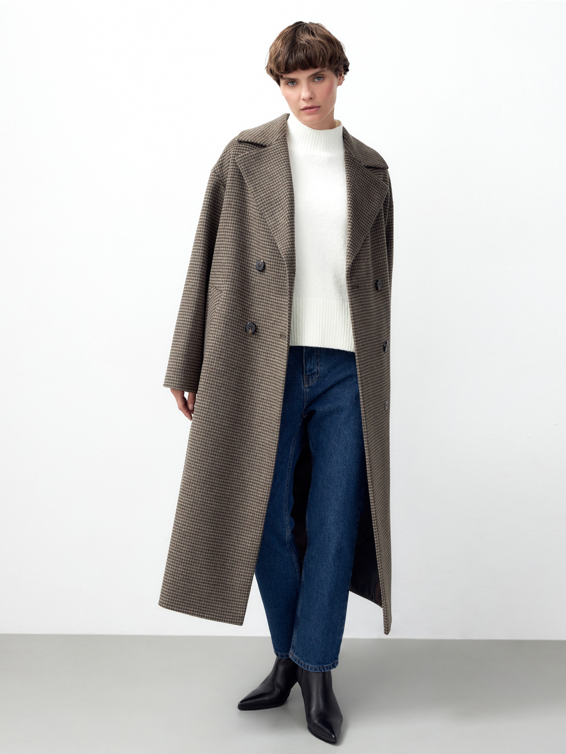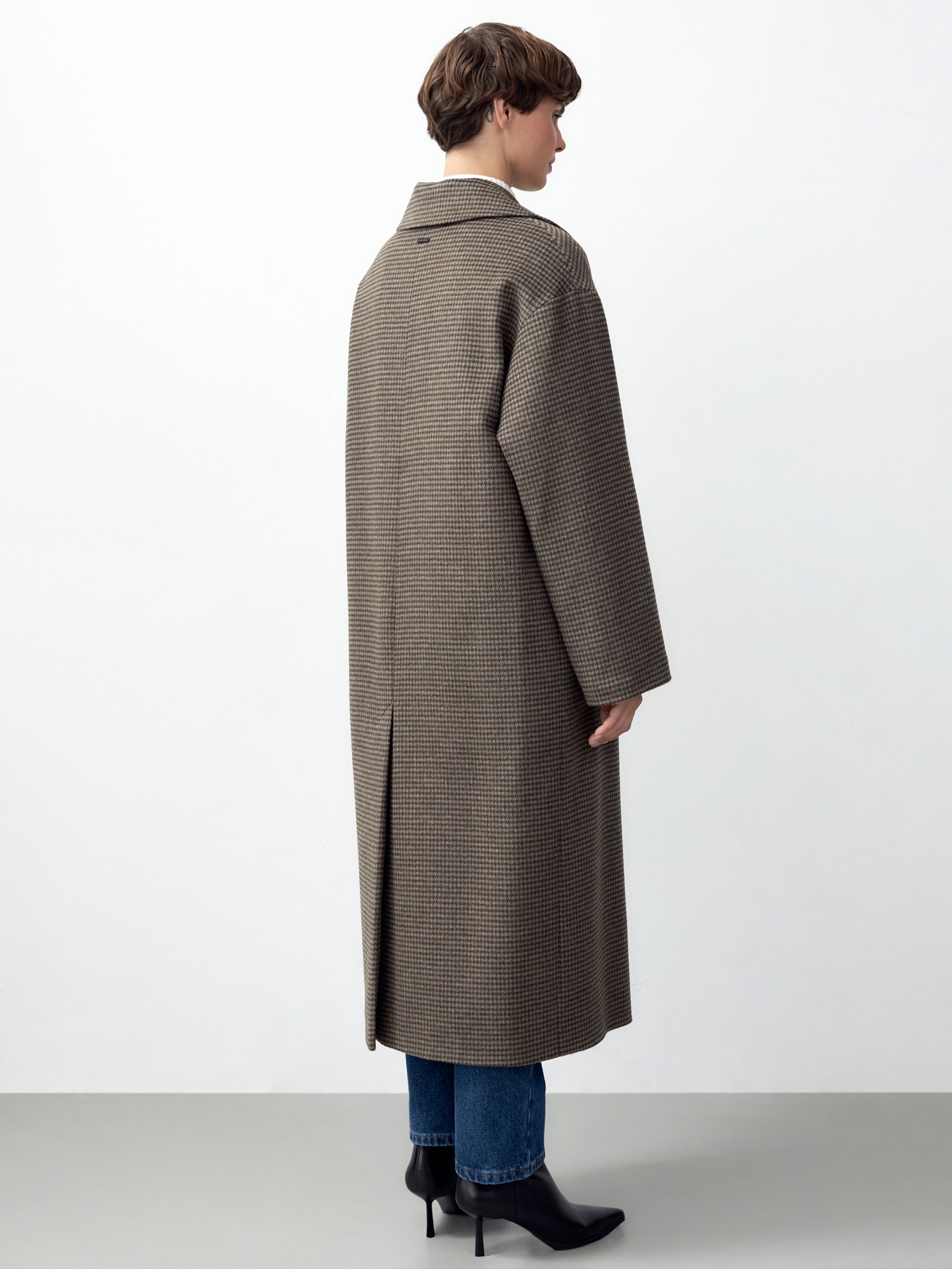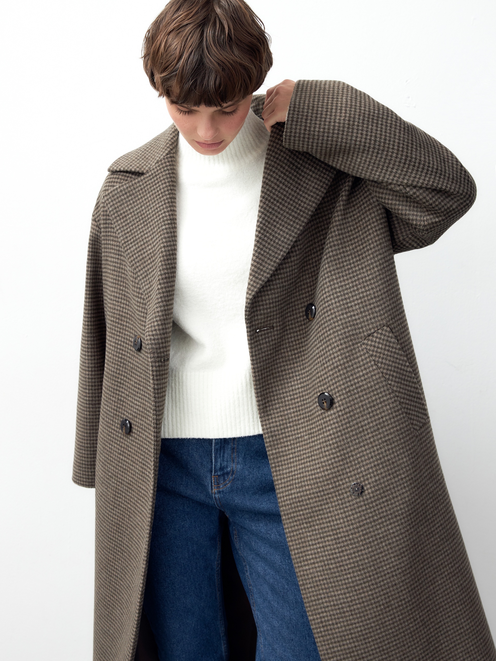 Объемное пальто силуэта "удлиненный кокон" из мягкой шерстяной ворсовой ткани в древесном оттенке с принтом пье-де-пуль. Пальто имеет универсальную длину ниже колена, классический английский воротник и надежную застежку на два ряда стильных матовых пуговиц. Рукав пальто рубашечный, что выглядит очень мягко и женственно, а также позволяет надевать нижним слоем даже объемные вещи, не стесняя движений. По бокам изделия расположены вместительные карманы с листочками. Благодаря мягкой шерстяной ткани пальто не только очень комфортное и уютное, но и невероятно теплое. А для наилучшей защиты от непогоды пальто произведено с использованием высокотехнологичной мембраны RaftPro и современного легкого утеплителя. Произведено в Санкт-Петербурге.