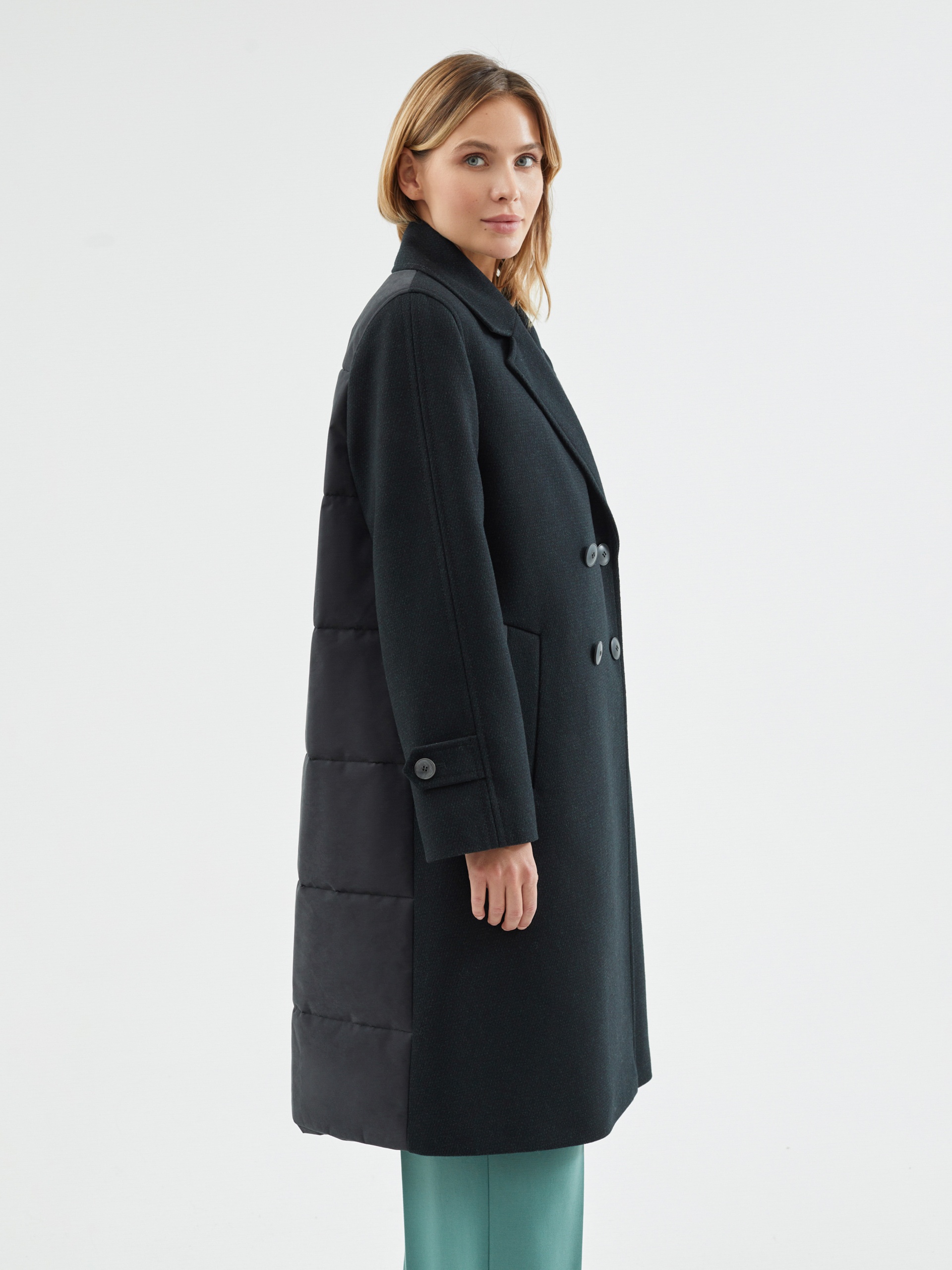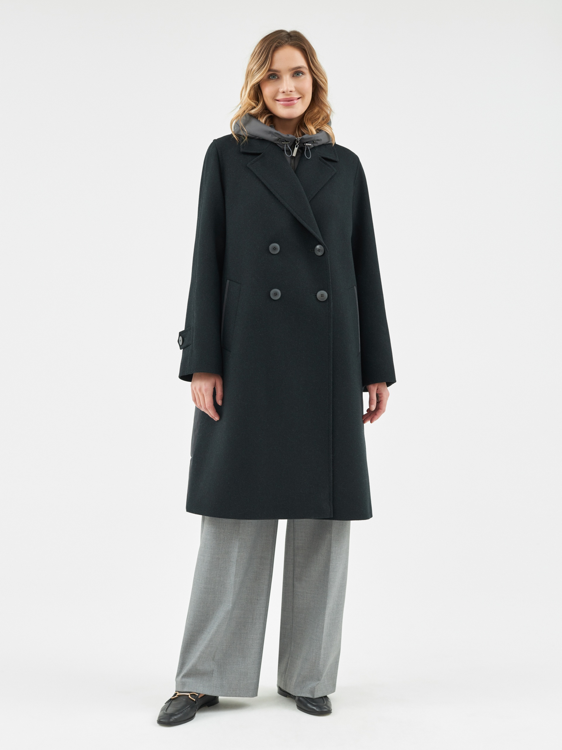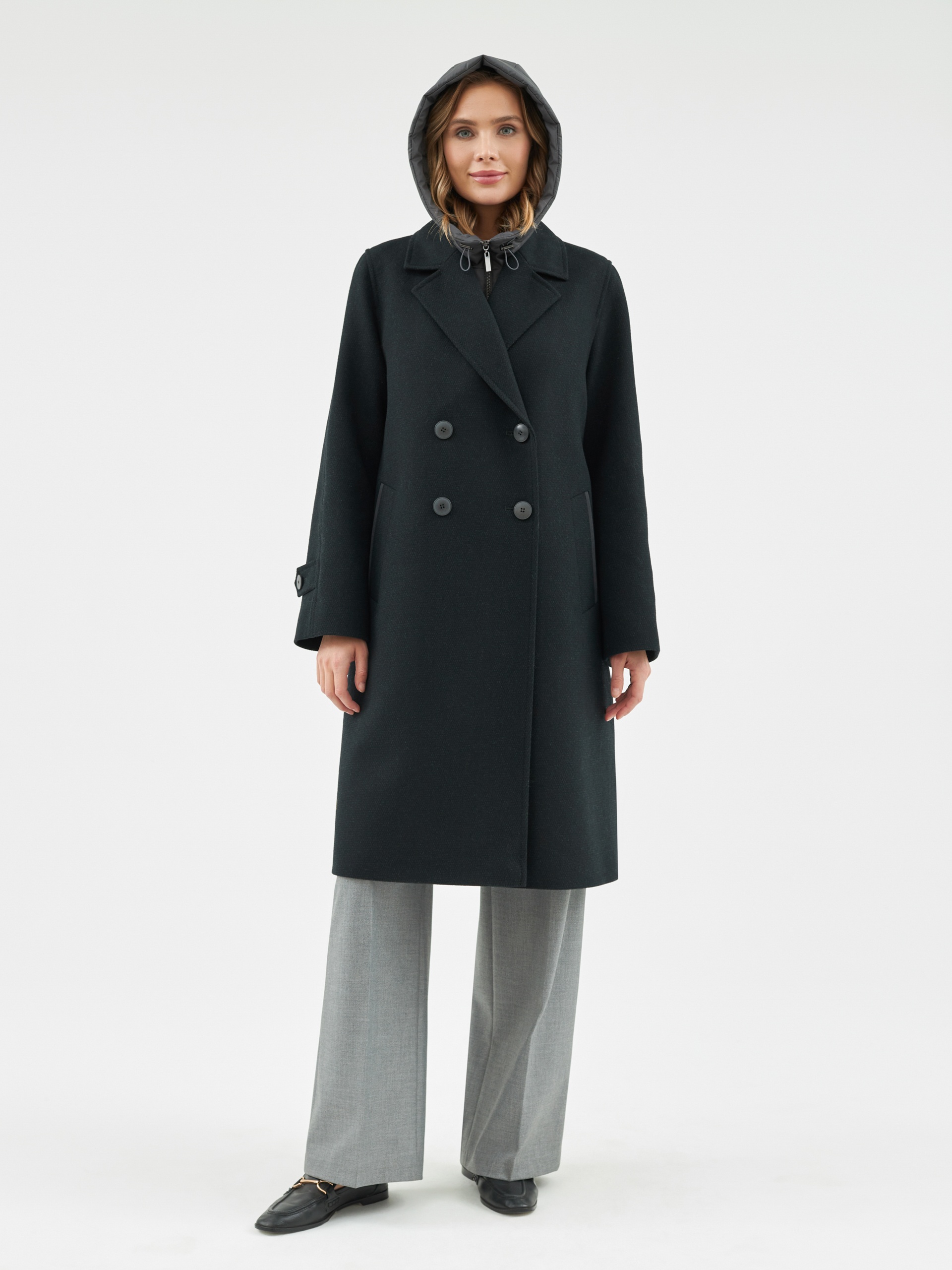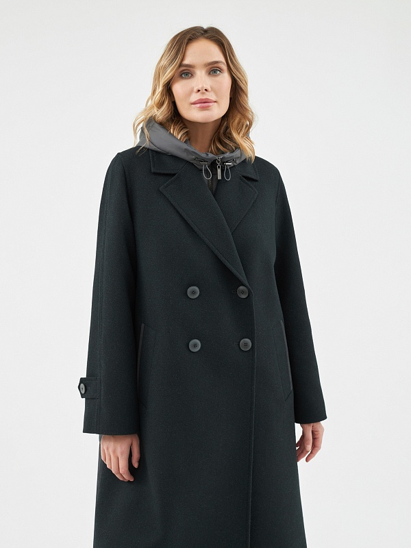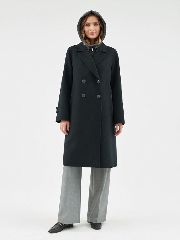 Двубортное пальто силуэта легкая трапеция из шерстяной пальтовой ткани в черно-изумрудном цвете с эффектом диагональ. Модель имеет уникальную деталь: спинка пальто выполнена из объемной стеганой плащевой ткани с мягким водонепроницаемым покрытием с матовым эффектом темного графитового цвета, что делает пальто не только невероятно стильным, но и очень теплым. Втачной рукав помогает создать более гармоничный образ. Длина пальто ниже колена. По бокам пальто располагаются глубокие и вместительные карманы с широкими листочками. Нижний воротник, а также листочки карманов отделаны плащевой тканью. Застегивается пальто на два ряда стильных крупных пуговиц. Образ дополняет съемный капюшон из отделочной плащевой ткани, который надежно укроет от дождя. Для наилучшей защиты от холода и ветра пальто выполнено с использованием высокотехнологичной мембраны RaftPro и легкого современного утеплителя. Произведено в Санкт-Петербурге.