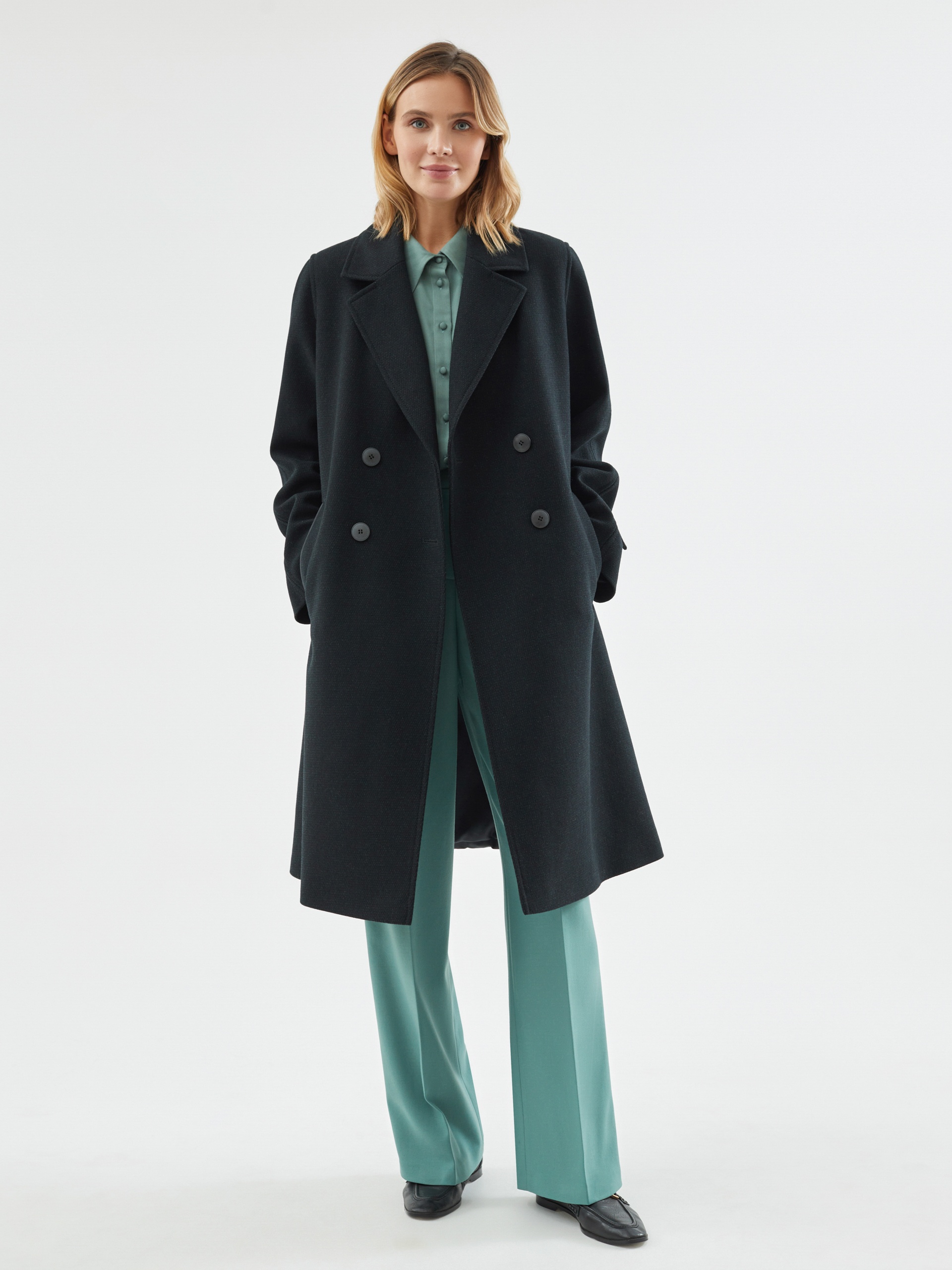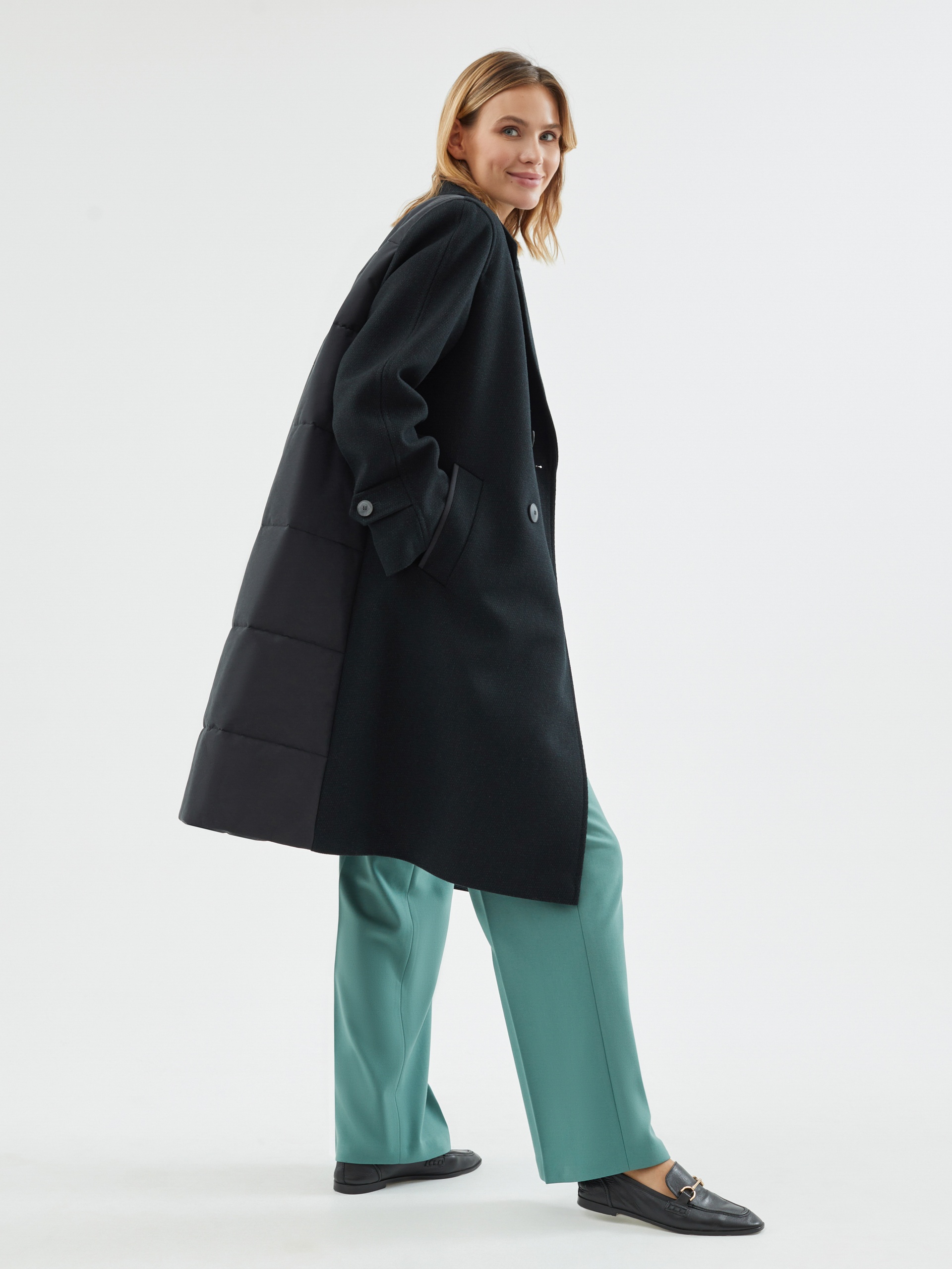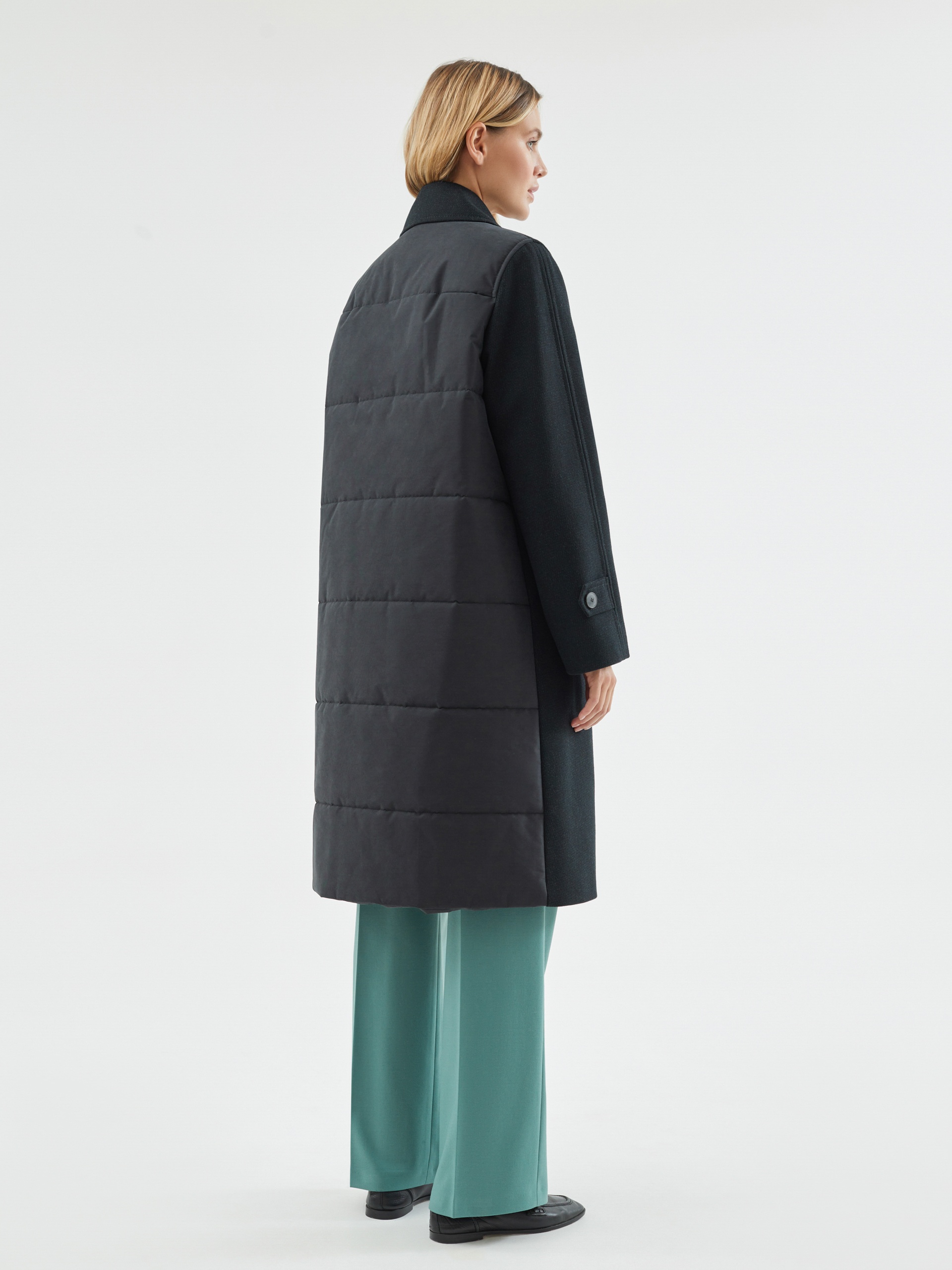 Двубортное пальто силуэта легкая трапеция из шерстяной пальтовой ткани в черно-изумрудном цвете с эффектом диагональ. Модель имеет уникальную деталь: спинка пальто выполнена из объемной стеганой плащевой ткани с мягким водонепроницаемым покрытием с матовым эффектом темного графитового цвета, что делает пальто не только невероятно стильным, но и очень теплым. Втачной рукав помогает создать более гармоничный образ. Длина пальто ниже колена. По бокам пальто располагаются глубокие и вместительные карманы с широкими листочками. Нижний воротник, а также листочки карманов отделаны плащевой тканью. Застегивается пальто на два ряда стильных крупных пуговиц. Образ дополняет съемный капюшон из отделочной плащевой ткани, который надежно укроет от дождя. Для наилучшей защиты от холода и ветра пальто выполнено с использованием высокотехнологичной мембраны RaftPro и легкого современного утеплителя. Произведено в Санкт-Петербурге.