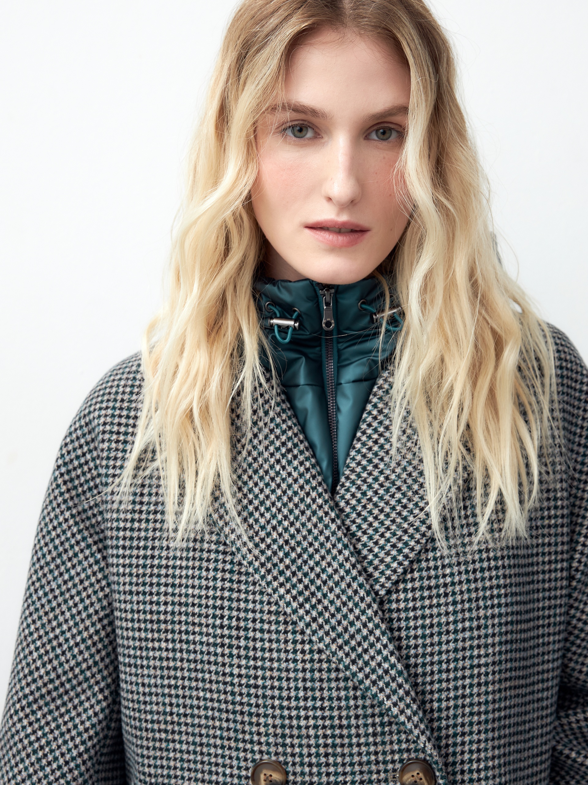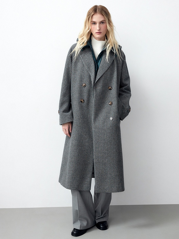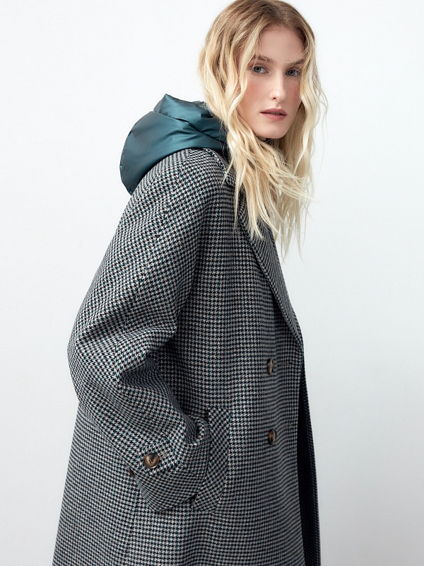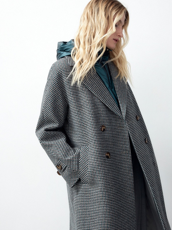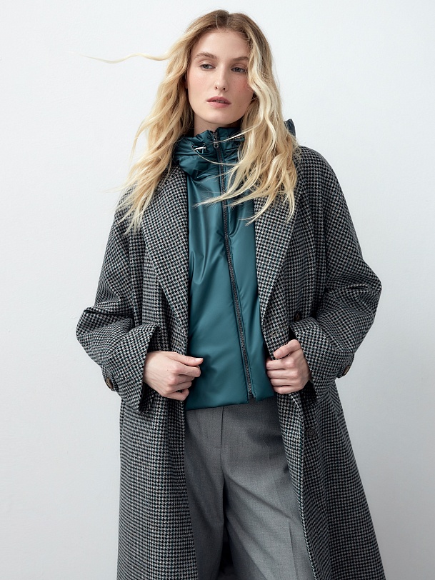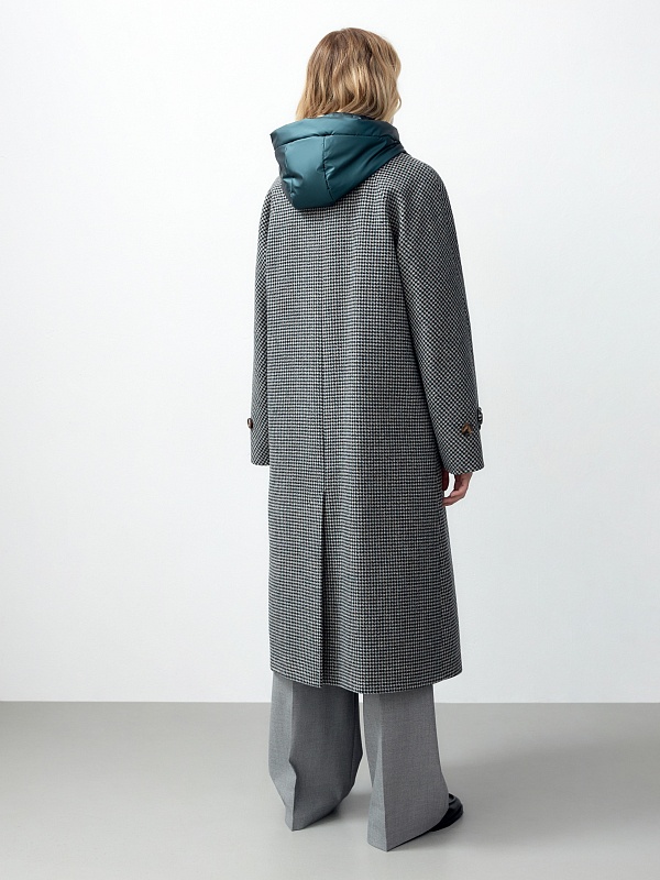 Объемное пальто прямого силуэта из шерстяной ткани в черно-изумрудном оттенке с принтом пье-де-пуль. Классический английский воротник приобретает новую современную форму и стремится к застежке пальто, что зрительно вытягивает силуэт. Пальто имеет мягкую линию рукава-кимоно, по низу которого рсположена встречная складка с фиксацией на пату для регулировки объема рукава. Длина пальто ниже колена, в среднем шве спинки располагается высокая шлица. Застегивается изделие на ряд крупных темных стильных пуговиц. В качестве нового модного декоративного и функционального элемента к пальто прилагается съемный капюшон с удлиненной манишкой в изумрудном оттенке из плащевой ткани с водонепроницаемым покрытием. Такой капюшон также можно использовать отдельно, как самостоятельное изделие. Манишка капюшона очень длиная, что может заменить полноценный жилет, а на талии располагаются застежки-фастексы, надежно фиксирующие изделие. Для наилучшей защиты от непогоды и пальто, и капюшон выполнены с использованием высокотехнологичной мембраны RaftPro и современного легкого утеплителя. Произведено в Санкт-Петербурге.