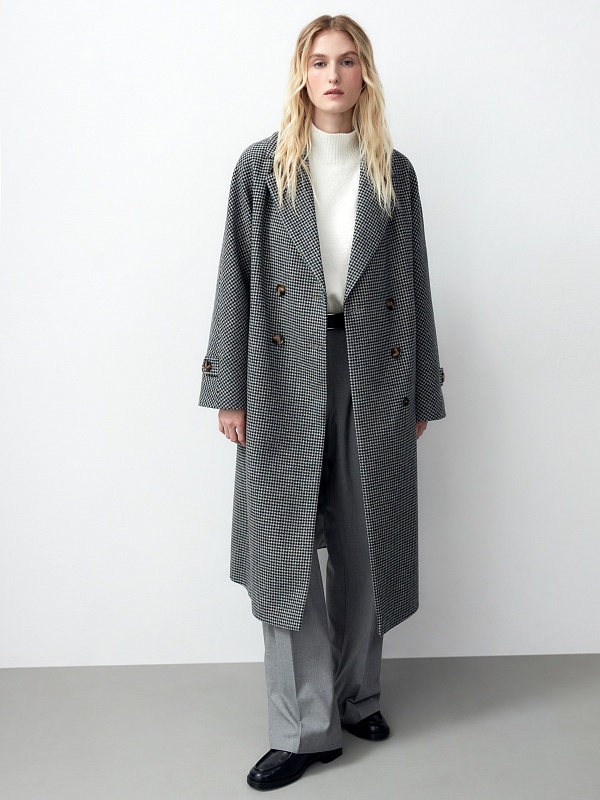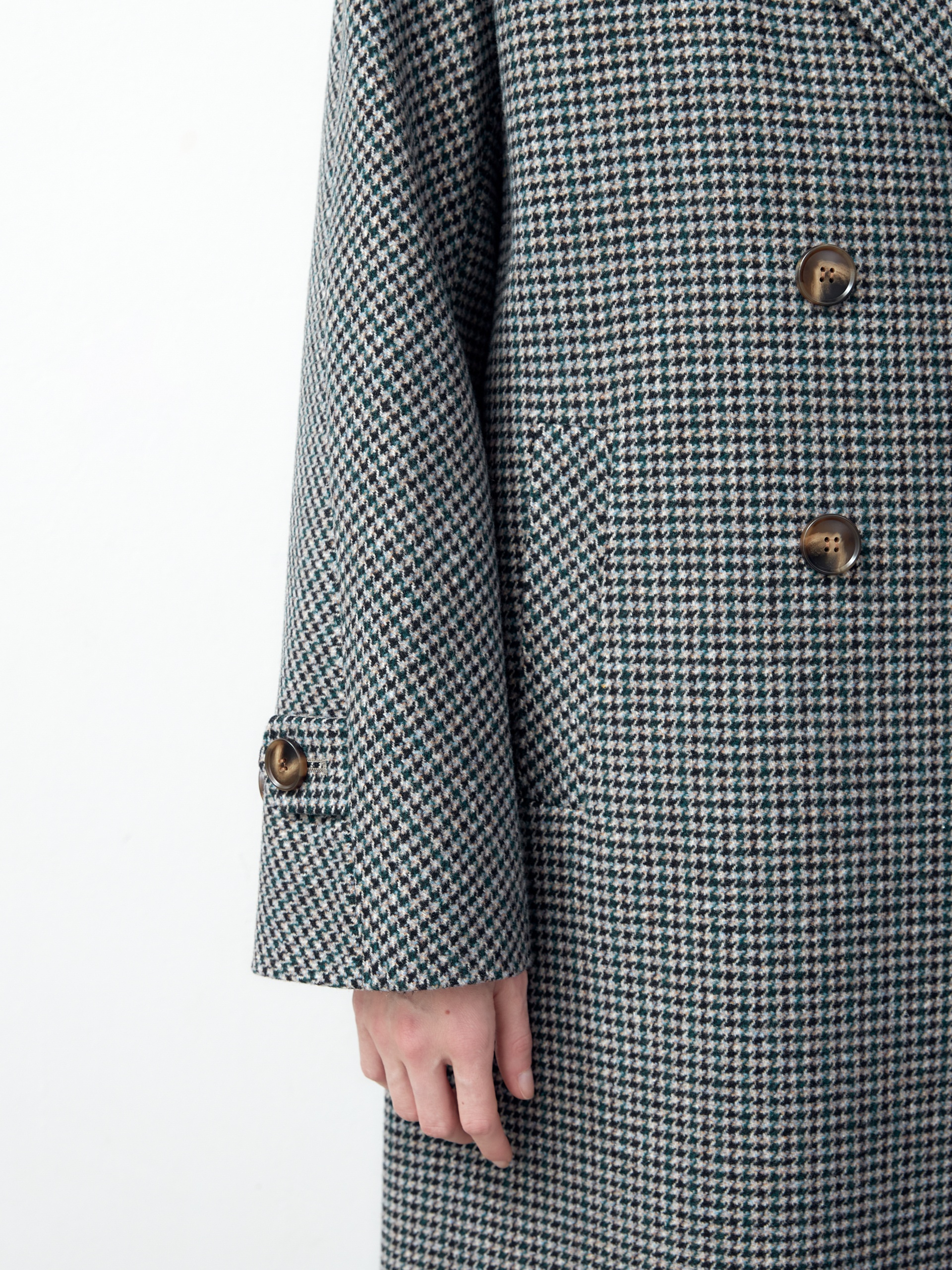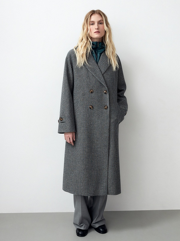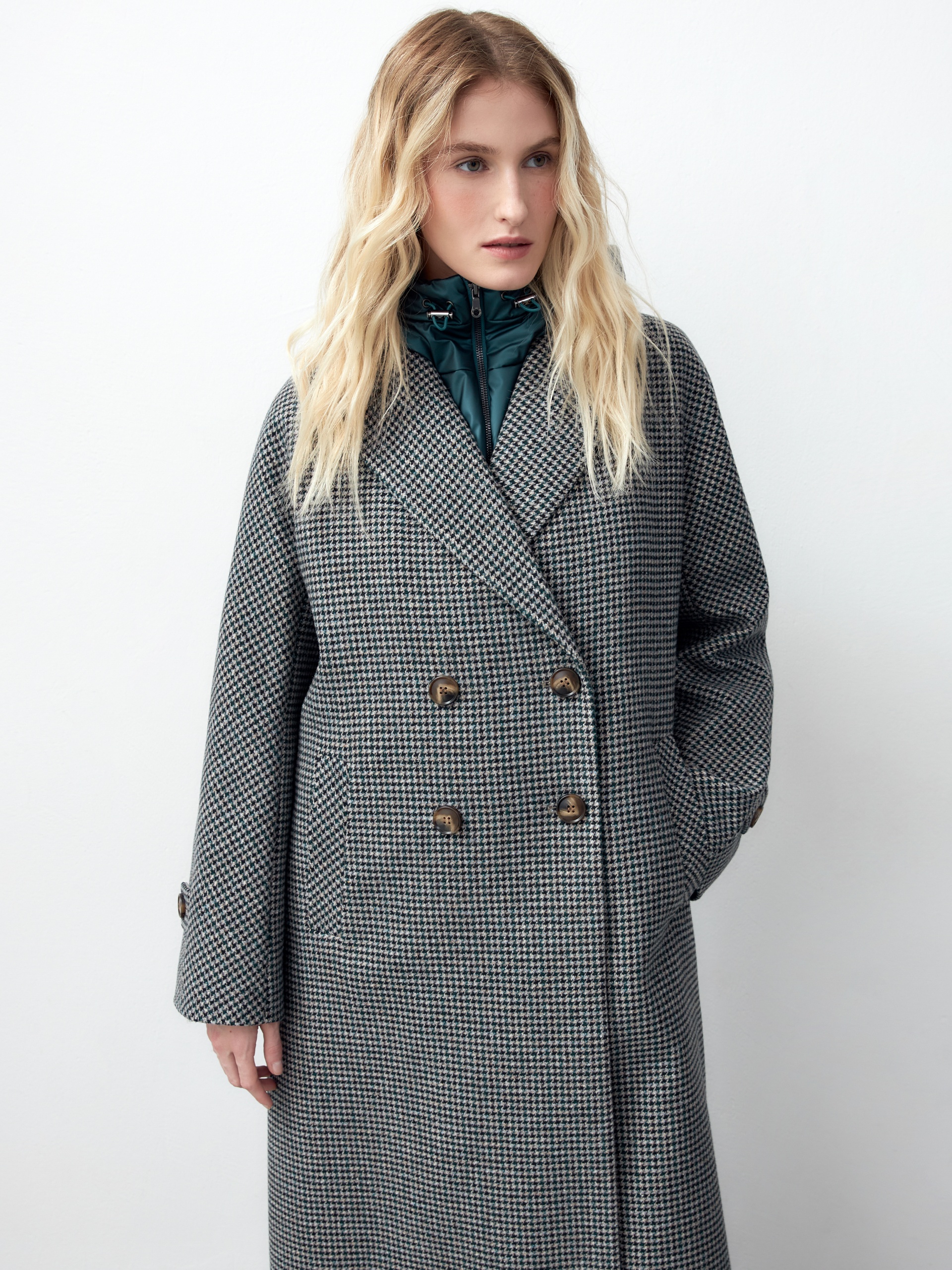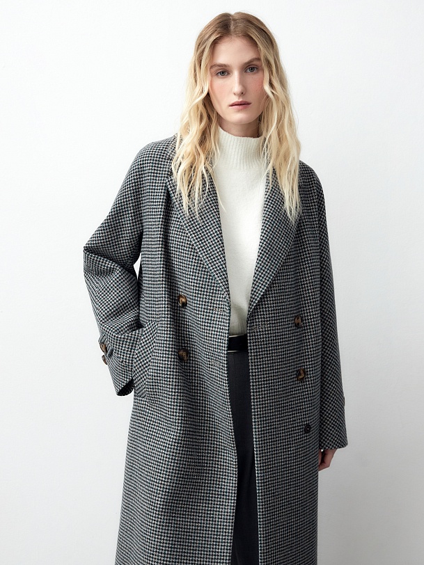 Объемное пальто прямого силуэта из шерстяной ткани в черно-изумрудном оттенке с принтом пье-де-пуль. Классический английский воротник приобретает новую современную форму и стремится к застежке пальто, что зрительно вытягивает силуэт. Пальто имеет мягкую линию рукава-кимоно, по низу которого рсположена встречная складка с фиксацией на пату для регулировки объема рукава. Длина пальто ниже колена, в среднем шве спинки располагается высокая шлица. Застегивается изделие на ряд крупных темных стильных пуговиц. В качестве нового модного декоративного и функционального элемента к пальто прилагается съемный капюшон с удлиненной манишкой в изумрудном оттенке из плащевой ткани с водонепроницаемым покрытием. Такой капюшон также можно использовать отдельно, как самостоятельное изделие. Манишка капюшона очень длиная, что может заменить полноценный жилет, а на талии располагаются застежки-фастексы, надежно фиксирующие изделие. Для наилучшей защиты от непогоды и пальто, и капюшон выполнены с использованием высокотехнологичной мембраны RaftPro и современного легкого утеплителя. Произведено в Санкт-Петербурге.
