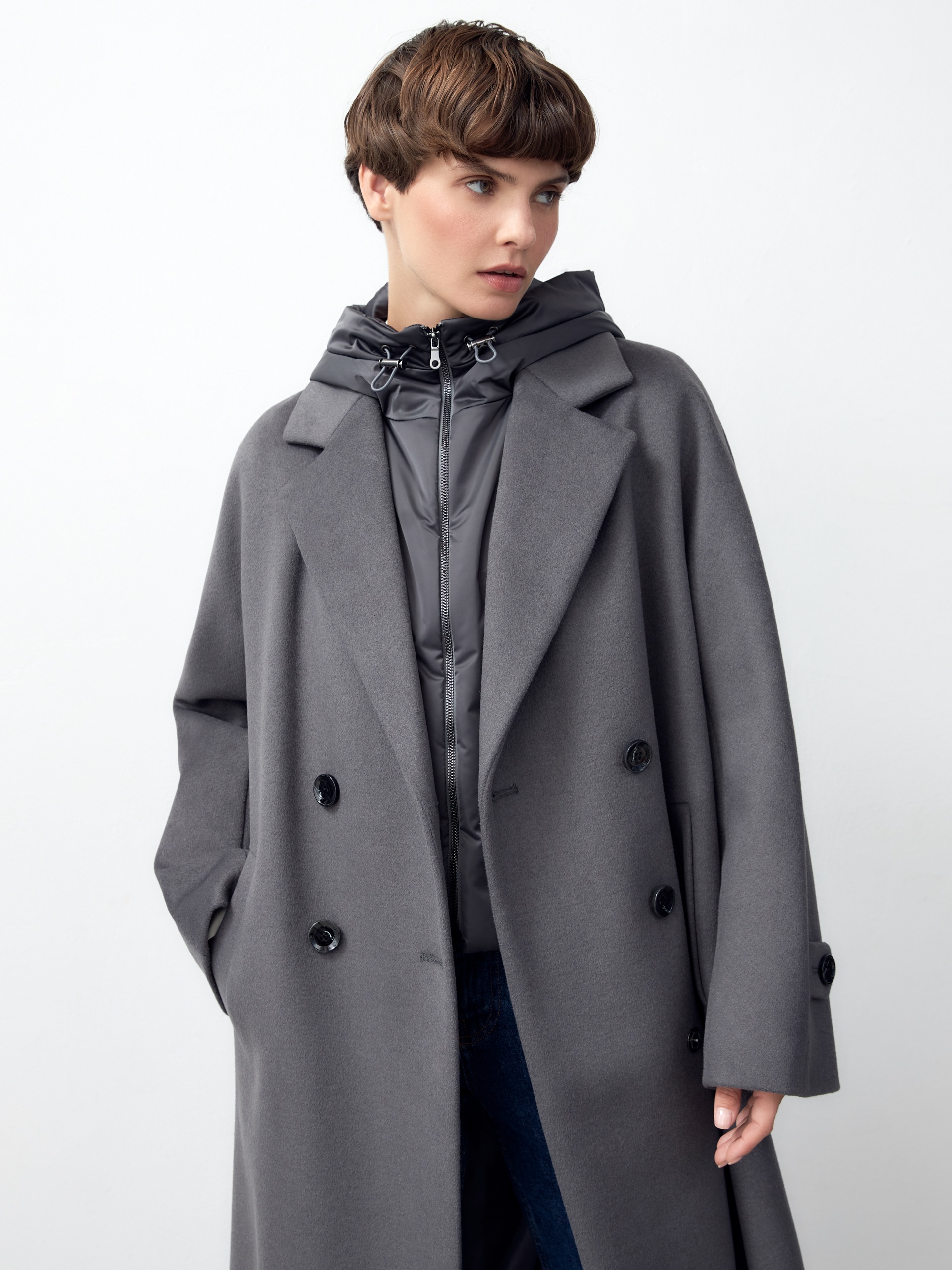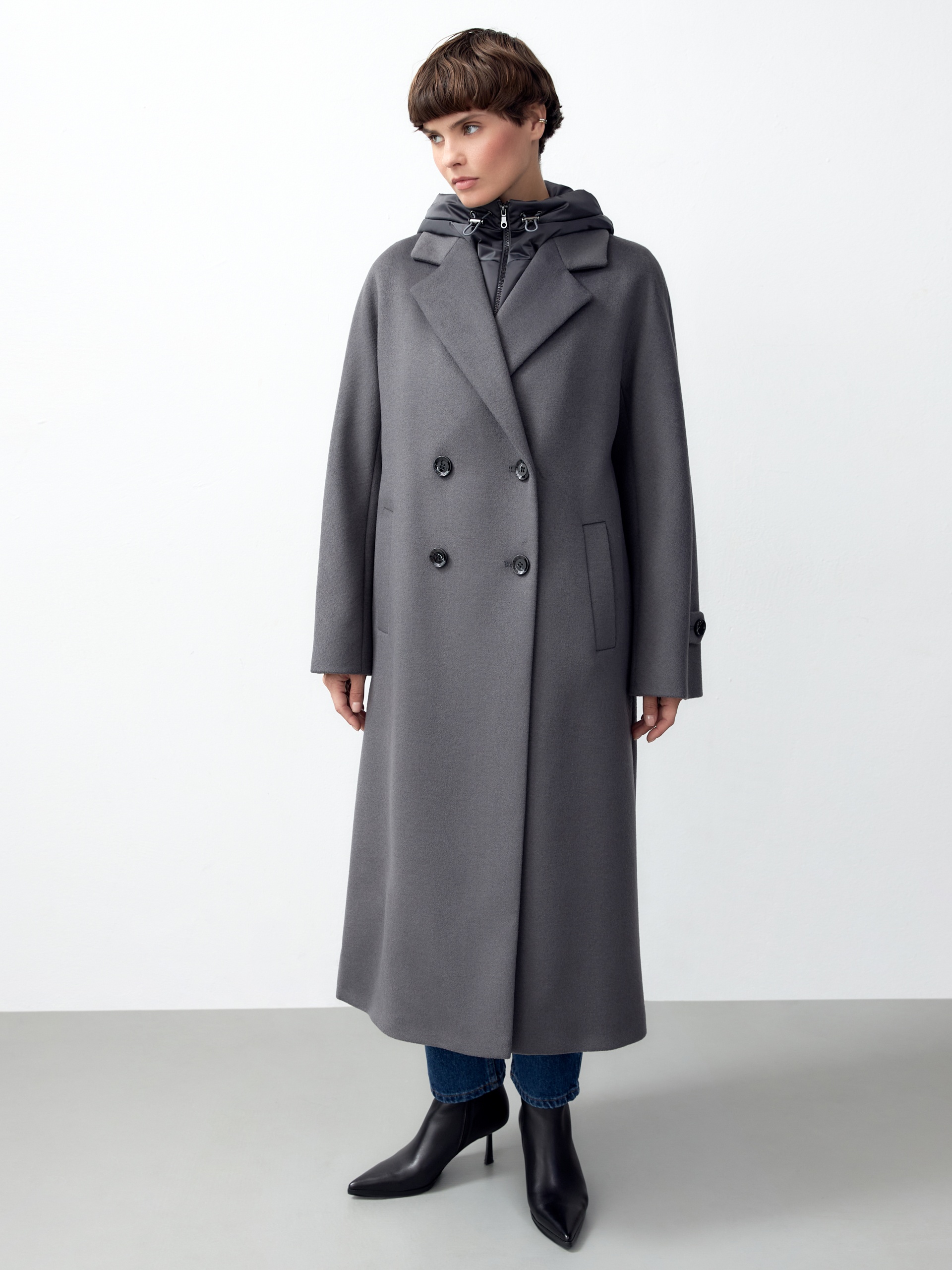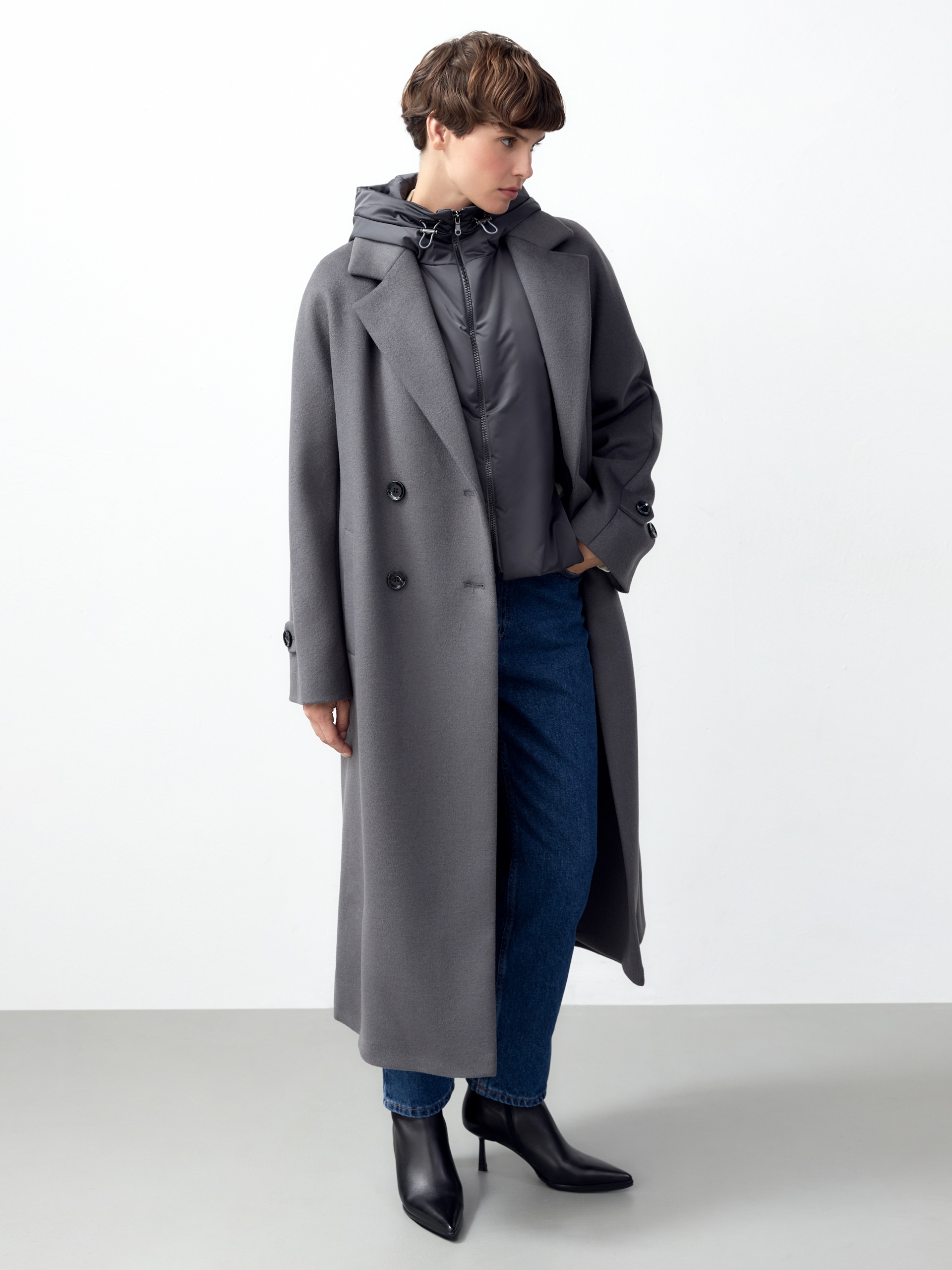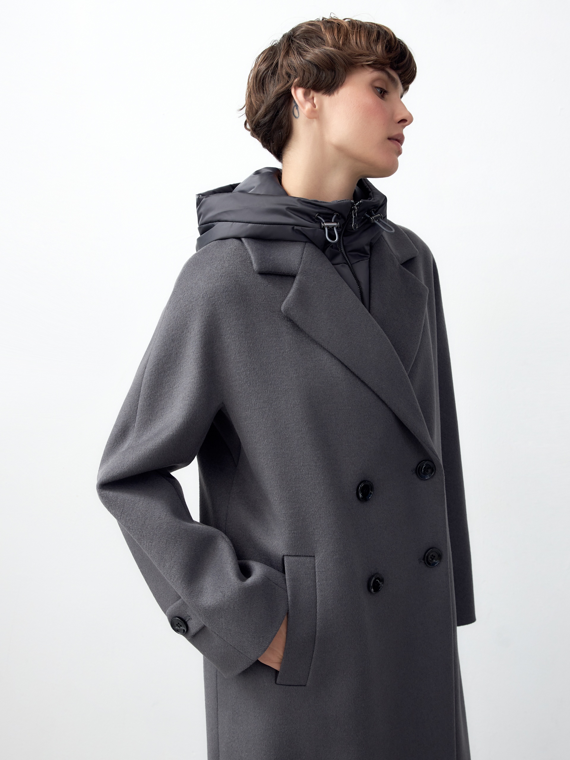 Объемное пальто прямого силуэта из шерстяной ткани в благородном сером цвете. Классический английский воротник приобретает новую современную форму и стремится к застежке пальто, что зрительно вытягивает силуэт. Пальто имеет мягкую линию рукава-кимоно, по низу которого рсположена встречная складка с фиксацией на пату для регулировки объема рукава. Длина пальто ниже колена, в среднем шве спинки располагается высокая шлица. Застегивается изделие на ряд крупных темных стильных пуговиц. В качестве нового модного декоративного и функционального элемента к пальто прилагается съемный капюшон с удлиненной манишкой в спокойном сером оттенке из плащевой ткани. Такой капюшон также можно использовать отдельно, как самостоятельное изделие. Манишка капюшона очень длиная, что может заменить полноценный жилет, а на талии располагаются застежки-фастексы, надежно фиксирующие изделие. Для наилучшей защиты от непогоды и пальто, и капюшон выполнены с использованием высокотехнологичной мембраны RaftPro и современного легкого утеплителя. Произведено в Санкт-Петербурге.