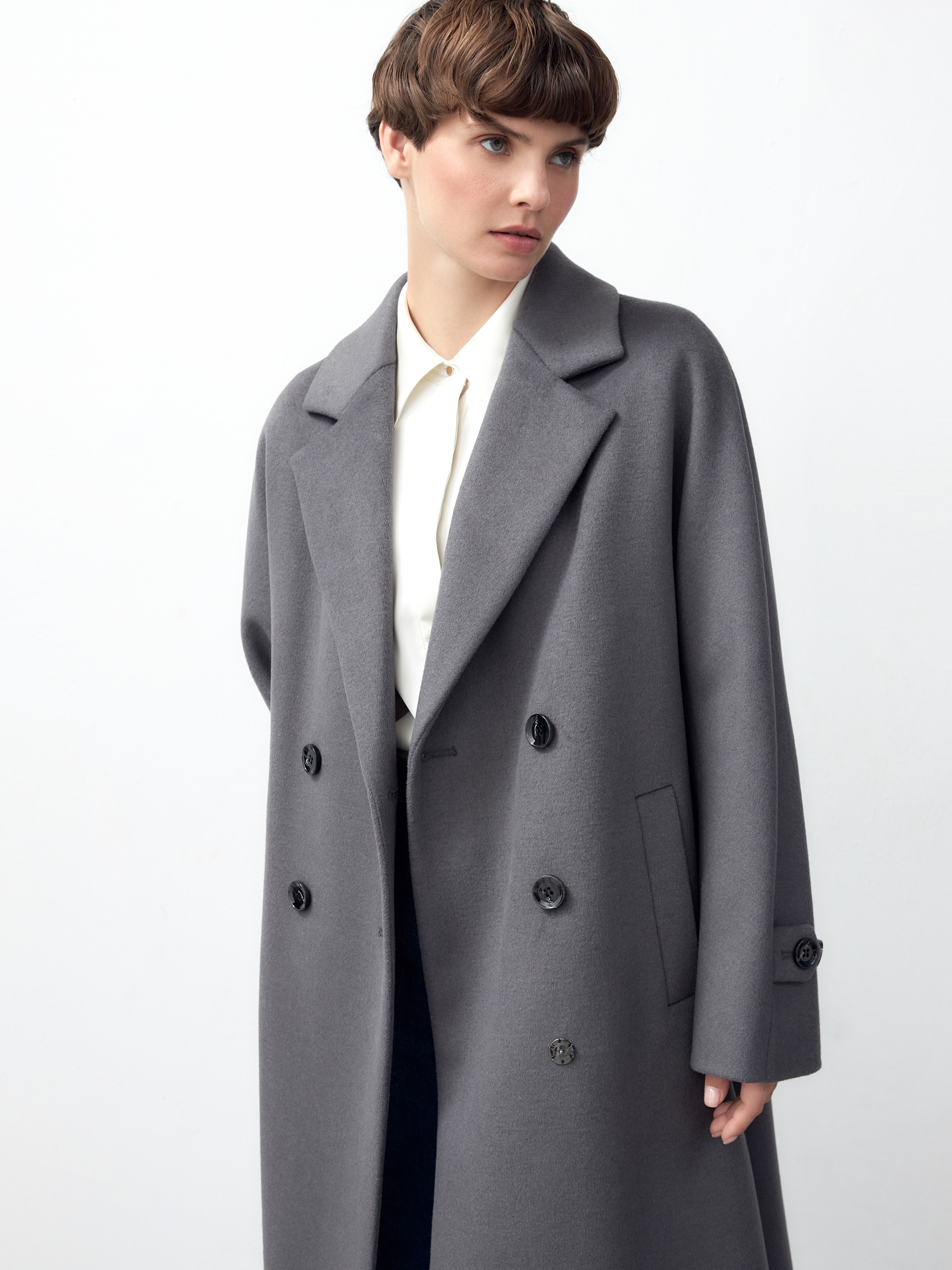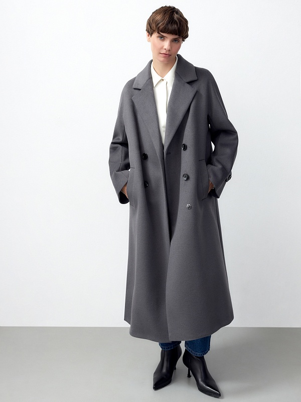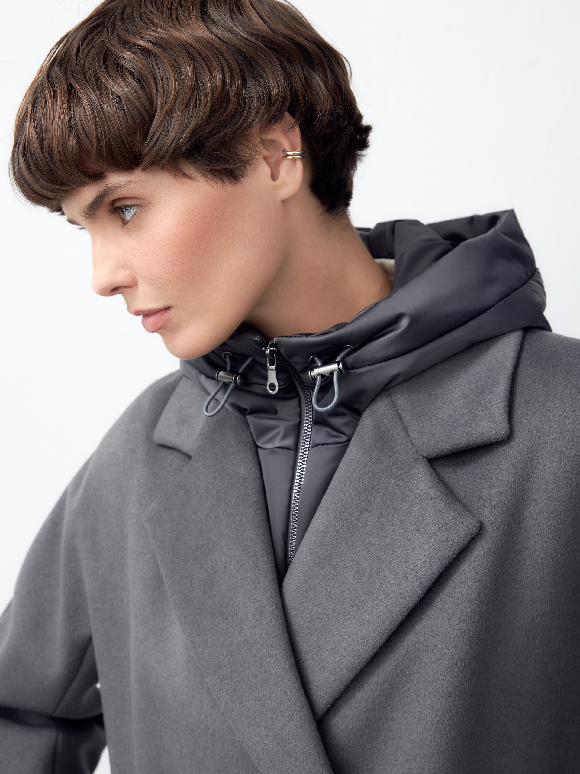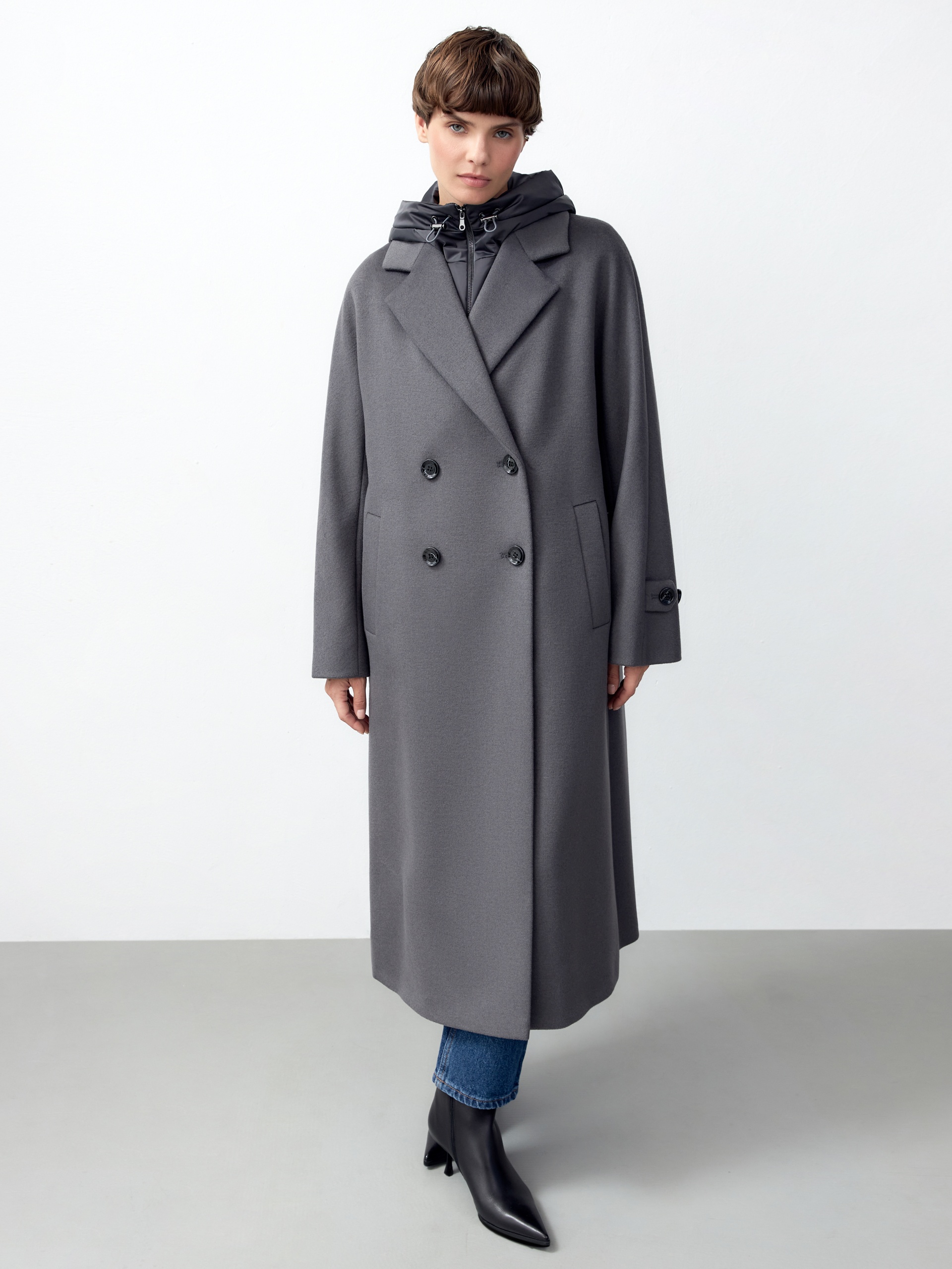 Объемное пальто прямого силуэта из шерстяной ткани в благородном сером цвете. Классический английский воротник приобретает новую современную форму и стремится к застежке пальто, что зрительно вытягивает силуэт. Пальто имеет мягкую линию рукава-кимоно, по низу которого рсположена встречная складка с фиксацией на пату для регулировки объема рукава. Длина пальто ниже колена, в среднем шве спинки располагается высокая шлица. Застегивается изделие на ряд крупных темных стильных пуговиц. В качестве нового модного декоративного и функционального элемента к пальто прилагается съемный капюшон с удлиненной манишкой в спокойном сером оттенке из плащевой ткани. Такой капюшон также можно использовать отдельно, как самостоятельное изделие. Манишка капюшона очень длиная, что может заменить полноценный жилет, а на талии располагаются застежки-фастексы, надежно фиксирующие изделие. Для наилучшей защиты от непогоды и пальто, и капюшон выполнены с использованием высокотехнологичной мембраны RaftPro и современного легкого утеплителя. Произведено в Санкт-Петербурге.