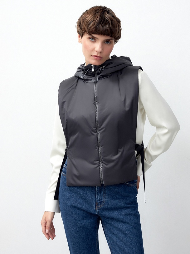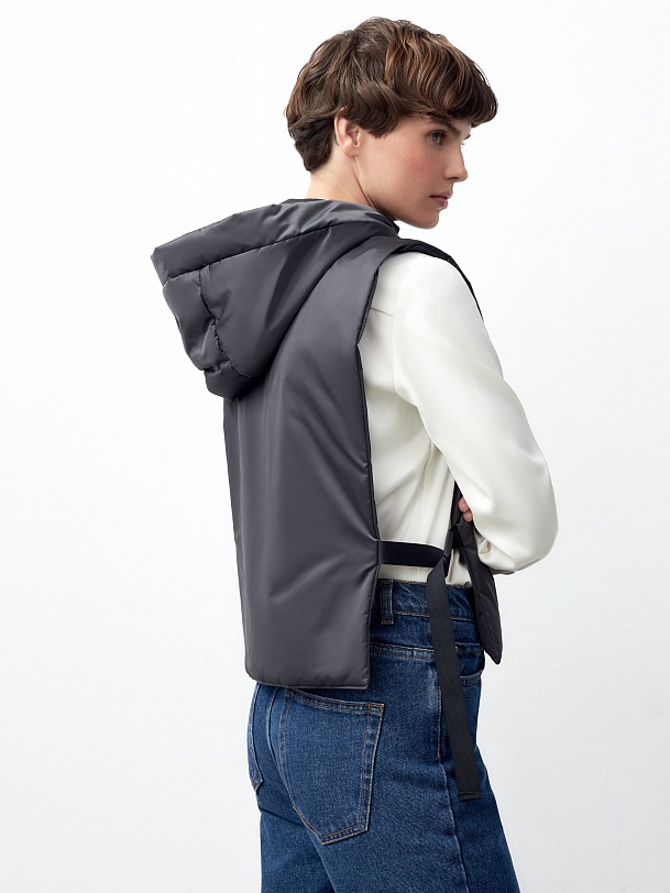 Складка и пата по низу рукава, съемный капюшон с удлиненной деталью переда и спинки