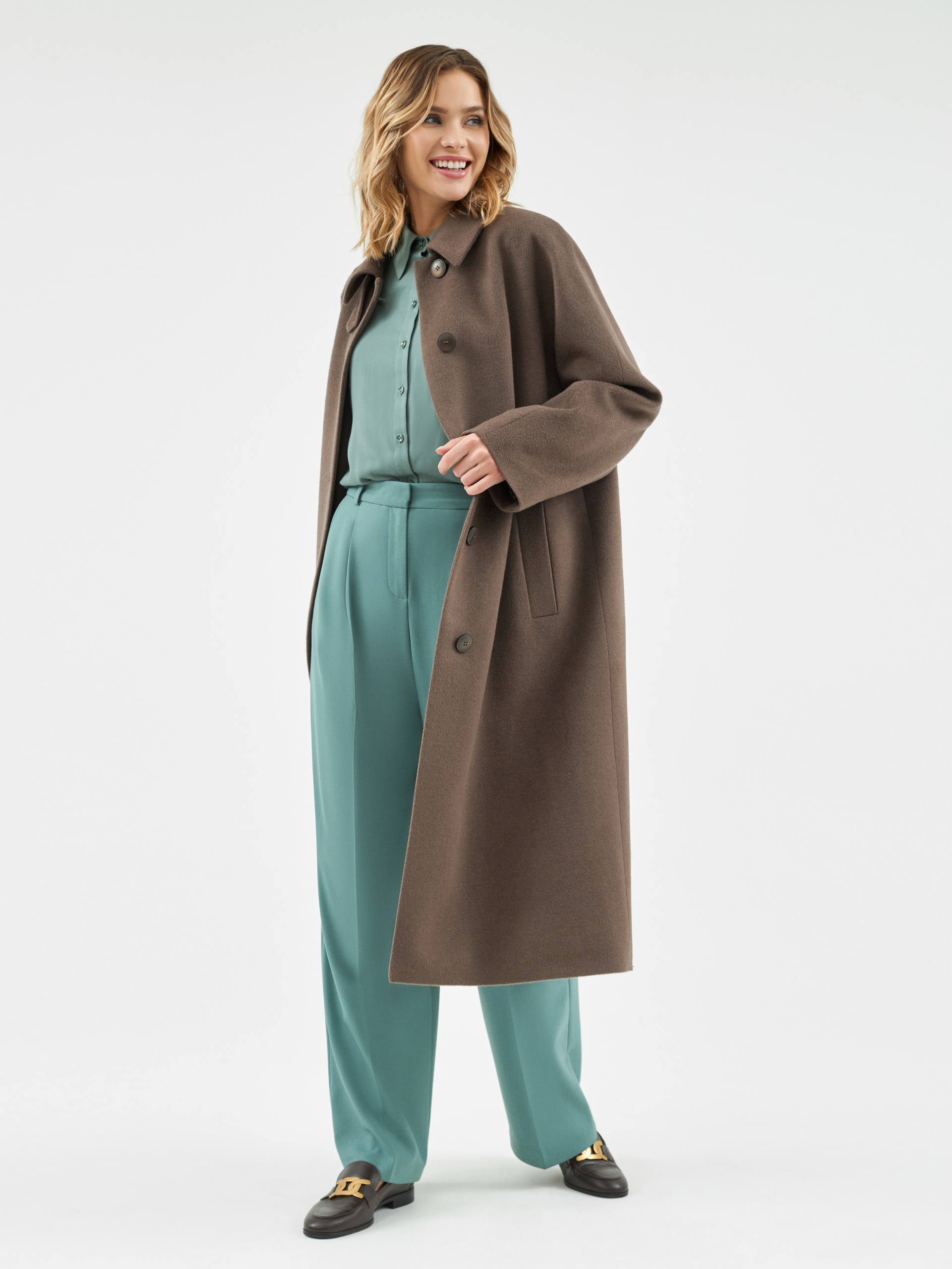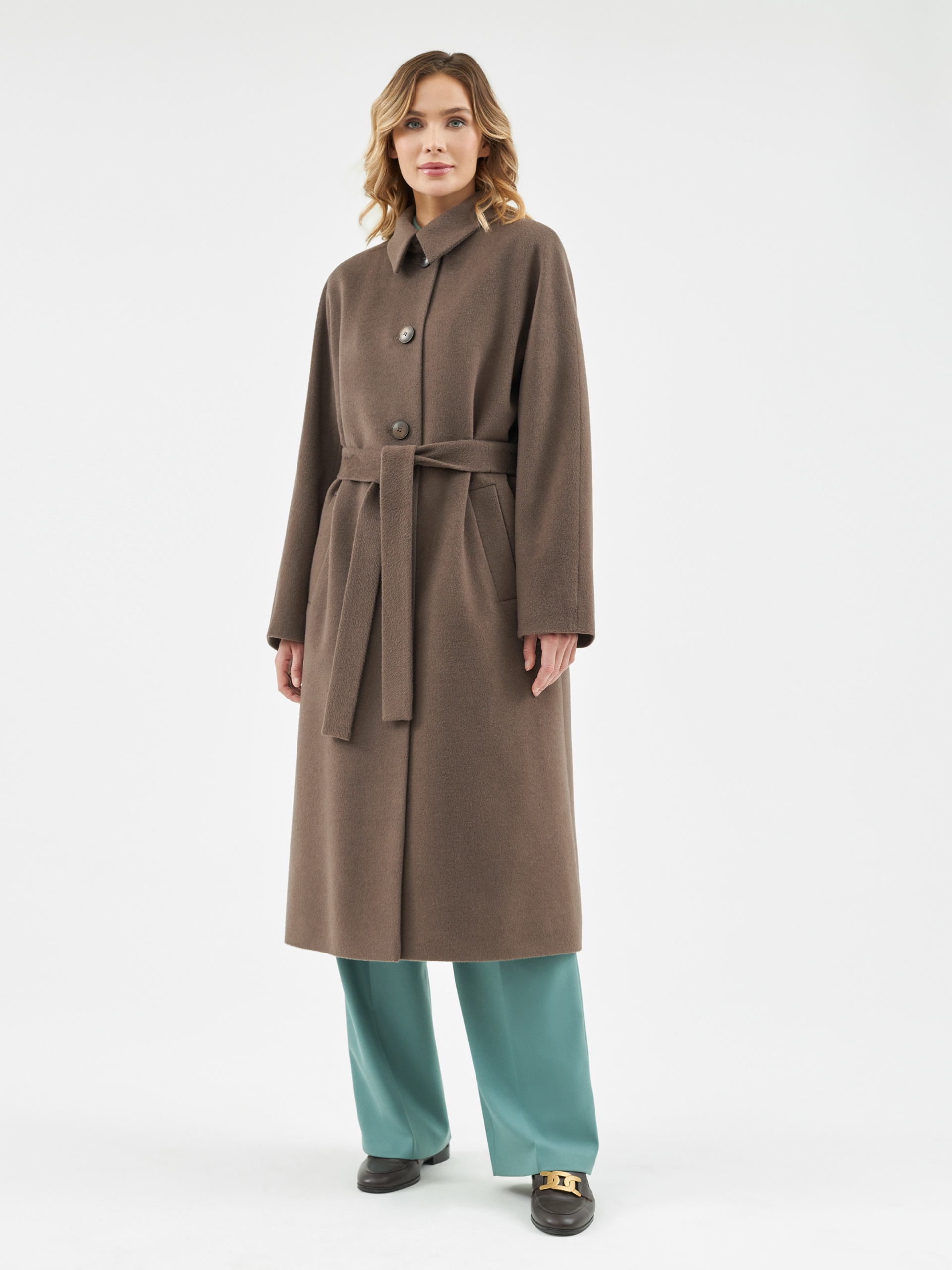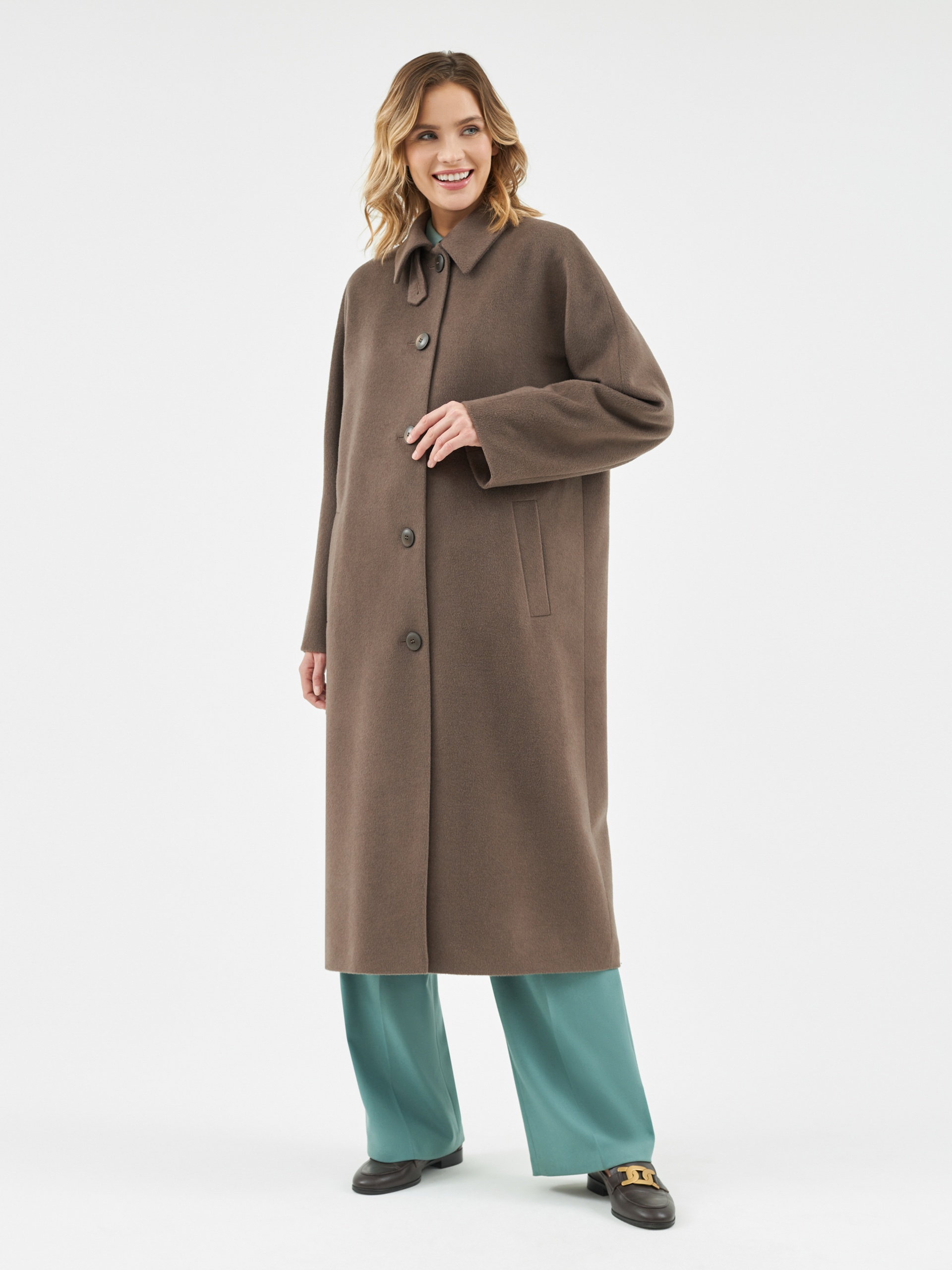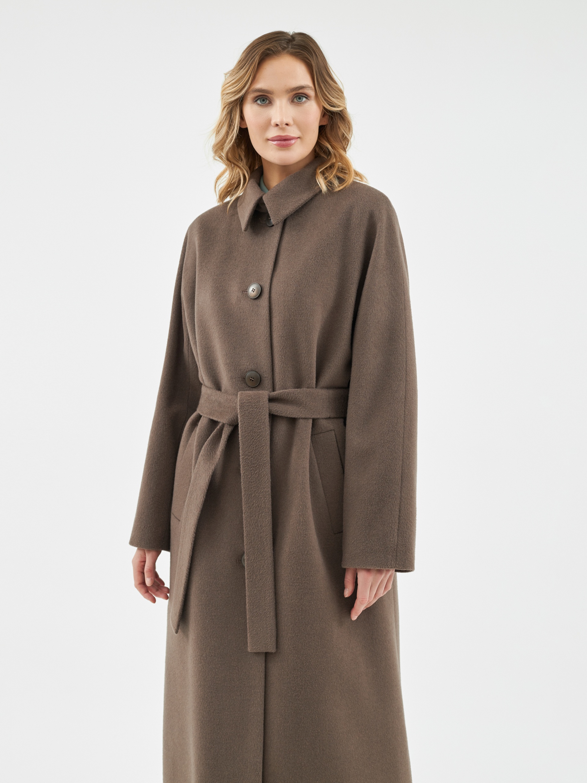 Прямое однобортное пальто из пальтовой шерстяной ткани в классическом цвете "капучино". Пальто сочетает в себе простоту форм, четкость линий и уникальное сочетание деталей. Воротник пальто стояче-отложной с новой уникальной конструкцией стойки, за счет чего воротник может быть поднят и закреплен на специальный съемный хлястик. По бокам располагаются два глубоких кармана с листочками. Спинка изделия имеет дополнительное утепление. Длина пальто ниже колена, застегивается изделие на ряд пришивных пуговиц в цвет ткани. В комплект к пальто предлагается съемный пояс из основного материала. Для наилучшей защиты от непогоды пальто произведено с использованием высокотехнологичной мембраны RaftPro и современного невесомого утеплителя. Произведено в Санкт-Петербурге.