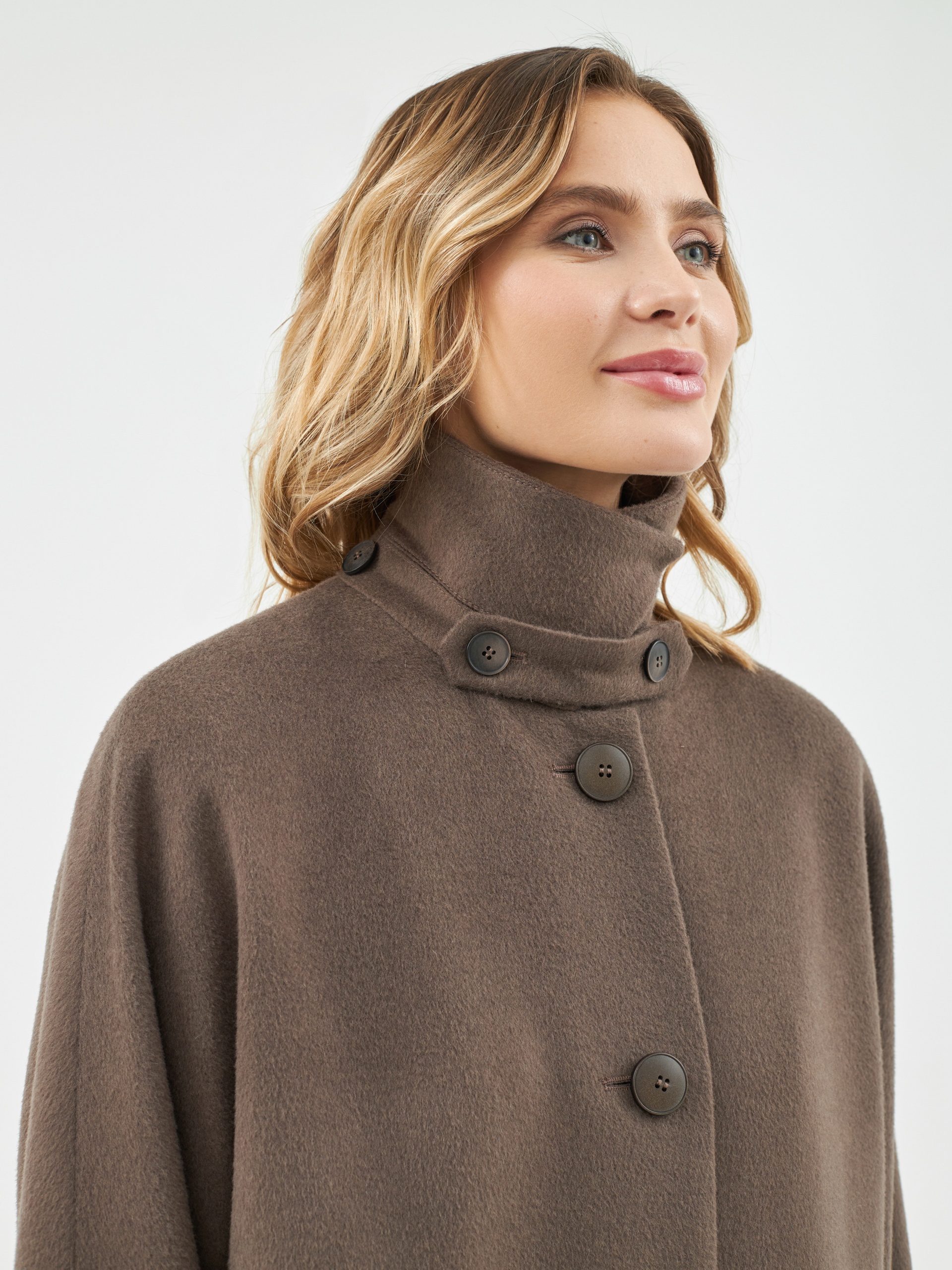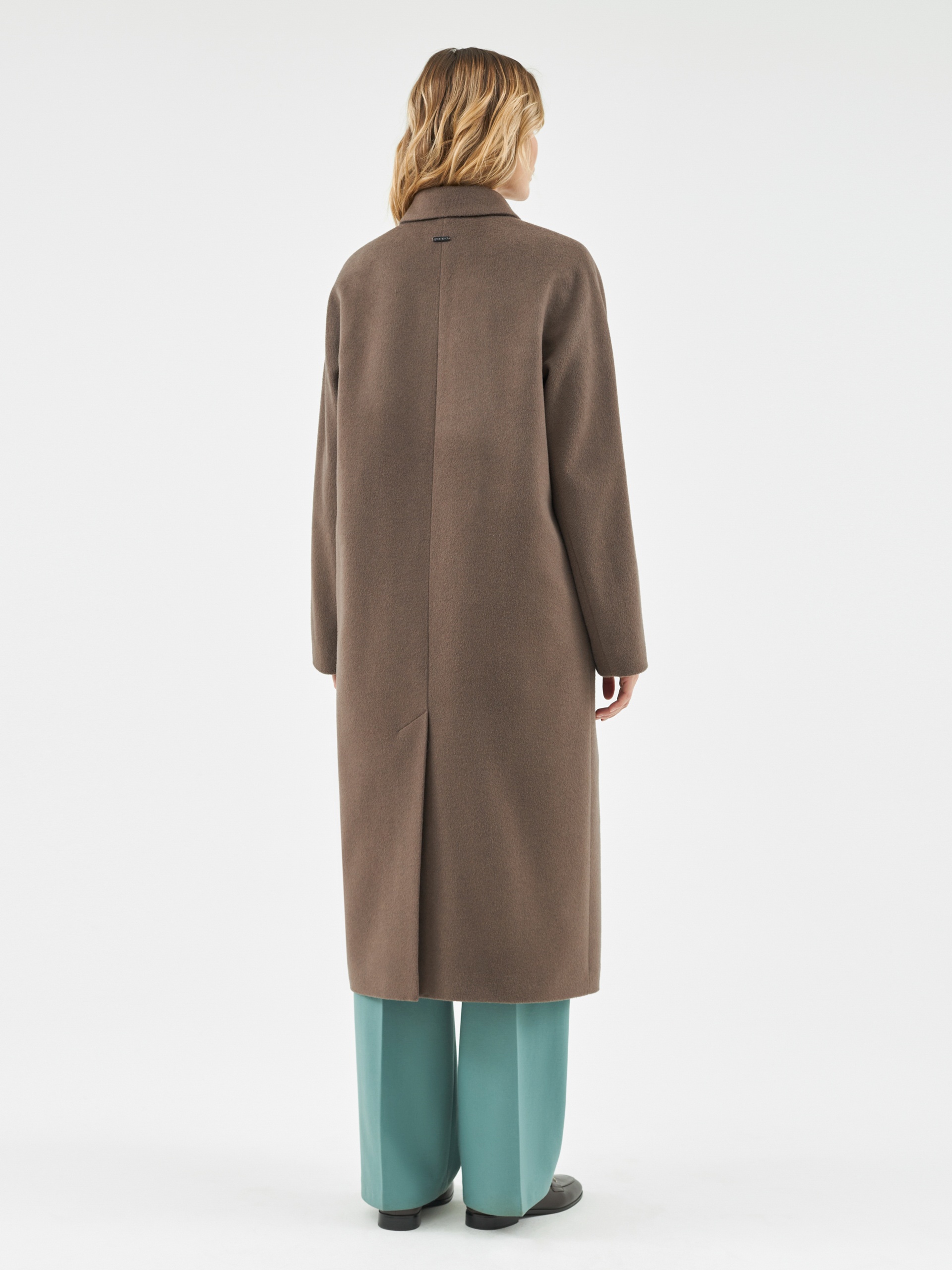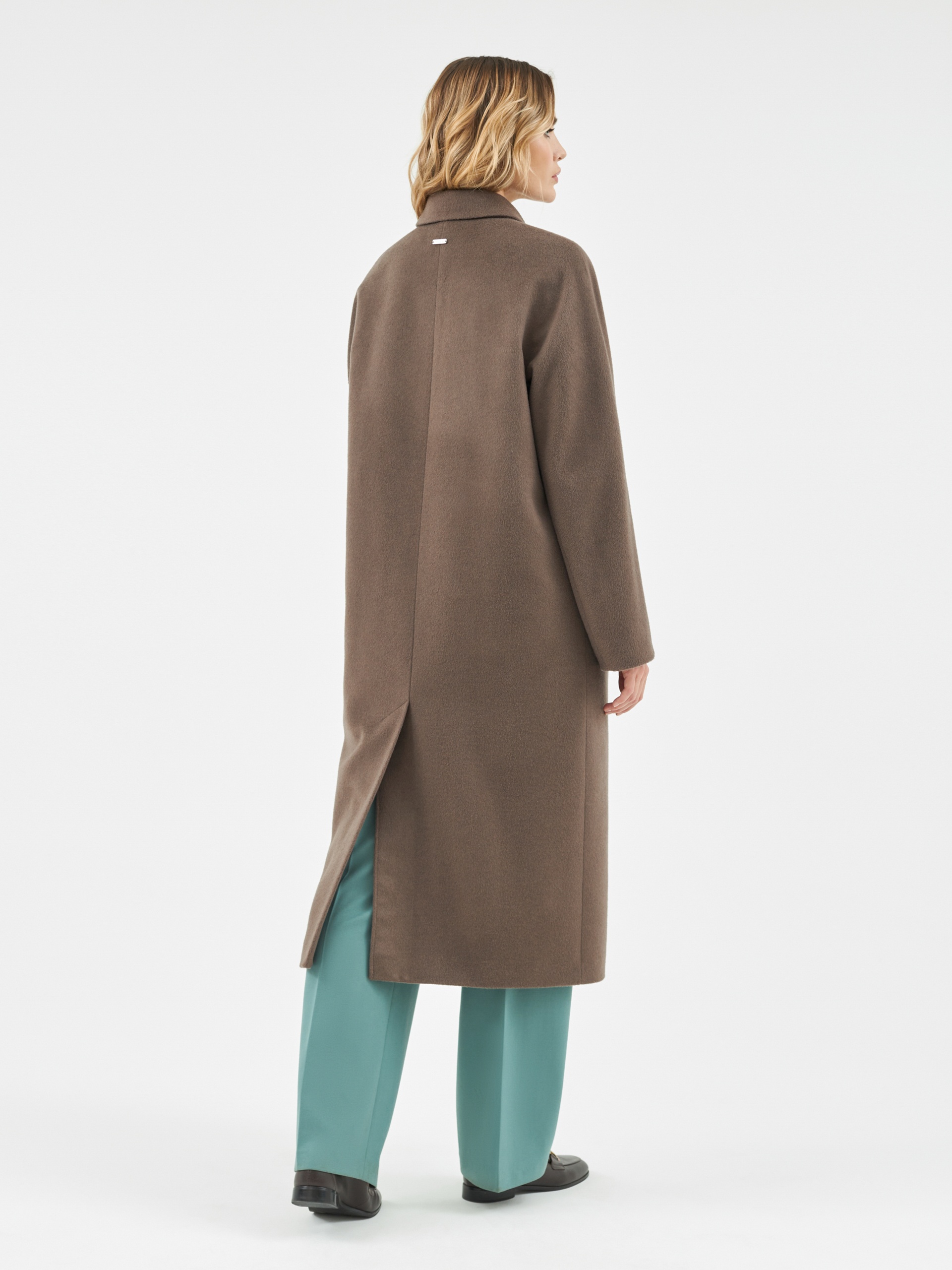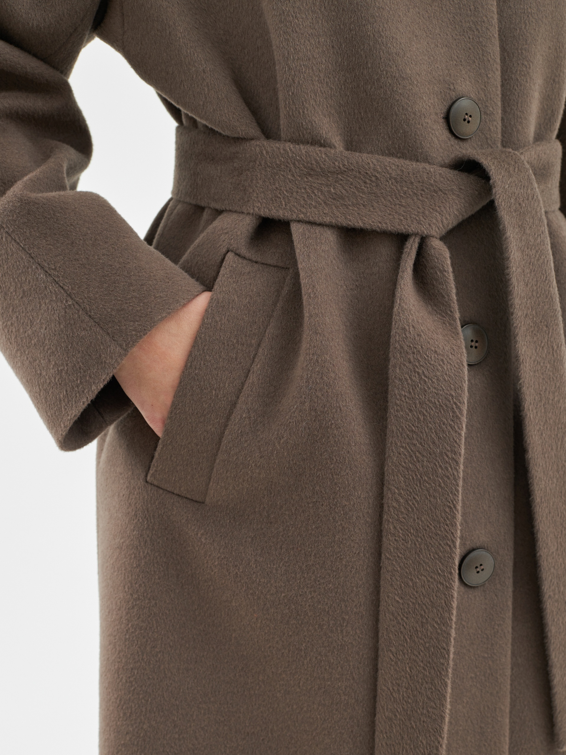 Прямое однобортное пальто из пальтовой шерстяной ткани в классическом цвете "капучино". Пальто сочетает в себе простоту форм, четкость линий и уникальное сочетание деталей. Воротник пальто стояче-отложной с новой уникальной конструкцией стойки, за счет чего воротник может быть поднят и закреплен на специальный съемный хлястик. По бокам располагаются два глубоких кармана с листочками. Спинка изделия имеет дополнительное утепление. Длина пальто ниже колена, застегивается изделие на ряд пришивных пуговиц в цвет ткани. В комплект к пальто предлагается съемный пояс из основного материала. Для наилучшей защиты от непогоды пальто произведено с использованием высокотехнологичной мембраны RaftPro и современного невесомого утеплителя. Произведено в Санкт-Петербурге.
