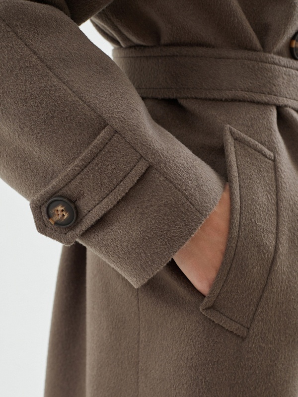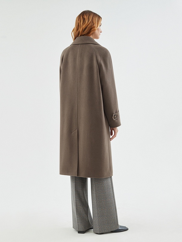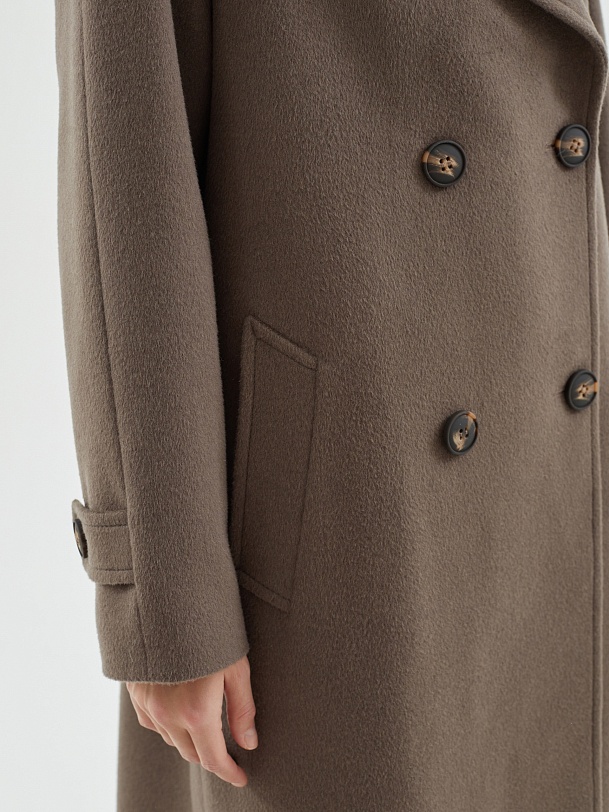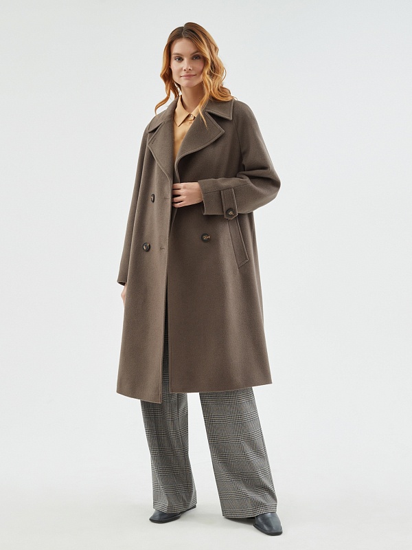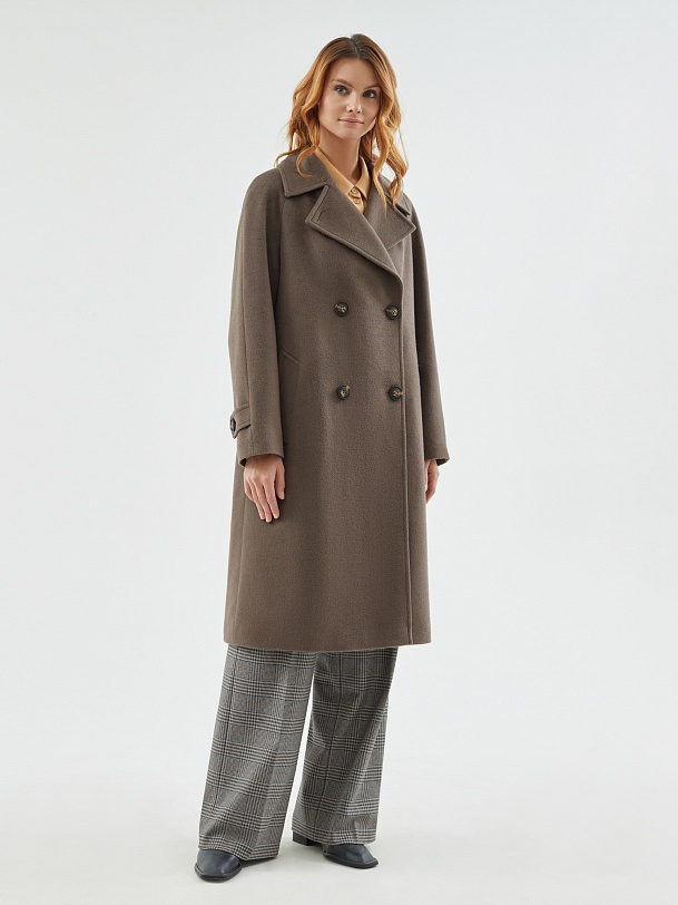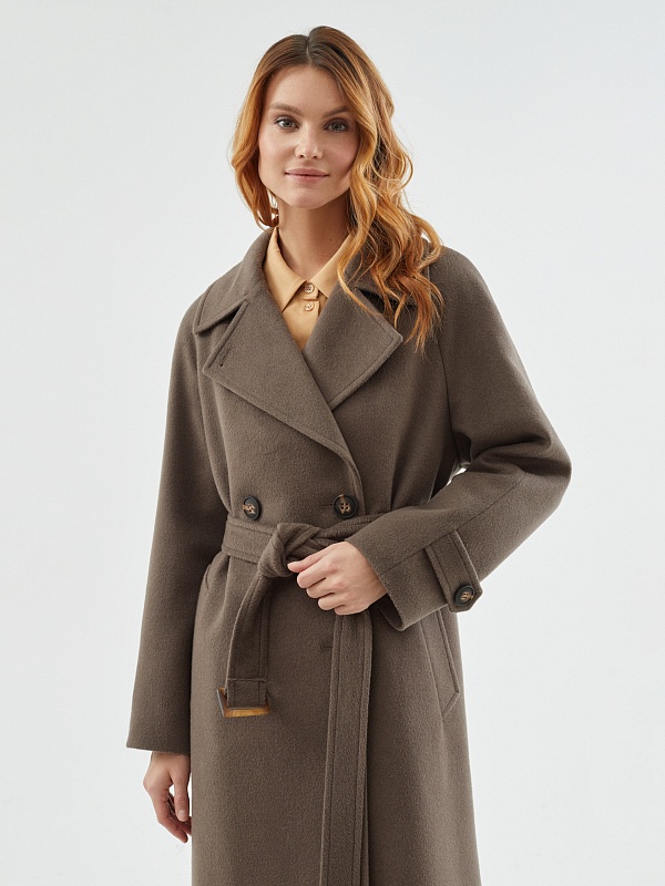 Классическое пальто прямого силуэта из мягкой ворсовой шерстяной ткани в цвете "капучино". Пальто имеет широкий английский воротник и утонченный рукав реглан. По низу рукава располагаются декоративные паты. Застегивается изделие на два ряда крупных пуговиц с велюровым покрытием, конструкция застежки позволяет полностью запахнуть лацкан воротника. Комфортная длина пальто, закрывающая колено, позволяет с легкостью создавать самые различные современные образы. По бокам находятся глубокие карманы с листочками. Спинка пальто имеет дополнительное утепление. Завершает образ съемный пояс на стильной геометричной пряжке в цвет пуговиц. А для наилучшей защиты от непогоды пальто выполнено с использованием высокотехнологичной мембраны RaftPro и современного легкого утеплителя. Произведено в Санкт-Петербурге.