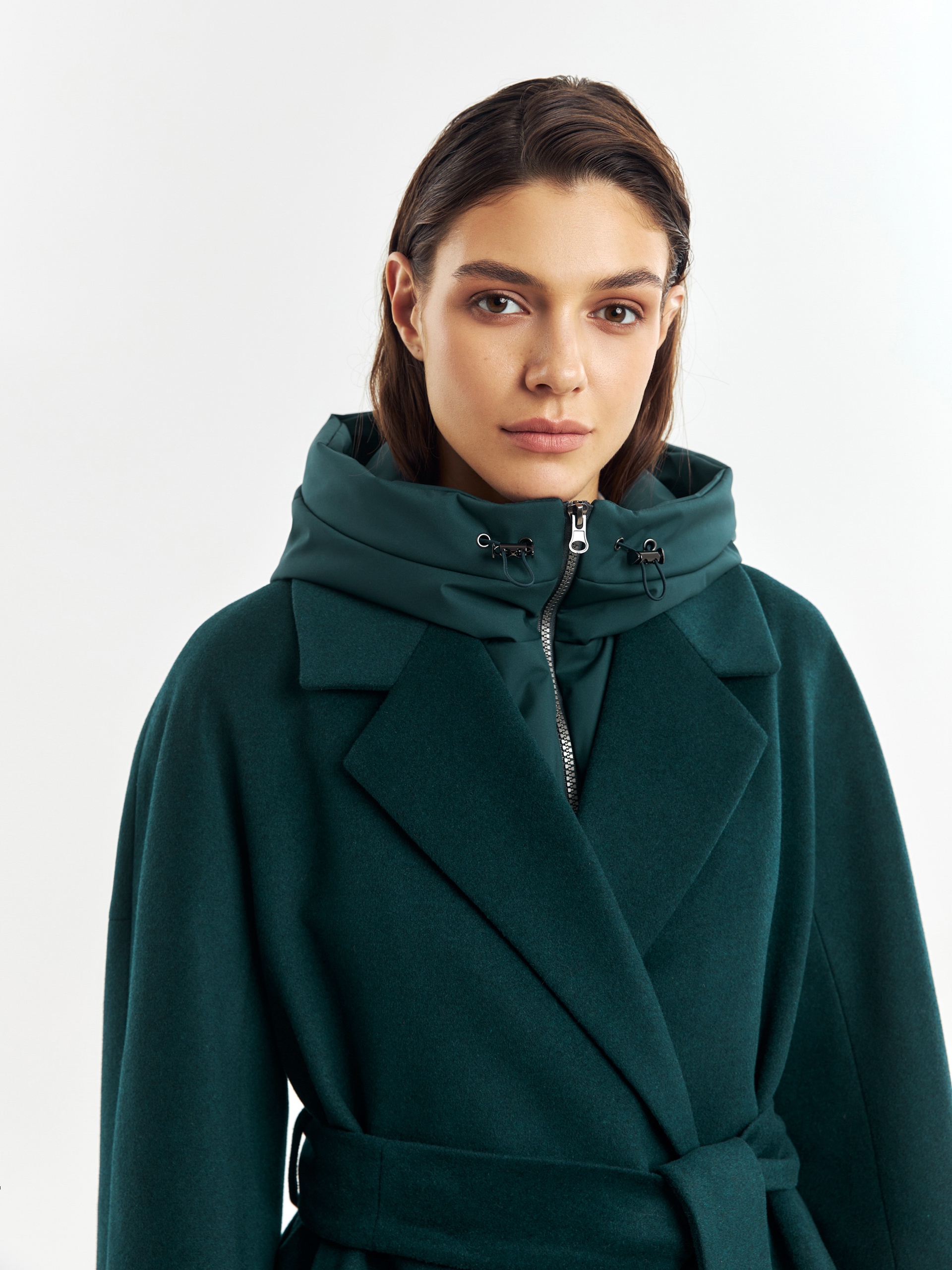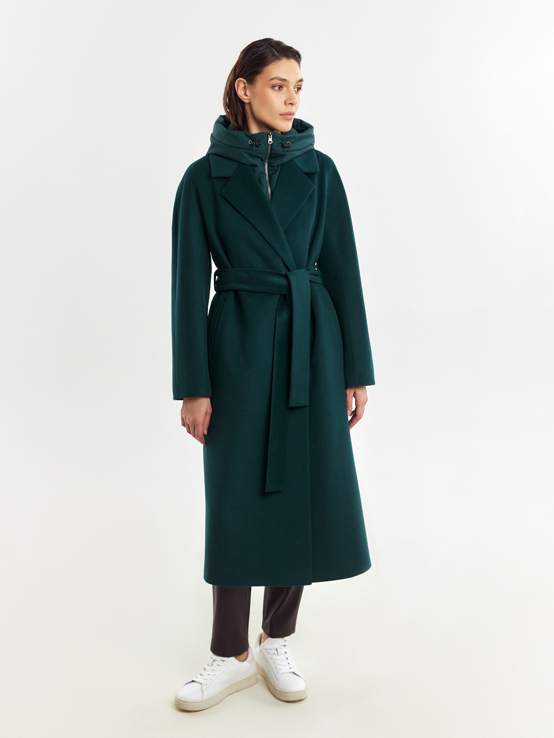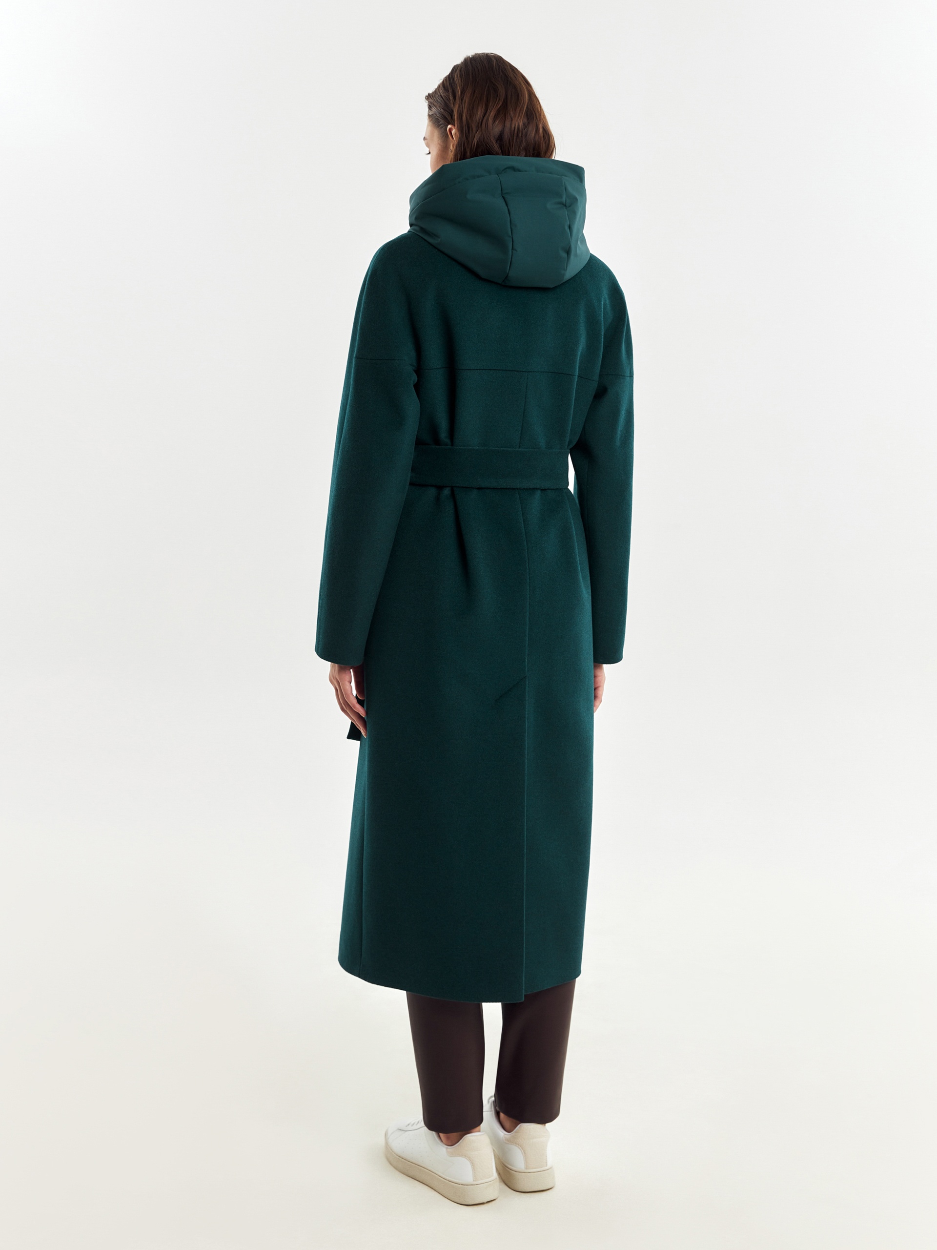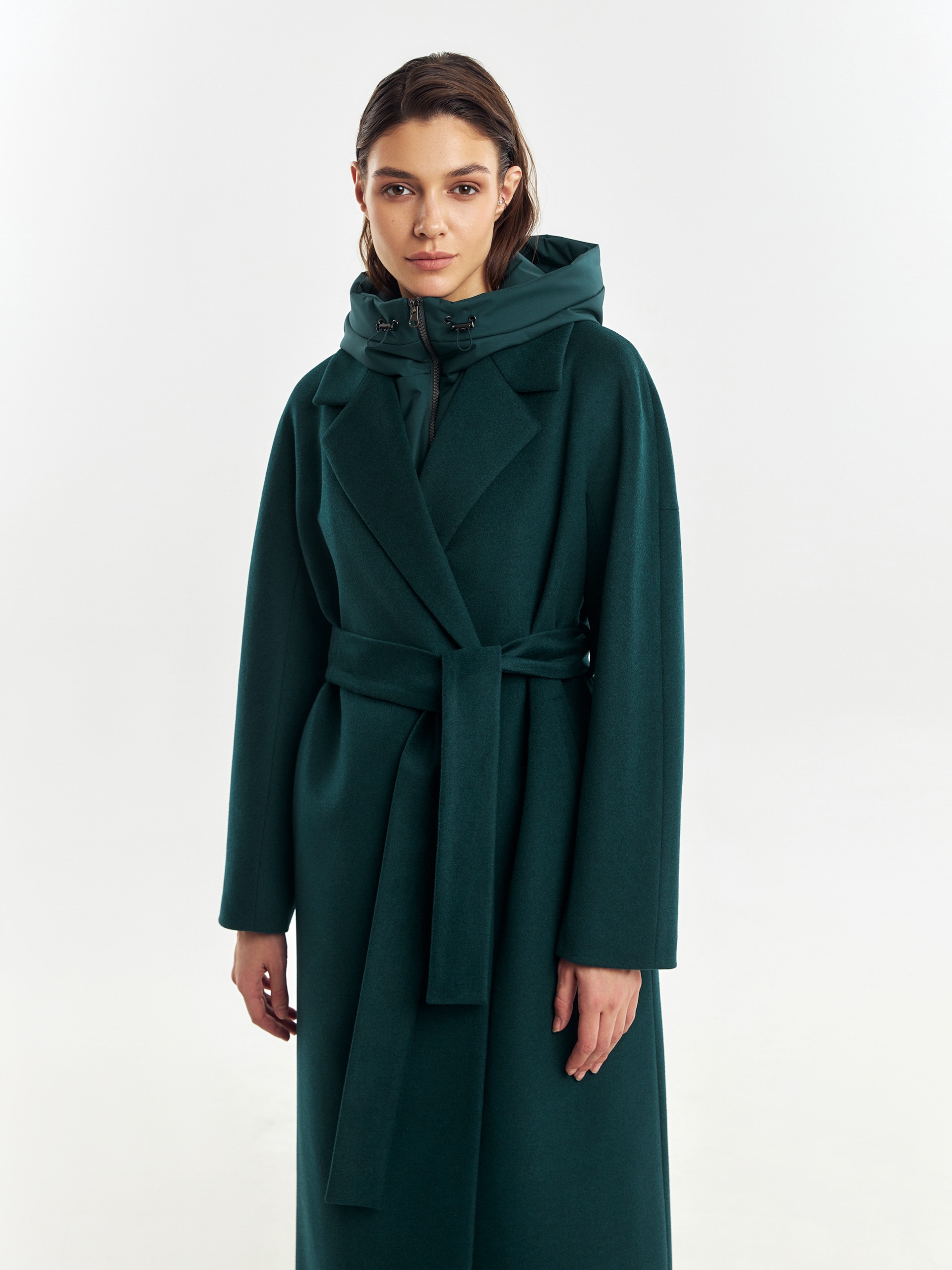 Двубортное лаконичное пальто силуэта "удлиненный кокон" из шерстяной пальтовой ткани в темно-изумрудном цвете. Эта модель сочетает в себе все качества современного пальто. Комфортный рукав, классический английский воротник и вместительные карманы делают его стильным и удобным. Застежка пальто на ряд потайных пришивных кнопок, в среднем шве спинки располагается высокая шлица. В комплекте к пальто идет съемный теплый непромокаемый капюшон с манишкой модного изумрудного цвета, благодаря которому образ легко модернизируется из элегантного в спортивный. Изделие дополняет съемный пояс, которым можно подчеркнуть талию для создания более женственного образа. А для наилучшей защиты от непогоды пальто произведено с использованием высокотехнологичной мембраны RaftPro и современного легкого утеплителя. Произведено в Санкт-Петербурге.