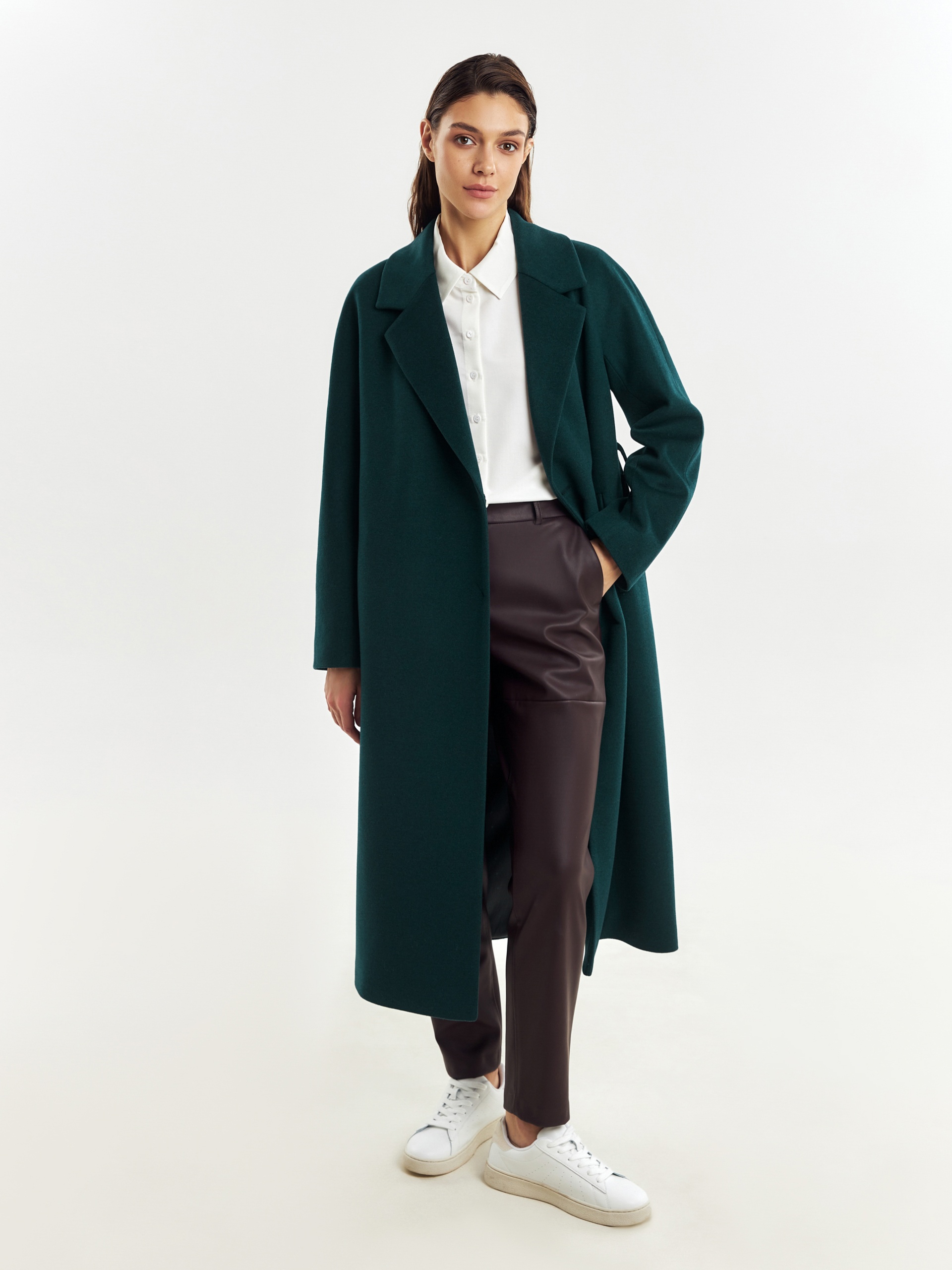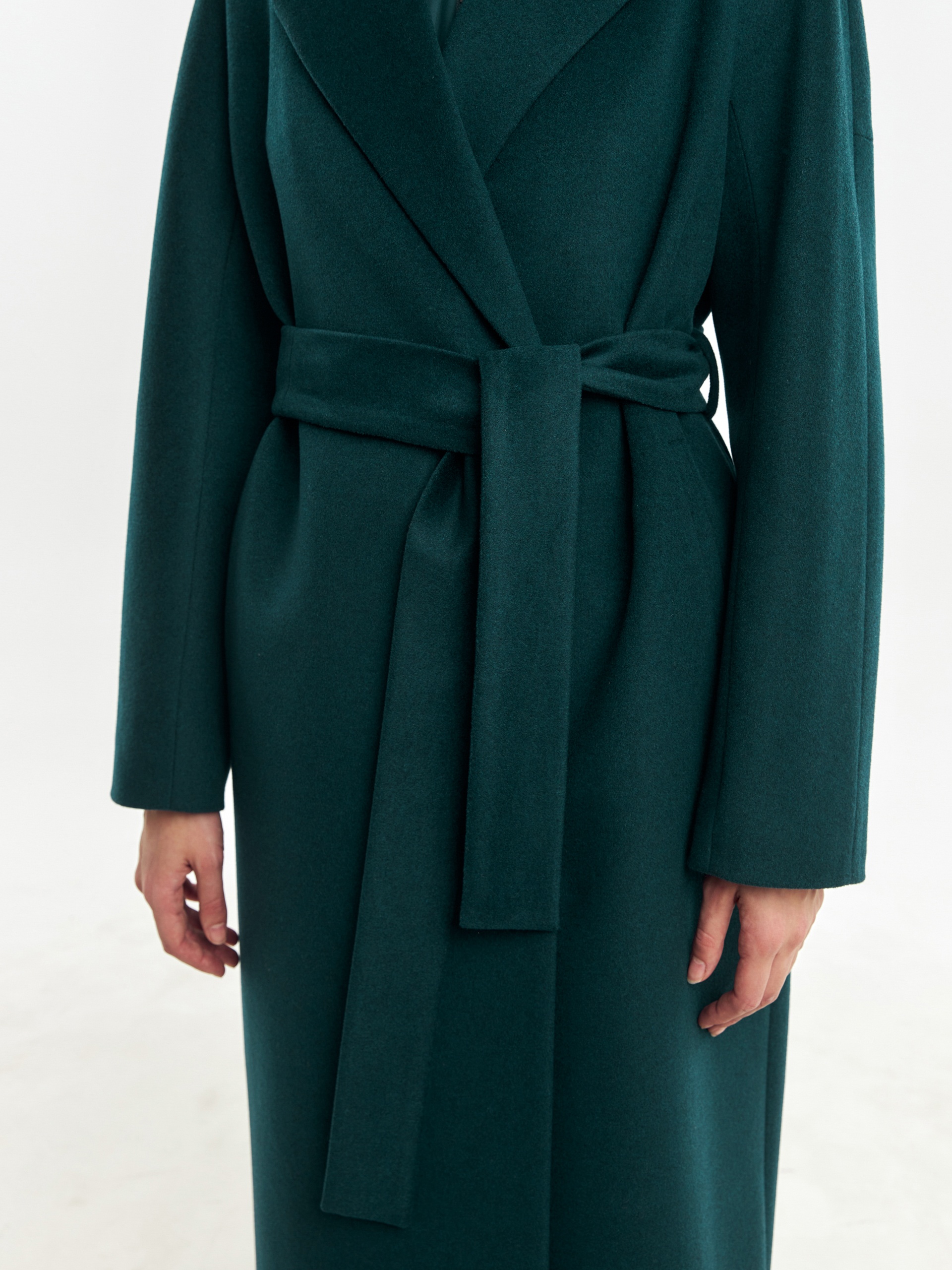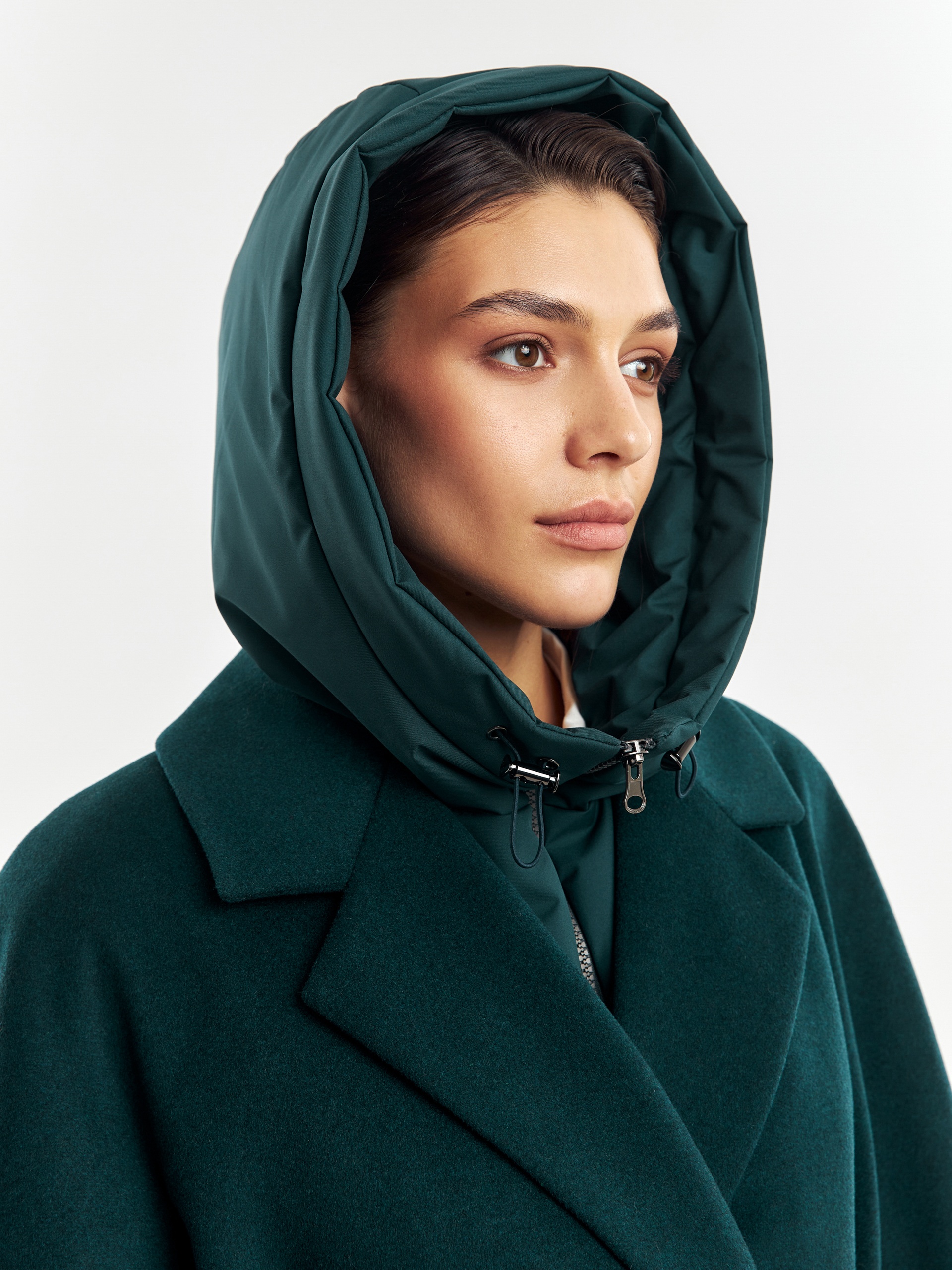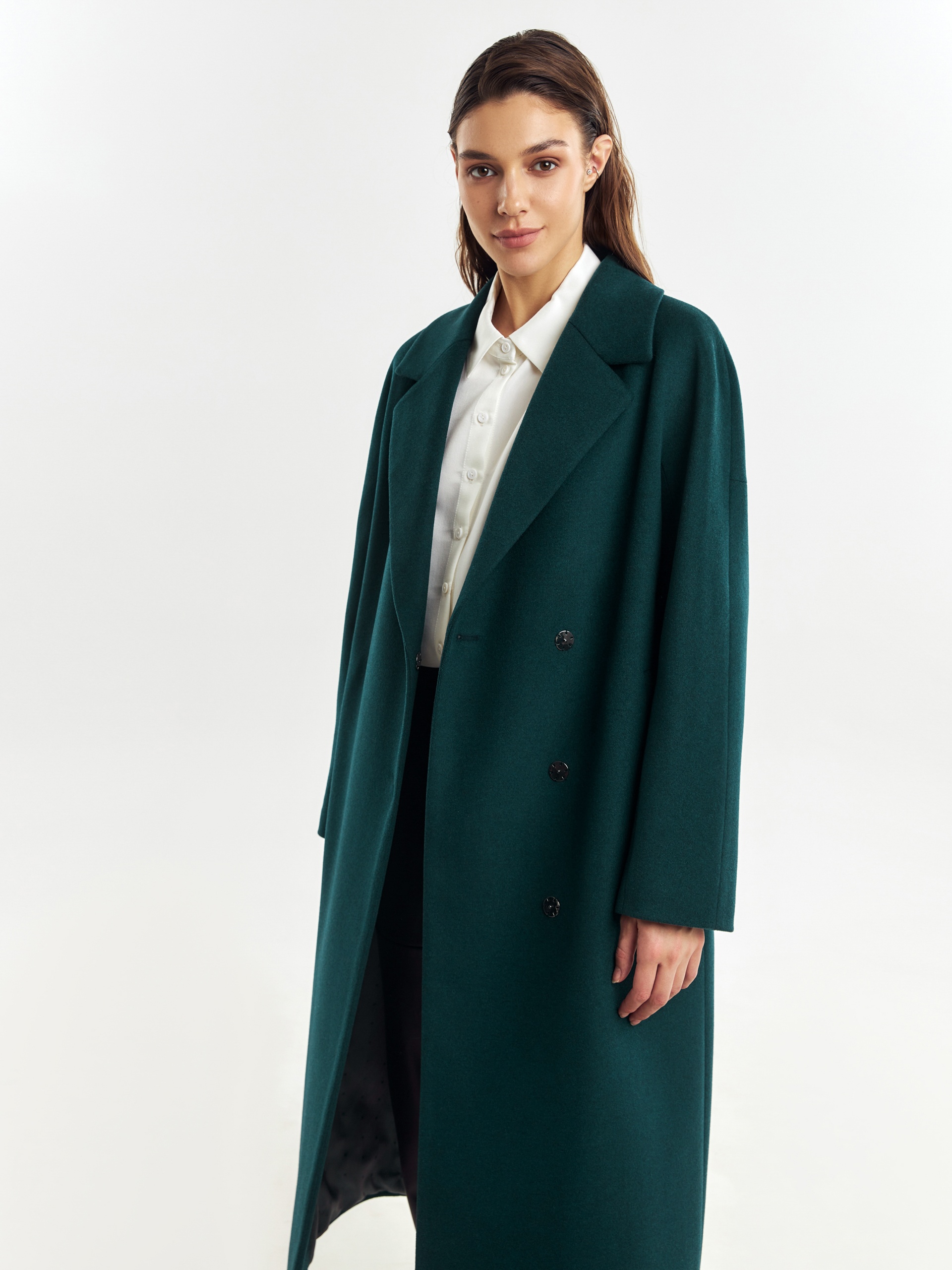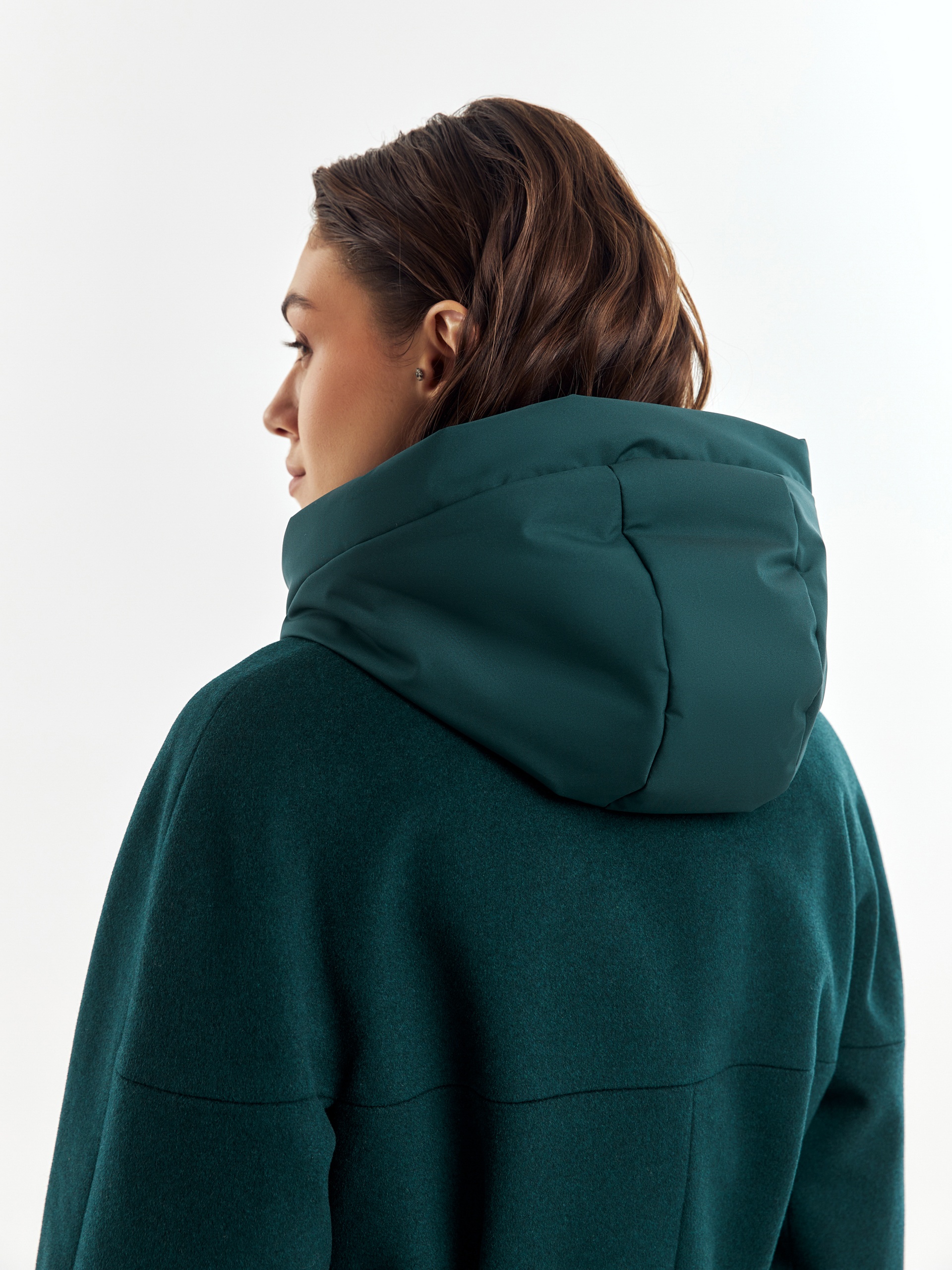 Двубортное лаконичное пальто силуэта "удлиненный кокон" из шерстяной пальтовой ткани в темно-изумрудном цвете. Эта модель сочетает в себе все качества современного пальто. Комфортный рукав, классический английский воротник и вместительные карманы делают его стильным и удобным. Застежка пальто на ряд потайных пришивных кнопок, в среднем шве спинки располагается высокая шлица. В комплекте к пальто идет съемный теплый непромокаемый капюшон с манишкой модного изумрудного цвета, благодаря которому образ легко модернизируется из элегантного в спортивный. Изделие дополняет съемный пояс, которым можно подчеркнуть талию для создания более женственного образа. А для наилучшей защиты от непогоды пальто произведено с использованием высокотехнологичной мембраны RaftPro и современного легкого утеплителя. Произведено в Санкт-Петербурге.