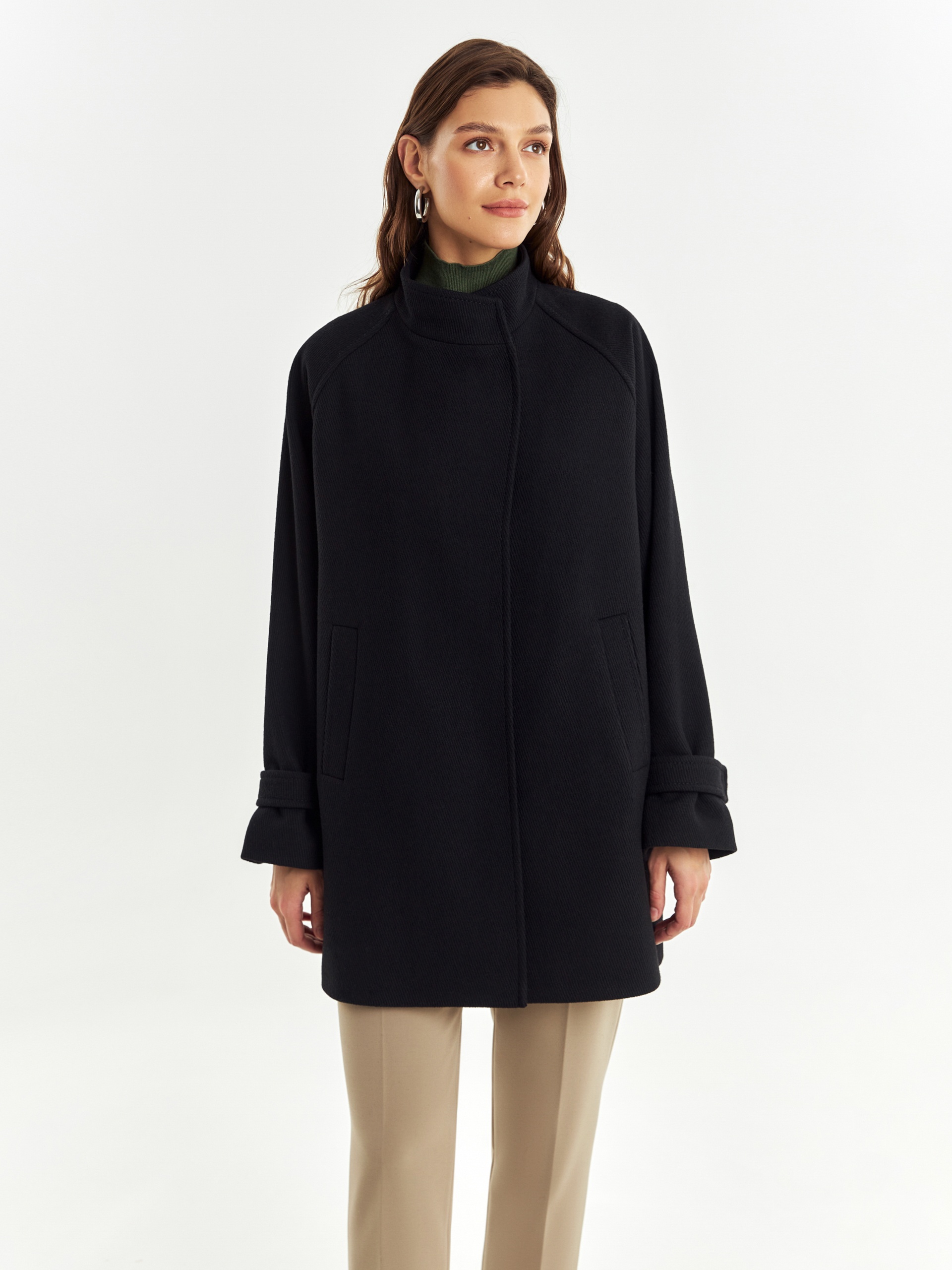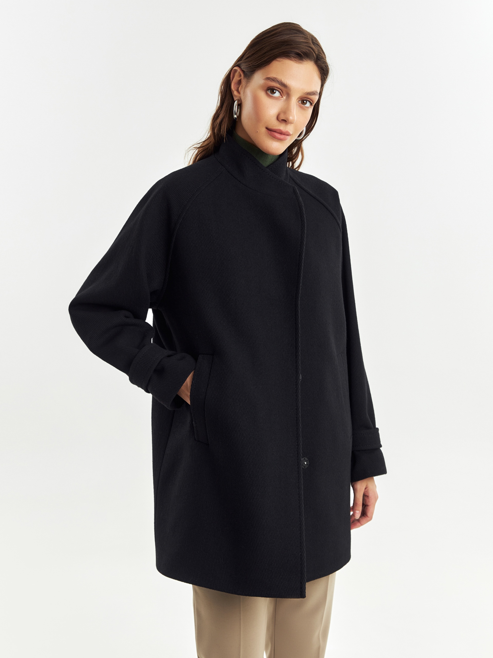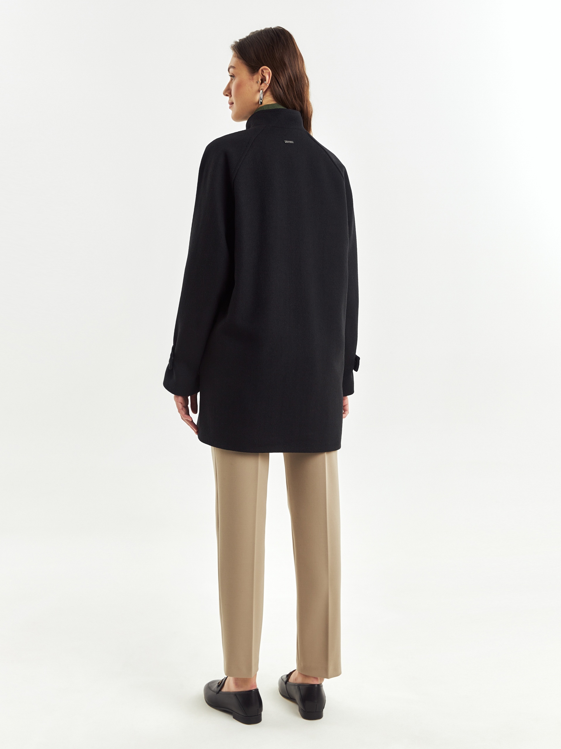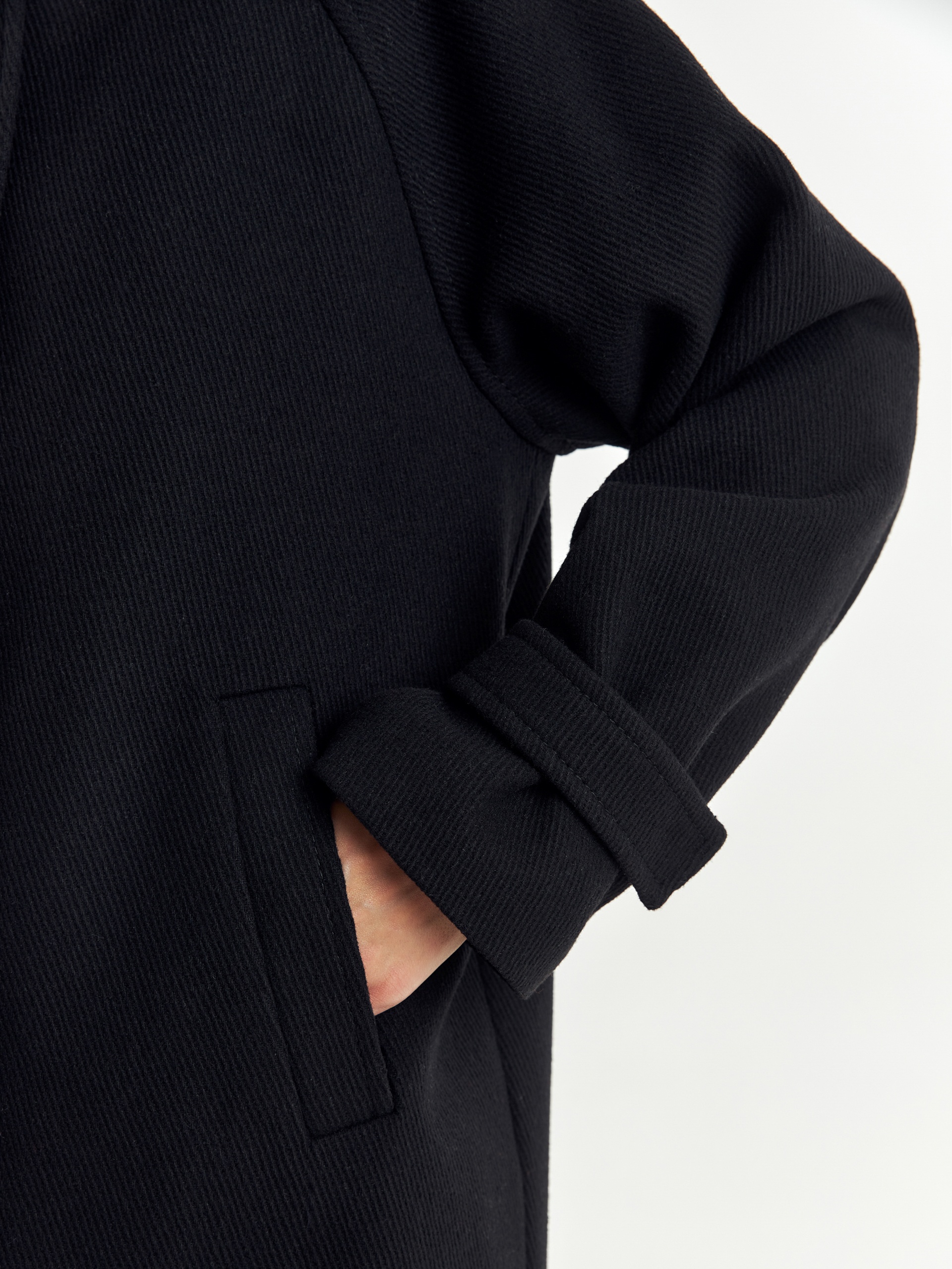 Полупальто прямого силуэта из шерстяной ткани черного цвета с эффектом диагональ. Пальто имеет совершенно новую уникальную форму: высокий воротник с заведенной стойкой, мягкие линии края борта, широкий рукав-реглан, собранный по низу на узкую пату. Эти детали не только создают дополнительную защиту от непогоды, но и делают изделие более объемным и стильным. Спинка полупальто имеет дополнительное утепление. По бокам расположены глубокие карманы с листочками, застегивается пальто на ряд надежных пришивных кнопок. А для наилучшей защиты от холода и ветра пальто выполнено с использованием высокотехнологичной мембраны RaftPro и современного легкого утеплителя. Произведено в Санкт-Петербурге.