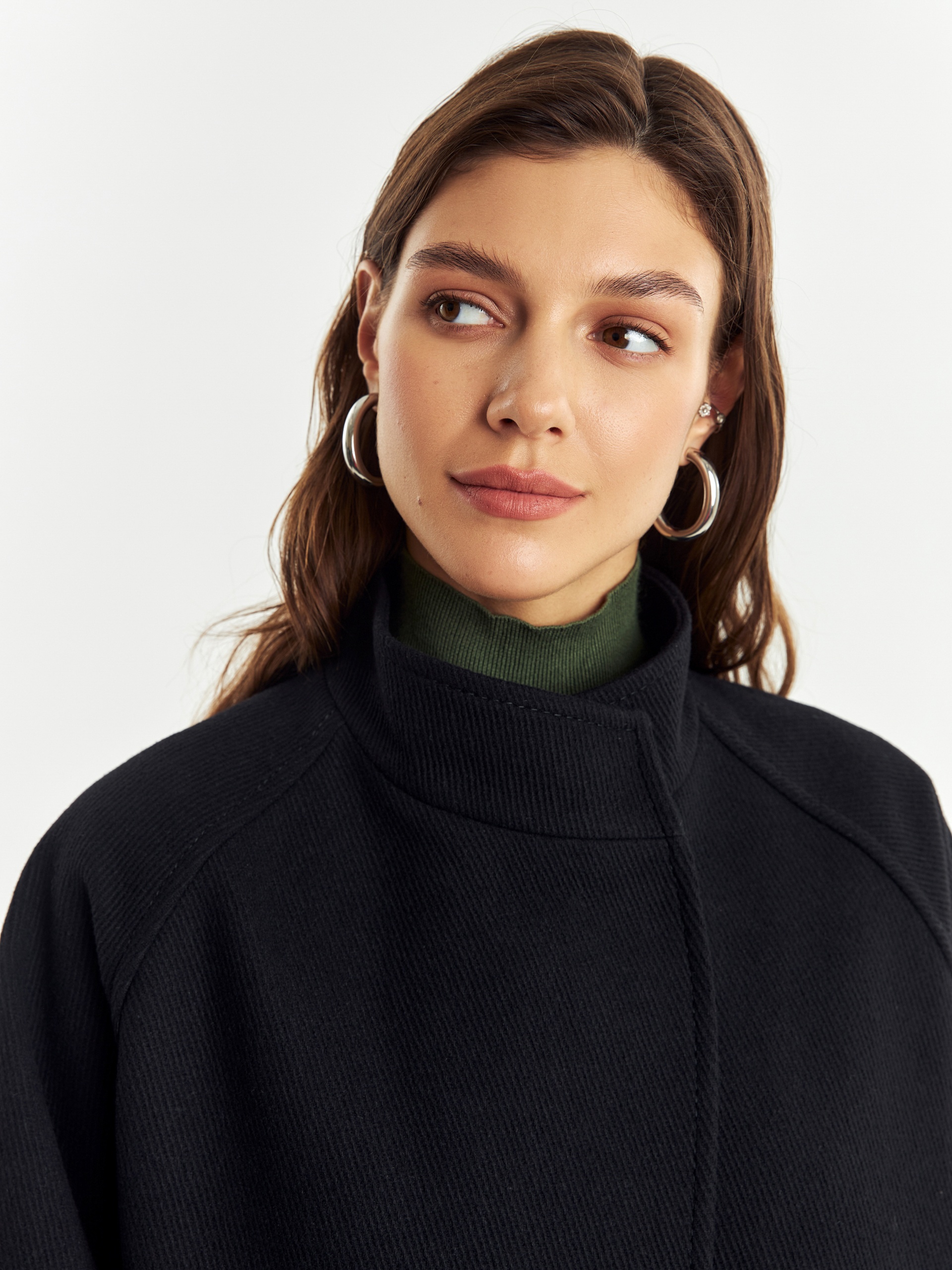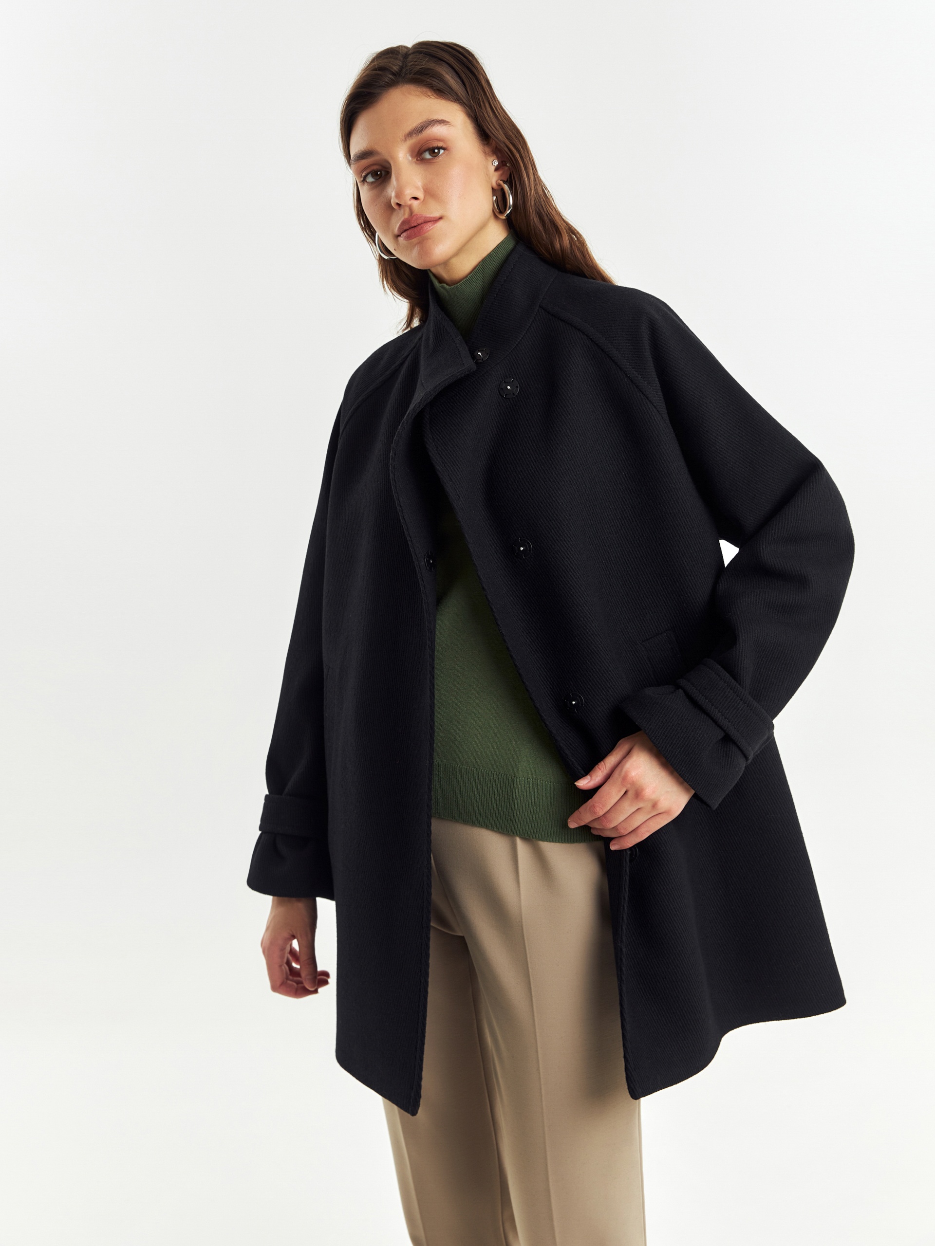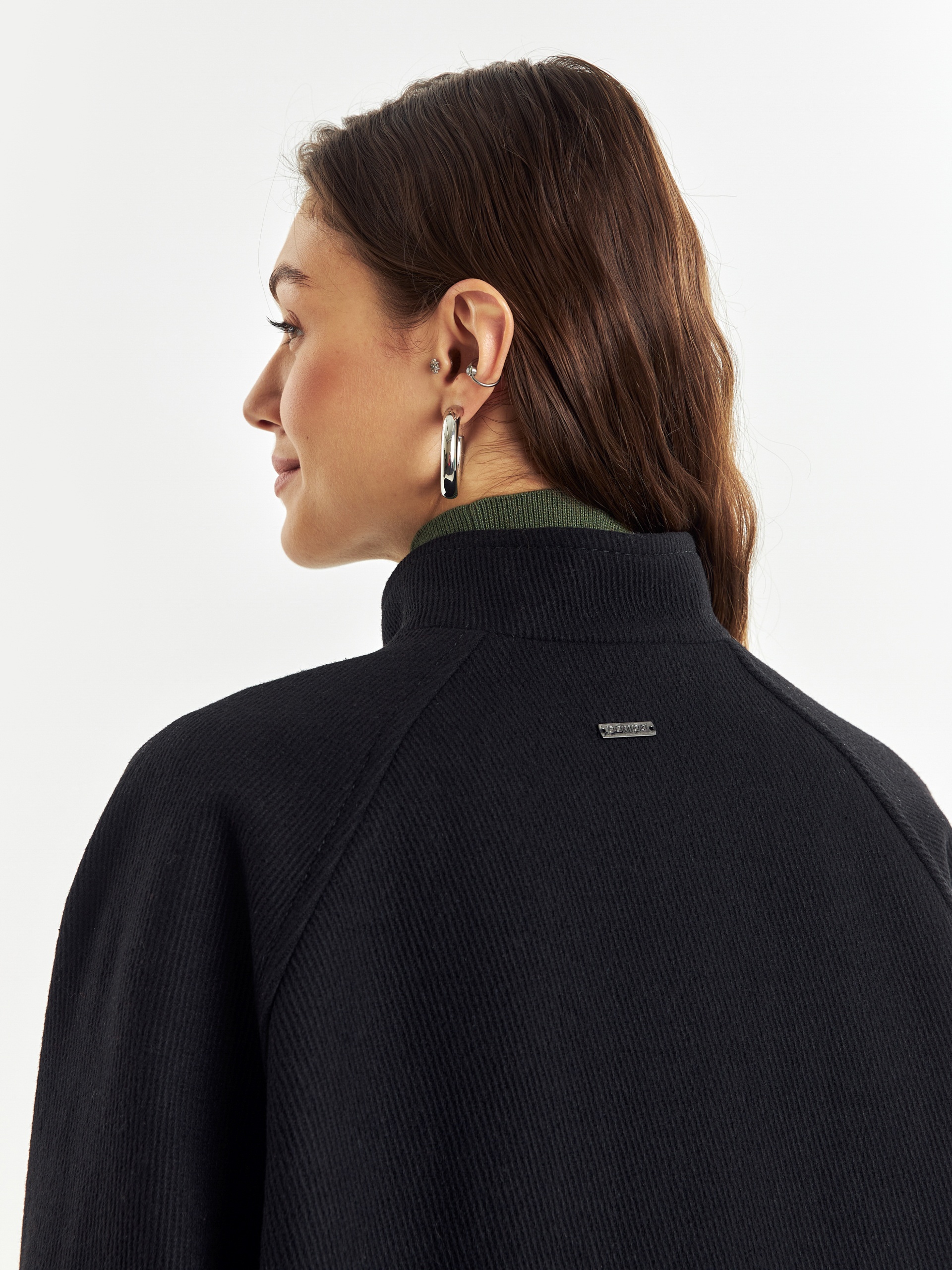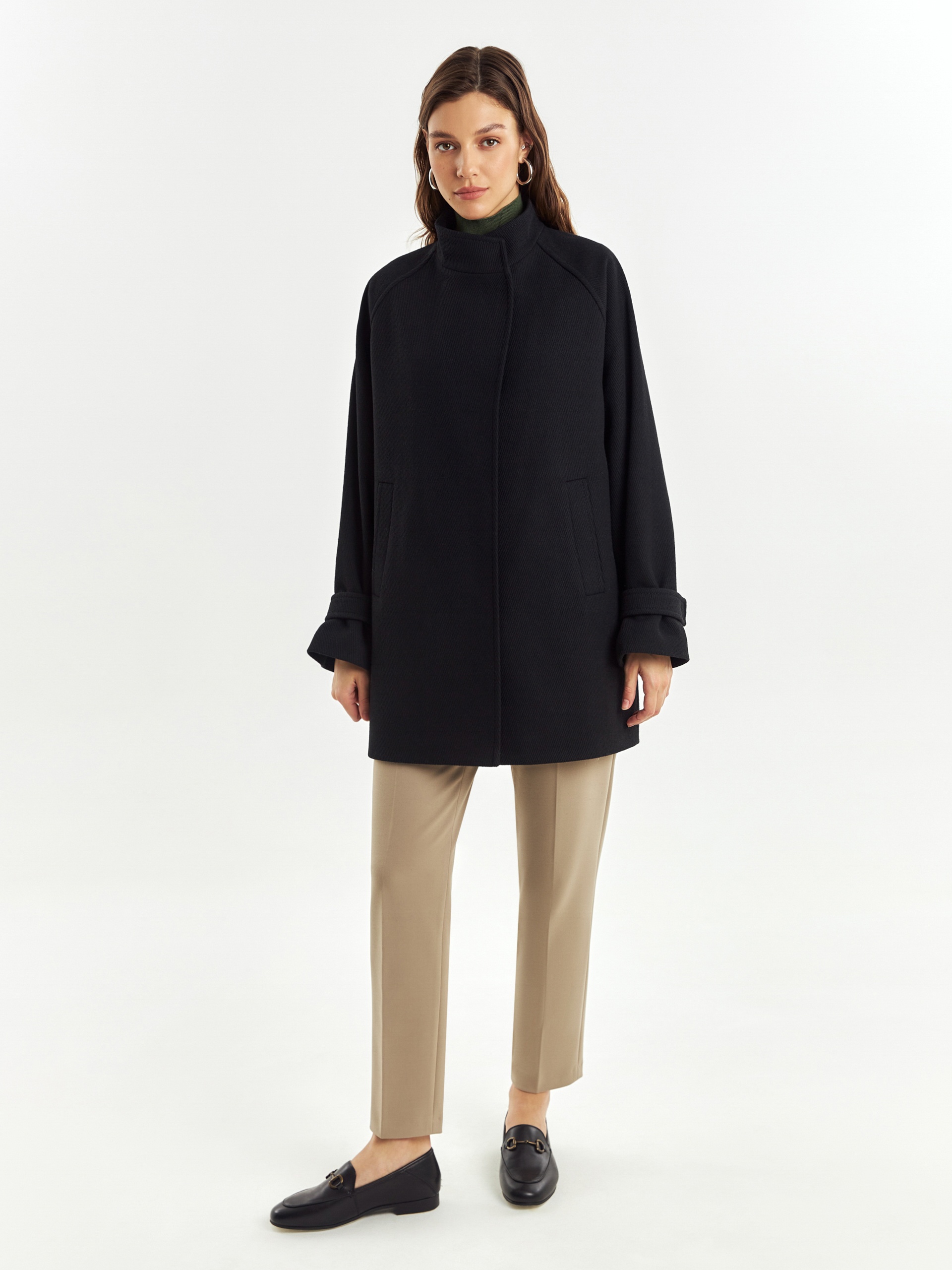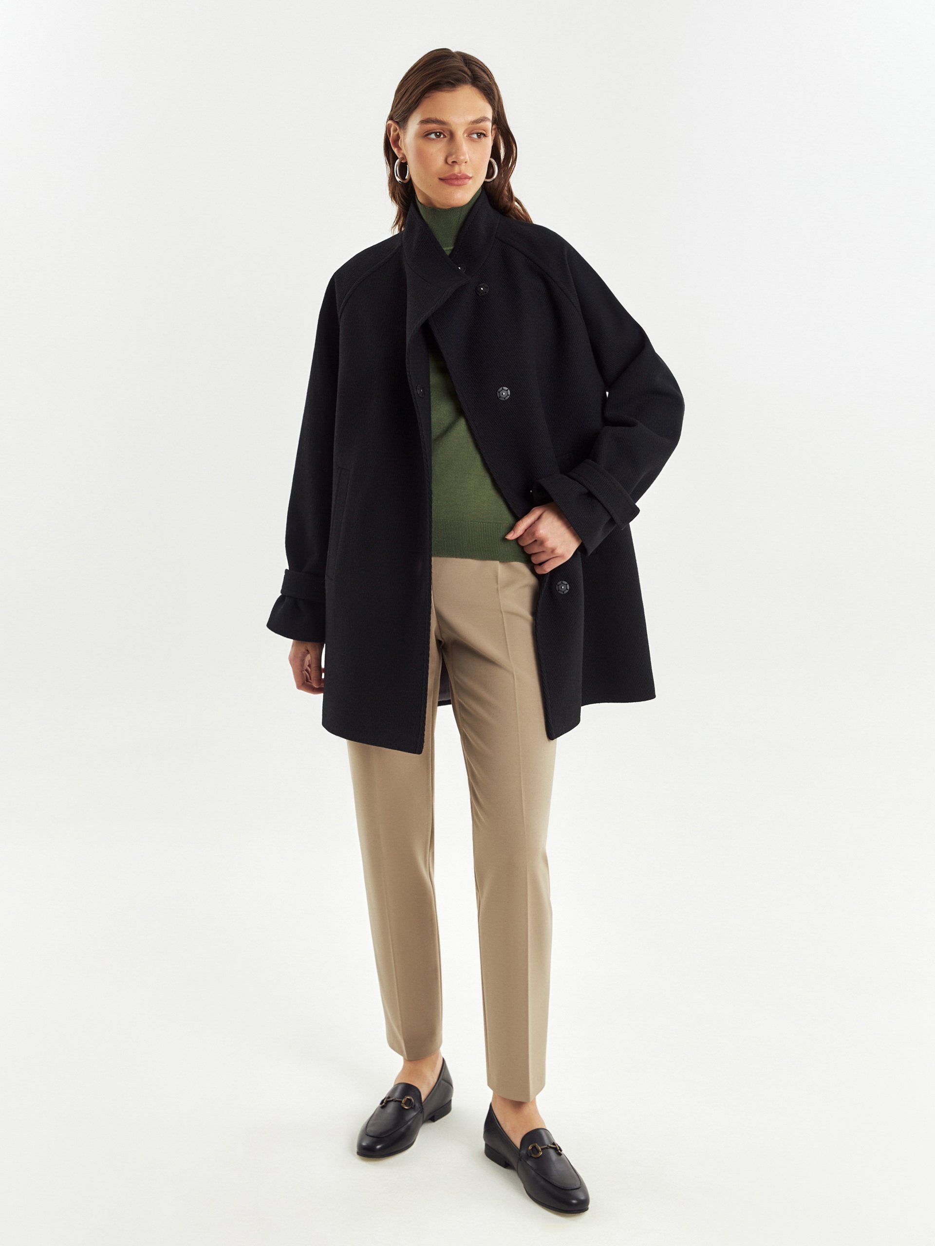 Полупальто прямого силуэта из шерстяной ткани черного цвета с эффектом диагональ. Пальто имеет совершенно новую уникальную форму: высокий воротник с заведенной стойкой, мягкие линии края борта, широкий рукав-реглан, собранный по низу на узкую пату. Эти детали не только создают дополнительную защиту от непогоды, но и делают изделие более объемным и стильным. Спинка полупальто имеет дополнительное утепление. По бокам расположены глубокие карманы с листочками, застегивается пальто на ряд надежных пришивных кнопок. А для наилучшей защиты от холода и ветра пальто выполнено с использованием высокотехнологичной мембраны RaftPro и современного легкого утеплителя. Произведено в Санкт-Петербурге.
