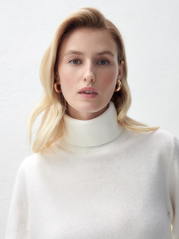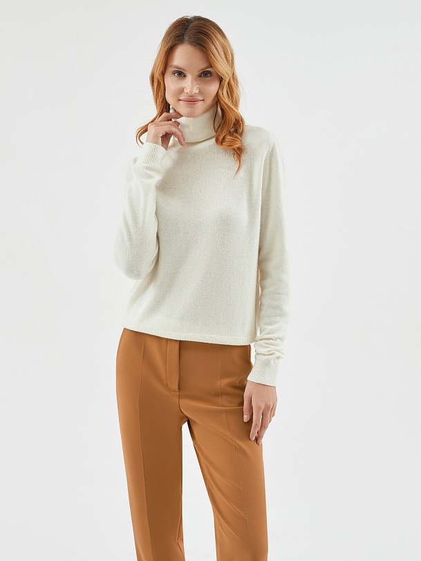 Базовый джемпер благородного бежевого меланжа, приятный коже благодаря кашемиру и вискозе в составе пряжи, станет фаворитом в вашем гардеробе. Достаточно тонкий, чтобы носить его под жакет или самостоятельно.