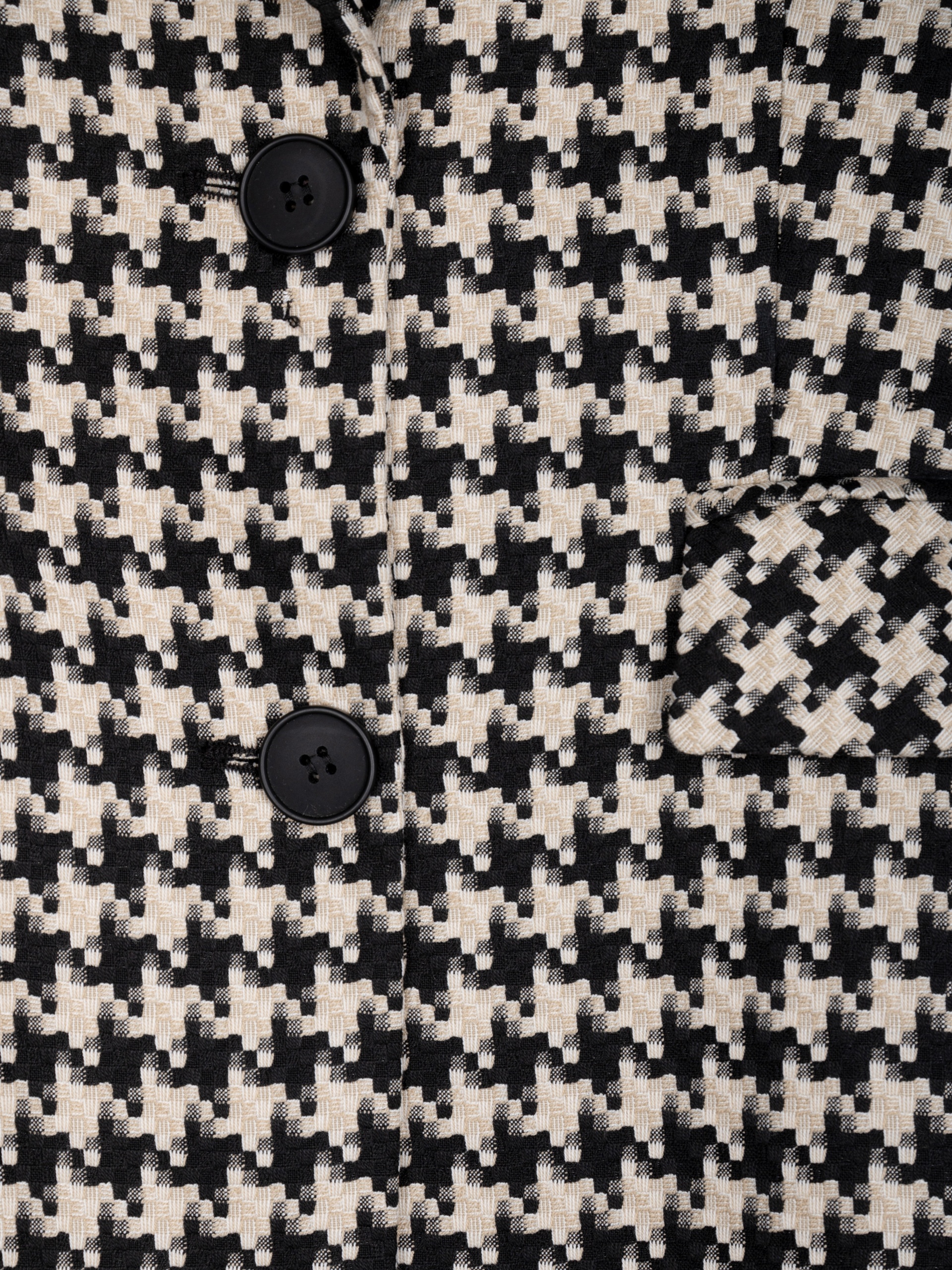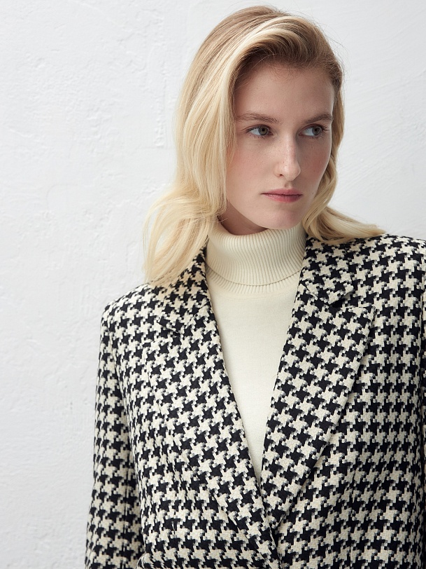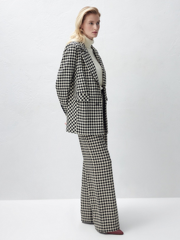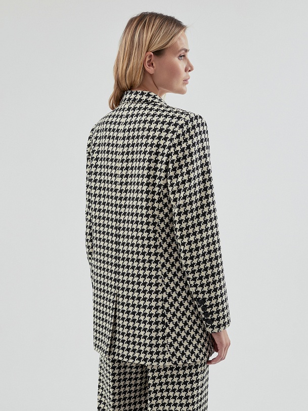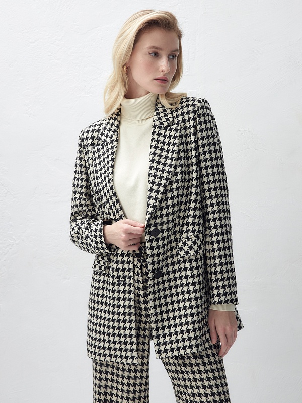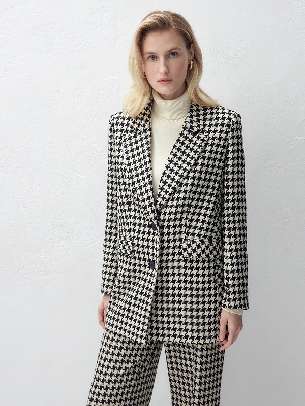 Однобортный прямой жакет из костюмной ткани в крупном черно-молочном принте "гусиная лапка" на двух пуговицах с классическим английским воротником и прорезными карманами с клапанами. Жакет идеально сочетается и с брюками, и с юбкой из одной ткани.