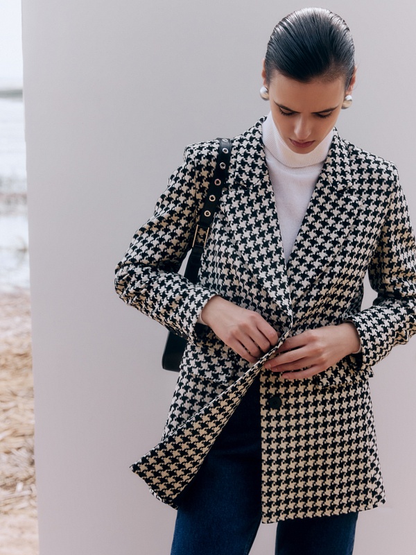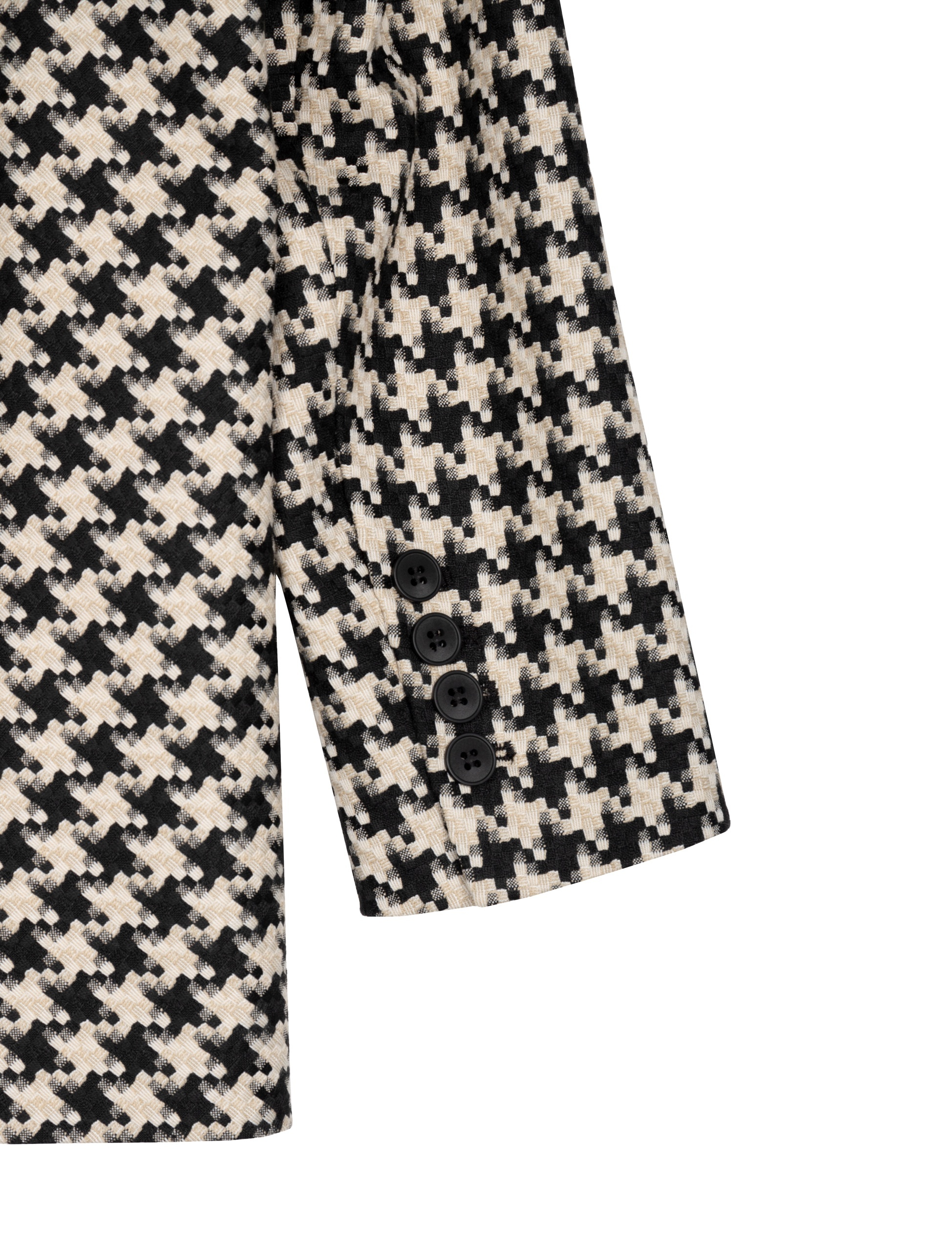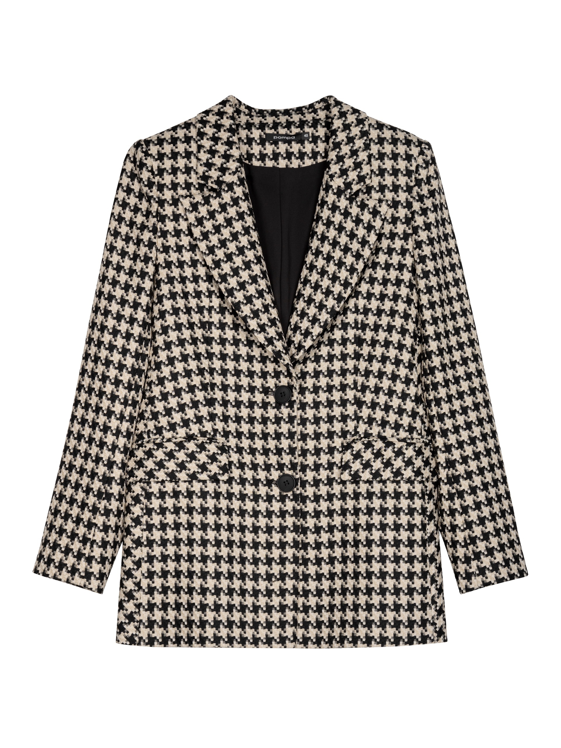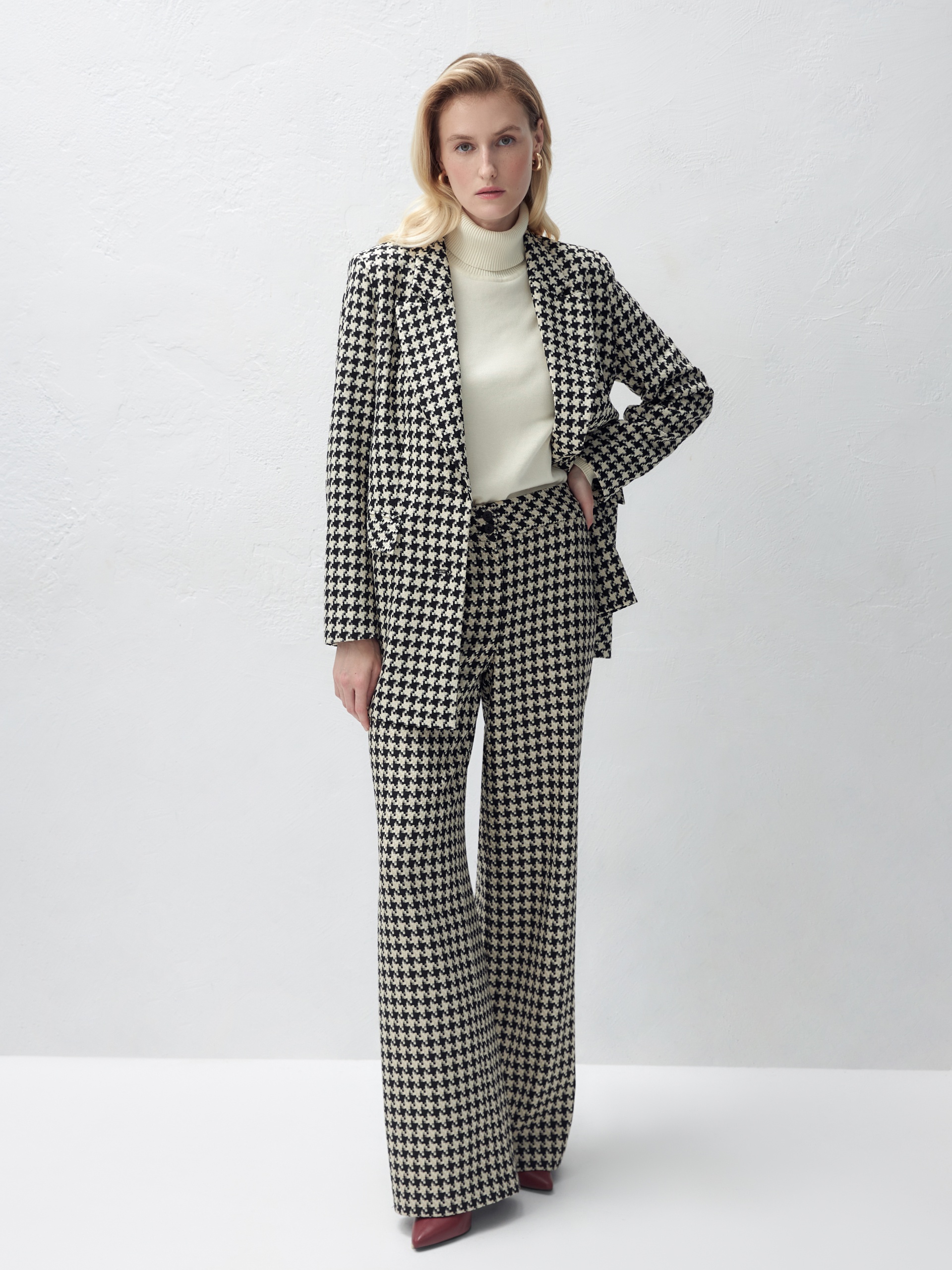 Однобортный прямой жакет из костюмной ткани в крупном черно-молочном принте "гусиная лапка" на двух пуговицах с классическим английским воротником и прорезными карманами с клапанами. Жакет идеально сочетается и с брюками, и с юбкой из одной ткани.