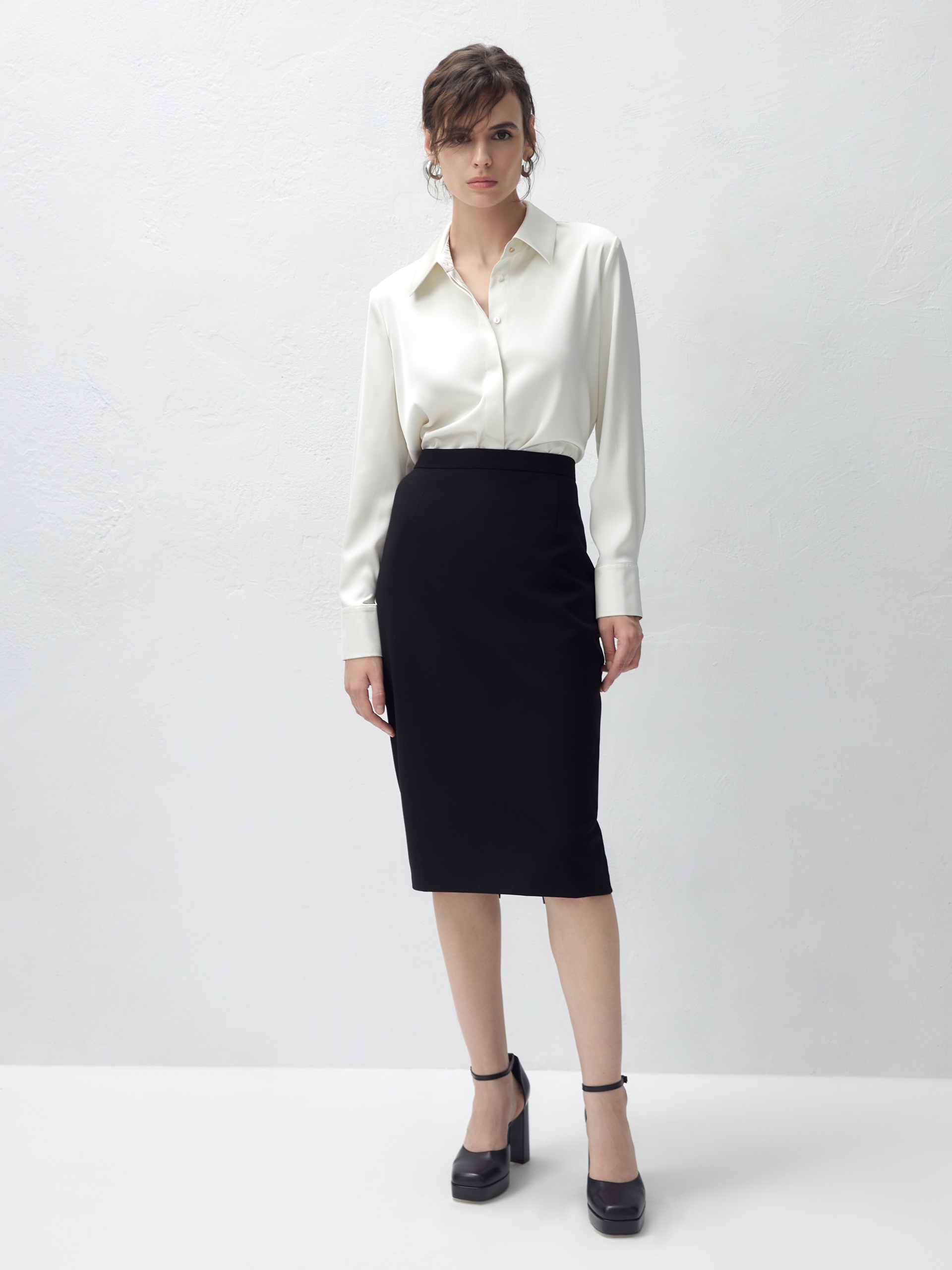 Юбка на притачном поясе полуприлегающего силуэта из костюмной ткани черного цвета, очень элегантной длины, прикрывающей колено. Застежка сзади на потайную молнию.