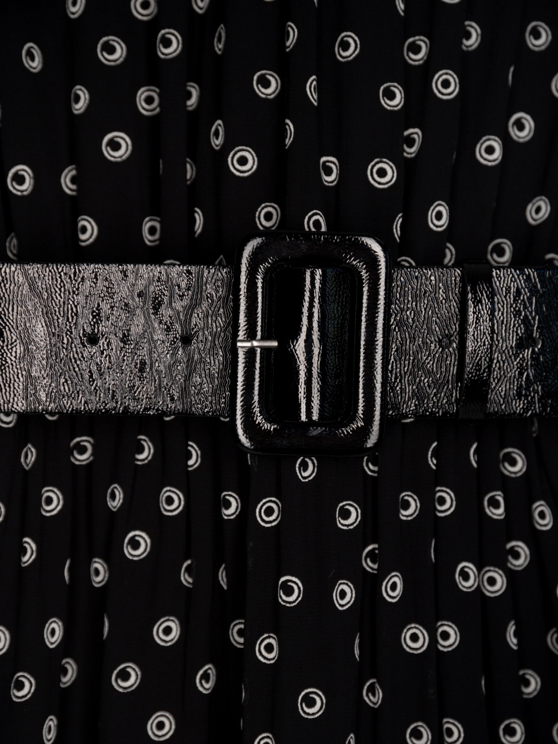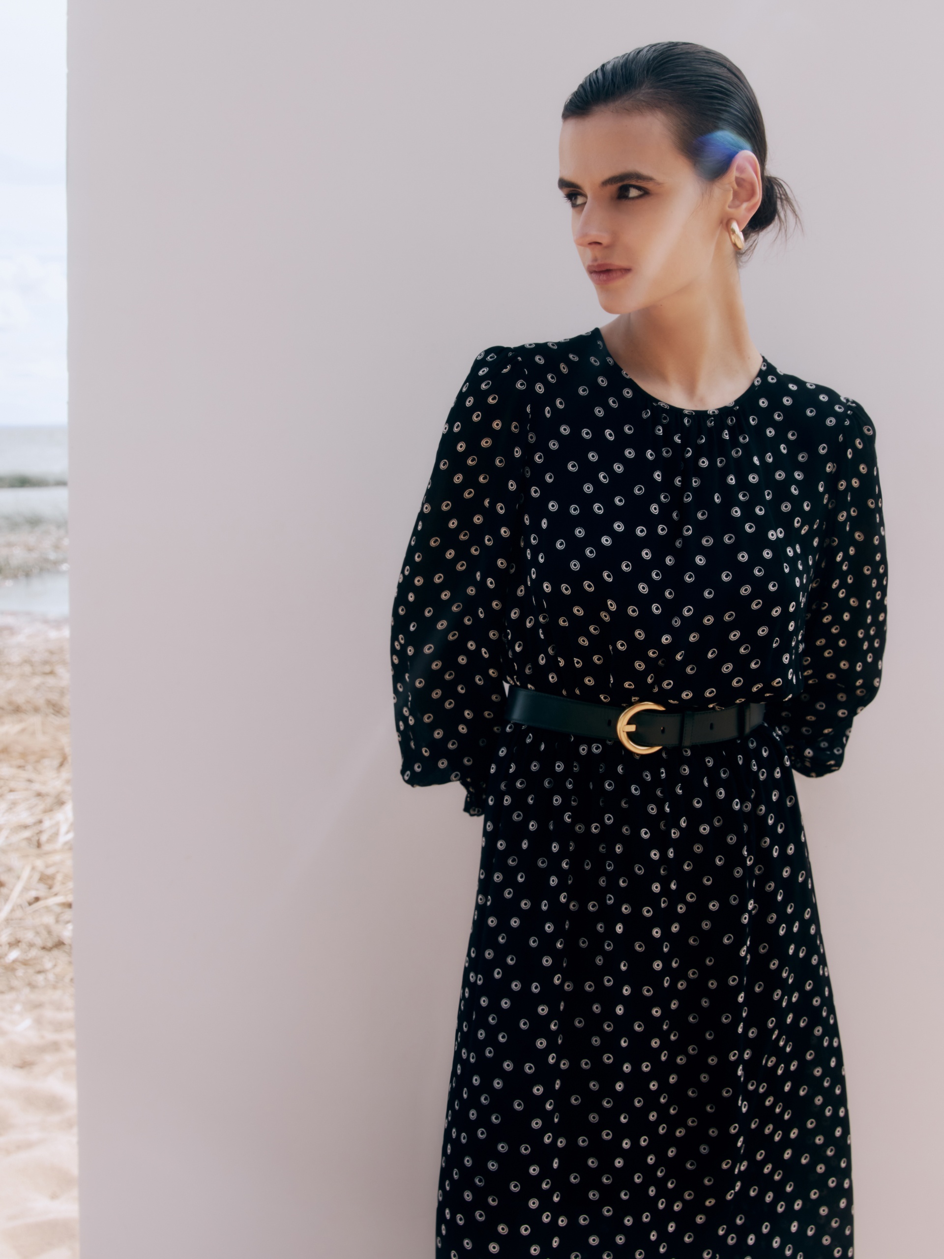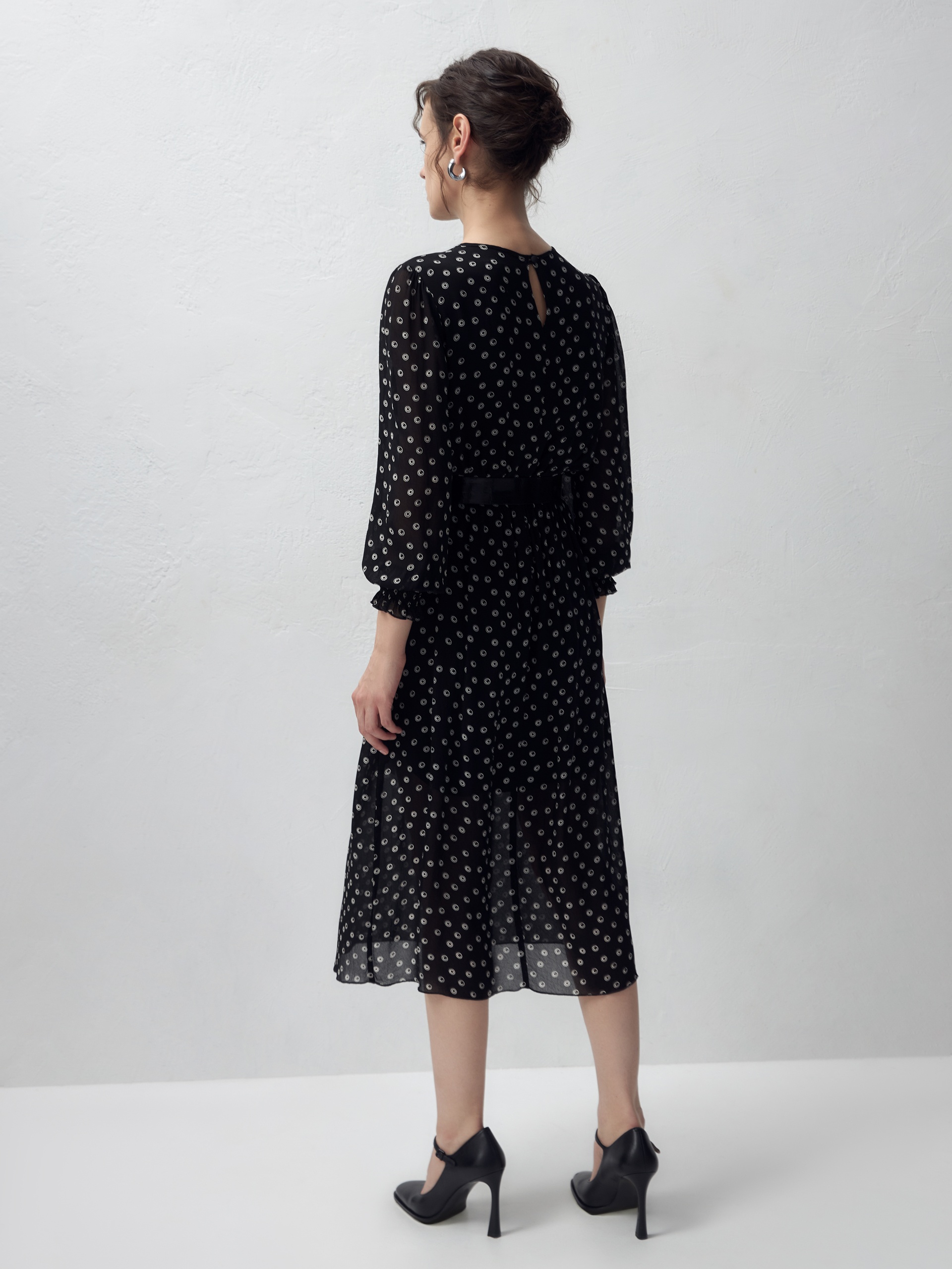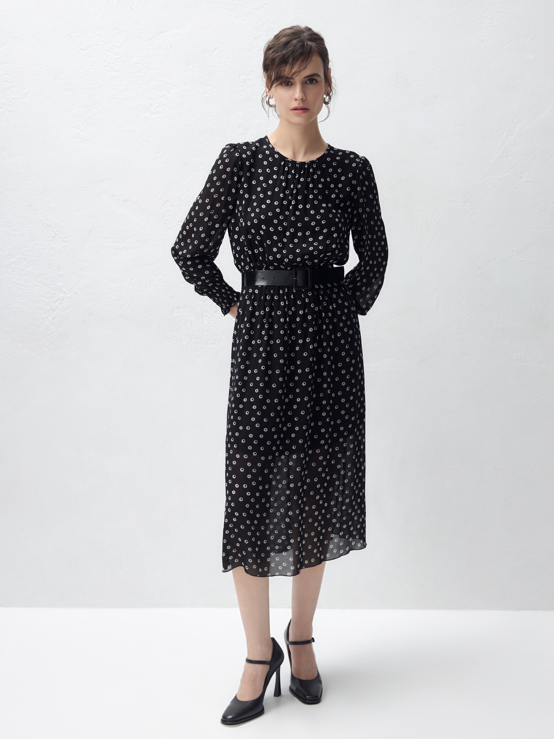 Прямое платье с резинкой по талии и круглым вырезом со сборкой по горловине. Платье выполнено из принтованной вискозной ткани в черно-белом цвете. Втачной рукав со сборкой по окату и манжетами из резинки-жилки. В комплекте идет пояс из черной кожи....