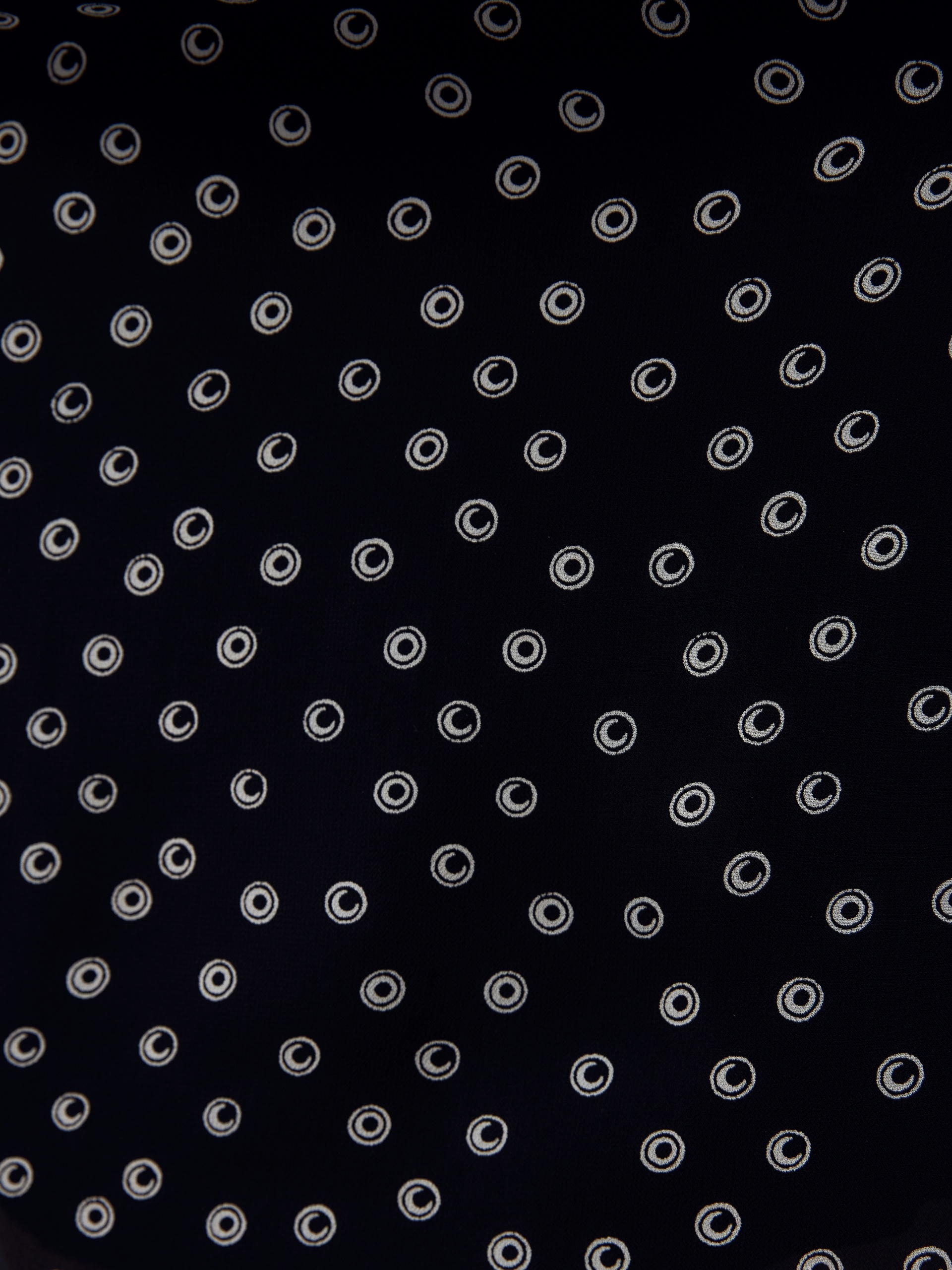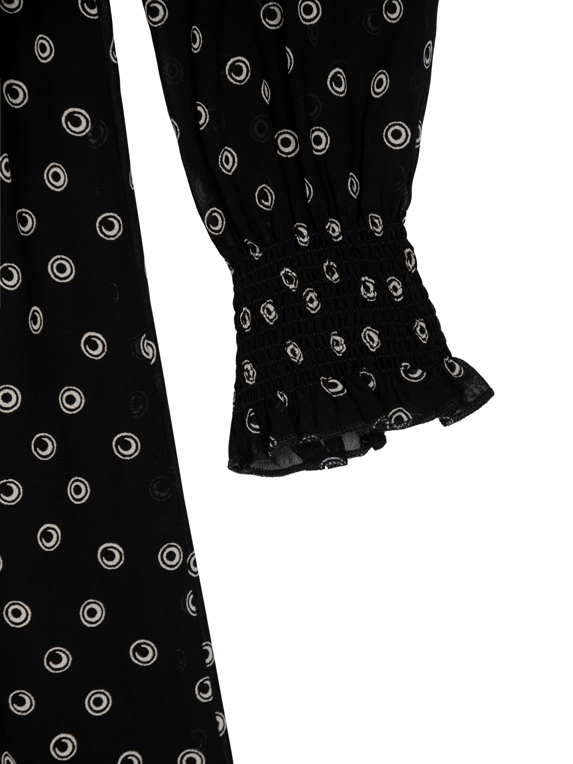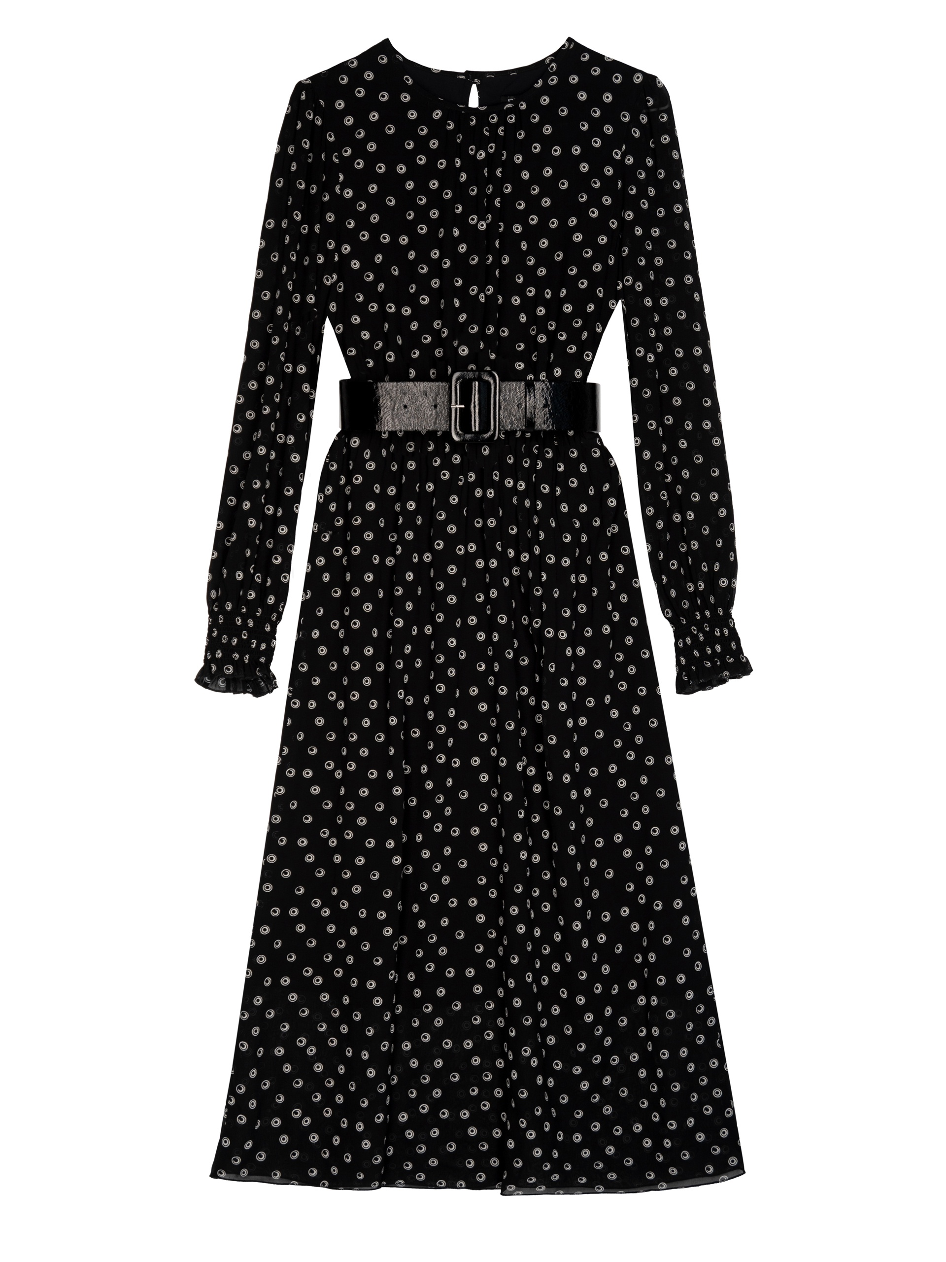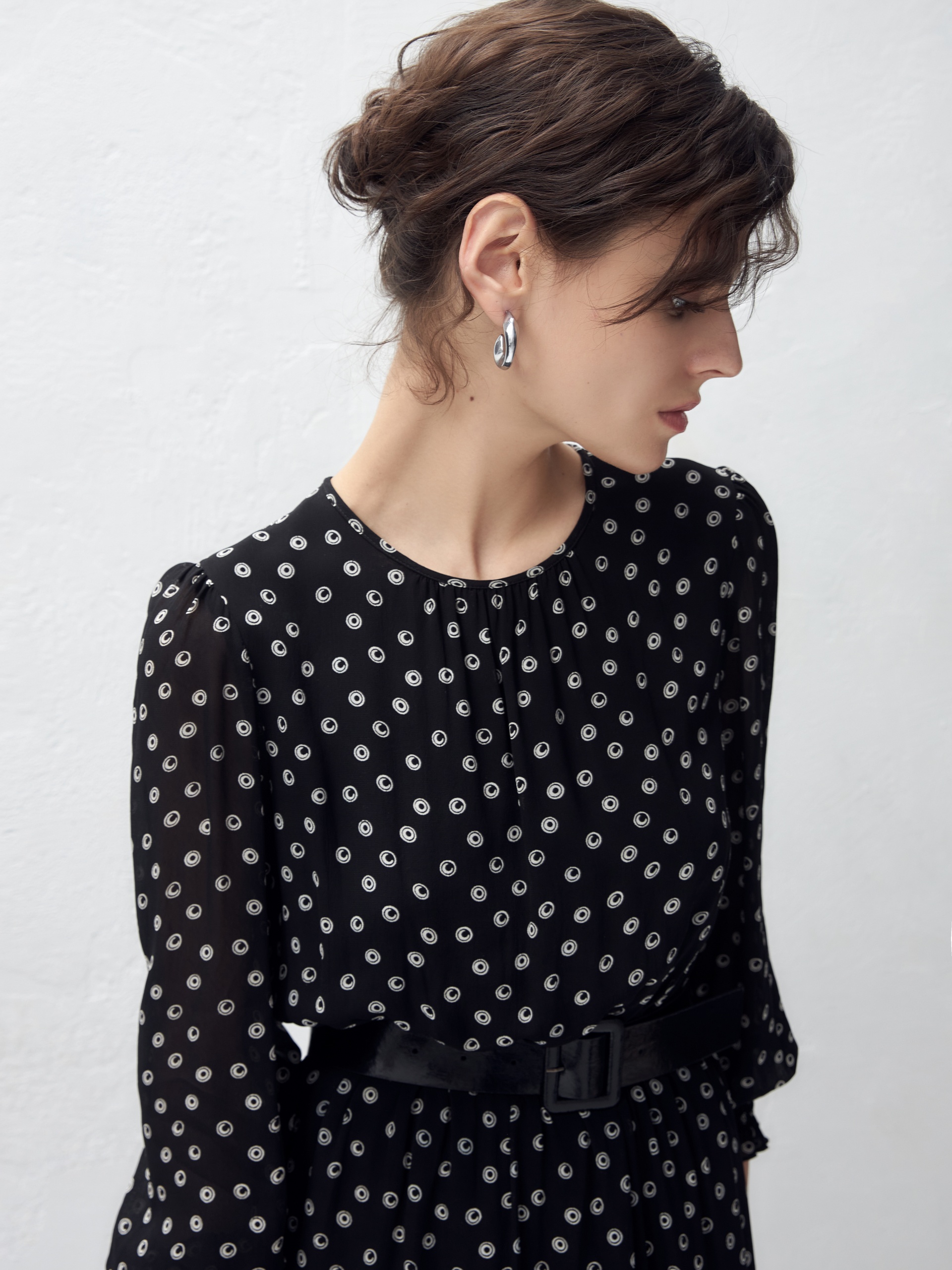 Прямое платье с резинкой по талии и круглым вырезом со сборкой по горловине. Платье выполнено из принтованной вискозной ткани в черно-белом цвете. Втачной рукав со сборкой по окату и манжетами из резинки-жилки. В комплекте идет пояс из черной кожи....