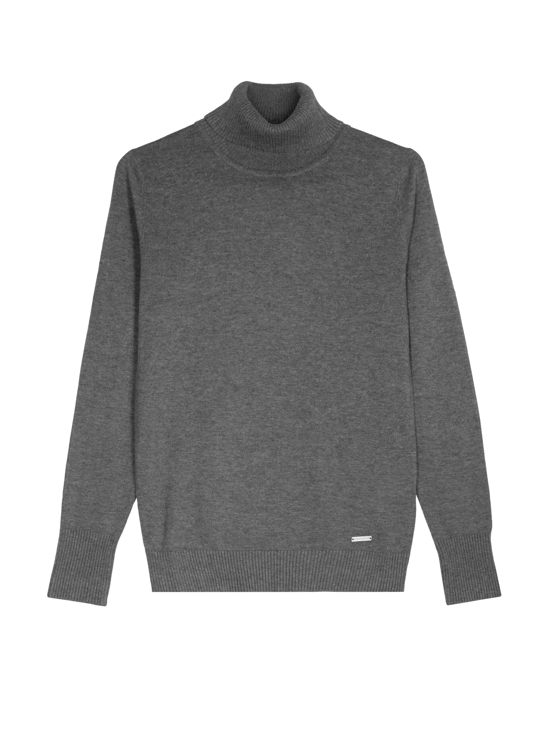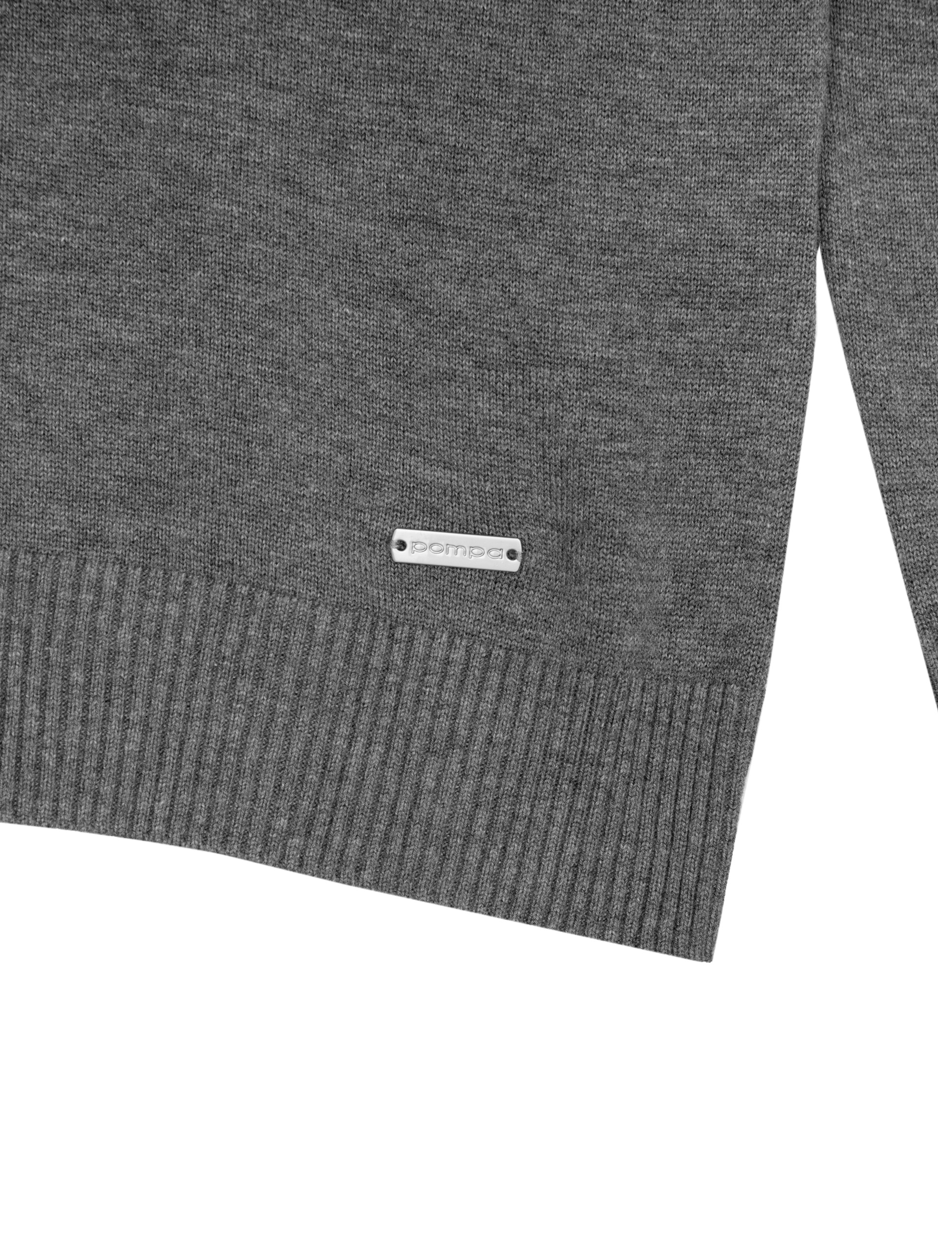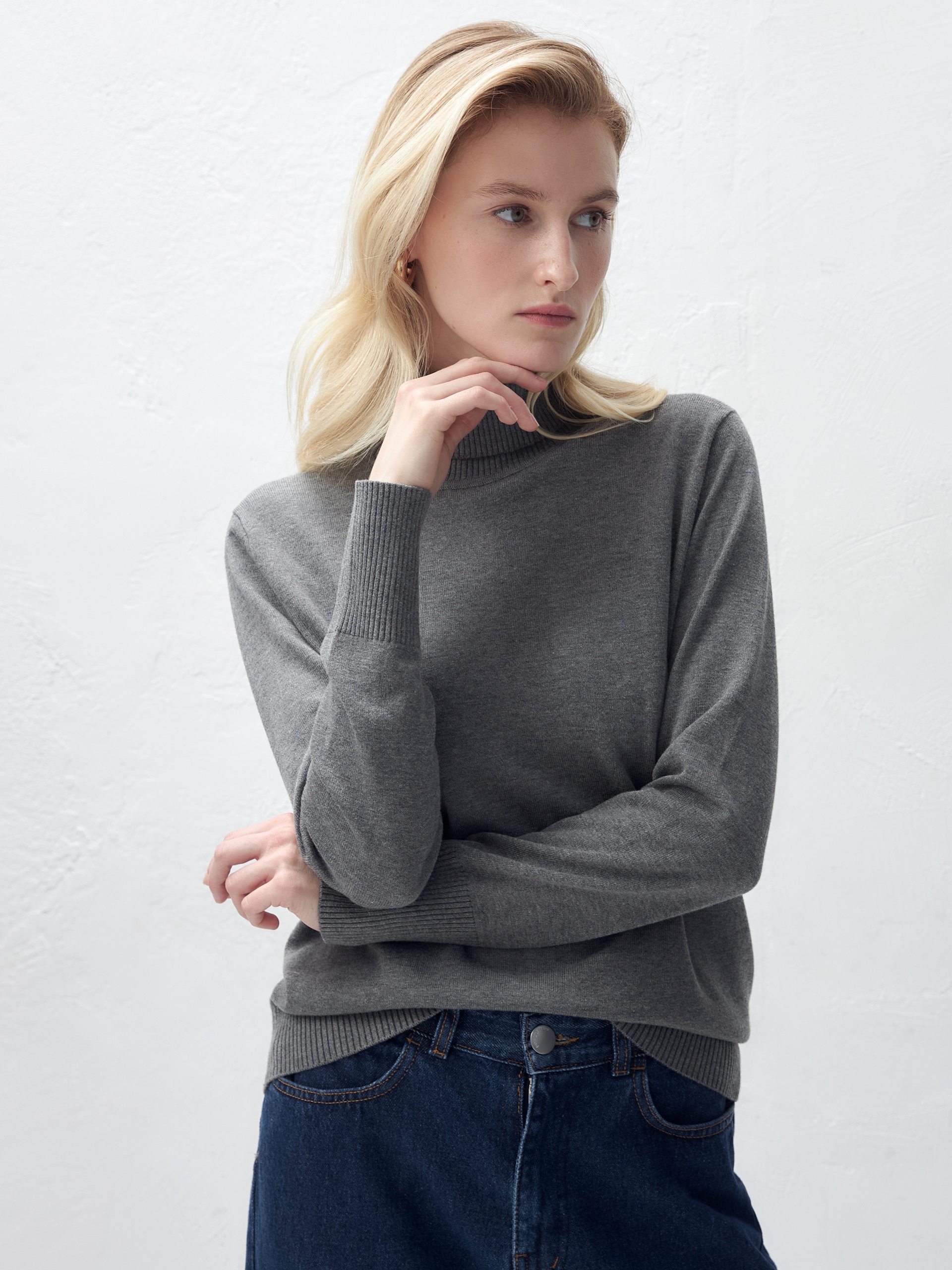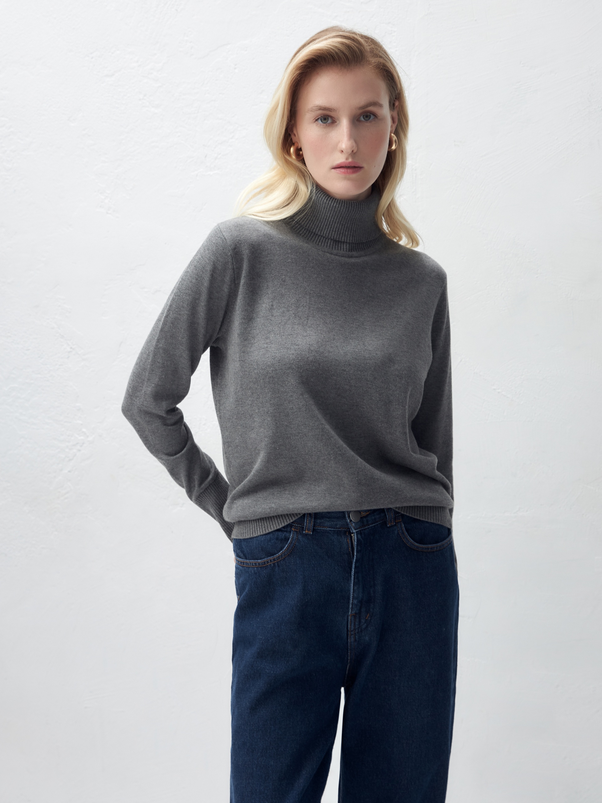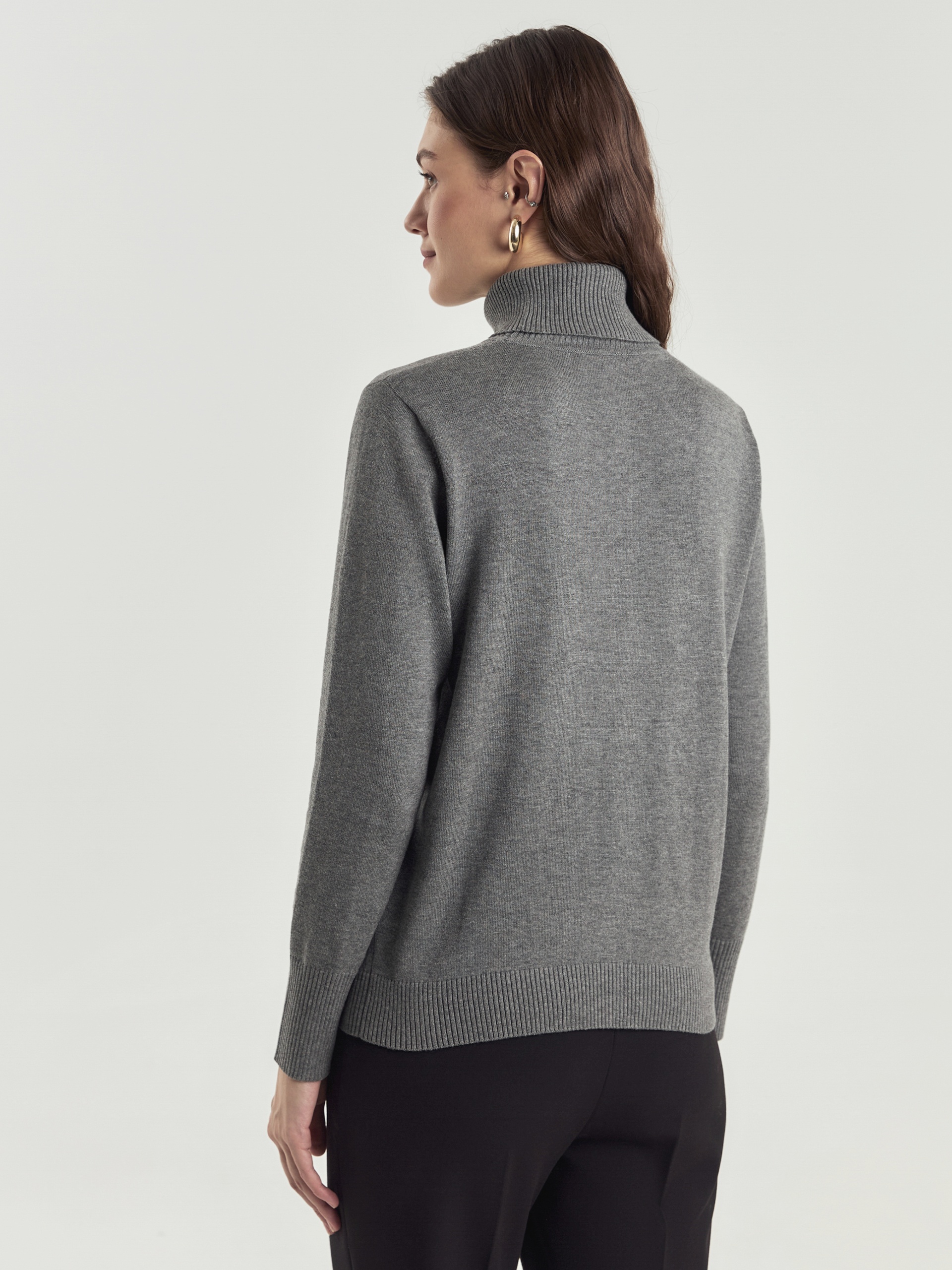 Базовый джемпер серого меланжа свободного кроя. Отлично сочетается с кардиганами, рубашками, жакетами.
