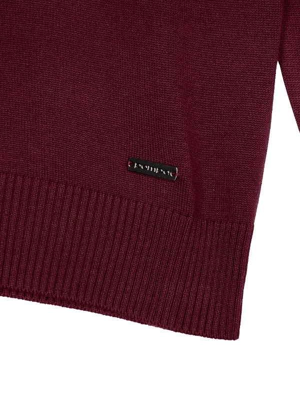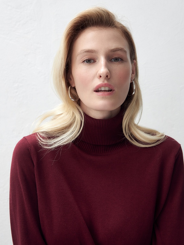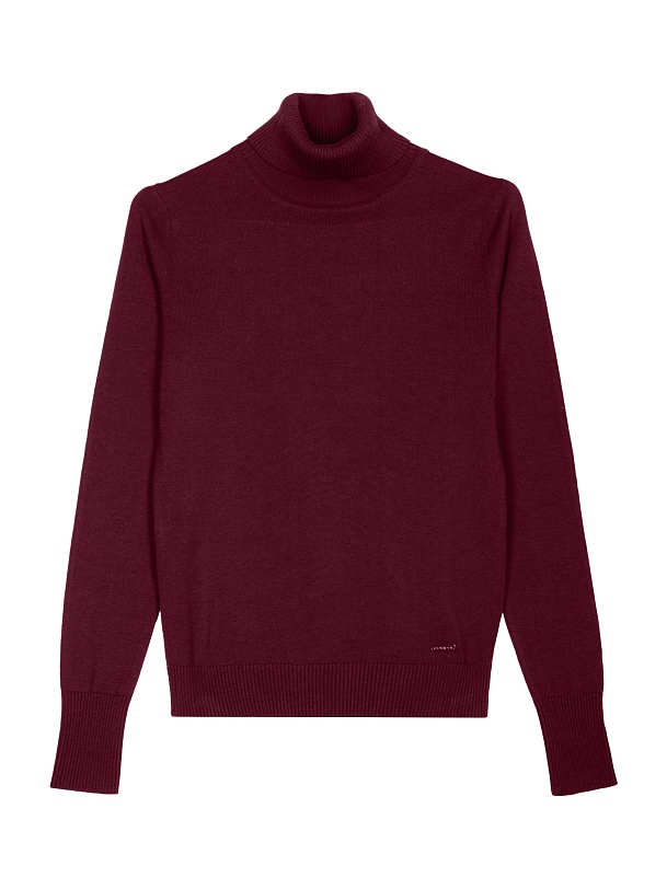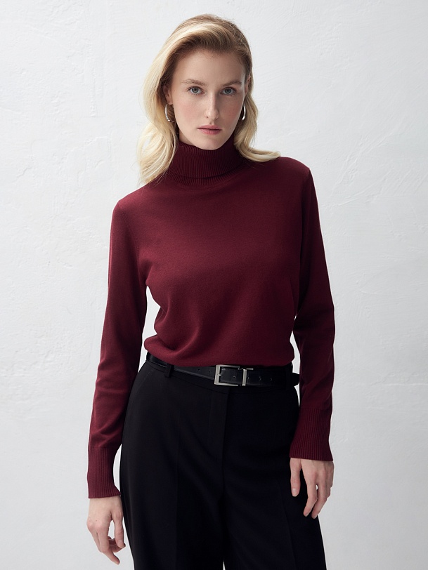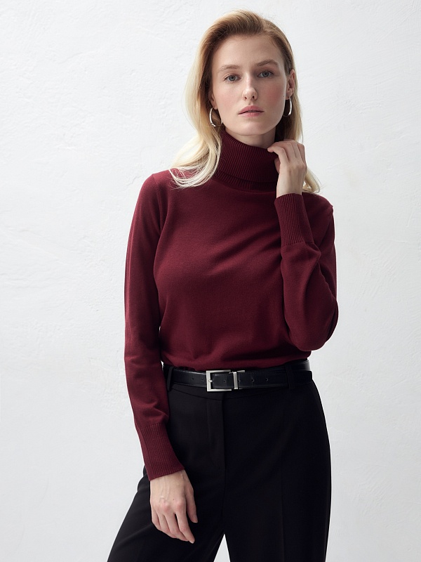 Джемпер с цельнокроеным воротником-стойкой, связанный в винном цвете, будет вашим незаменимым спутником в холодные периоды. Его можно носить как с комплектами, так и самостоятельно.