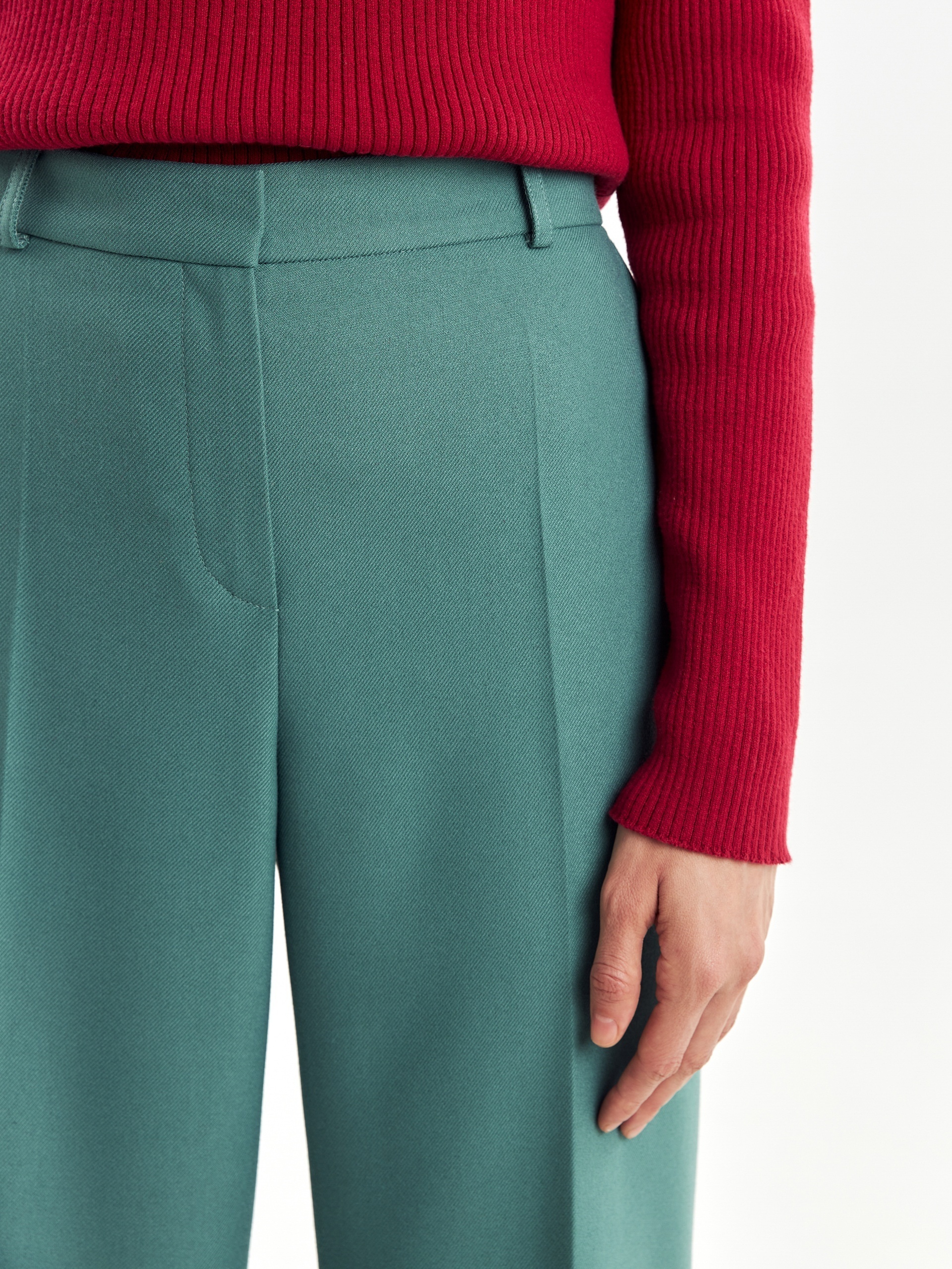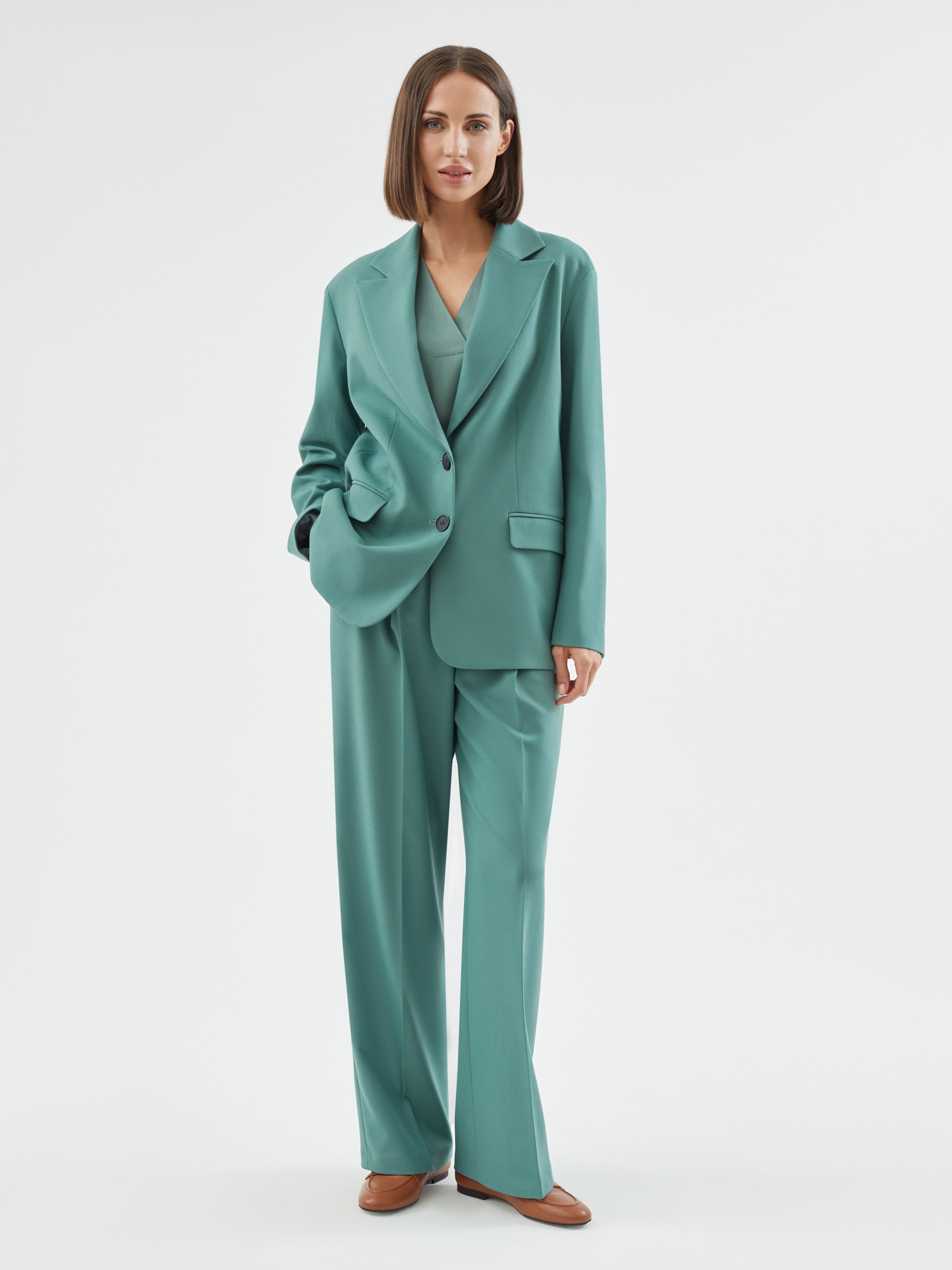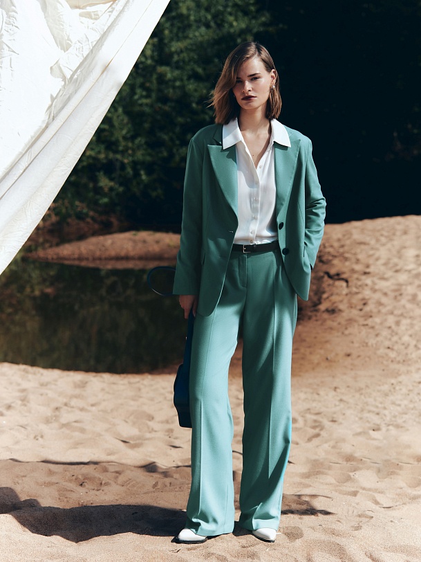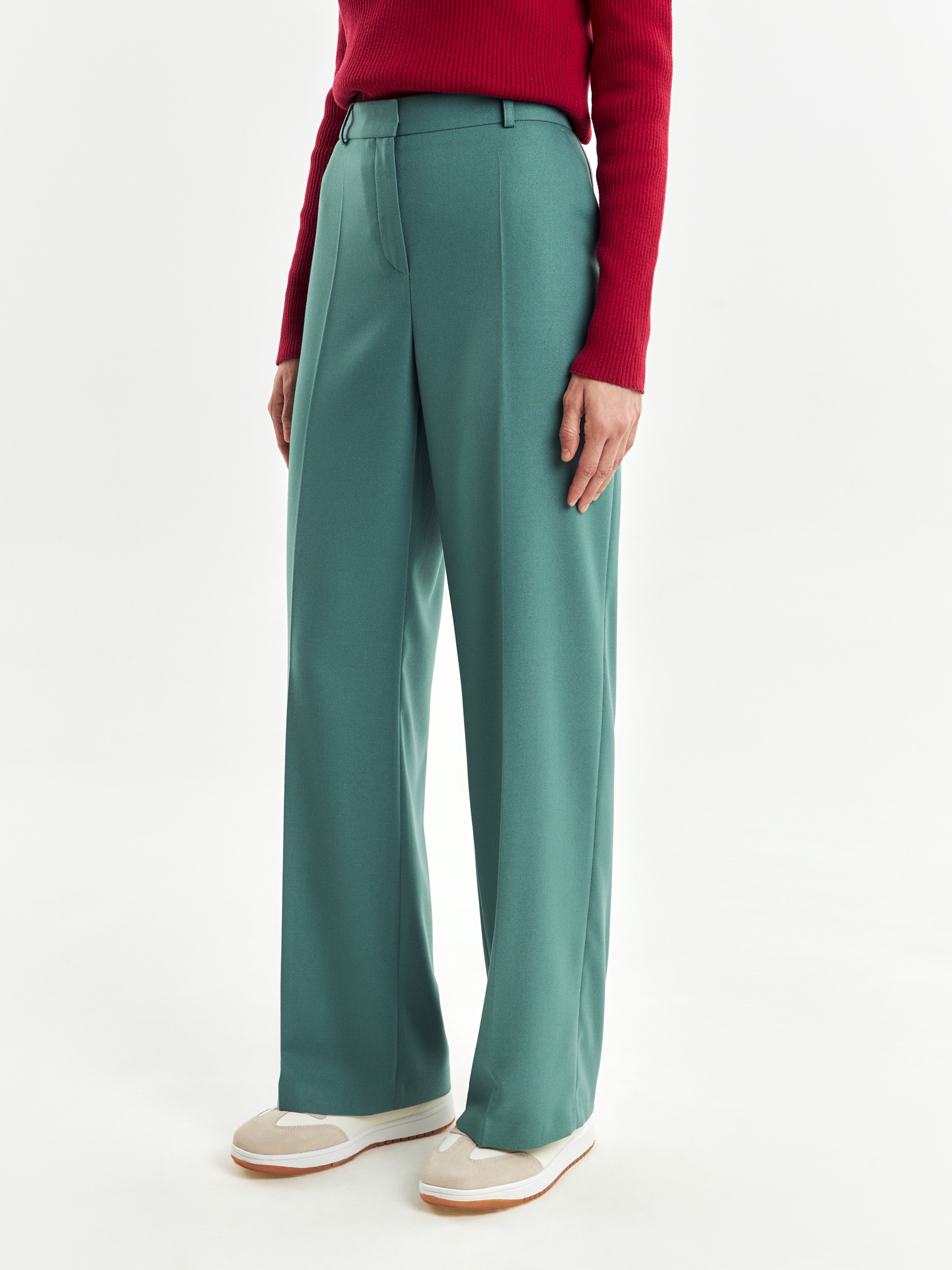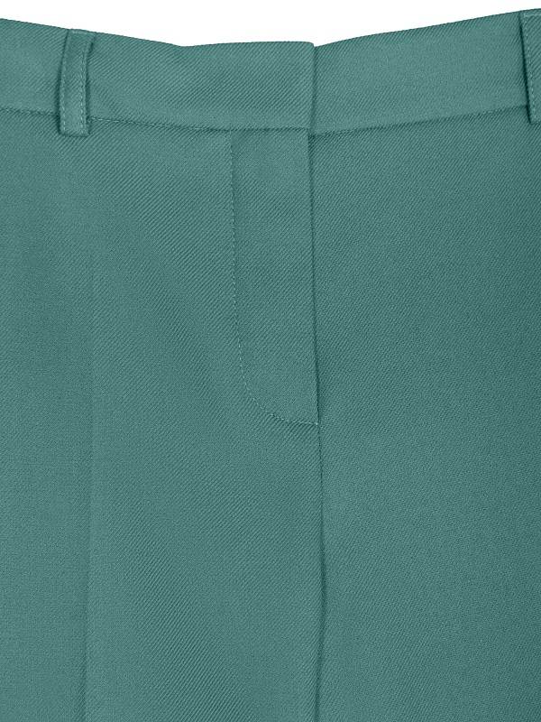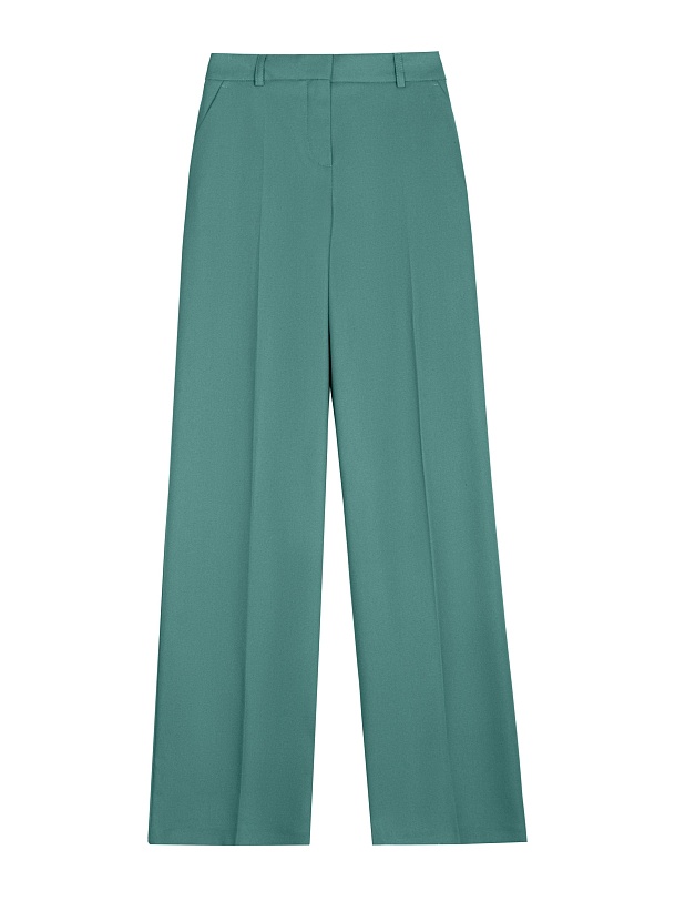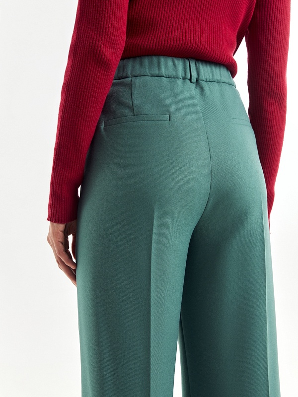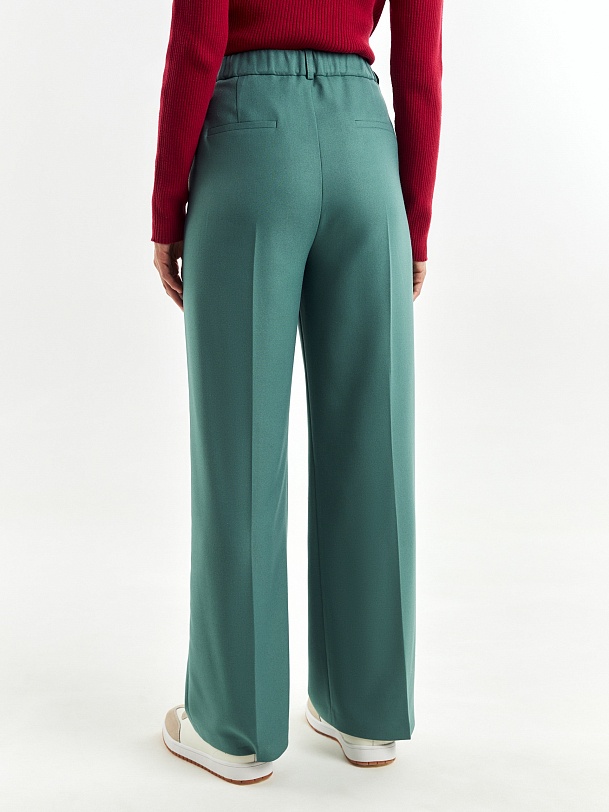 Стильные широкие брюки прямого струящегося силуэта из мягкой вискозной ткани в цвете "пихта", со стрелками, на притачном поясе с резинкой и шлевками. Застежка спереди на молнию и крючок. Карманы рабочие в боковых швах.