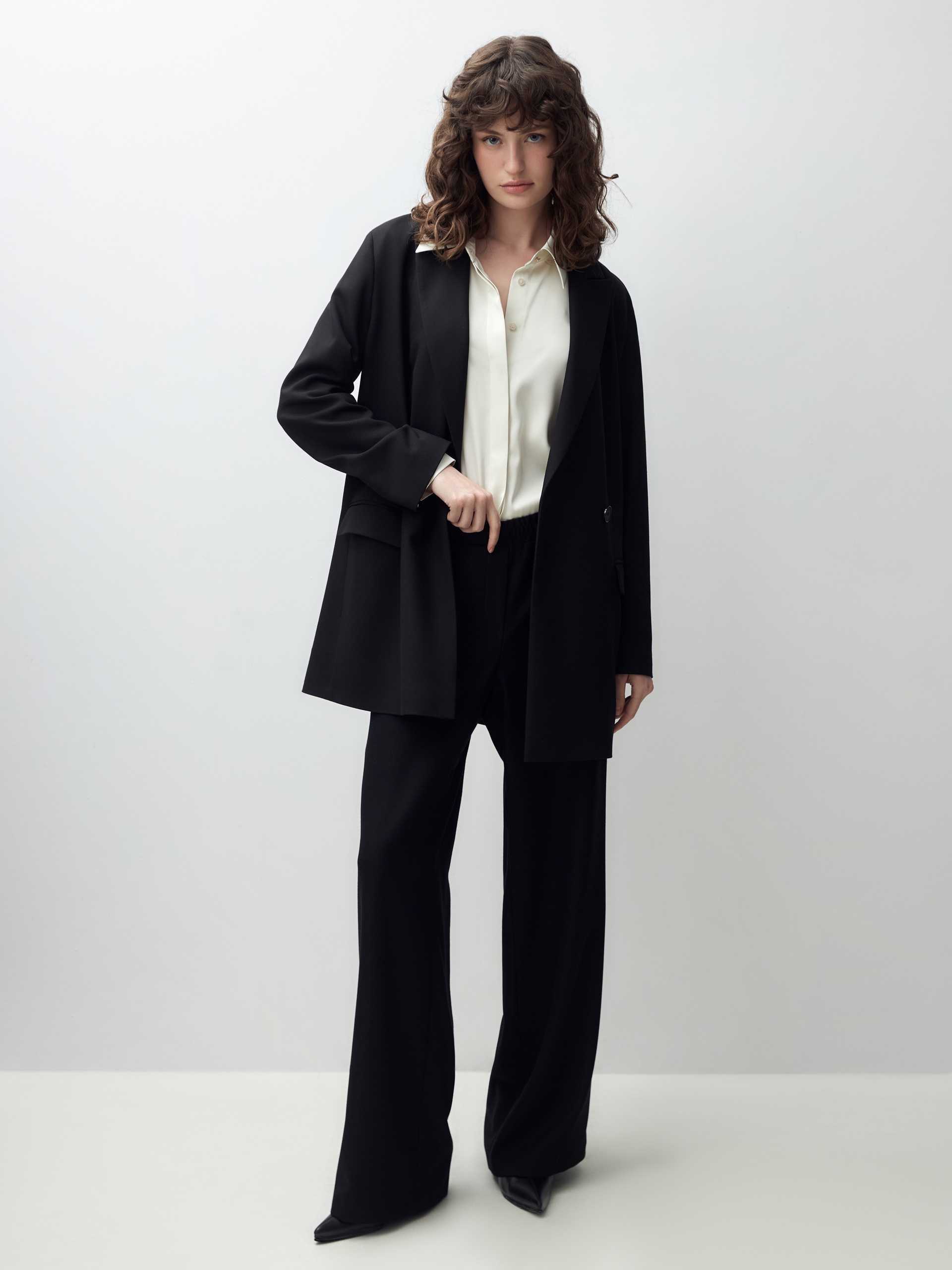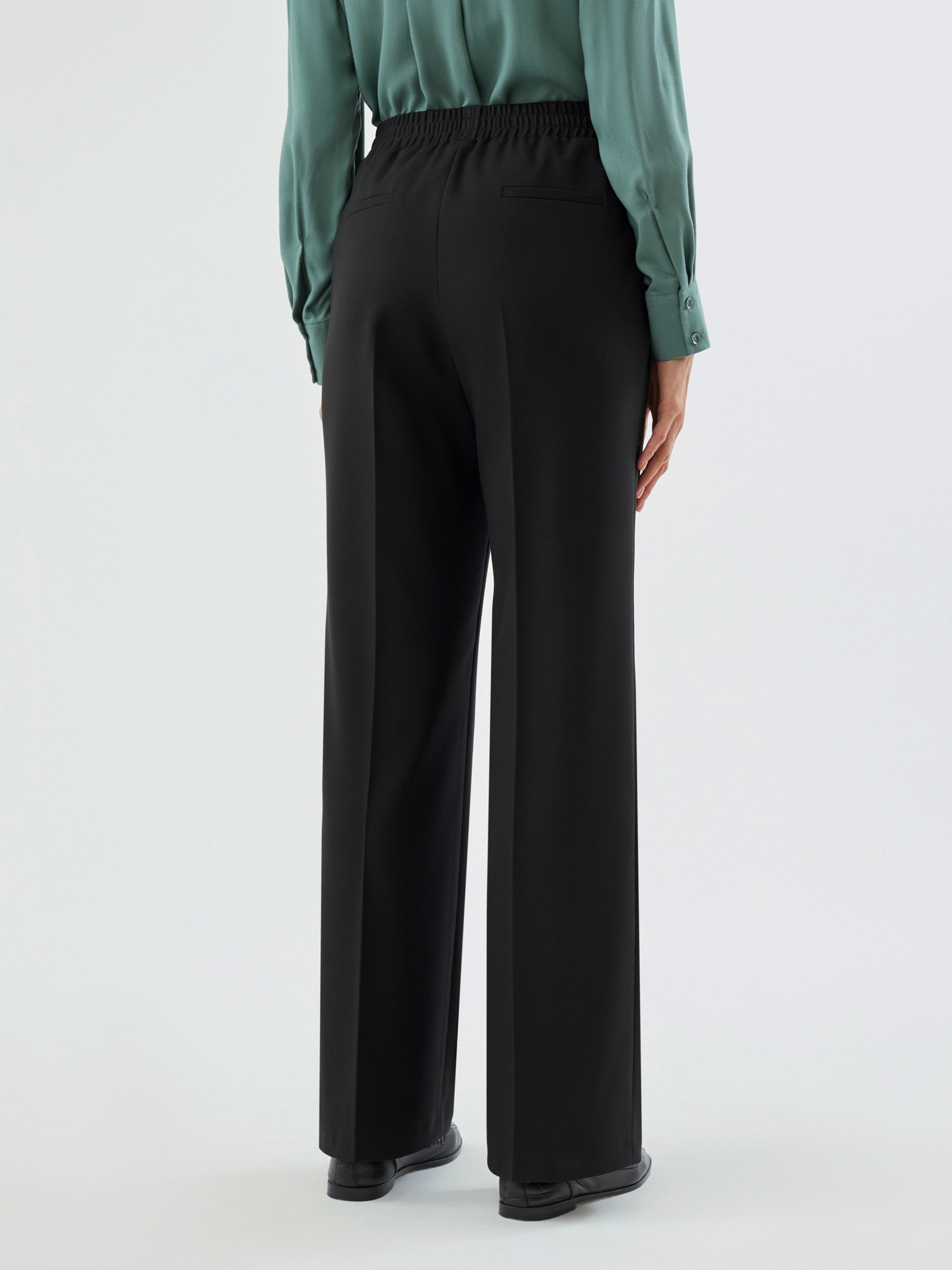 Прямые расслабленные брюки из мягкой костюмной ткани в черном цвете. Пояс на резинке, что позволяет чувствовать себя комфортно и расслабленно. Брюки имеют два функциональных кармана по бокам и два прорезных кармана сзади. Идеально сочетаются с жакетом из этой же ткани.