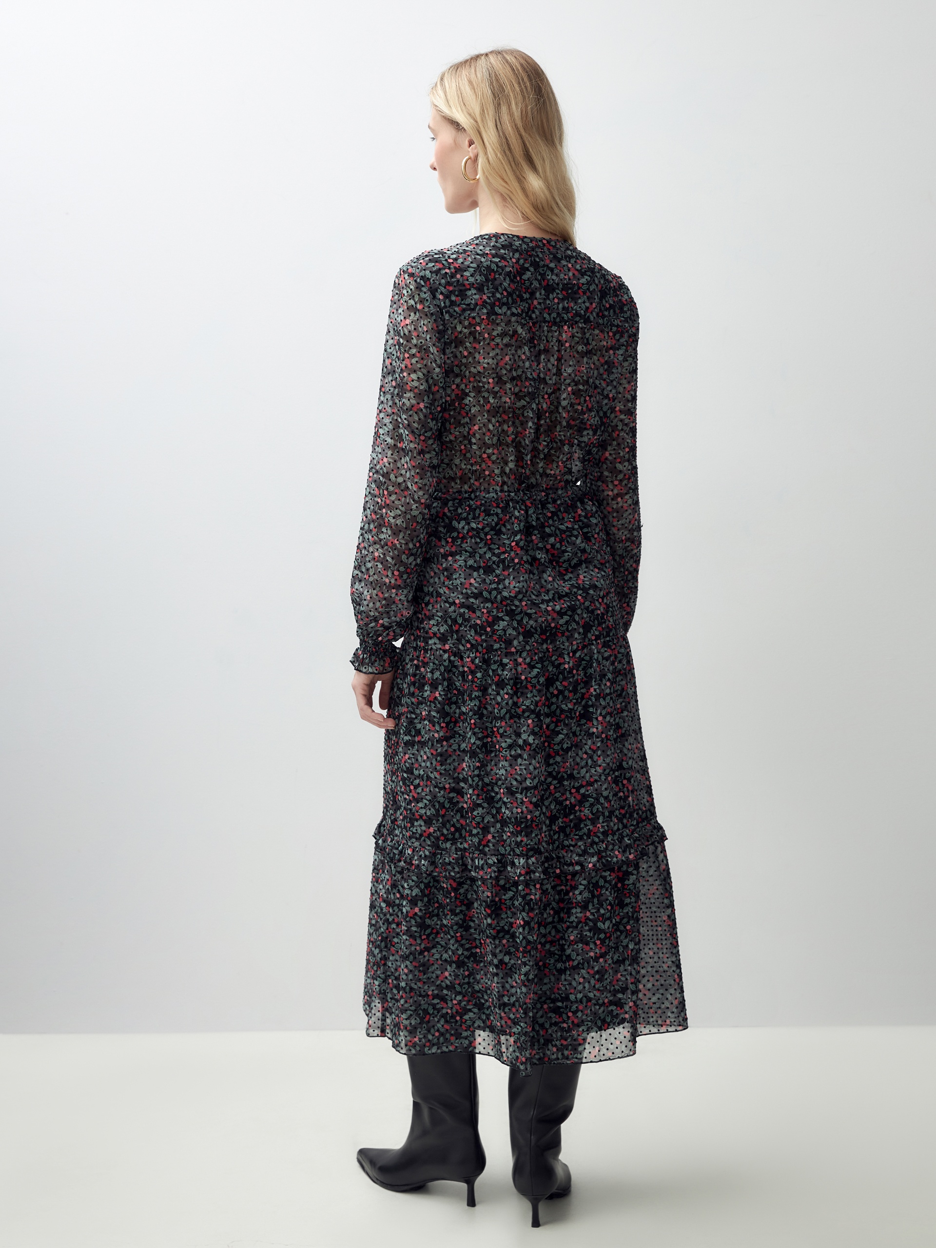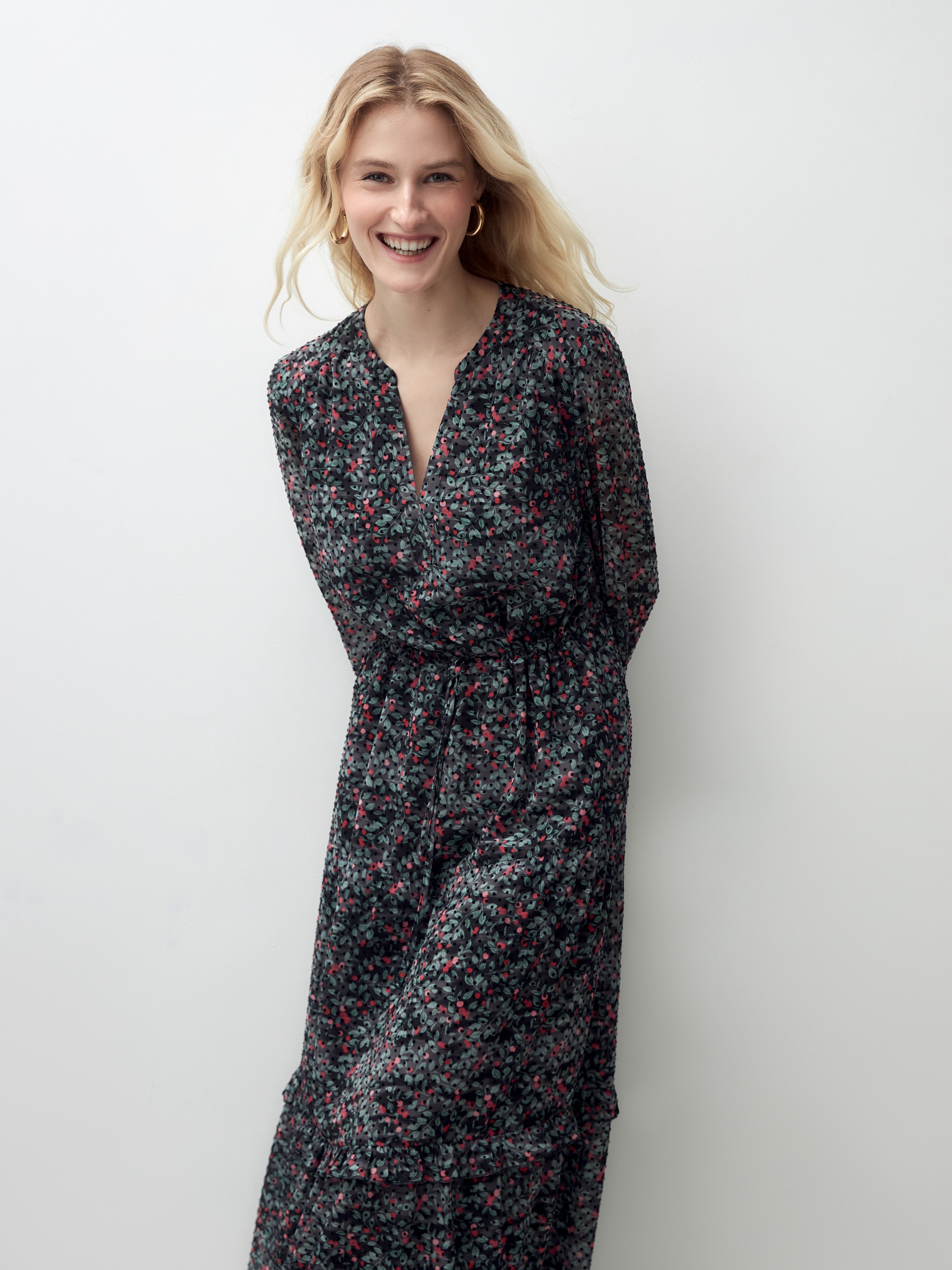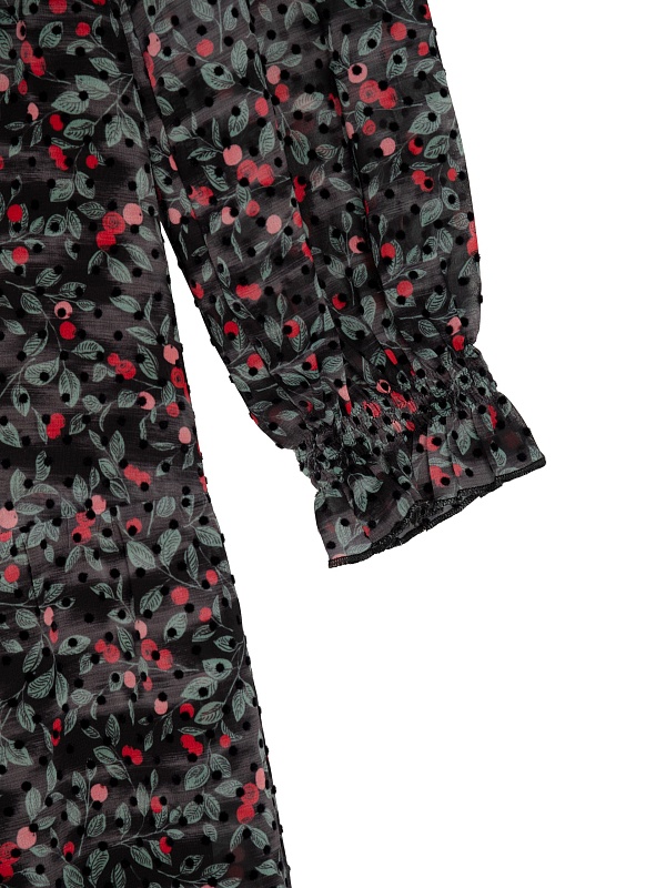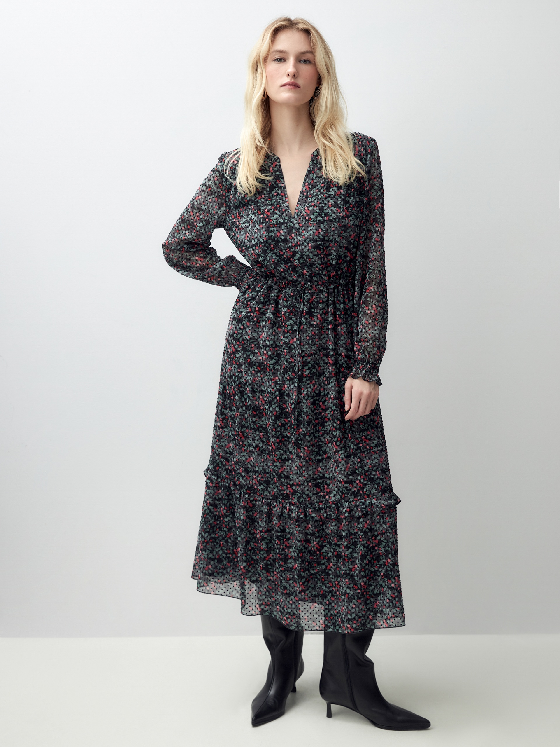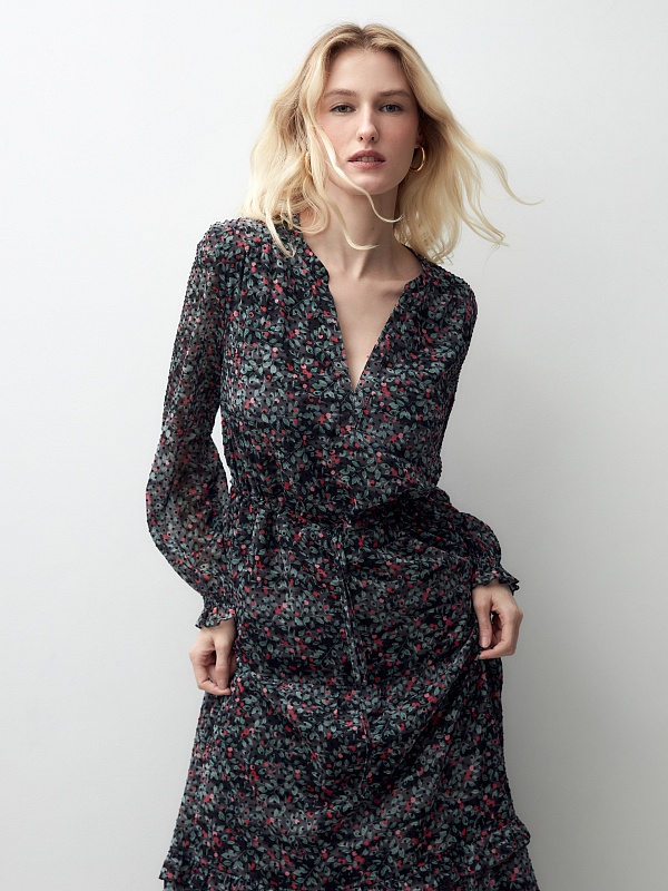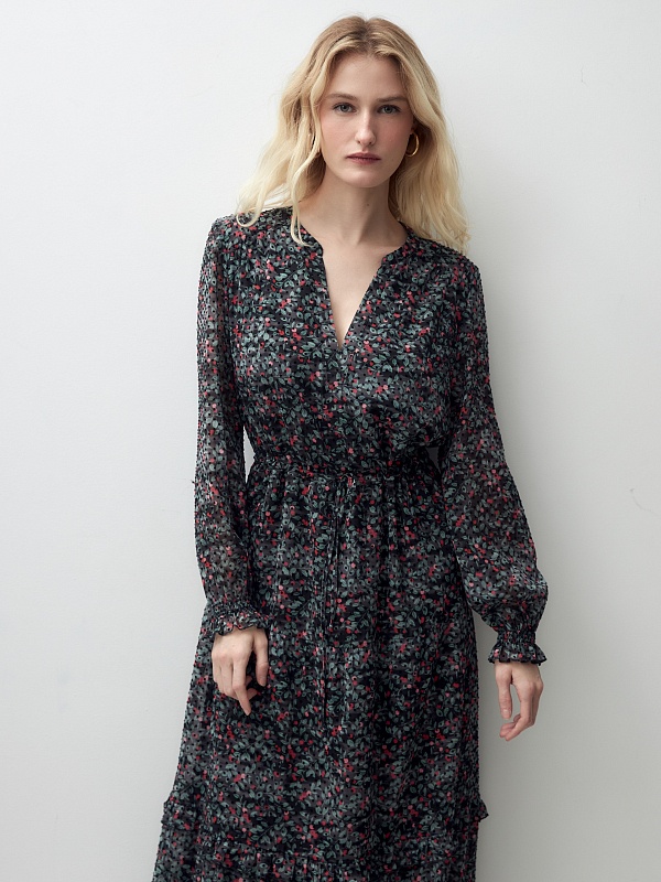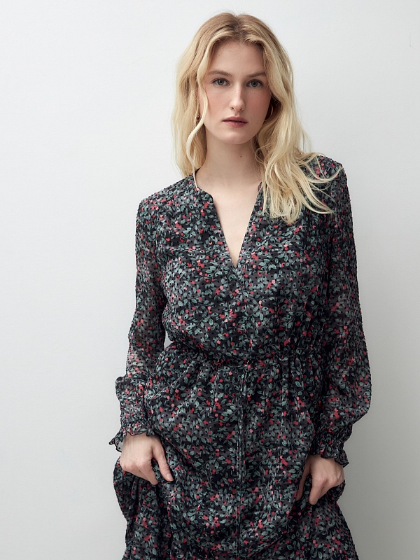 Романтичное платье миди из принтованной плательной ткани с деликатным цветочным принтом. Воротник стойка с V-образным вырезом. Платье отрезное по талии с кулисой, юбка состоит из нескольких воланов с рюшей по последнему волану. Рукава полной длины, объемные с резинкой жилкой по низу.