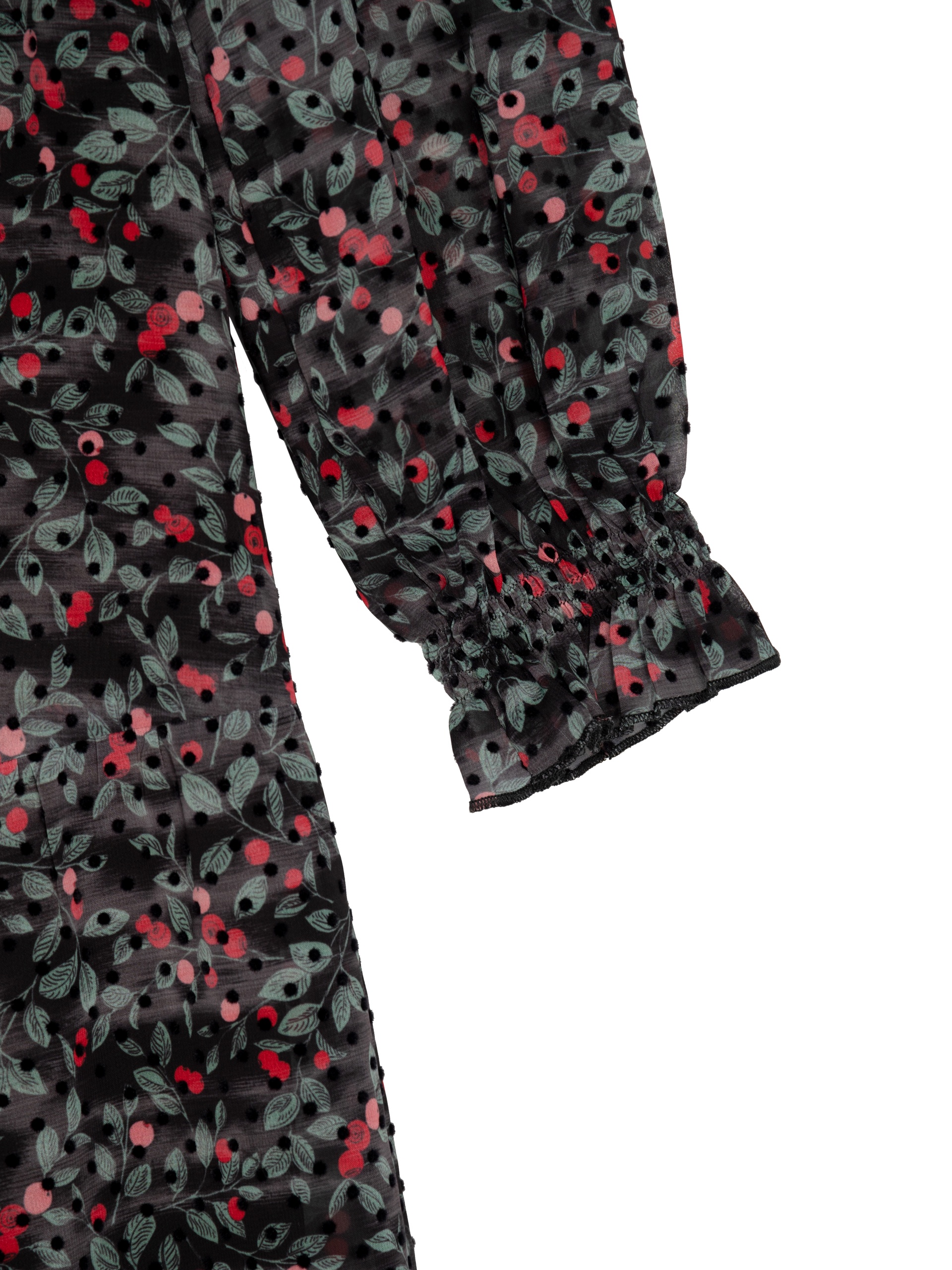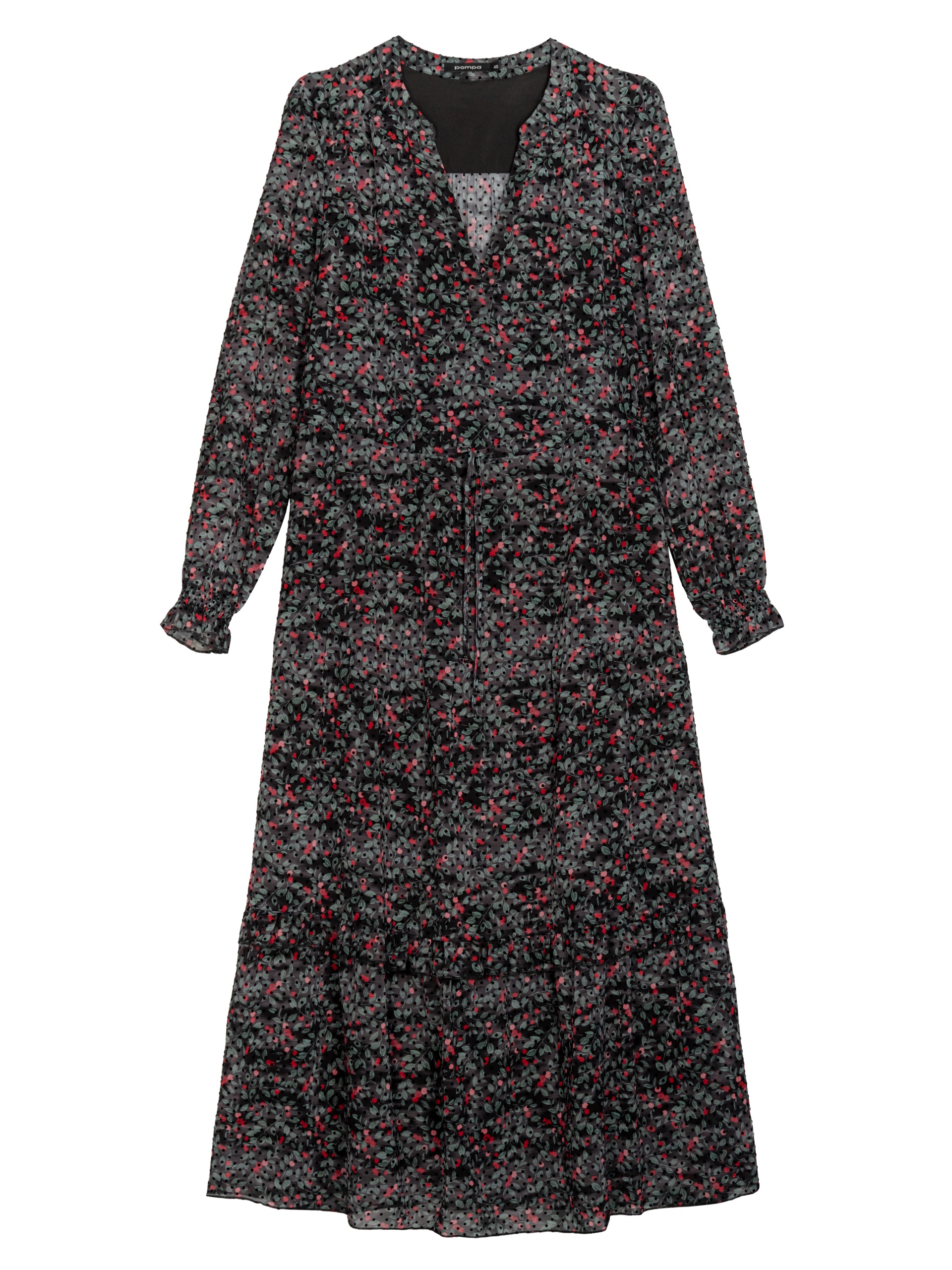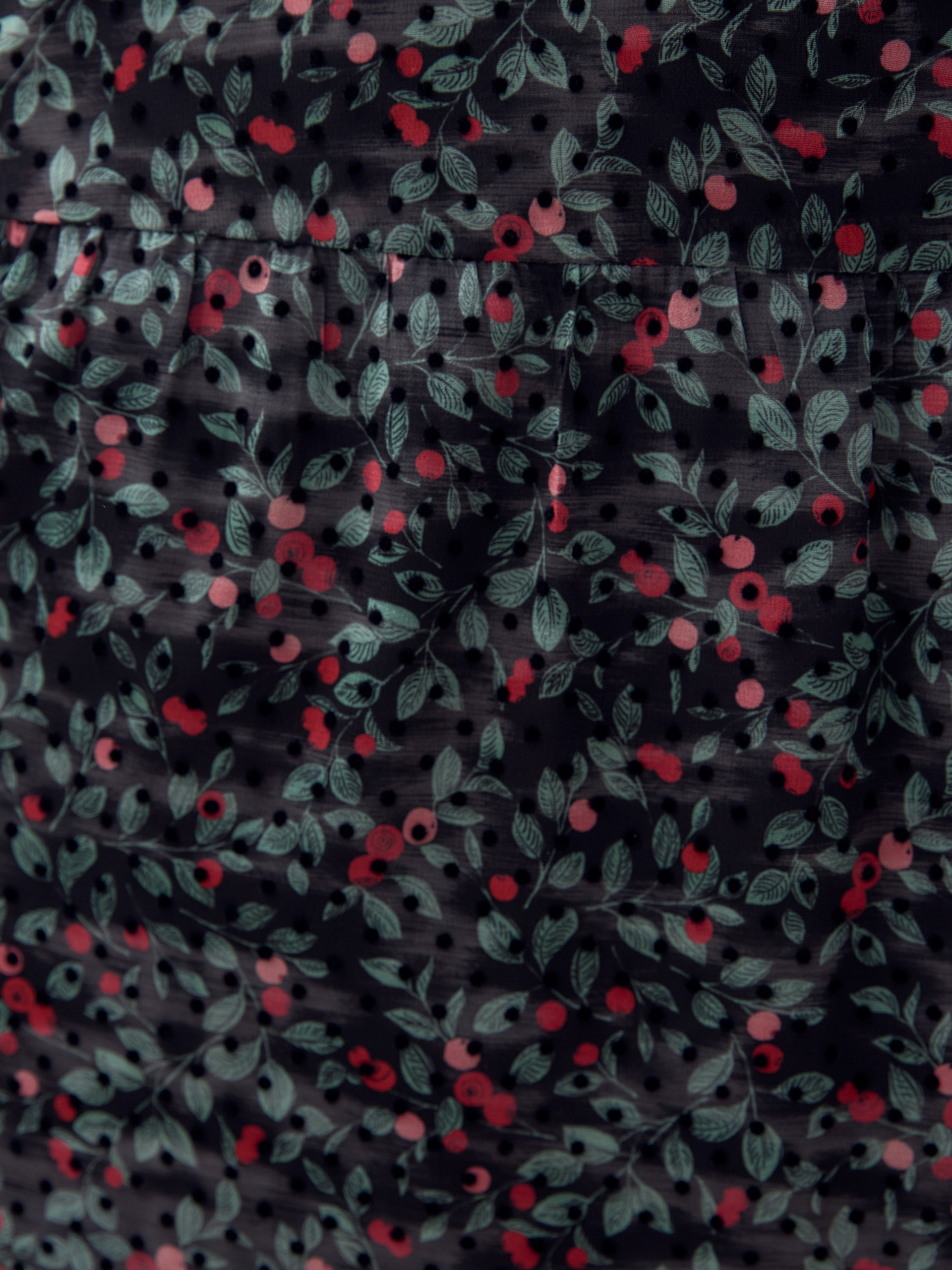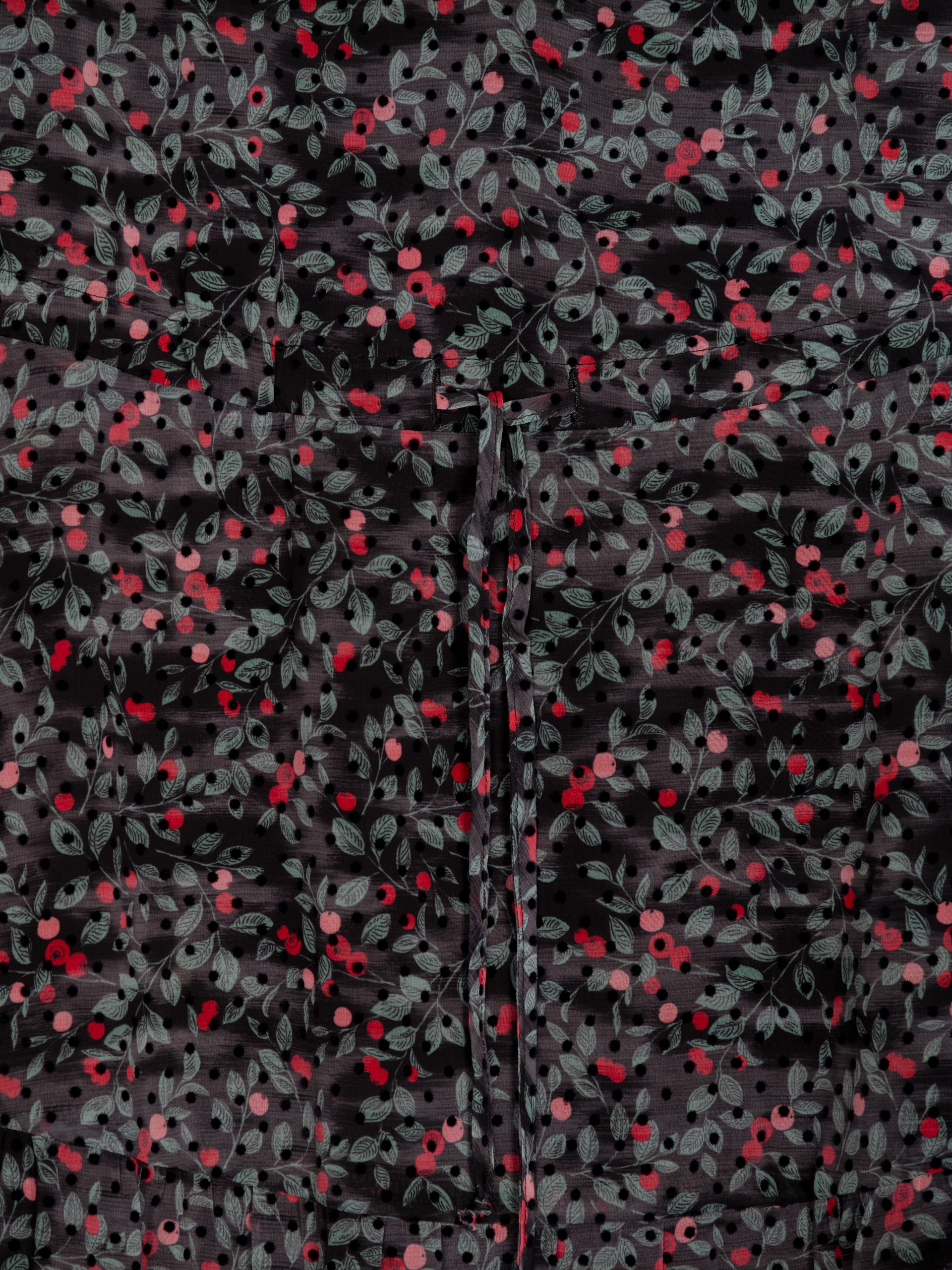 Романтичное платье миди из принтованной плательной ткани с деликатным цветочным принтом. Воротник стойка с V-образным вырезом. Платье отрезное по талии с кулисой, юбка состоит из нескольких воланов с рюшей по последнему волану. Рукава полной длины, объемные с резинкой жилкой по низу.