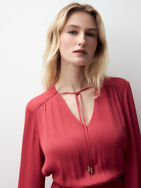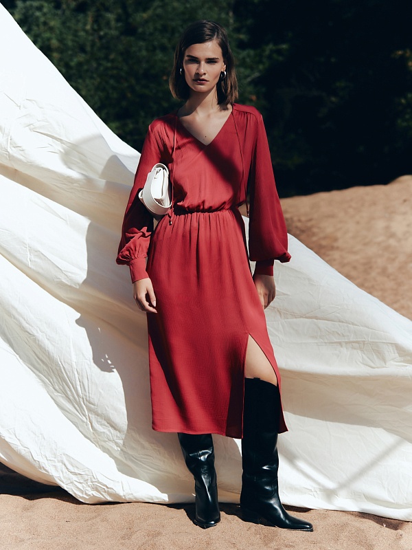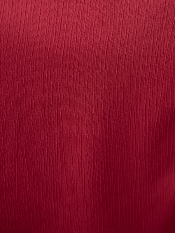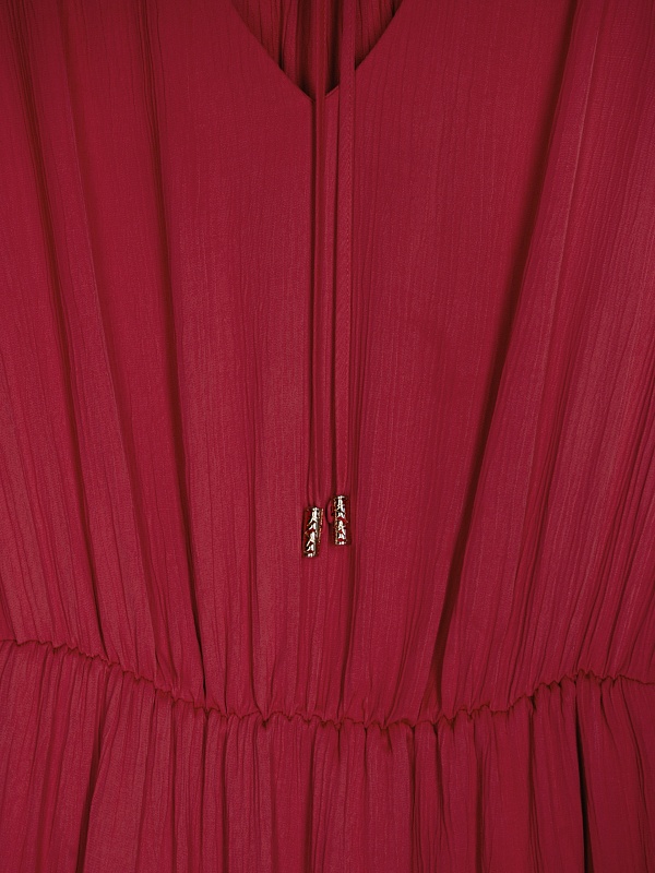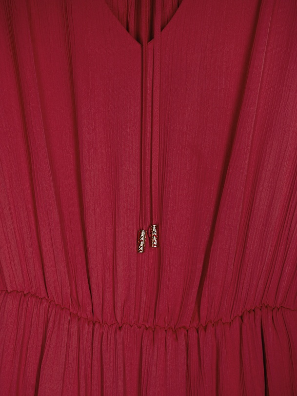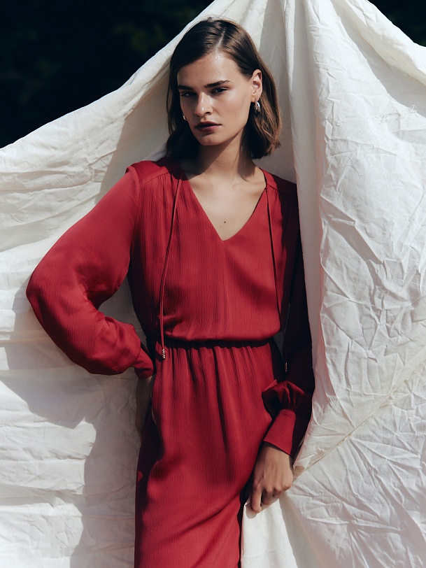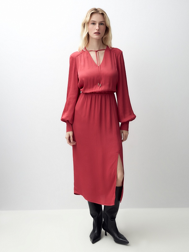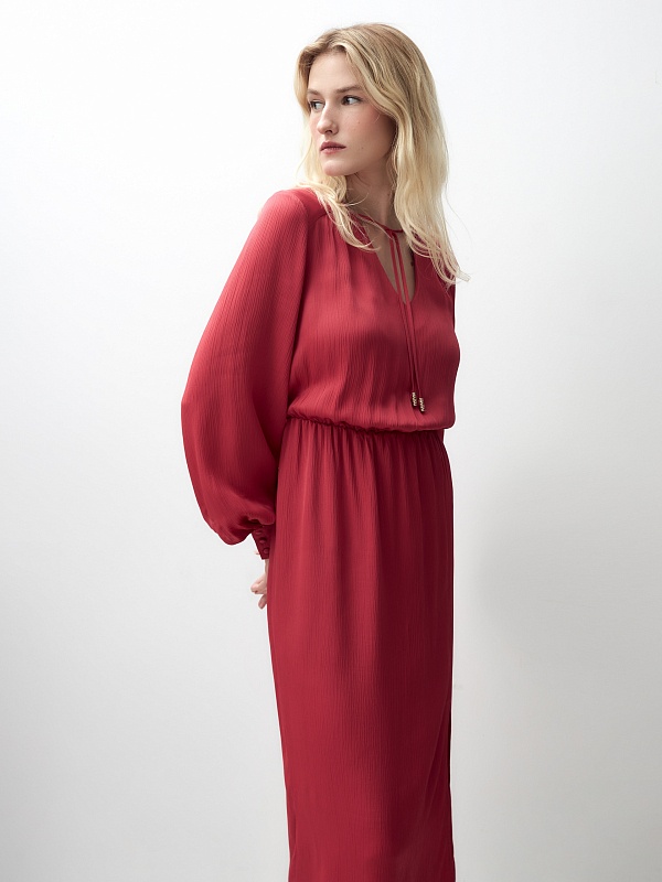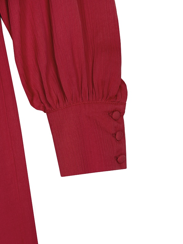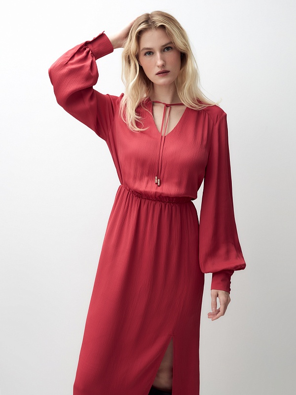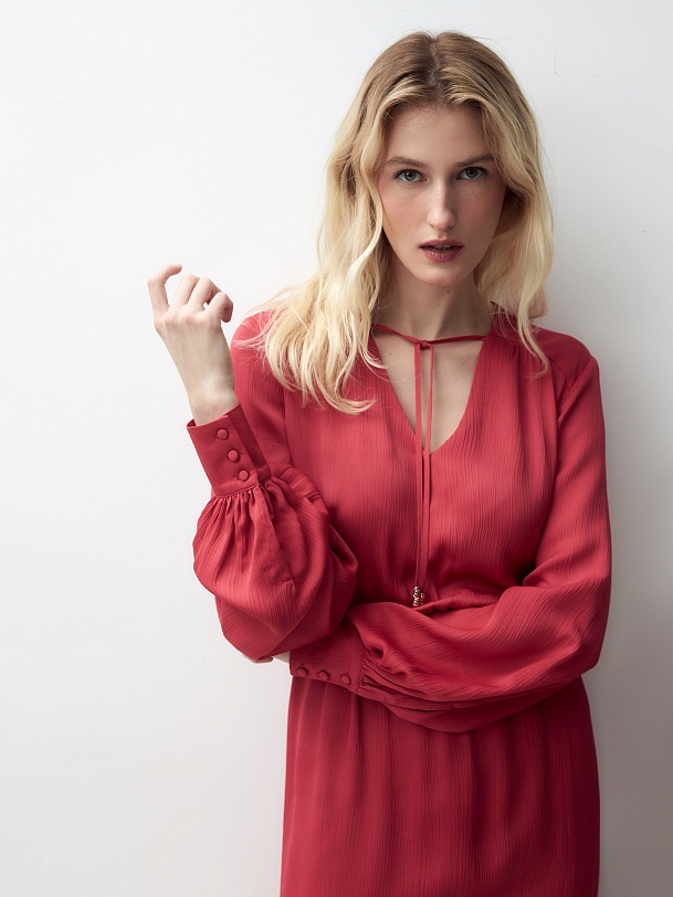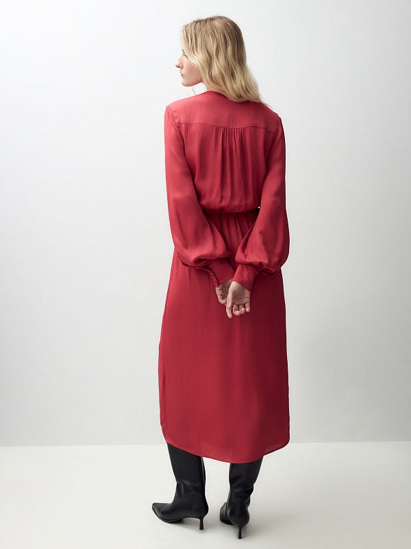 Женственное платье длины миди полуприлегающего силуэта из 100% вискозы. Яркая малиново-красная фактурная ткань с крэш эффектом. V-образный вырез горловины и втачной рукав полной длины с объемом по низу и широкими манжетами на пуговицах. На талии резинка для создания более приталенного силуэта.