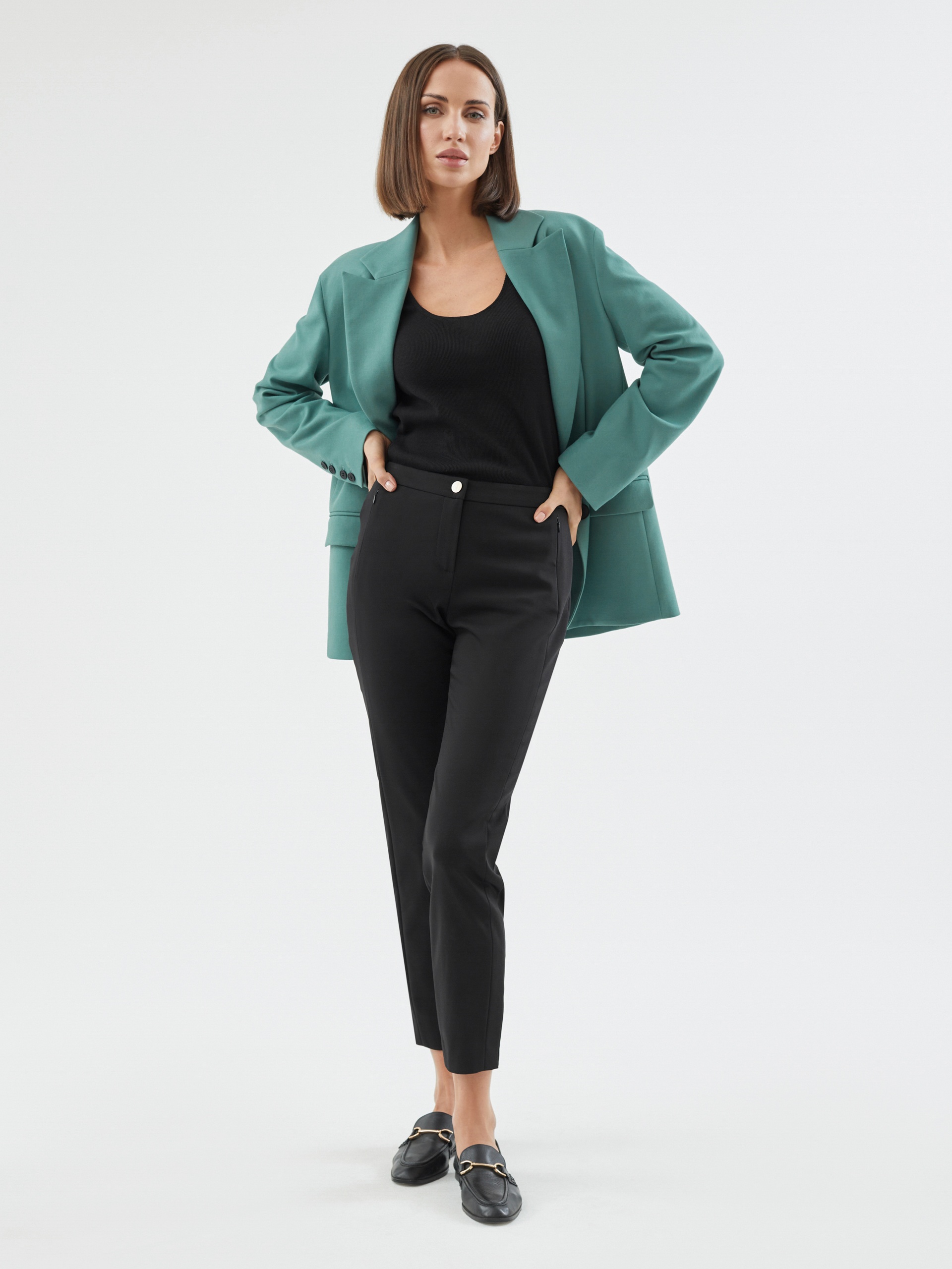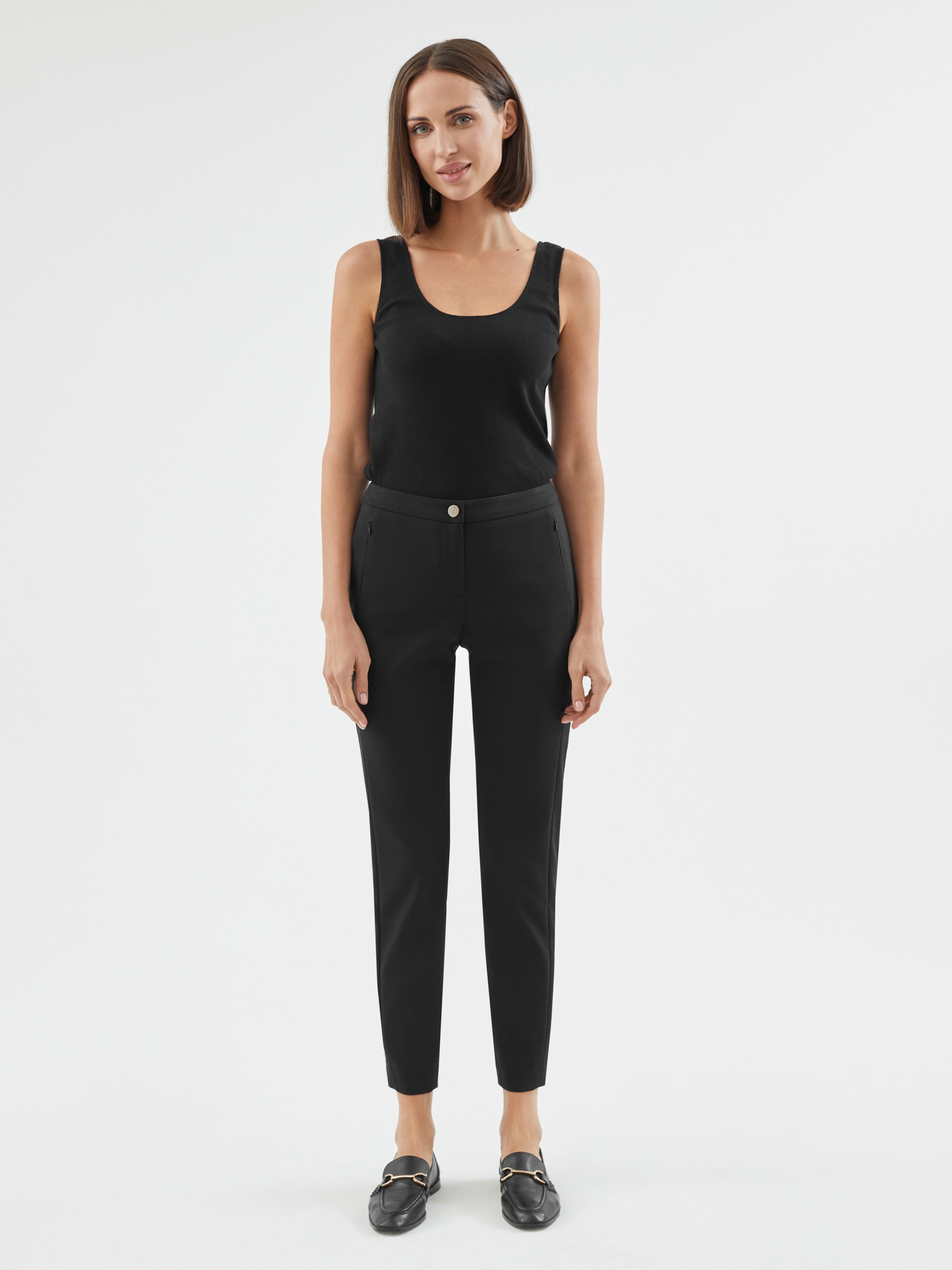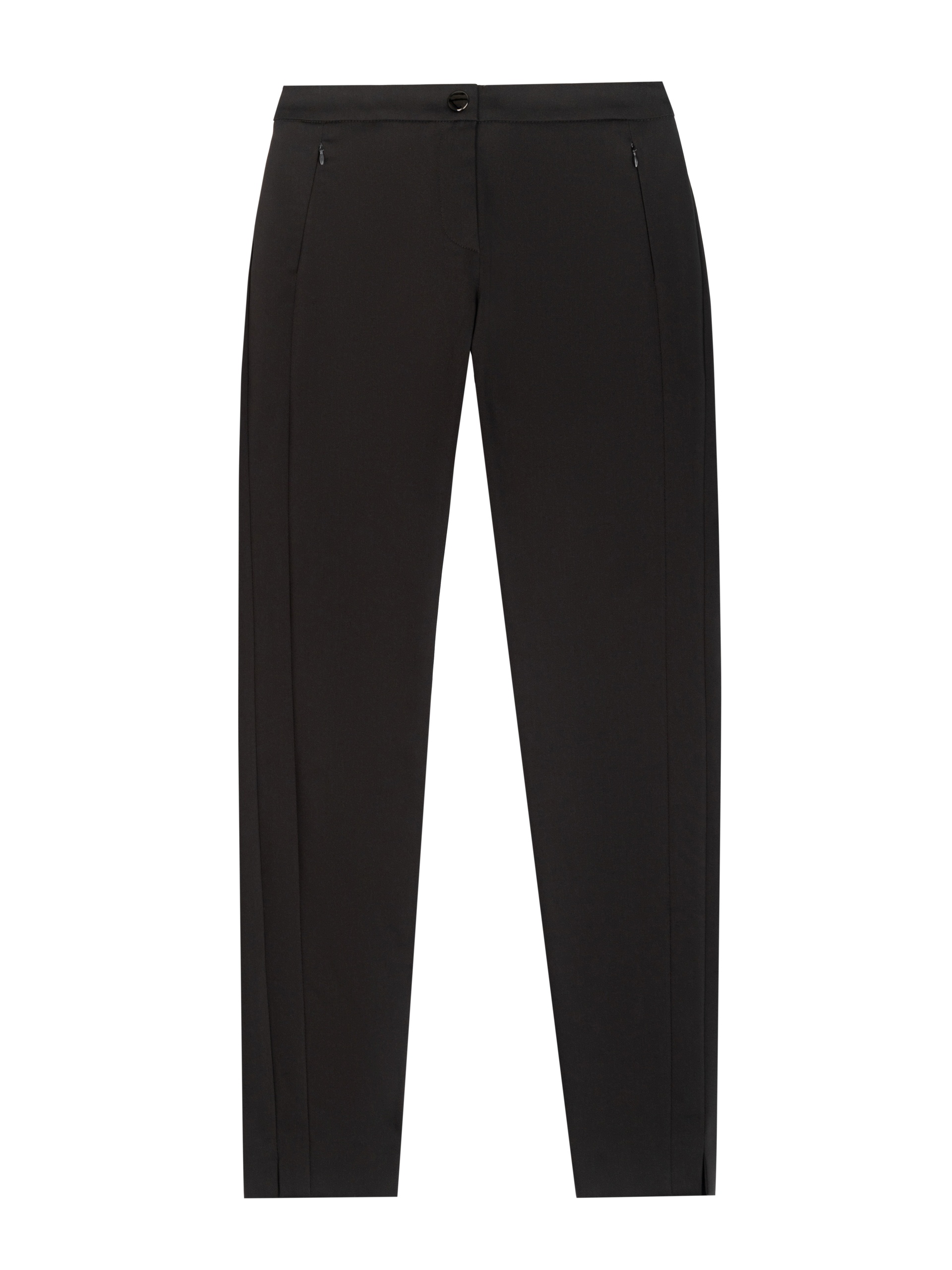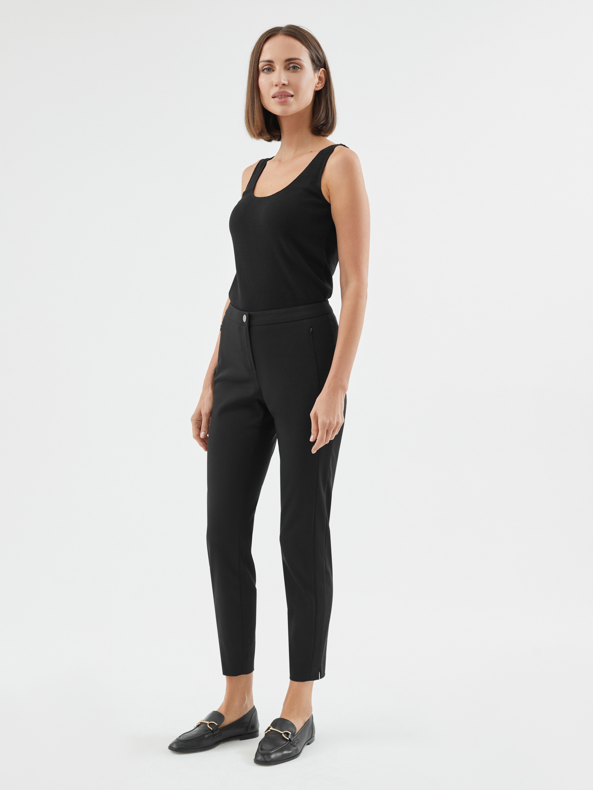 Брюки зауженного силуэта на притачном поясе, с лампасами и стрелками. Карманы в боковых рельефах. Застежка спереди на молнию и пуговицу. По низу маленькие разрезы.